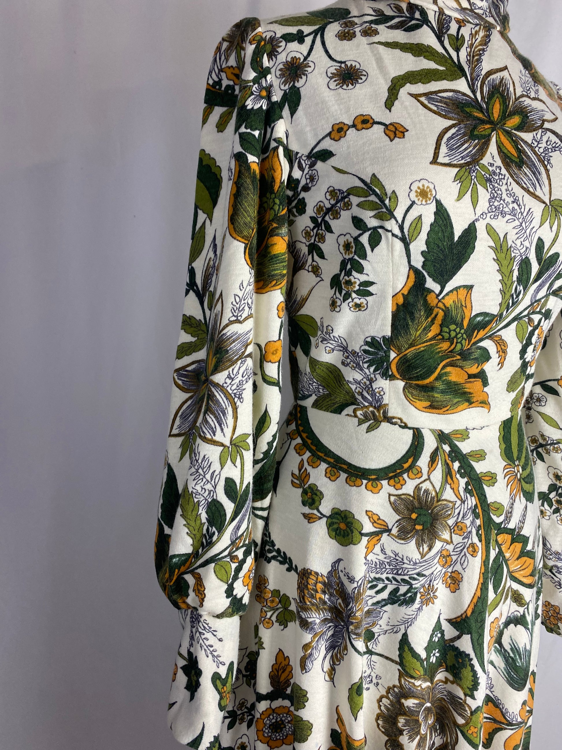 Modello svasato, con maniche bishop che si stringono in prossimità della manica, con bottoncini foderati