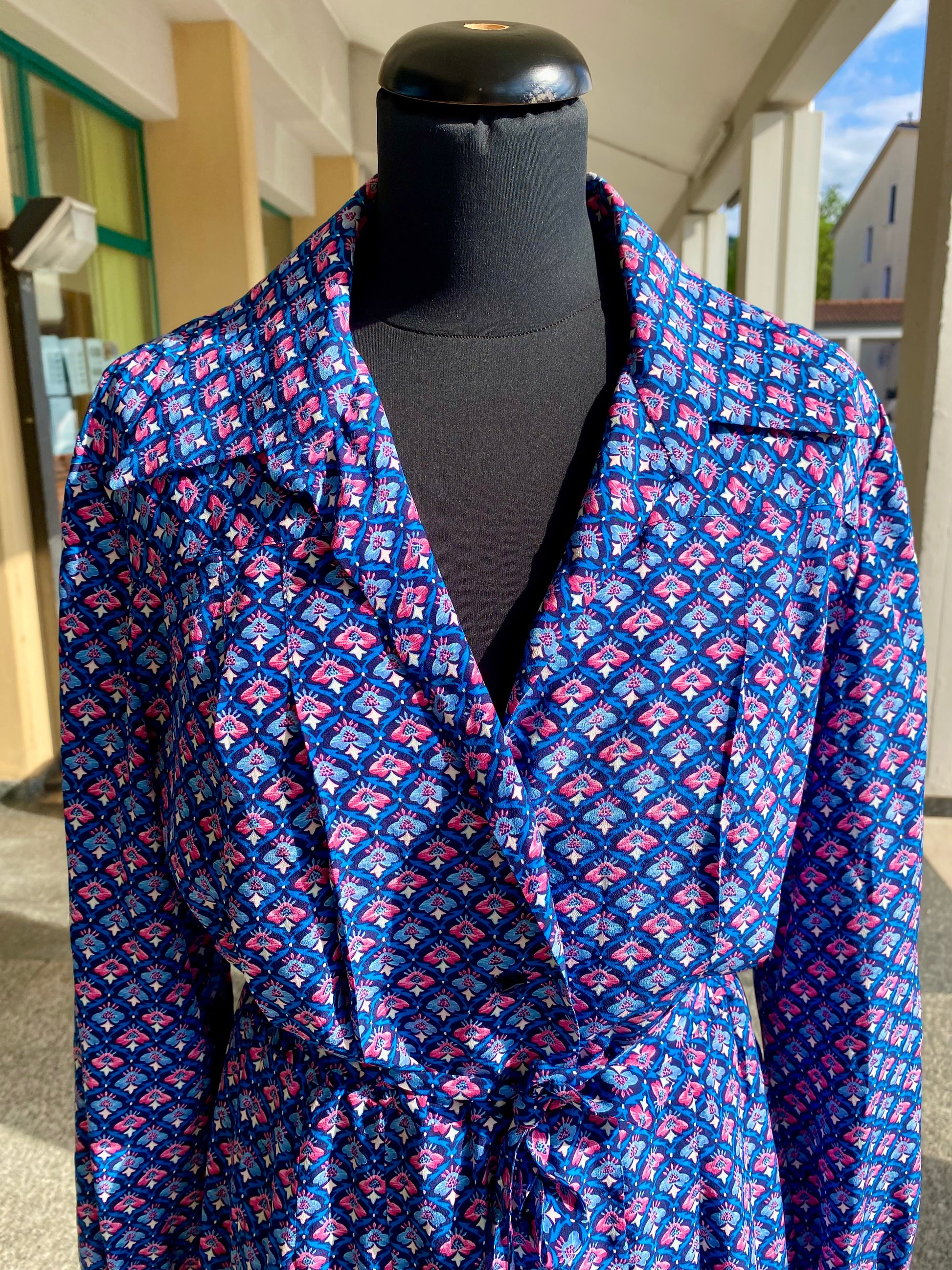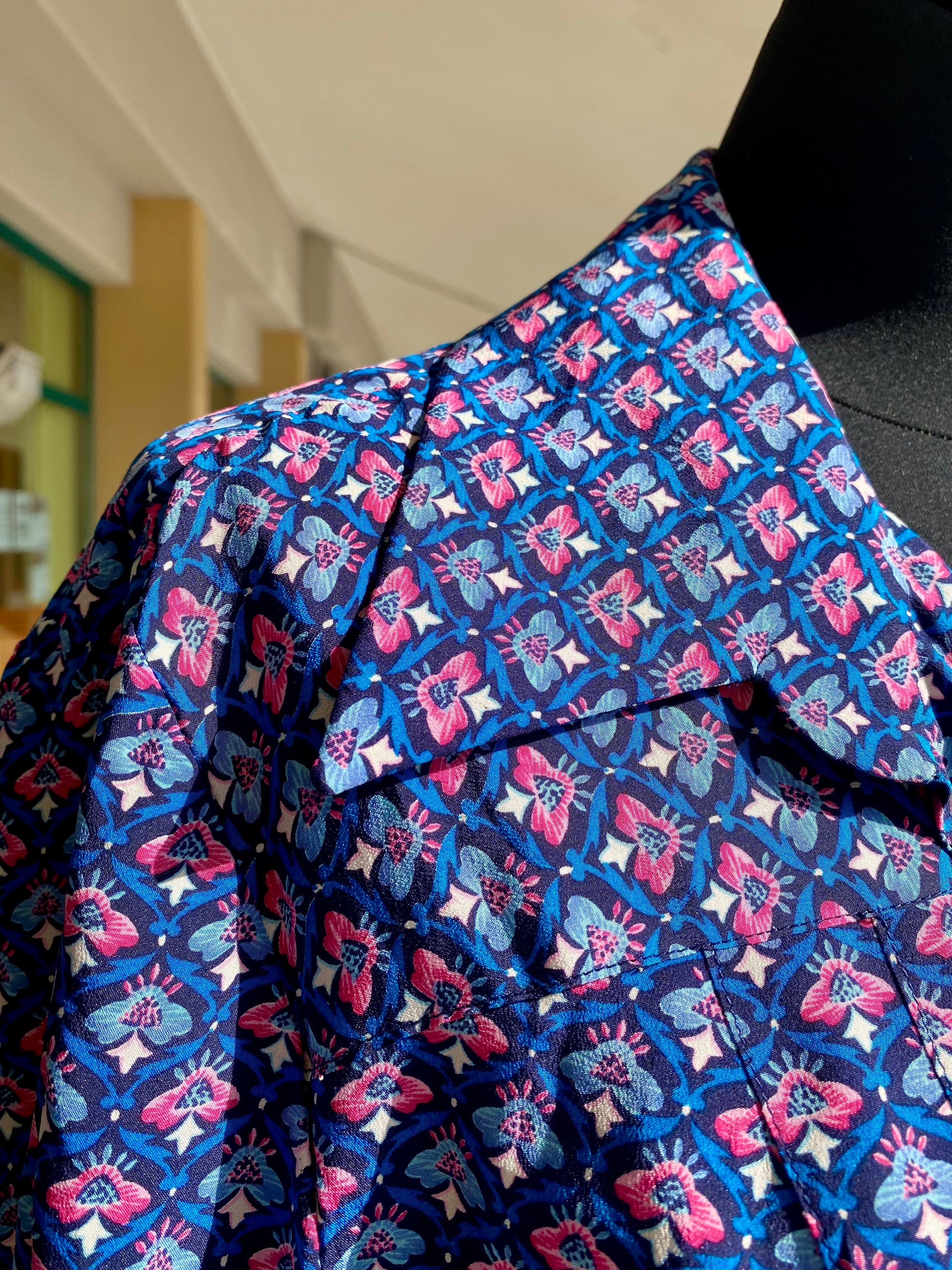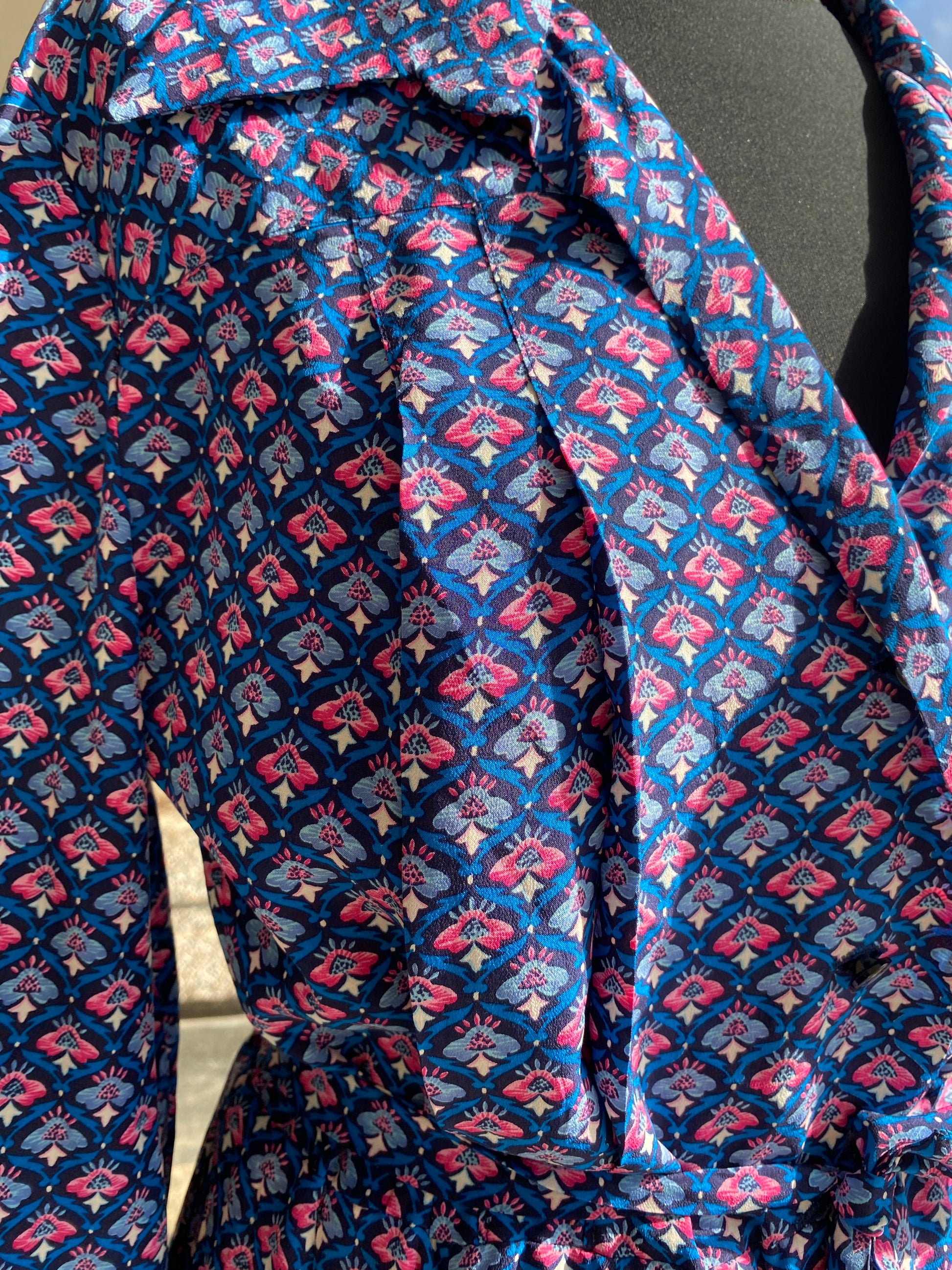 Abito sartoriale anni ’70 in seta leggera, con taglio camicia e cintura nello stesso tessuto per segnare il punto vita. La microfantasia geometrico-floreale in tonalità blu, fucsia e panna si ripete su tutta la superficie, conferendo un effetto ottico vibrante e sofisticato. Colletto a punta, maniche lunghe e linea fluida che accompagna il movimento