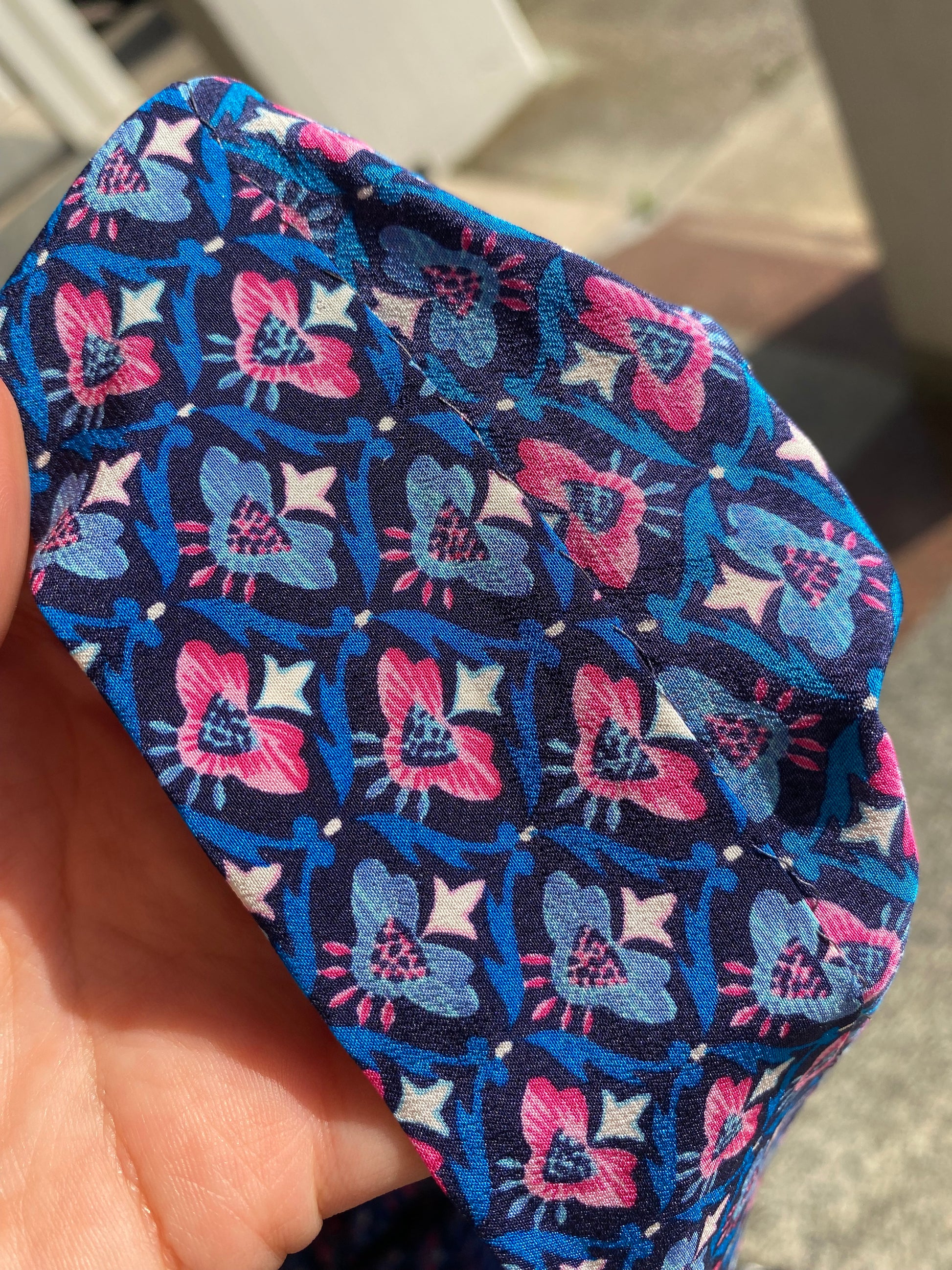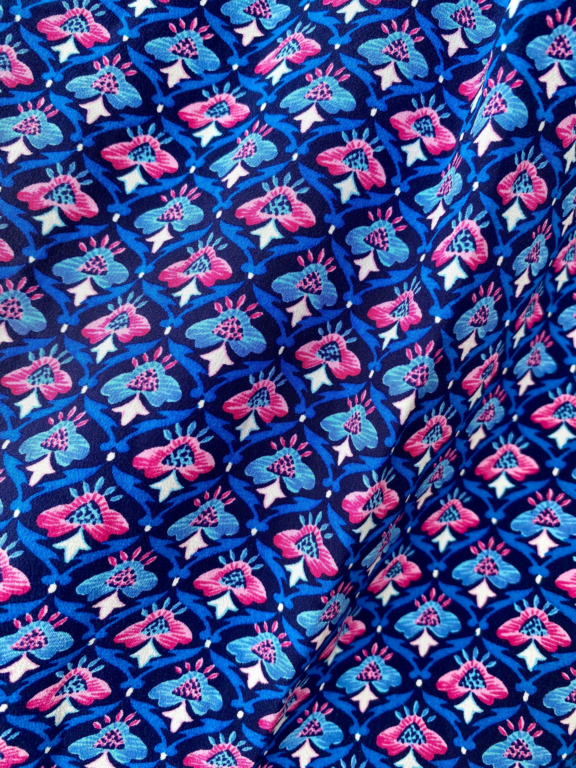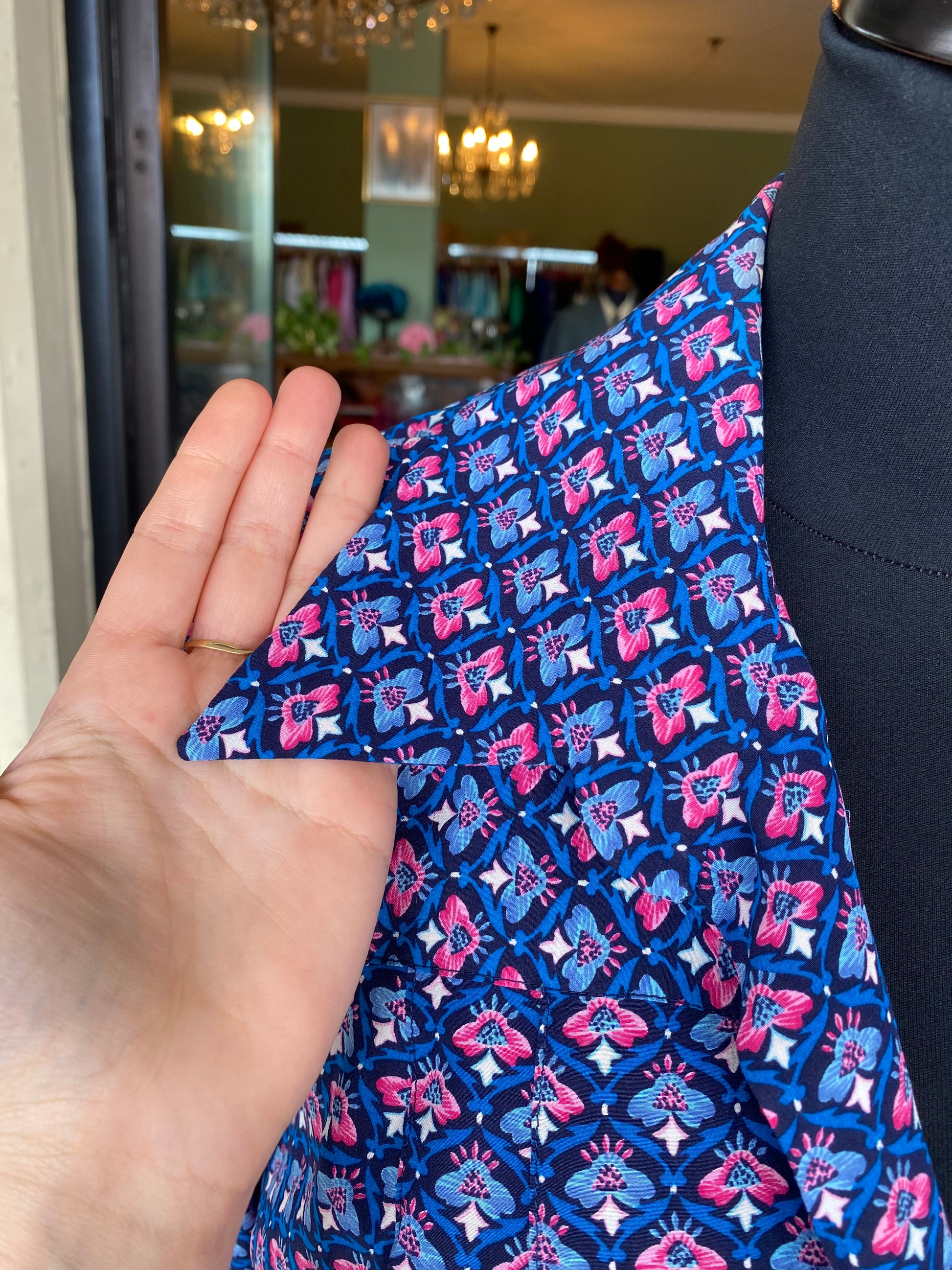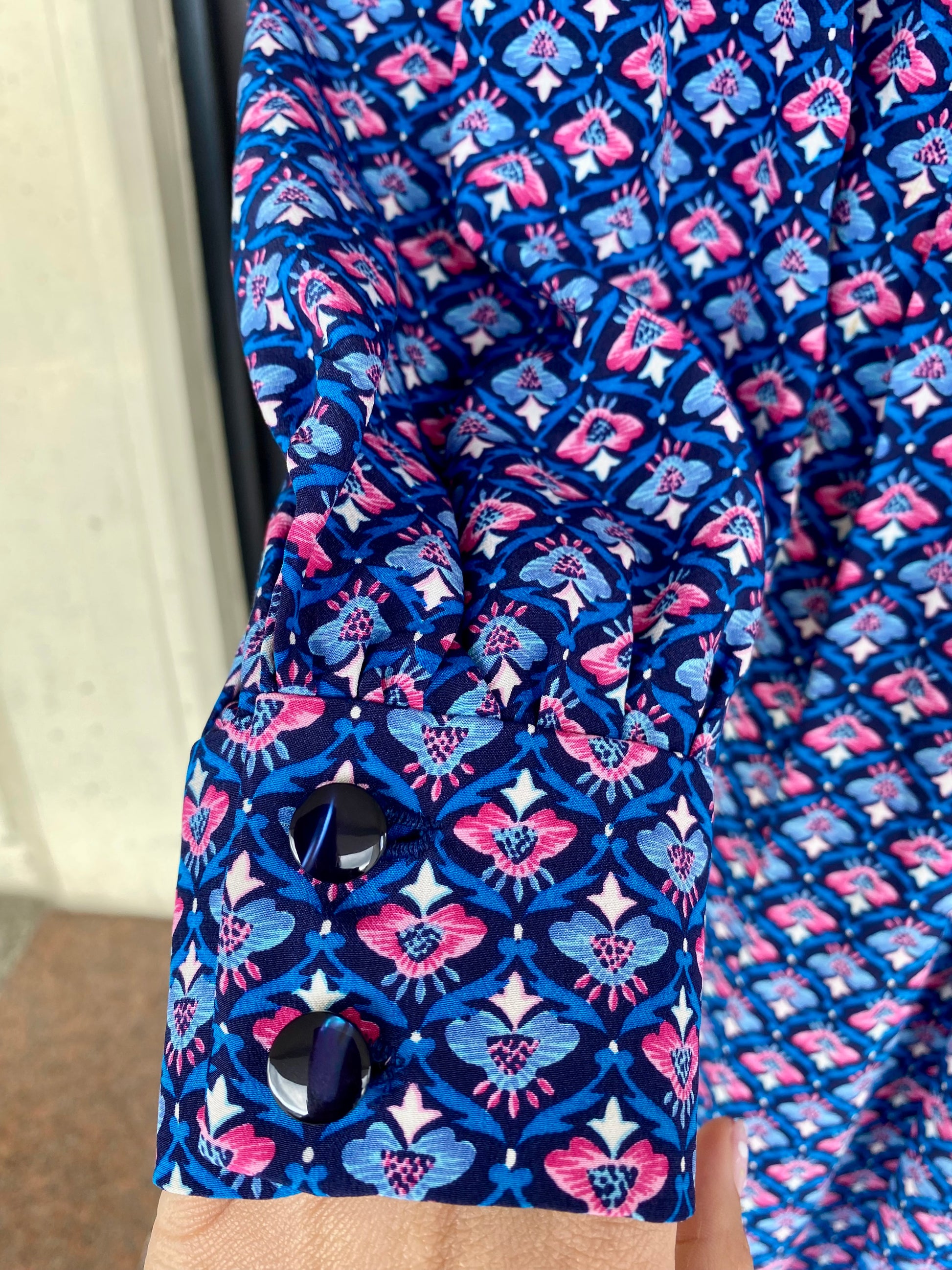 Abito sartoriale anni ’70 in seta leggera, con taglio camicia e cintura nello stesso tessuto per segnare il punto vita. La microfantasia geometrico-floreale in tonalità blu, fucsia e panna si ripete su tutta la superficie, conferendo un effetto ottico vibrante e sofisticato. Colletto a punta, maniche lunghe e linea fluida che accompagna il movimento