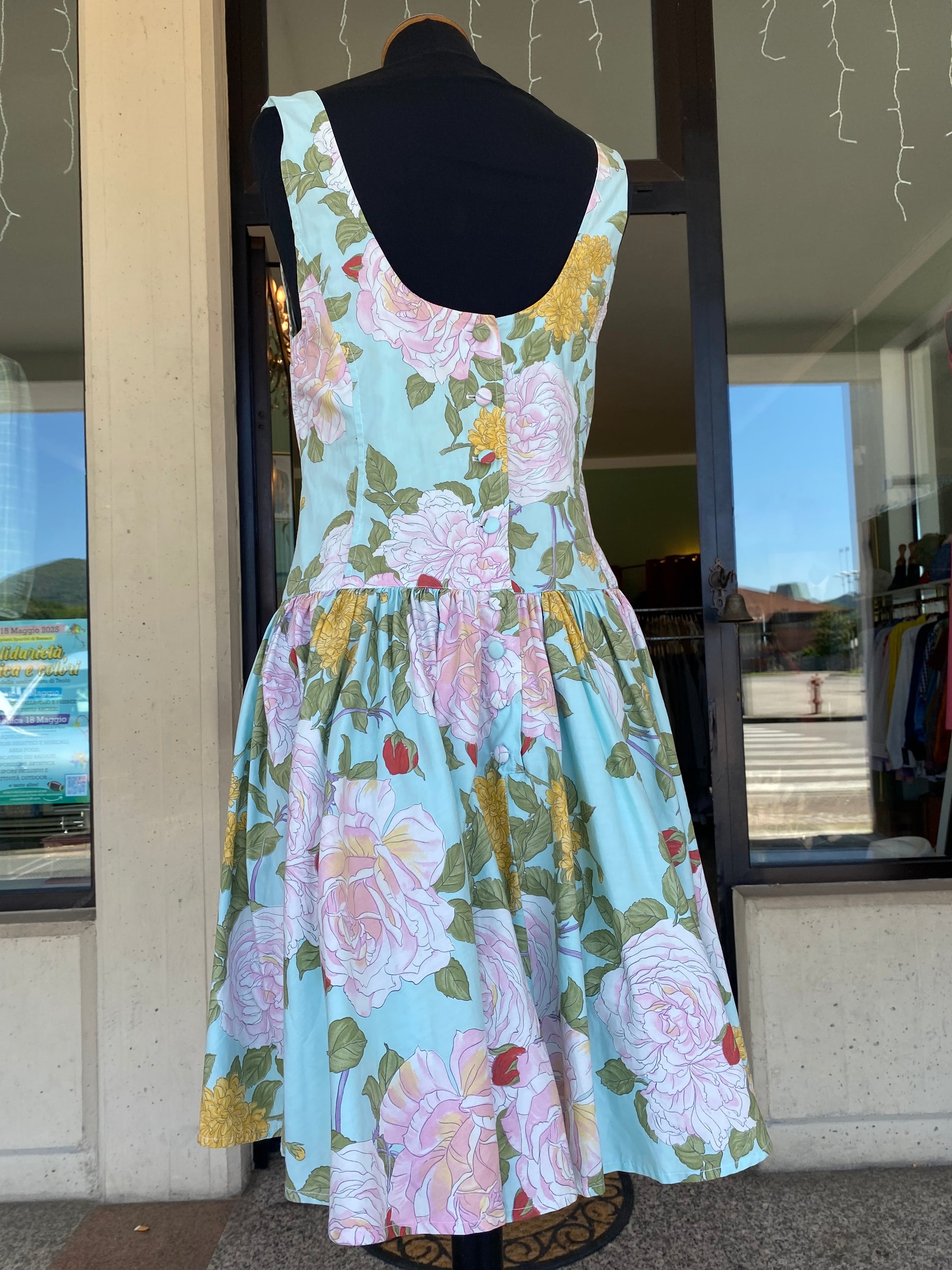 Questo abito anni ’80 è un vero spettacolo floreale che fa pensare subito alle creazioni più iconiche di Dolce & Gabbana: bustino sagomato, gonna a ruota voluminosa, tessuto in cotone a sfondo celeste con maxi rose in toni pastello e tocchi di giallo senape e rosso. La silhouette è quella tipica della moda rétro italiana: femminile, teatrale e sensuale al punto giusto.