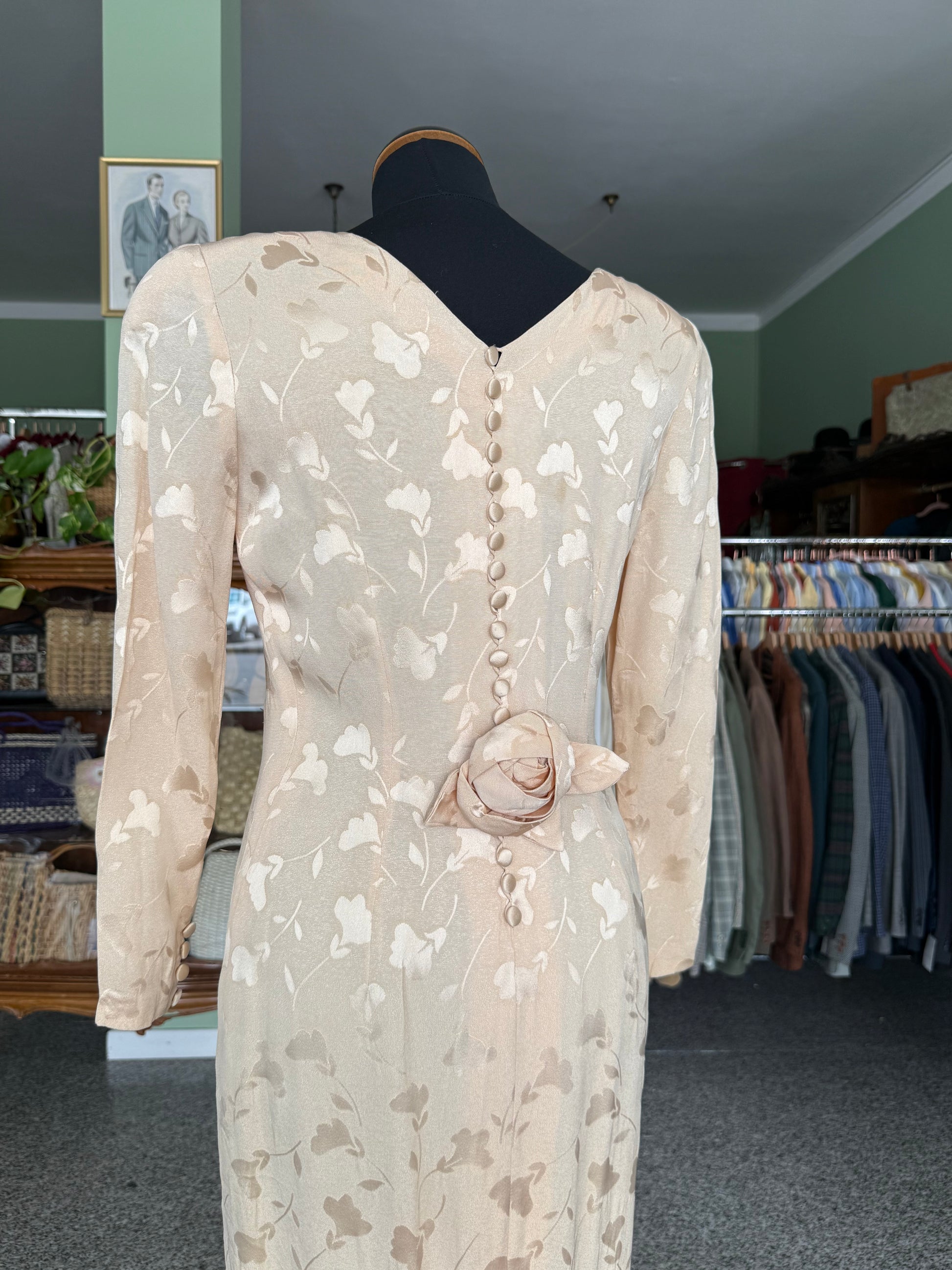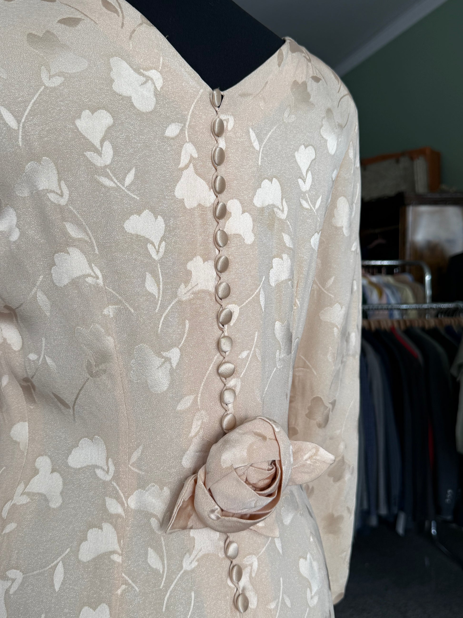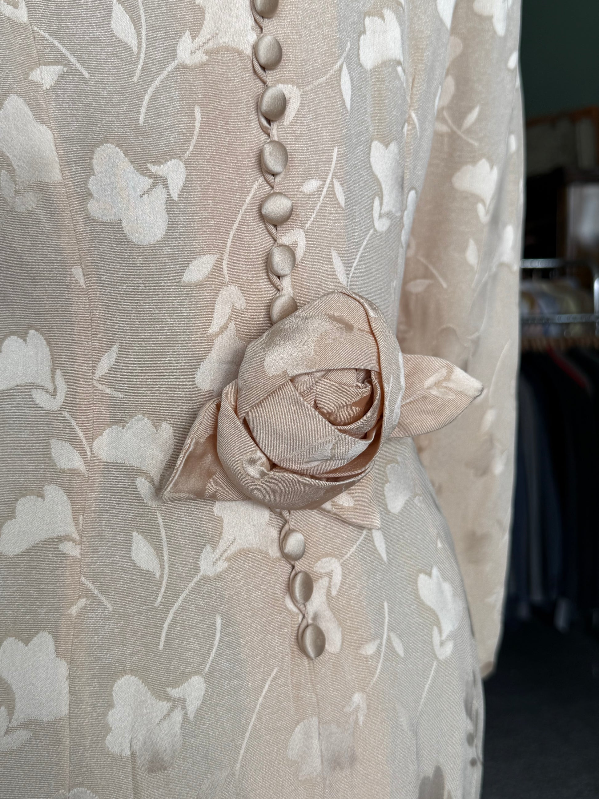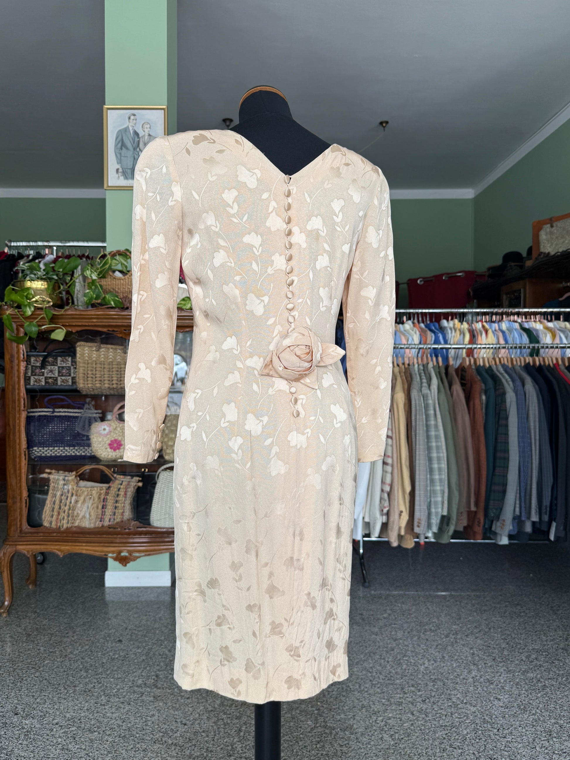 Abito anni ‘80 sartoriale, da cocktail, in tessuto Valentino color crema. Si tratta di una seta pregiata con fantasia raffinata tono su tono. L’abito presenta maniche lunghe che terminano con bottoncini foderati lungo i polsini. Gli stessi deliziosi bottoncini foderati li troviamo anche sul retro, lungo tutta la schiena. Sul retro è presenta anche una rosa, realizzata sempre nella medesima seta.