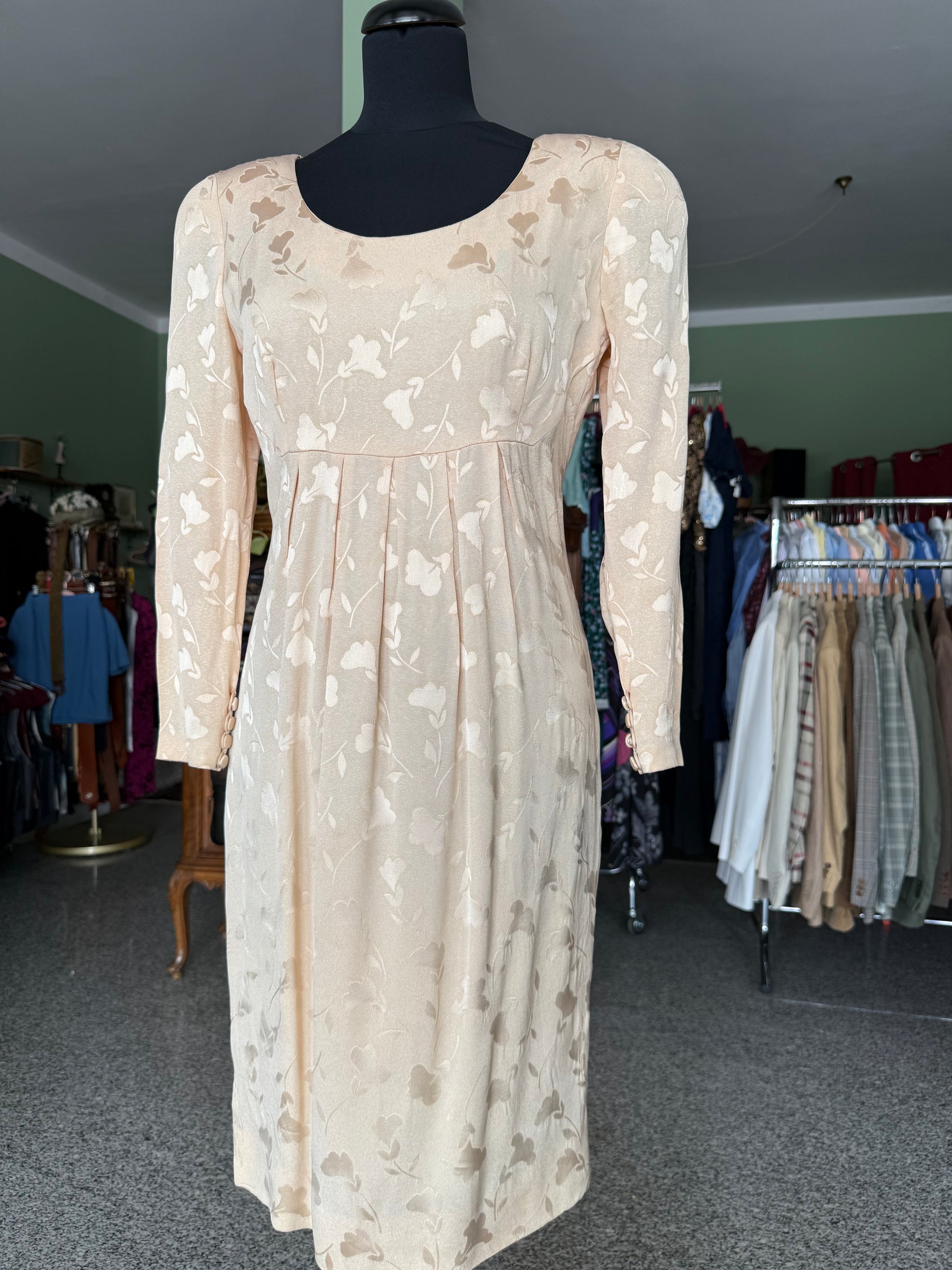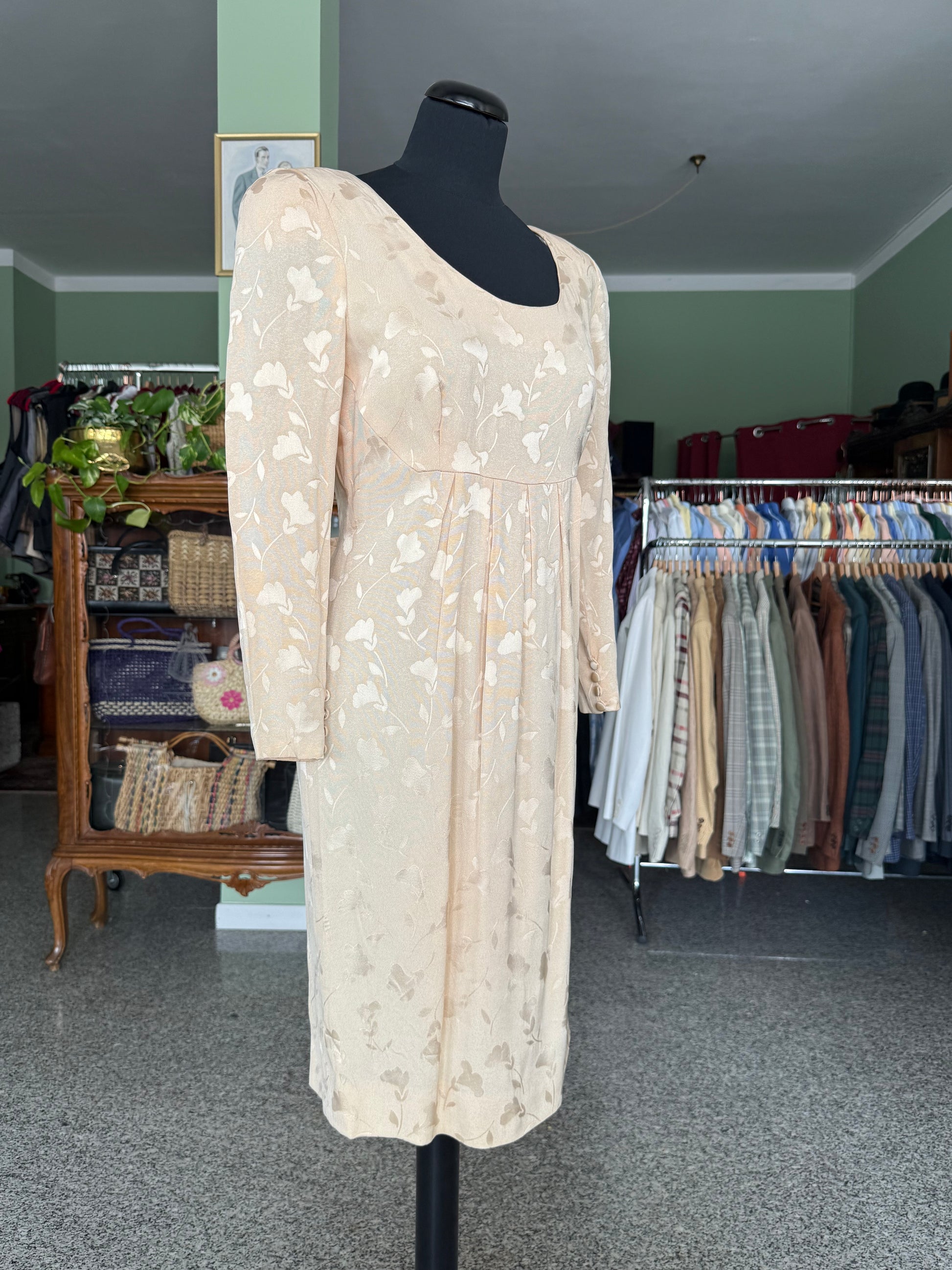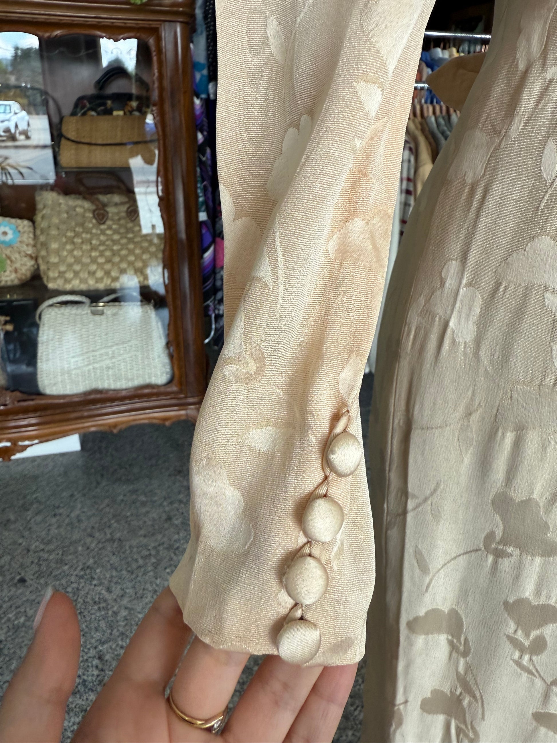 Abito anni ‘80 sartoriale, da cocktail, in tessuto Valentino color crema. Si tratta di una seta pregiata con fantasia raffinata tono su tono. L’abito presenta maniche lunghe che terminano con bottoncini foderati lungo i polsini. Gli stessi deliziosi bottoncini foderati li troviamo anche sul retro, lungo tutta la schiena. Sul retro è presenta anche una rosa, realizzata sempre nella medesima seta.