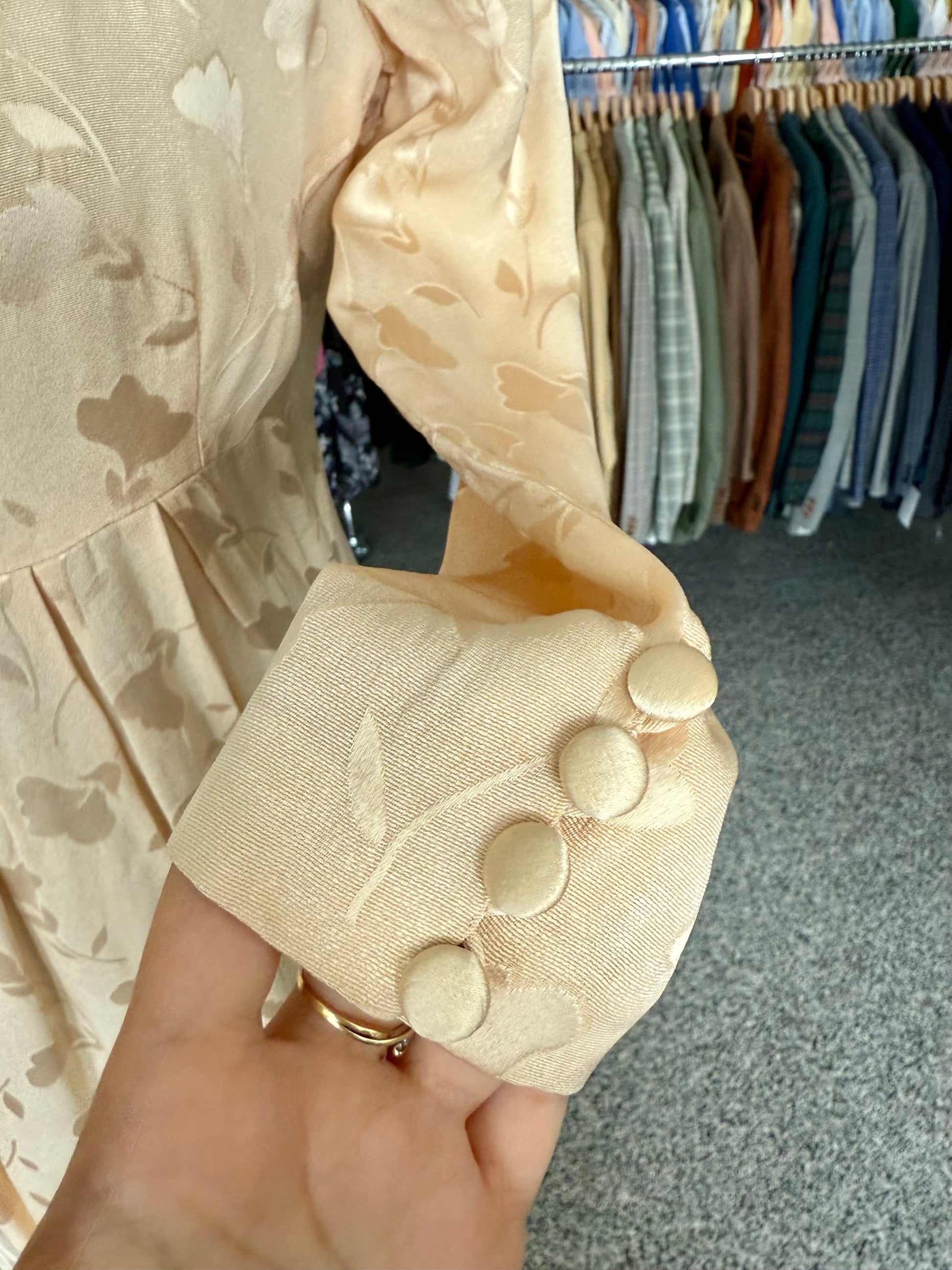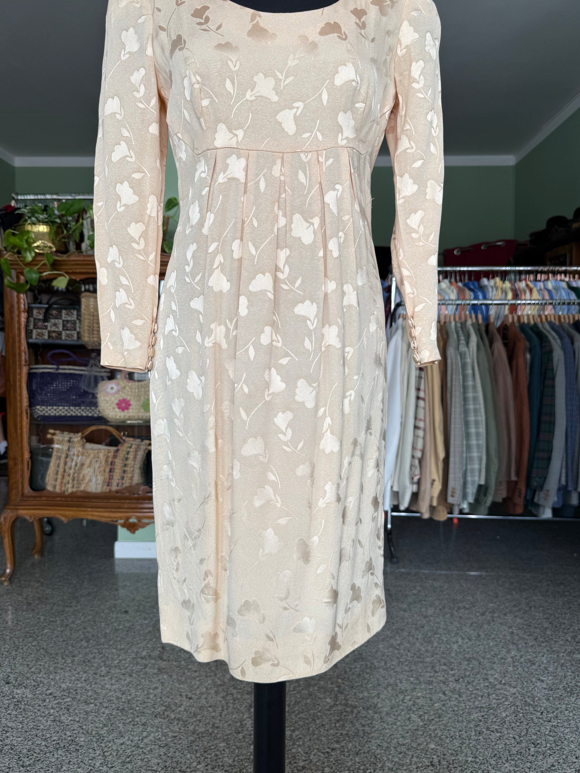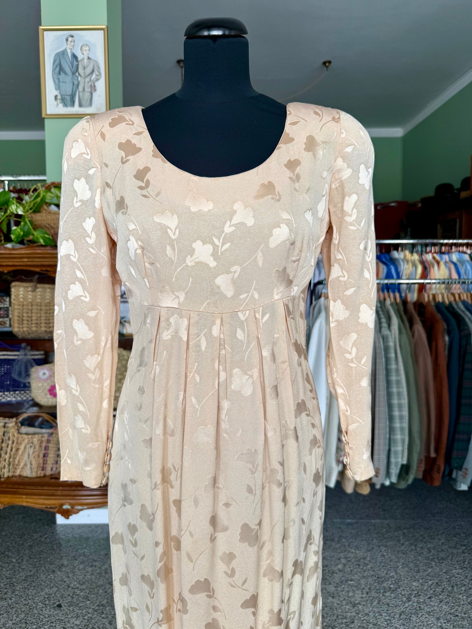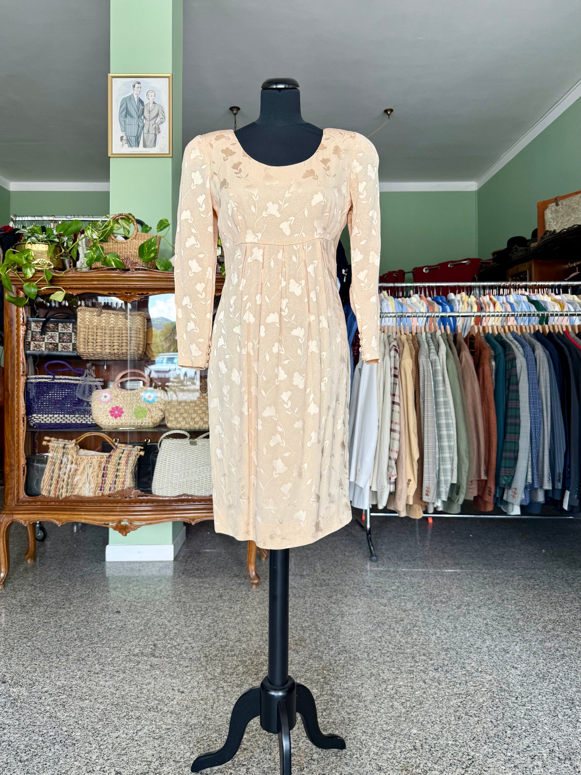 Abito anni ‘80 sartoriale, da cocktail, in tessuto Valentino color crema. Si tratta di una seta pregiata con fantasia raffinata tono su tono. L’abito presenta maniche lunghe che terminano con bottoncini foderati lungo i polsini. Gli stessi deliziosi bottoncini foderati li troviamo anche sul retro, lungo tutta la schiena. Sul retro è presenta anche una rosa, realizzata sempre nella medesima seta.
