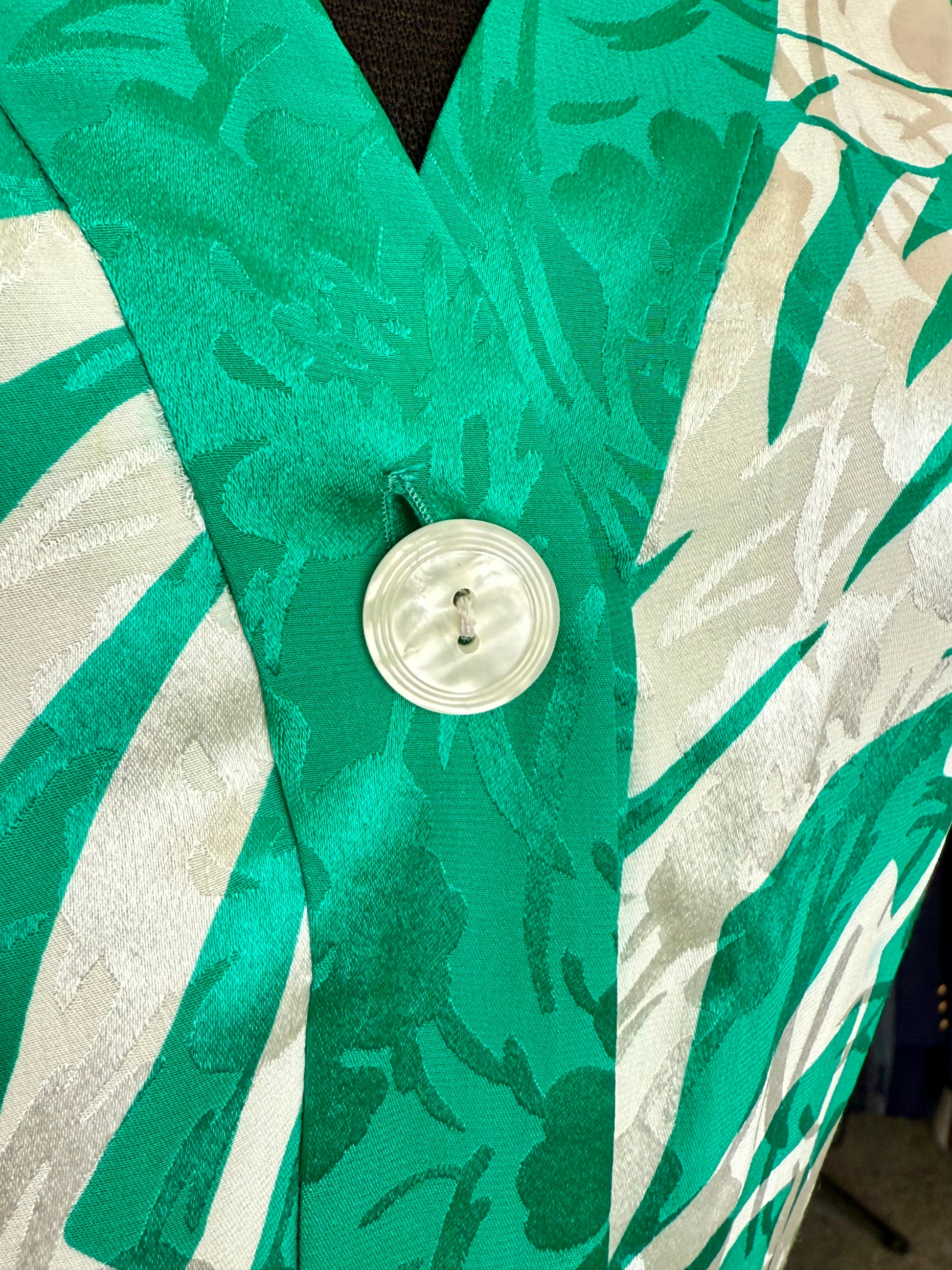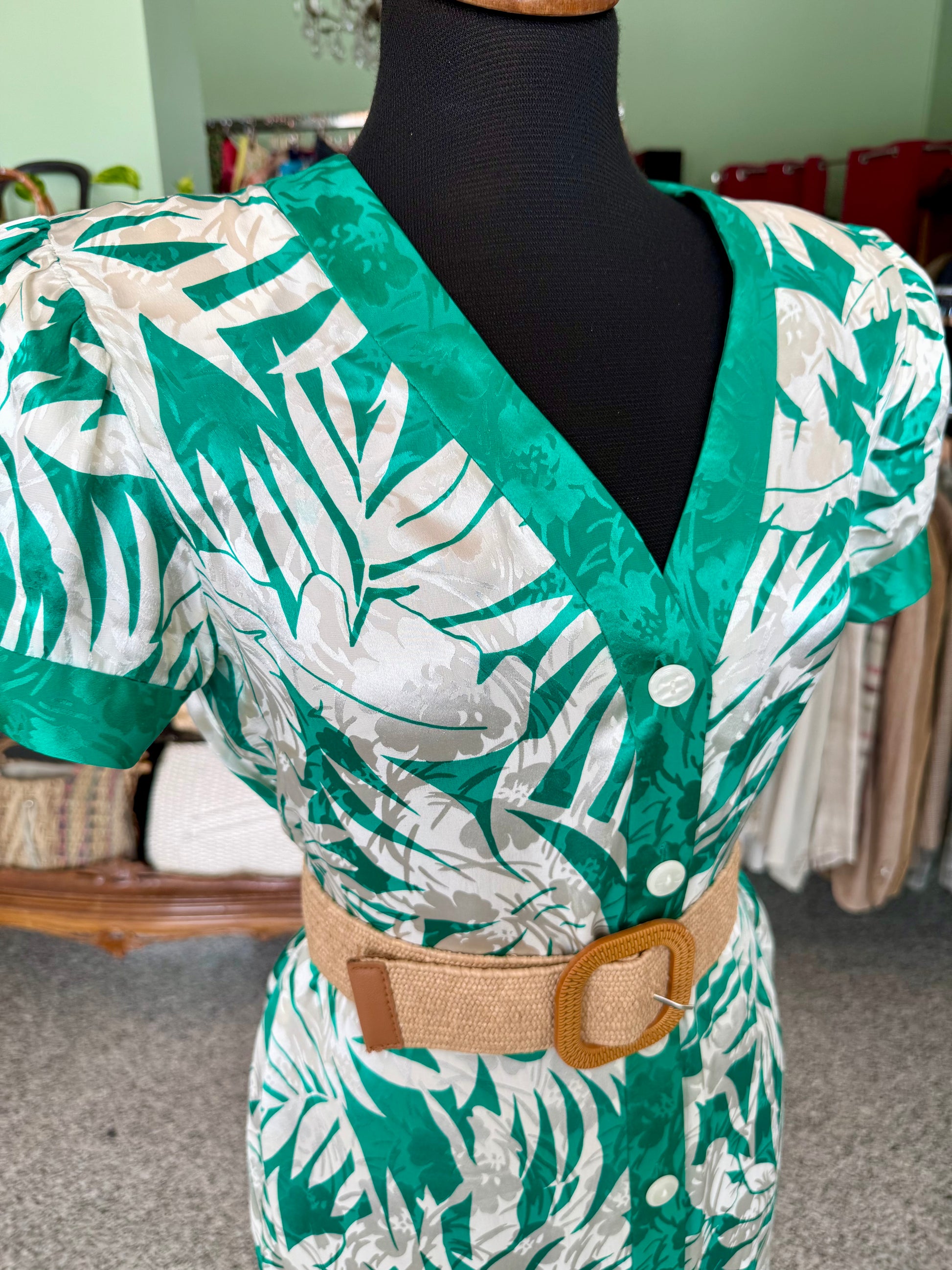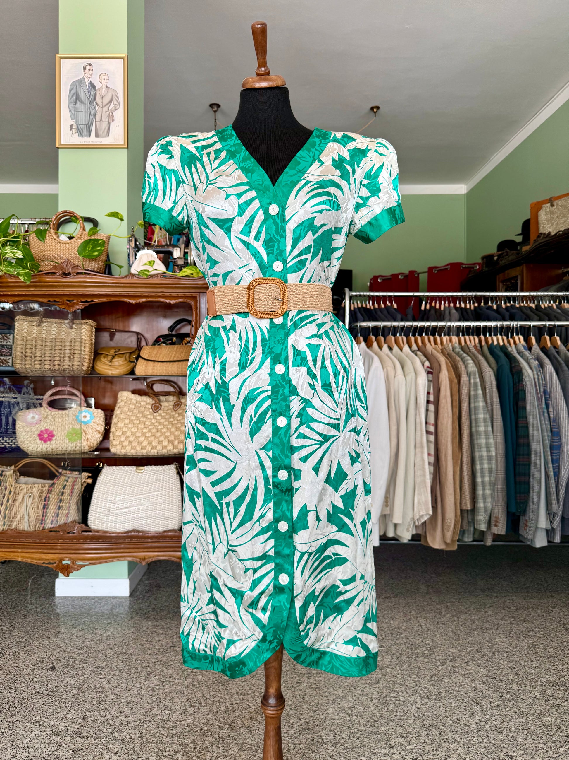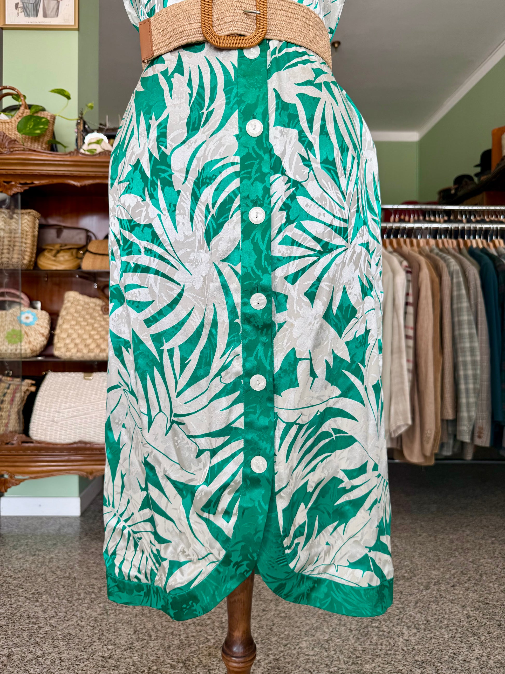 Colorato e fresco abito in pura seta degli anni ’80, con stampa tropicale verde e avorio, linea dritta e chiusura a bottoni madreperlati. Perfetto per dare un tocco esotico ed elegante alle giornate estive.