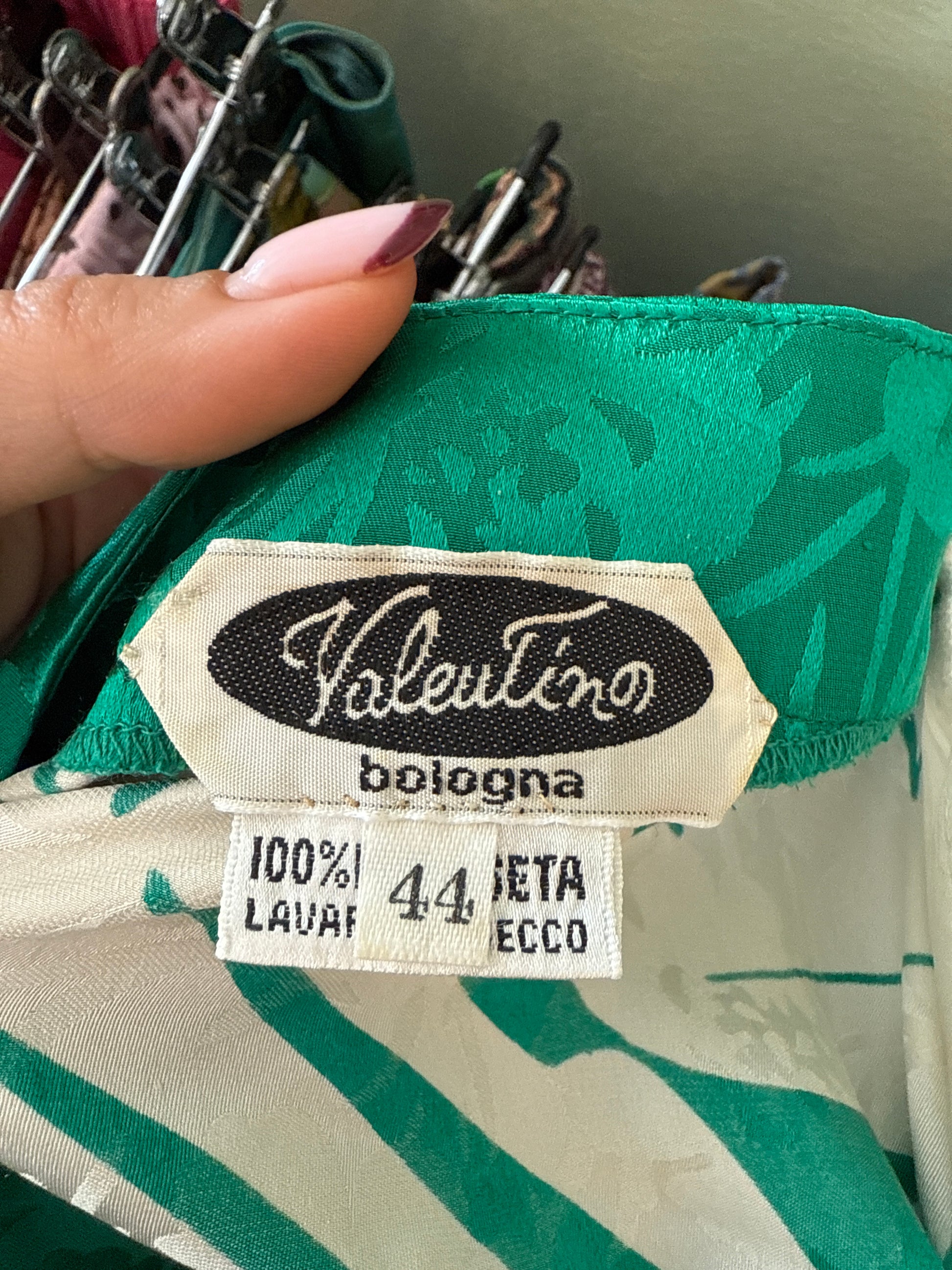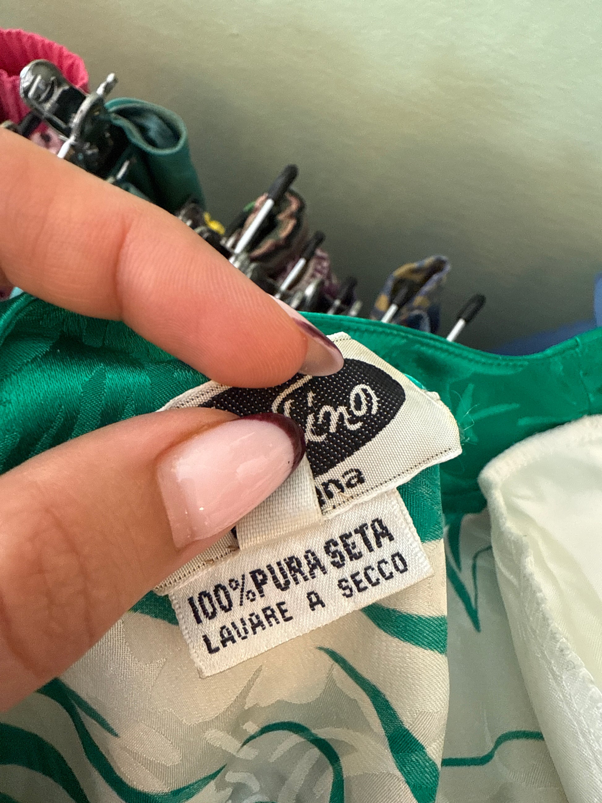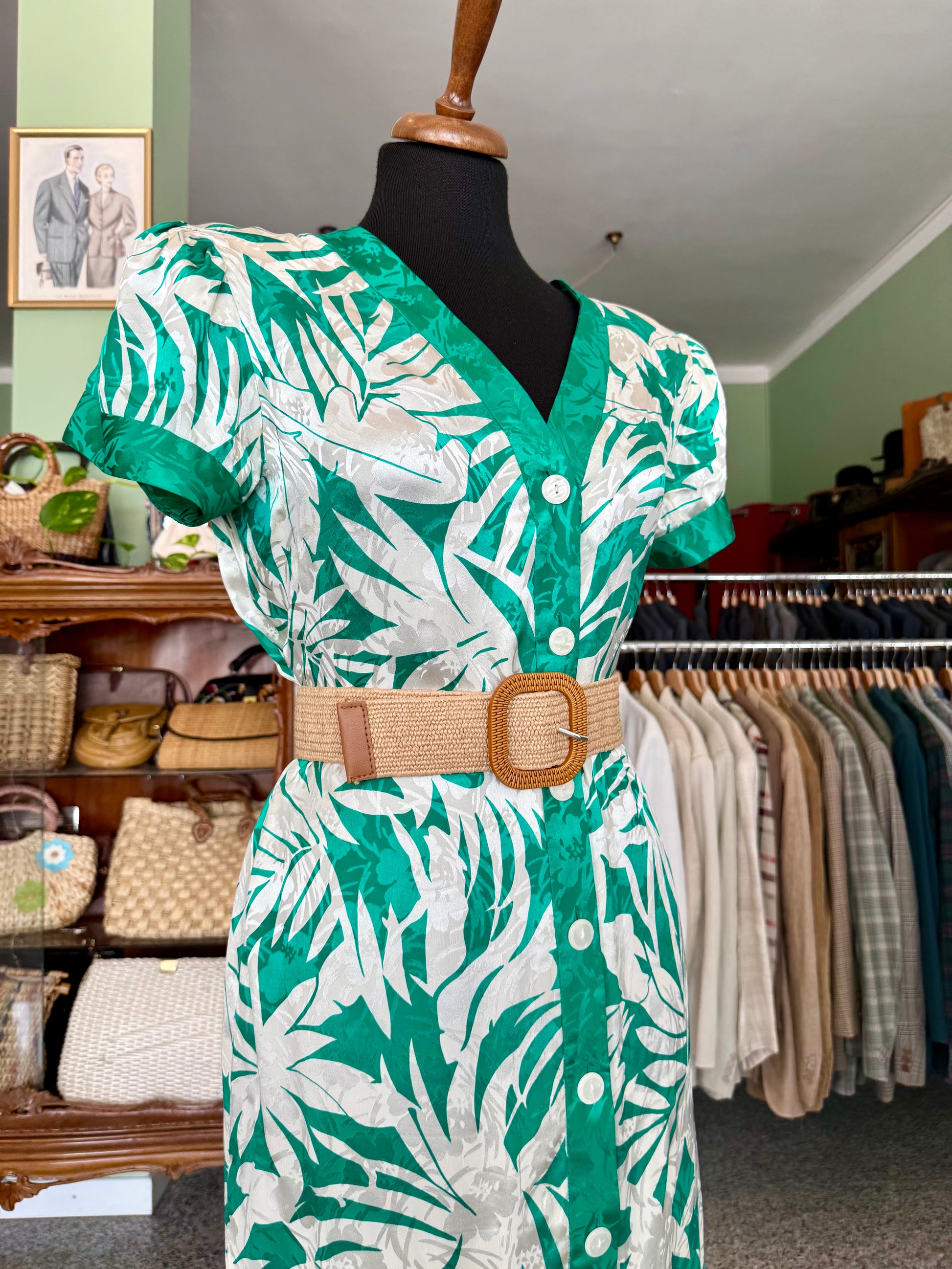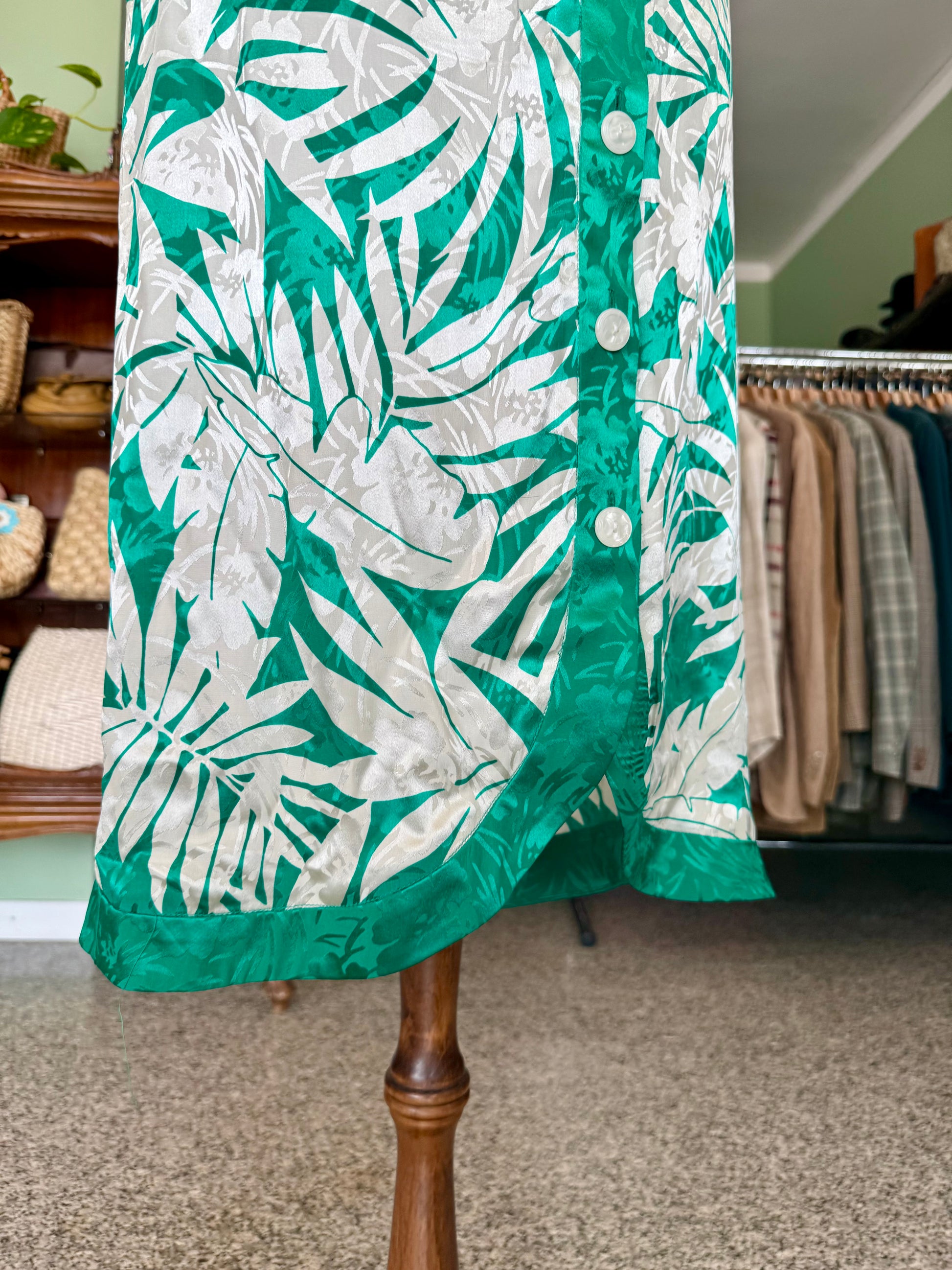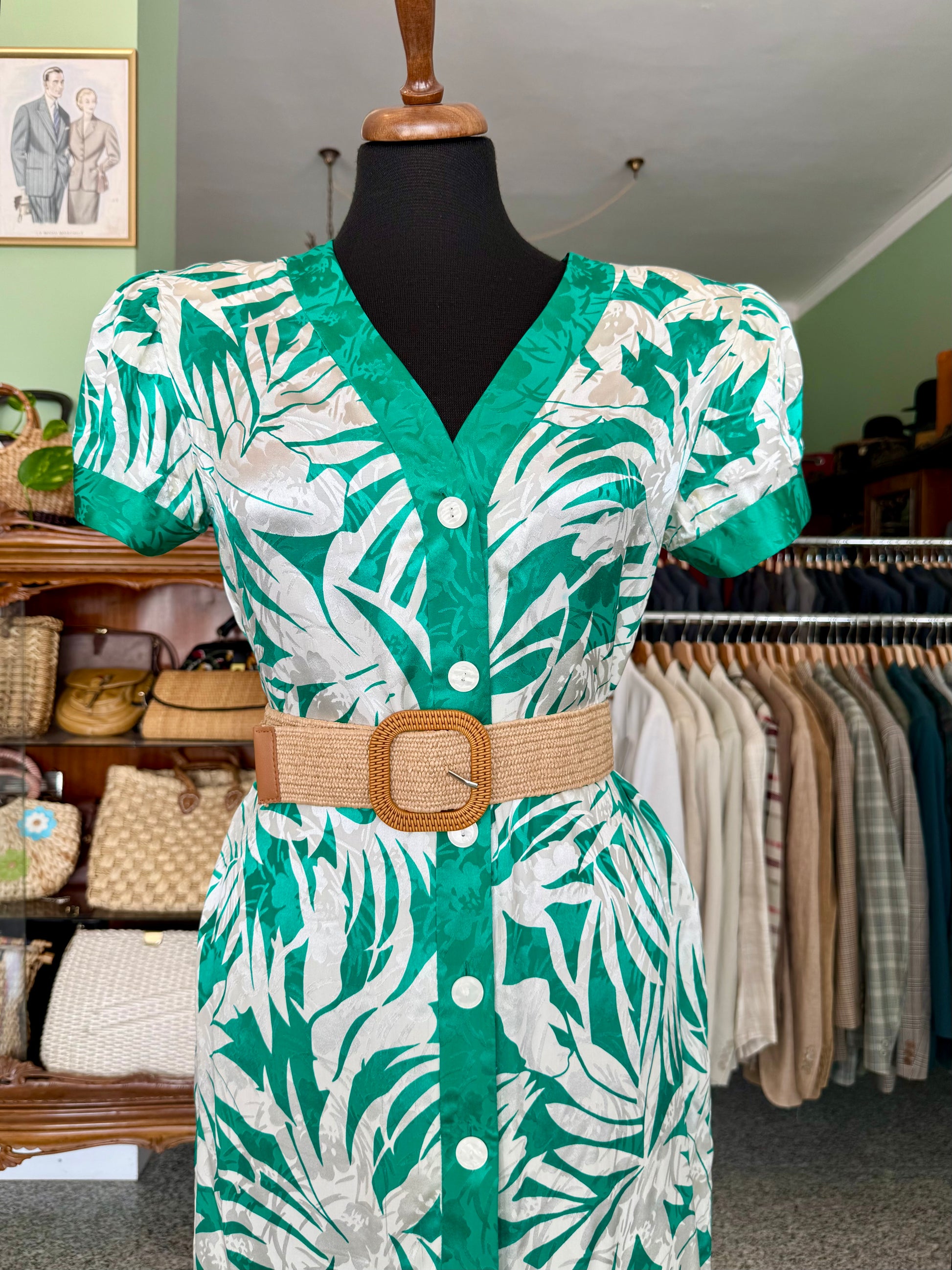Colorato e fresco abito in pura seta degli anni ’80, con stampa tropicale verde e avorio, linea dritta e chiusura a bottoni madreperlati. Perfetto per dare un tocco esotico ed elegante alle giornate estive.