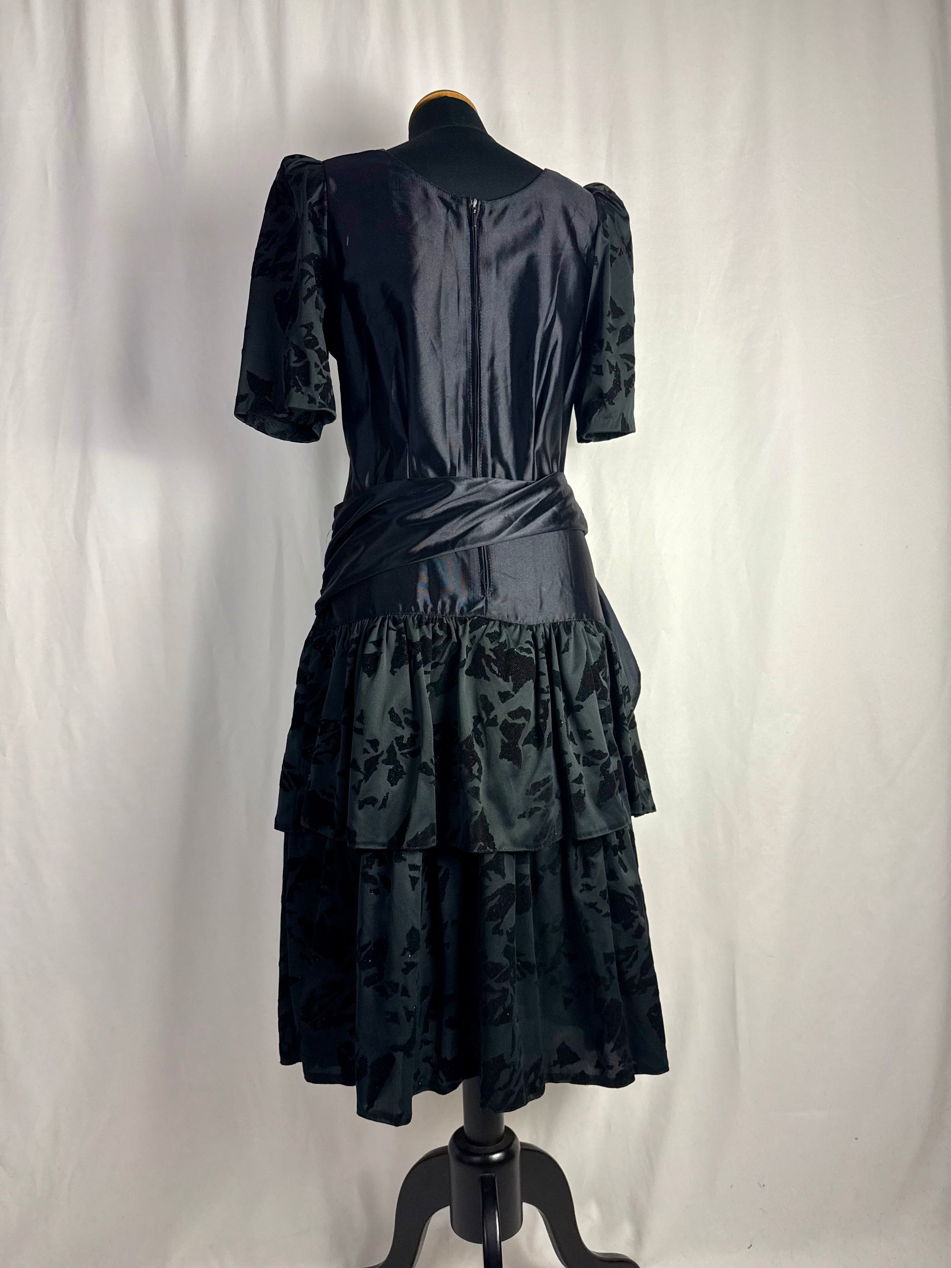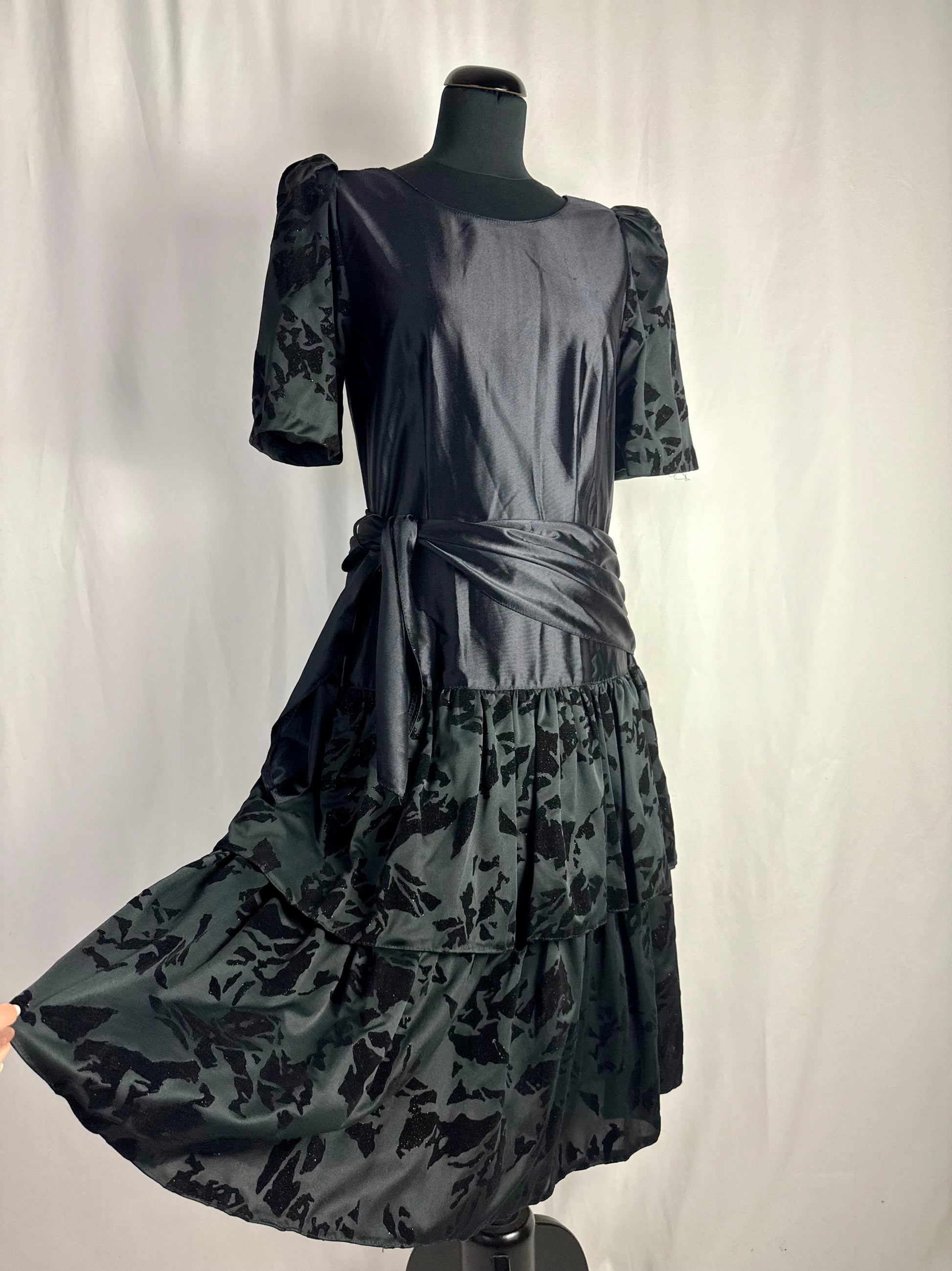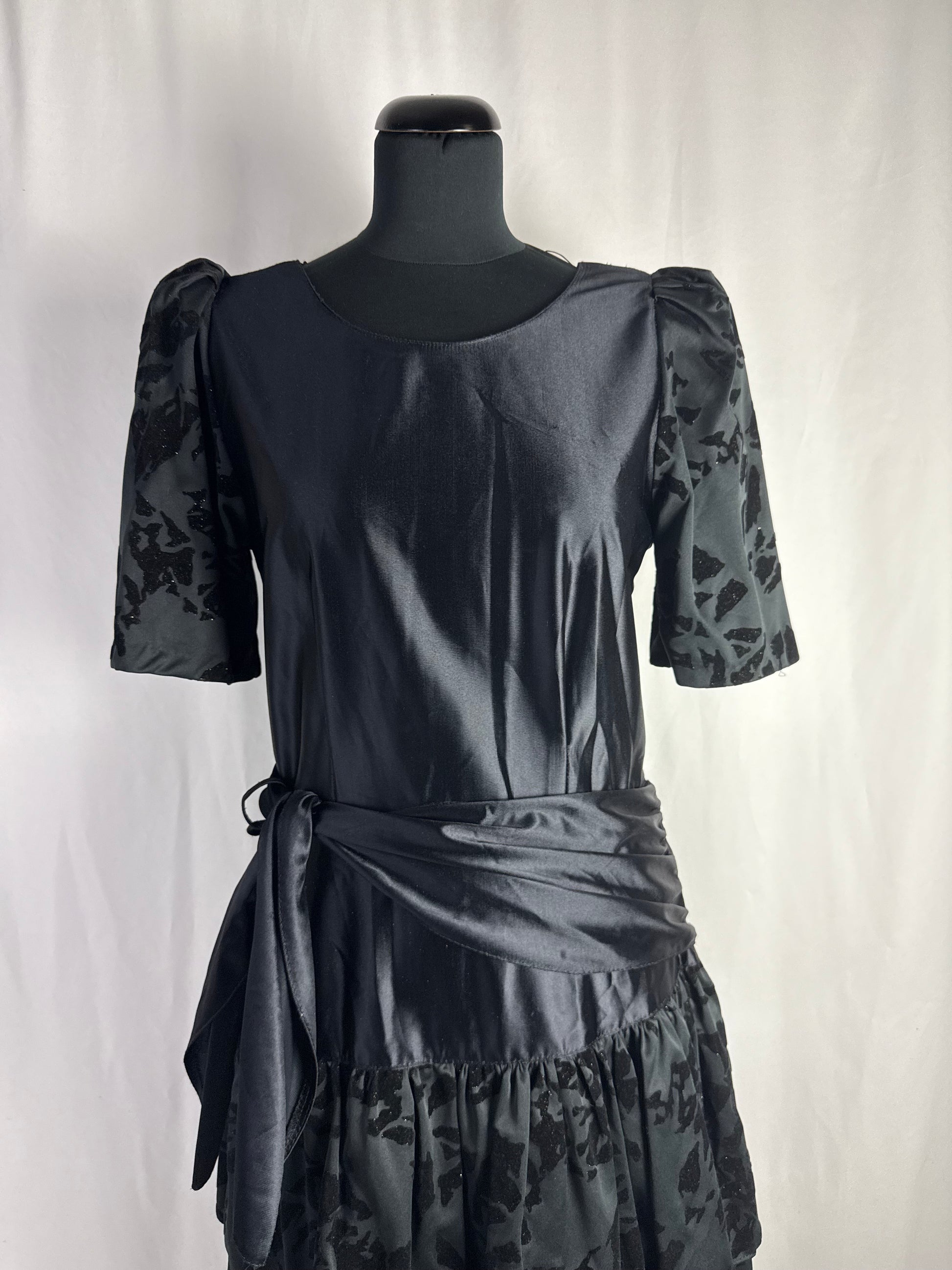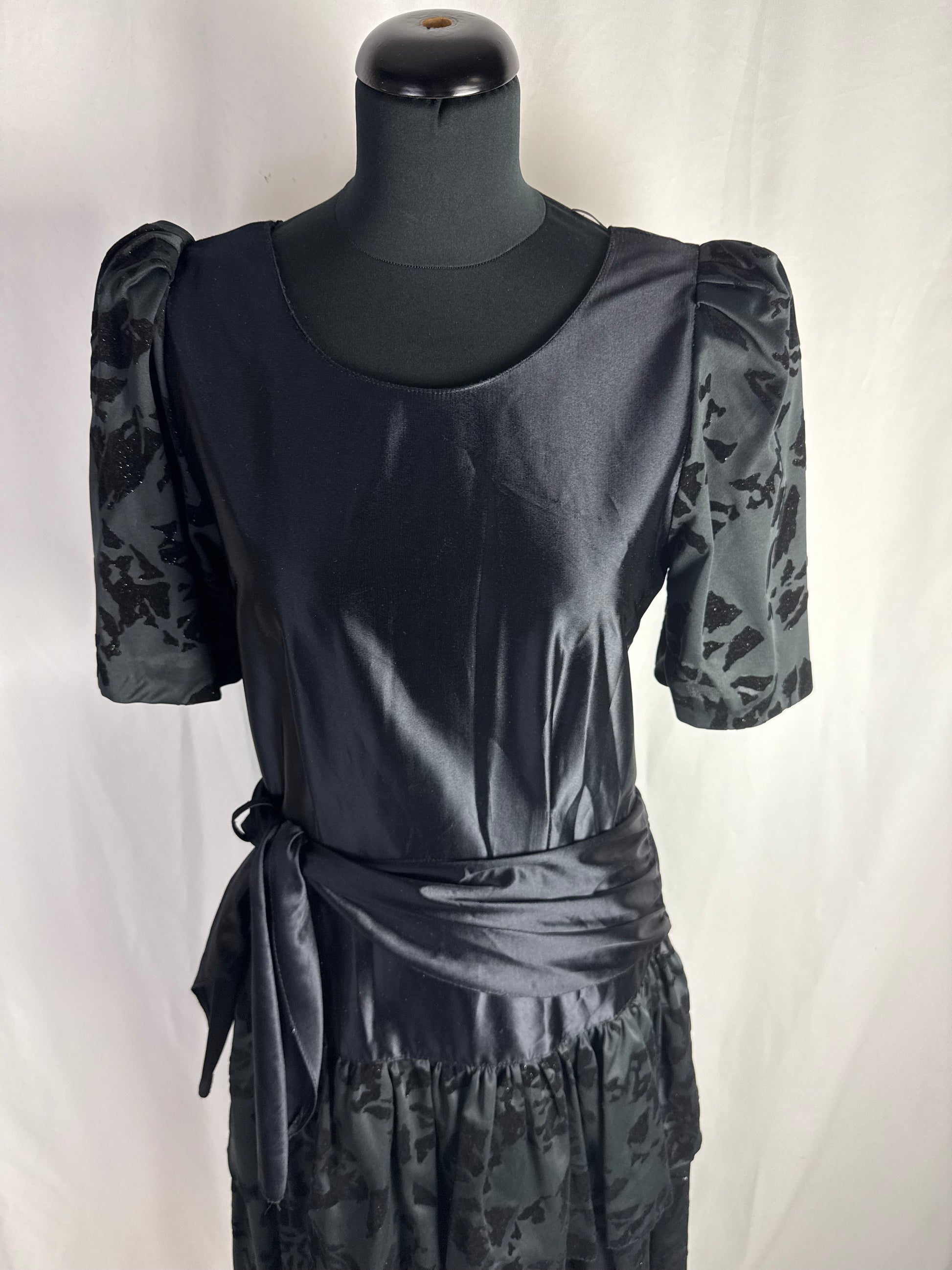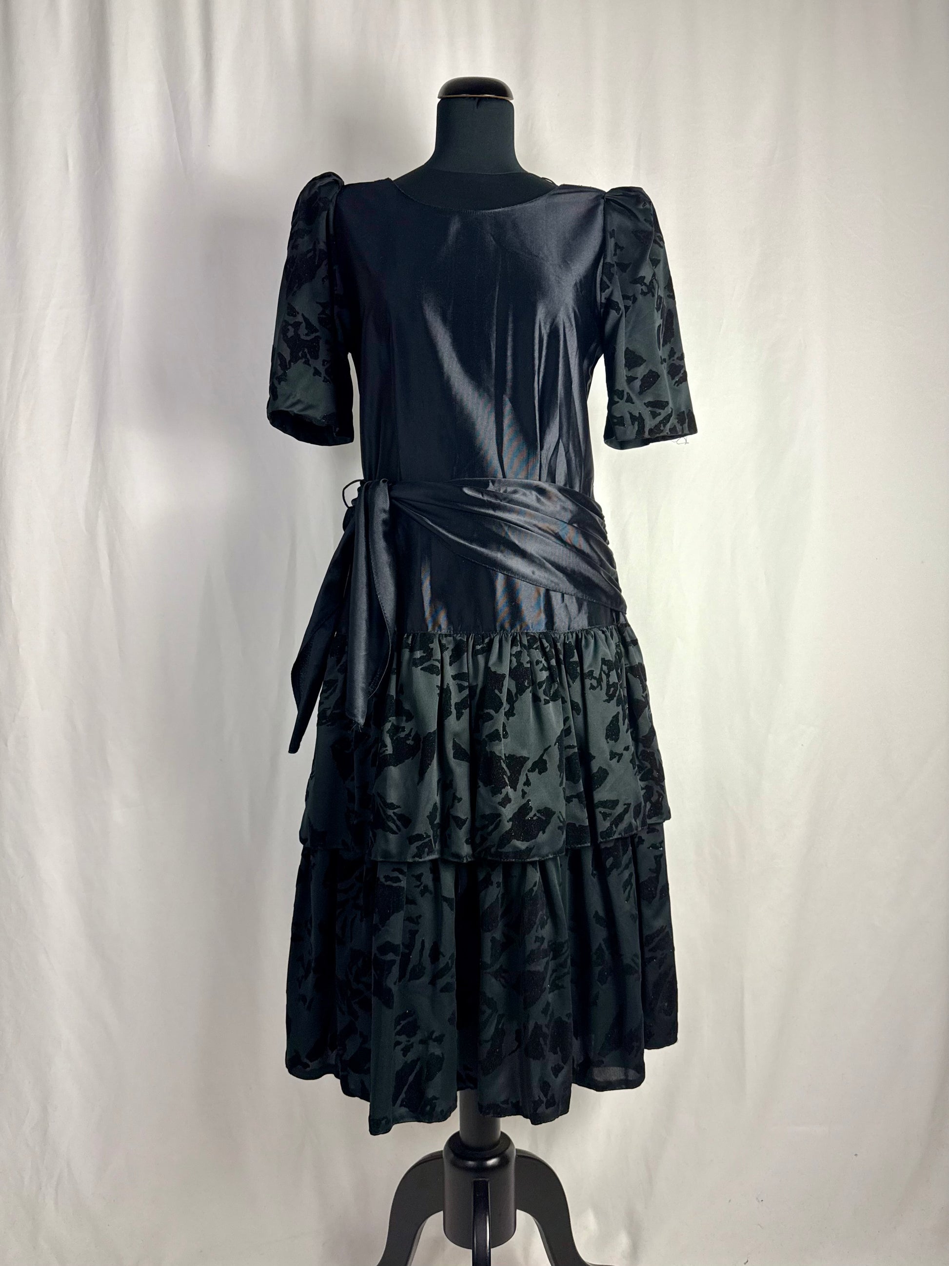 Abito anni ‘80 nero in raso con maniche a sbuffo realizzate in tessuto devoré vellutato, con motivo astratto tono su tono. Corpino liscio con scollo tondo, cintura drappeggiata integrata da annodare sul fianco e gonna midi a balze con inserti coordinati in devoré. Chiusura laterale, linea morbida e leggera, ideale come abito da sera o da festa