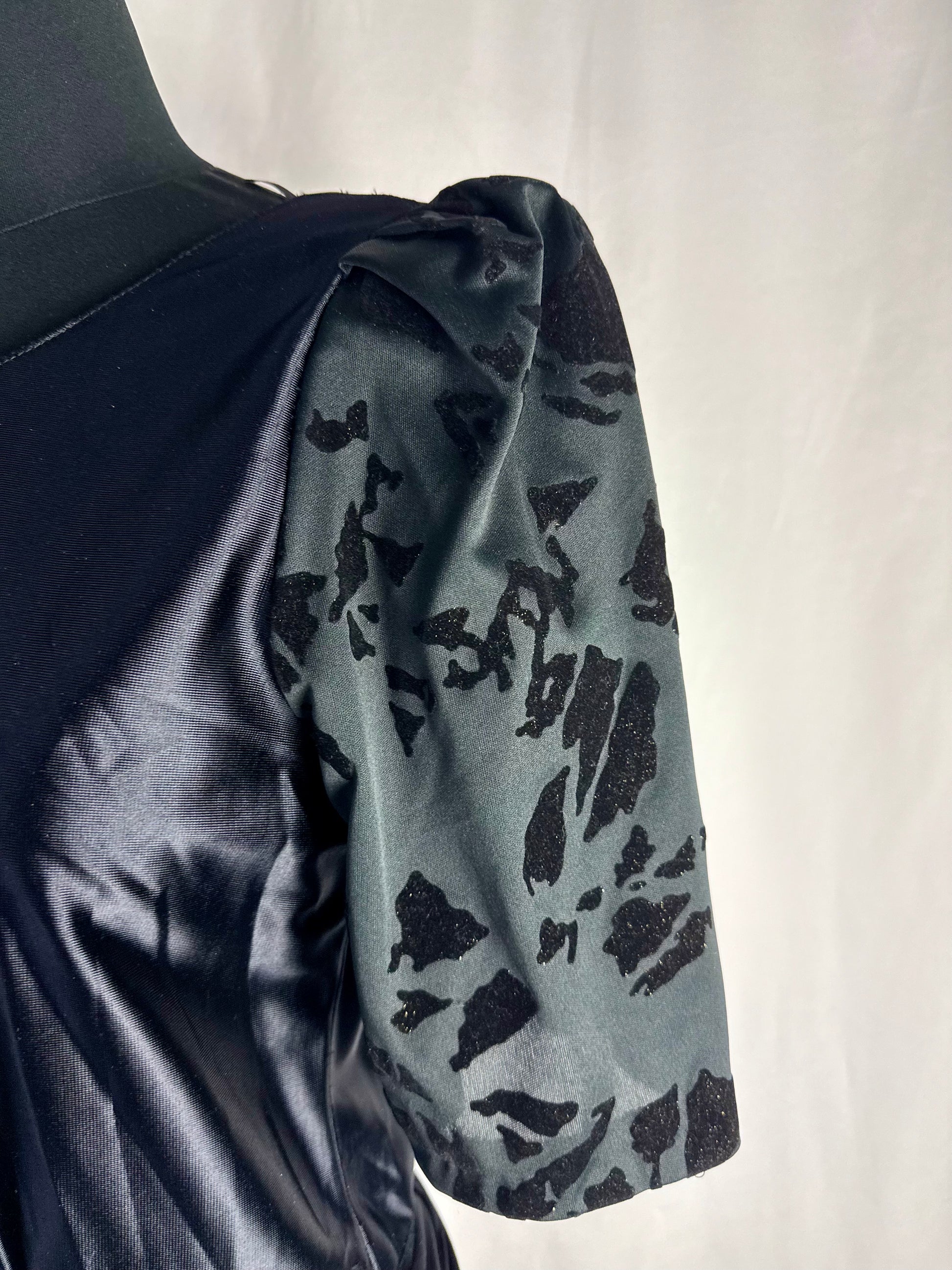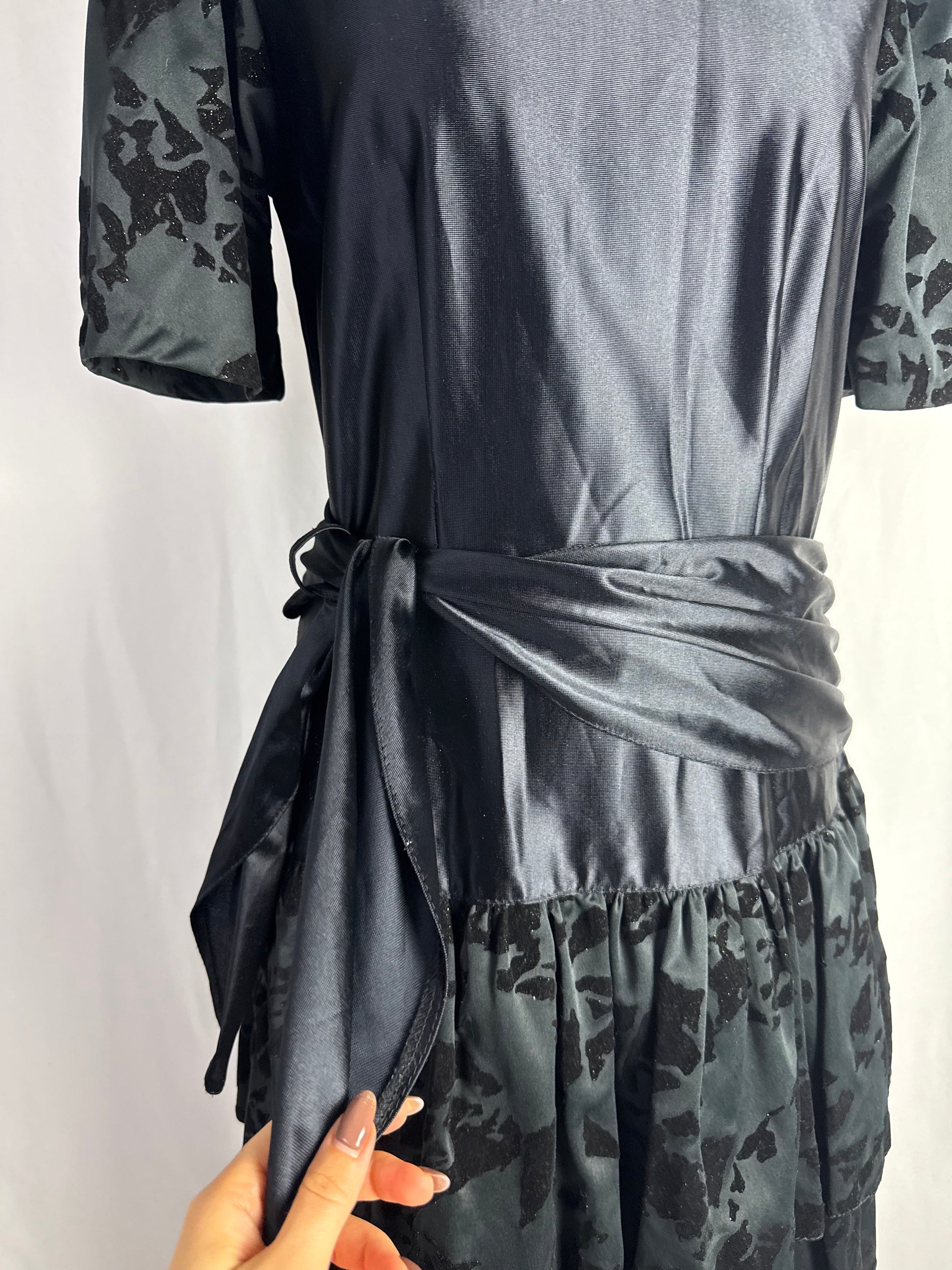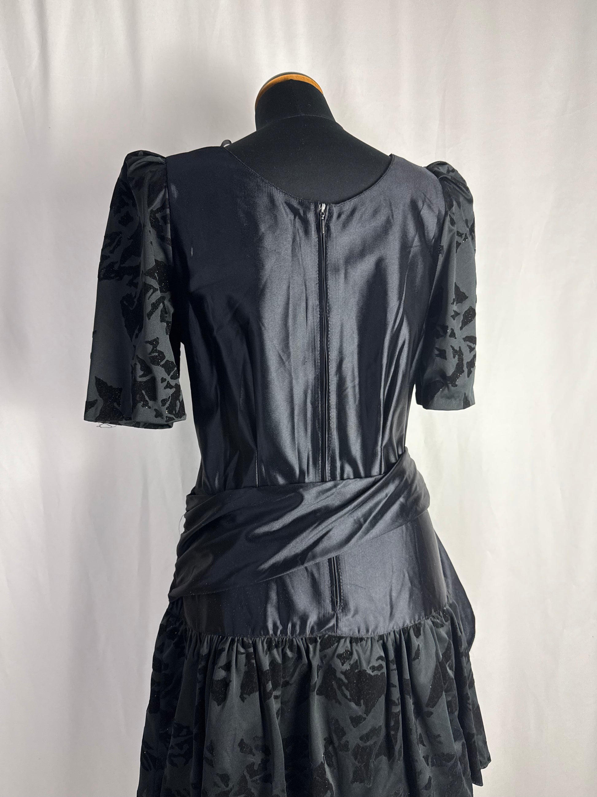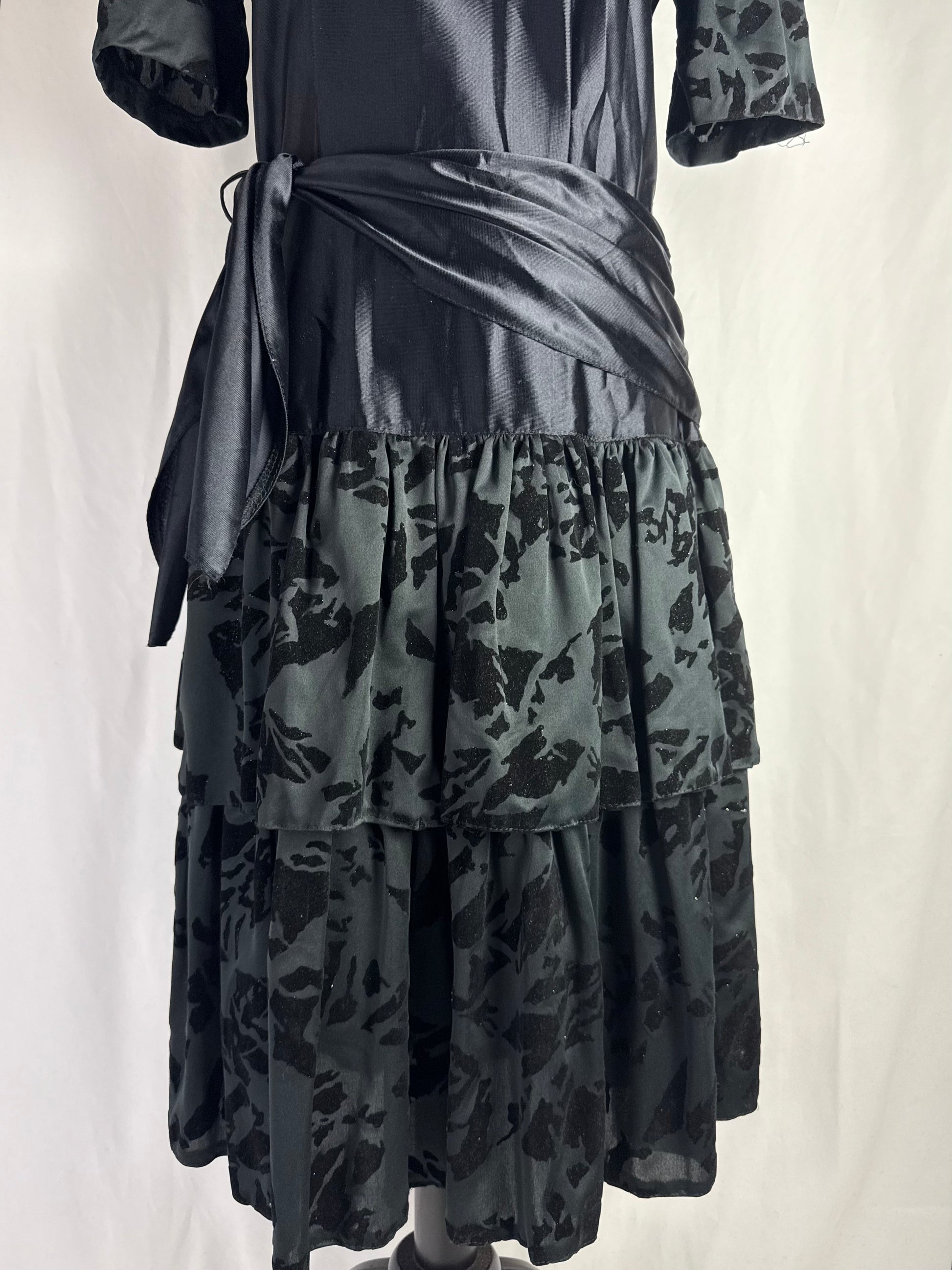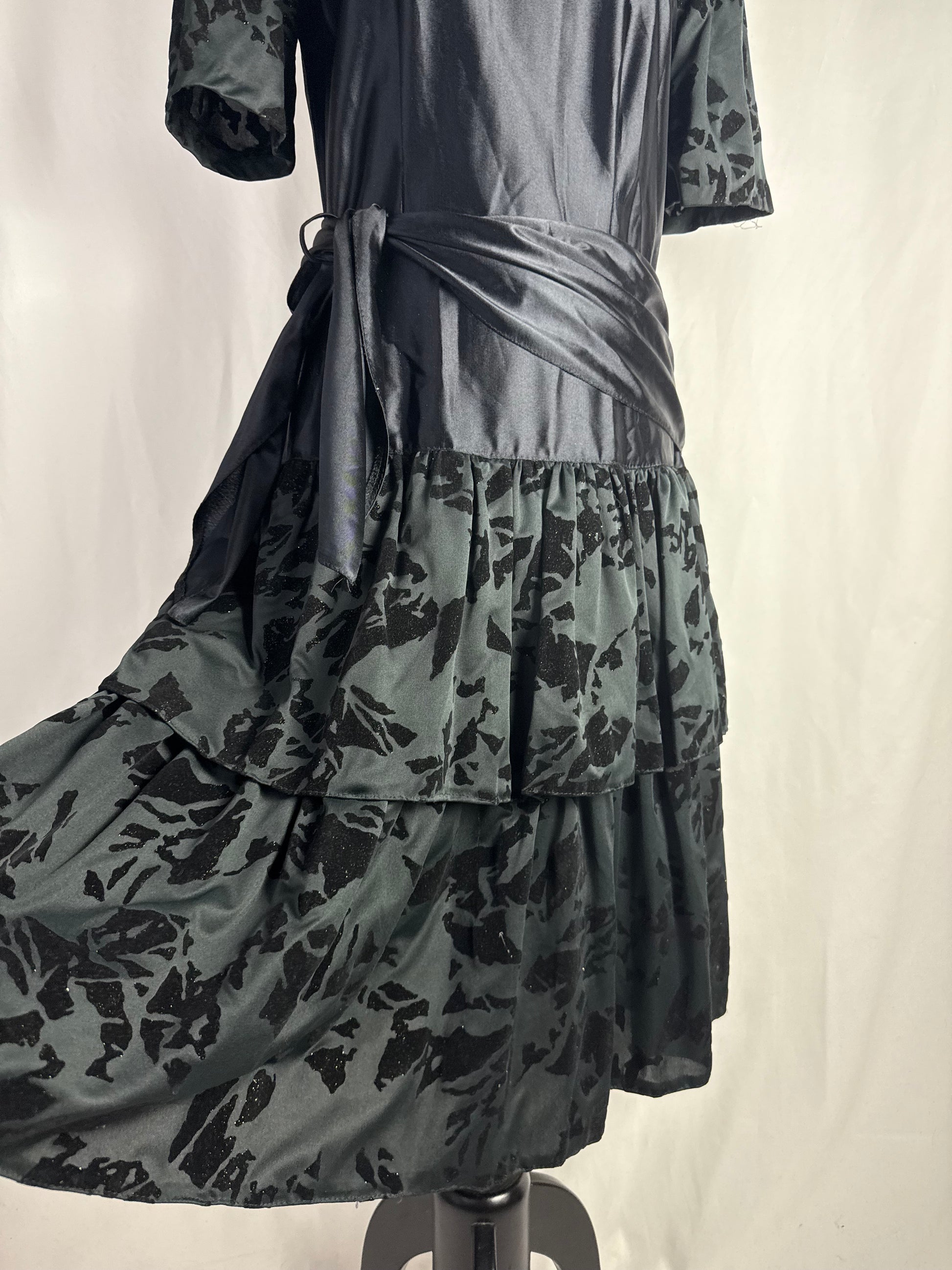 Abito anni ‘80 nero in raso con maniche a sbuffo realizzate in tessuto devoré vellutato, con motivo astratto tono su tono. Corpino liscio con scollo tondo, cintura drappeggiata integrata da annodare sul fianco e gonna midi a balze con inserti coordinati in devoré. Chiusura laterale, linea morbida e leggera, ideale come abito da sera o da festa