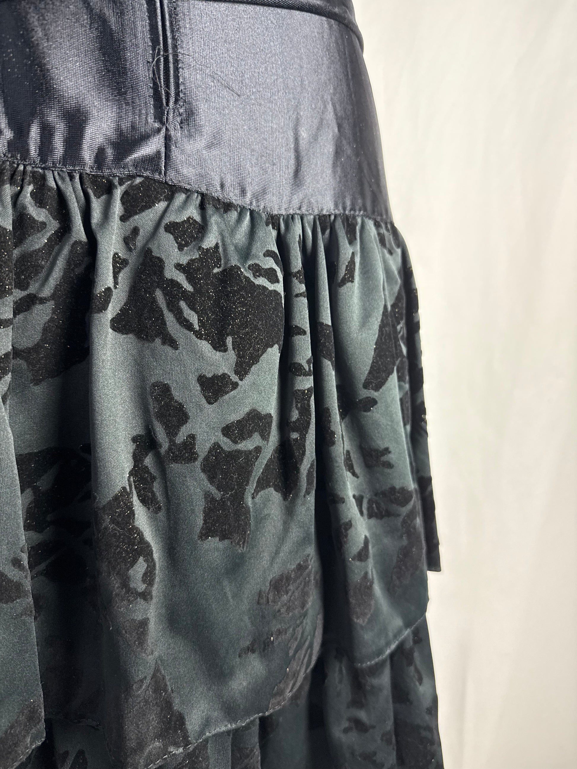 Abito anni ‘80 nero in raso con gonna a balze - TG. 40