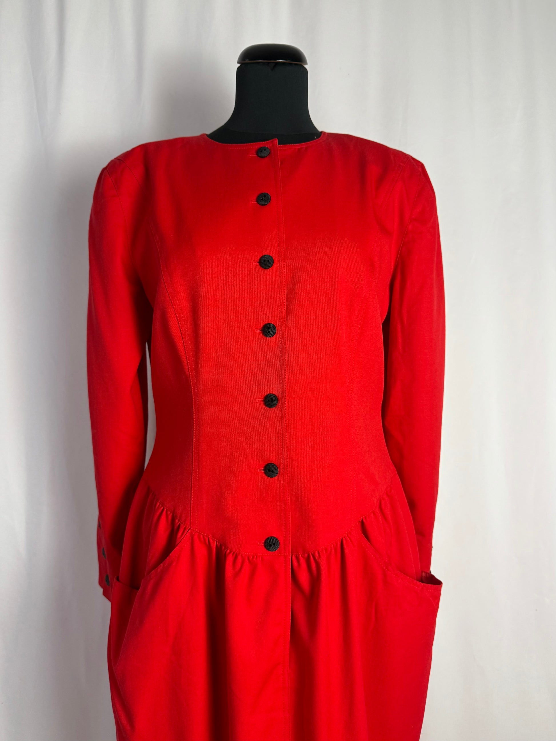 Abito anni ‘80 rosso in gabardine di lana con bottoni neri - TG. 46