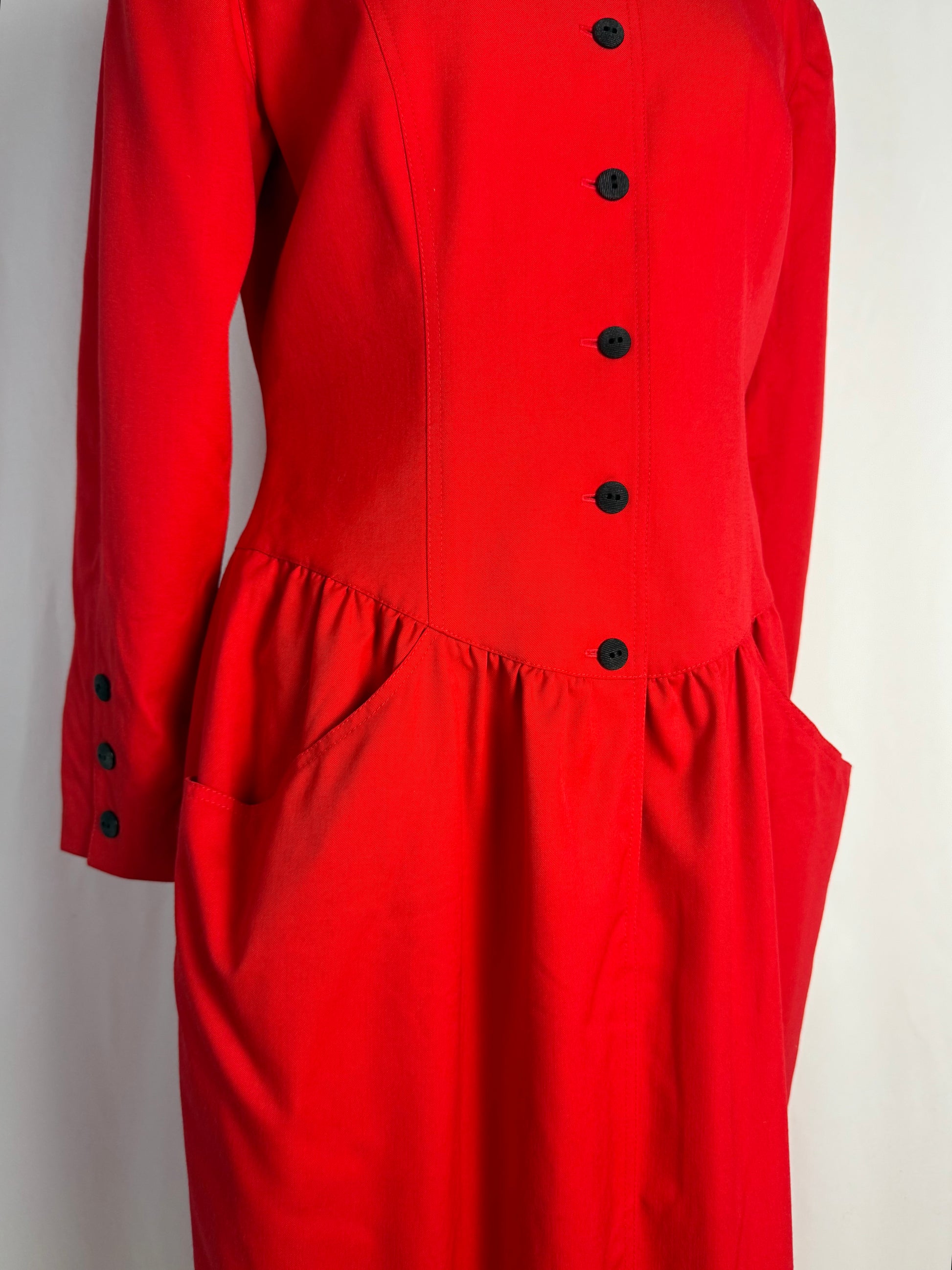 Abito rosso anni ‘80 in puna lana compatta, caratterizzato da una linea strutturata anni ’80 con bustino sagomato e gonna leggermente arricciata. La chiusura frontale è completata da una fila di bottoni neri che crea un contrasto grafico elegante, ripreso anche nei polsini con tre bottoni applicati. Le maniche lunghe e la spalla leggermente accennata valorizzano la silhouette, mentre la presenza delle tasche laterali aggiunge praticità al modello.