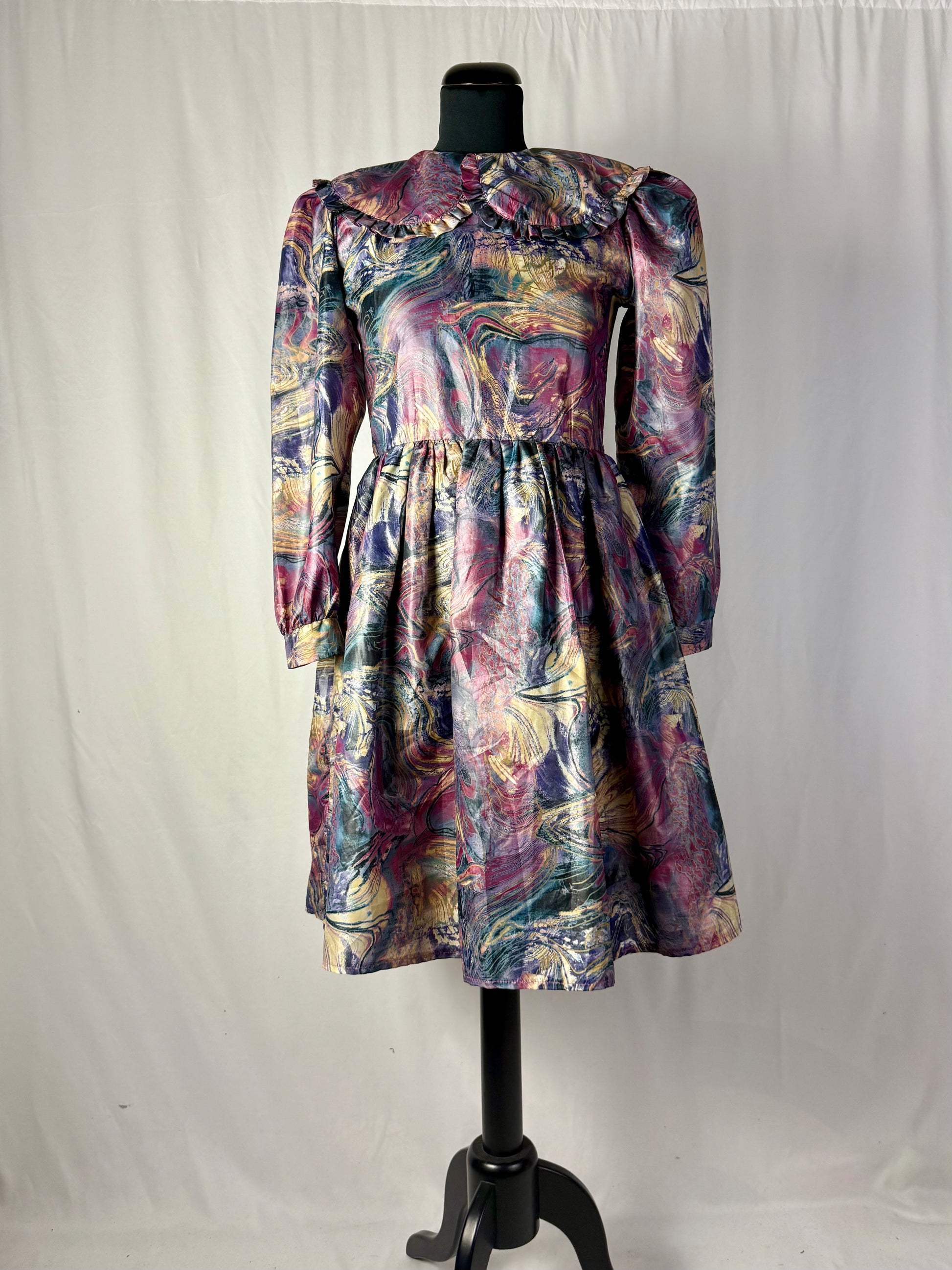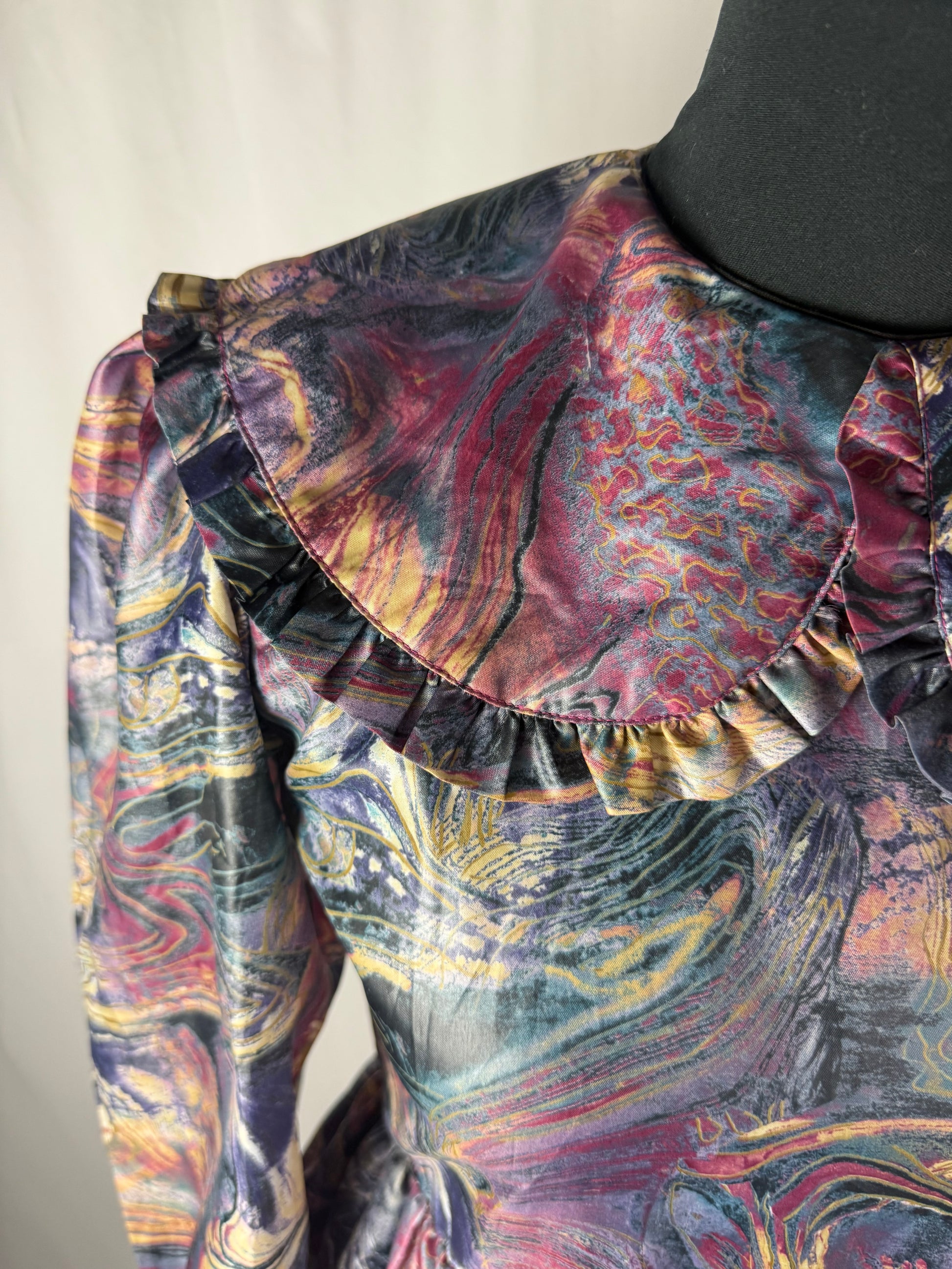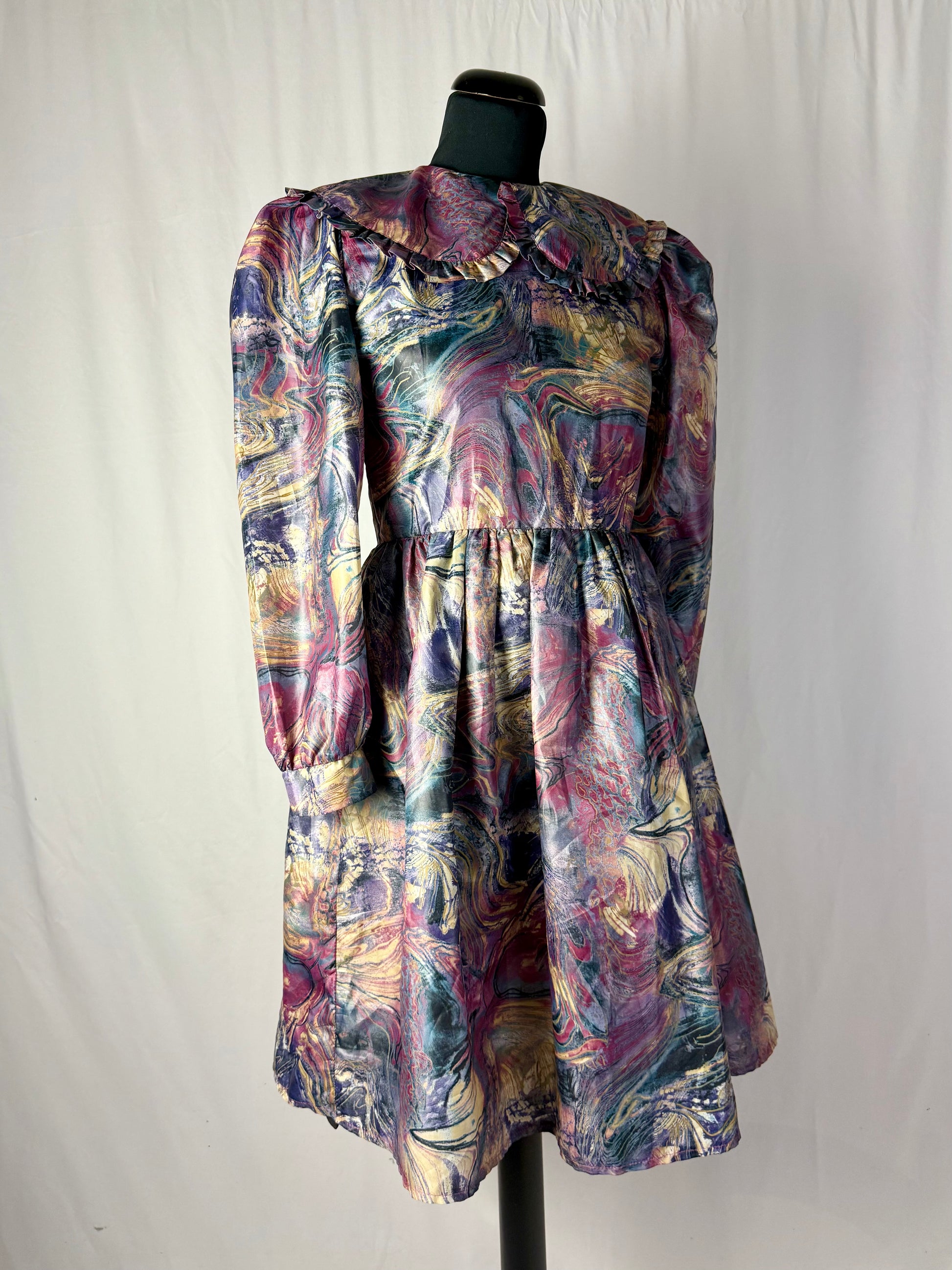 Un abito unico nel suo genere, con stampa marmorizzata multicolor nei toni del viola, blu, giallo e rosa. Il tessuto lucente e l’intramontabile linea con gonna ampia donano movimento e femminilità, mentre il maxi colletto con rouches aggiunge un tocco romantico e retrò.