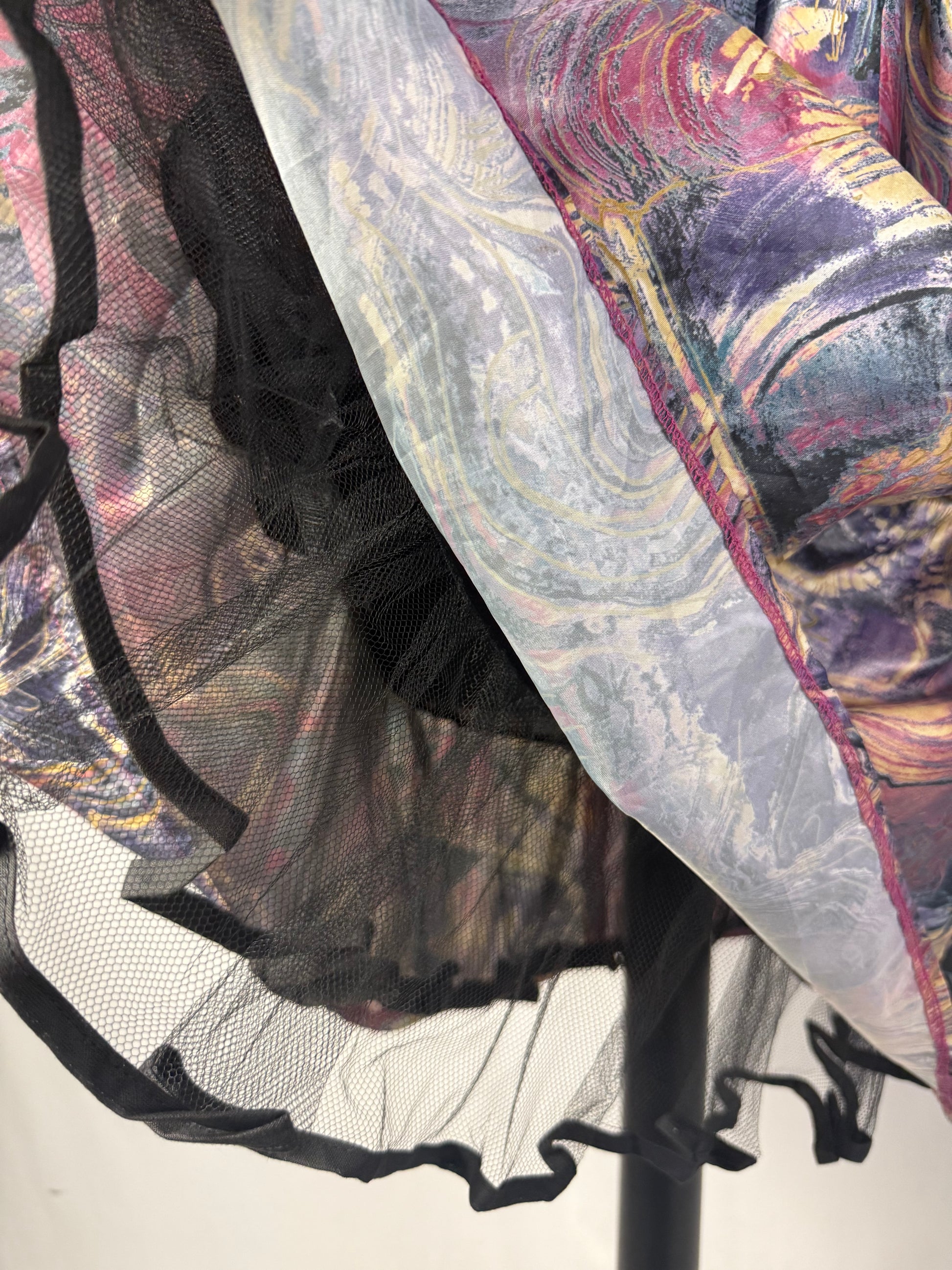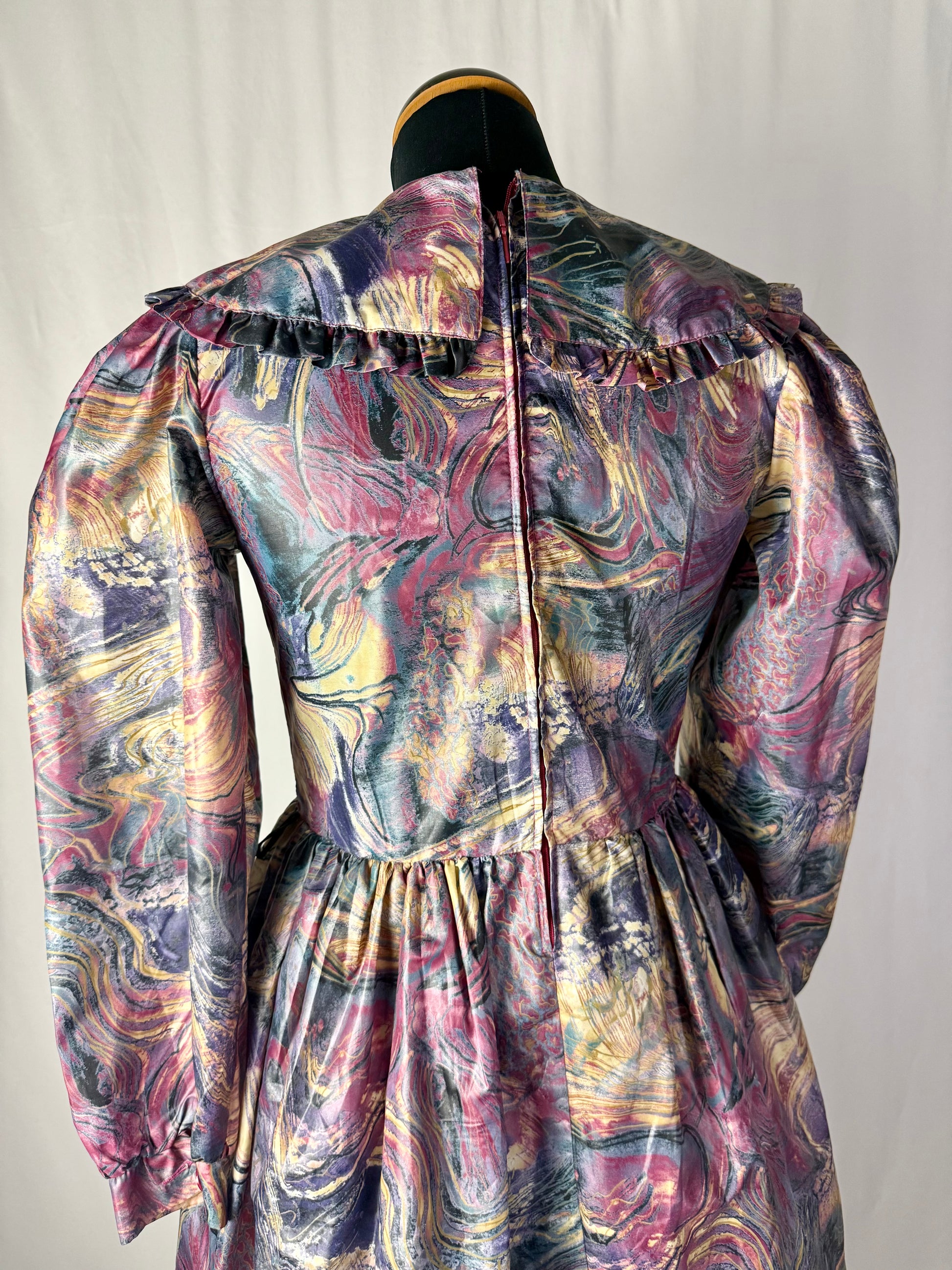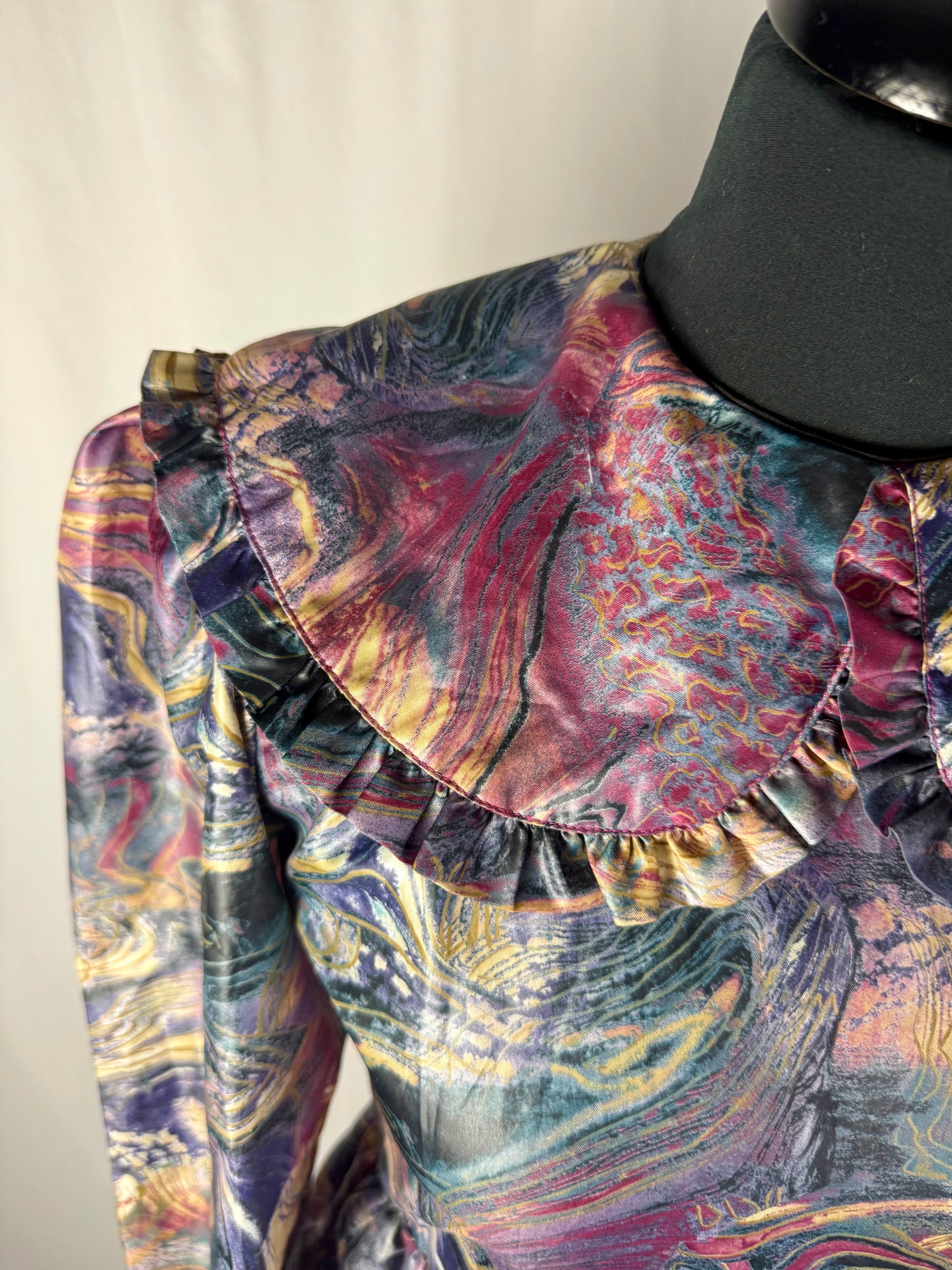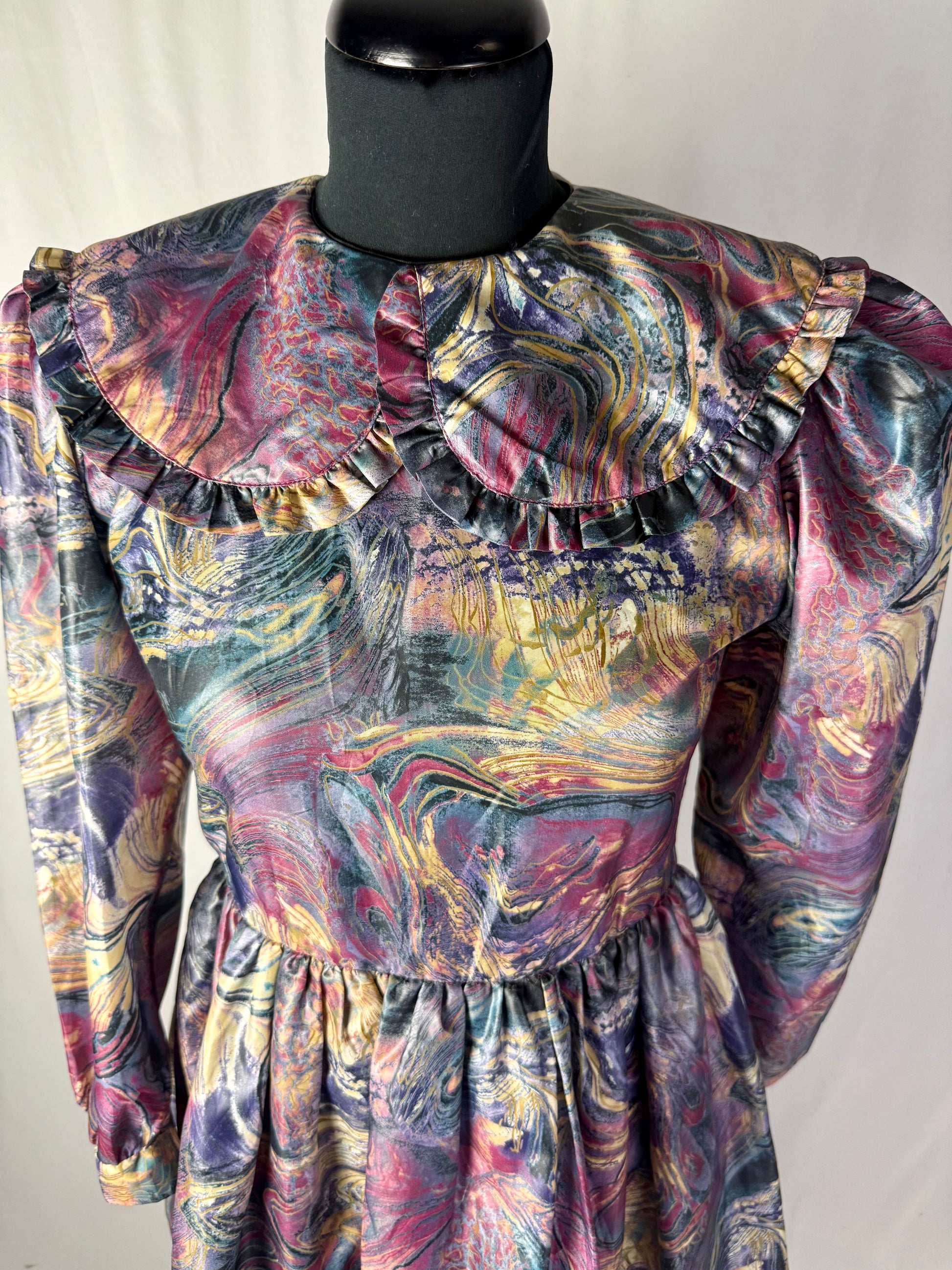 Un abito unico nel suo genere, con stampa marmorizzata multicolor nei toni del viola, blu, giallo e rosa. Il tessuto lucente e l’intramontabile linea con gonna ampia donano movimento e femminilità, mentre il maxi colletto con rouches aggiunge un tocco romantico e retrò.