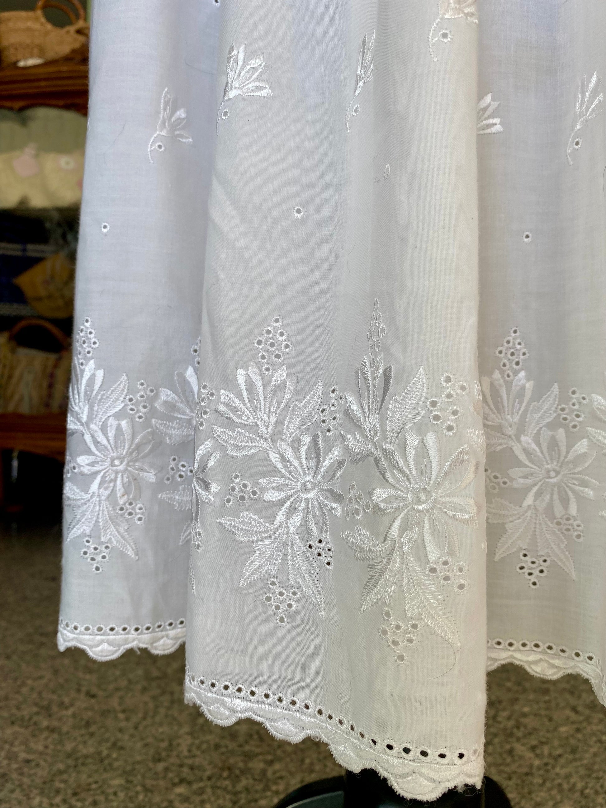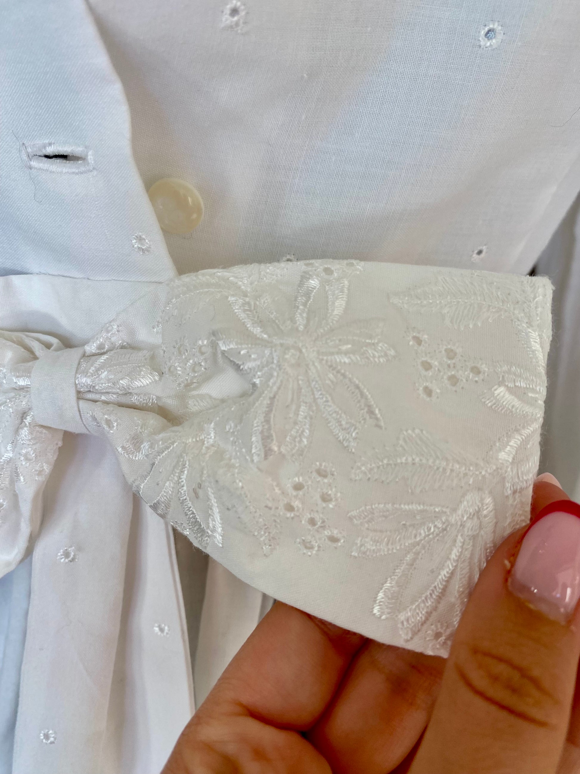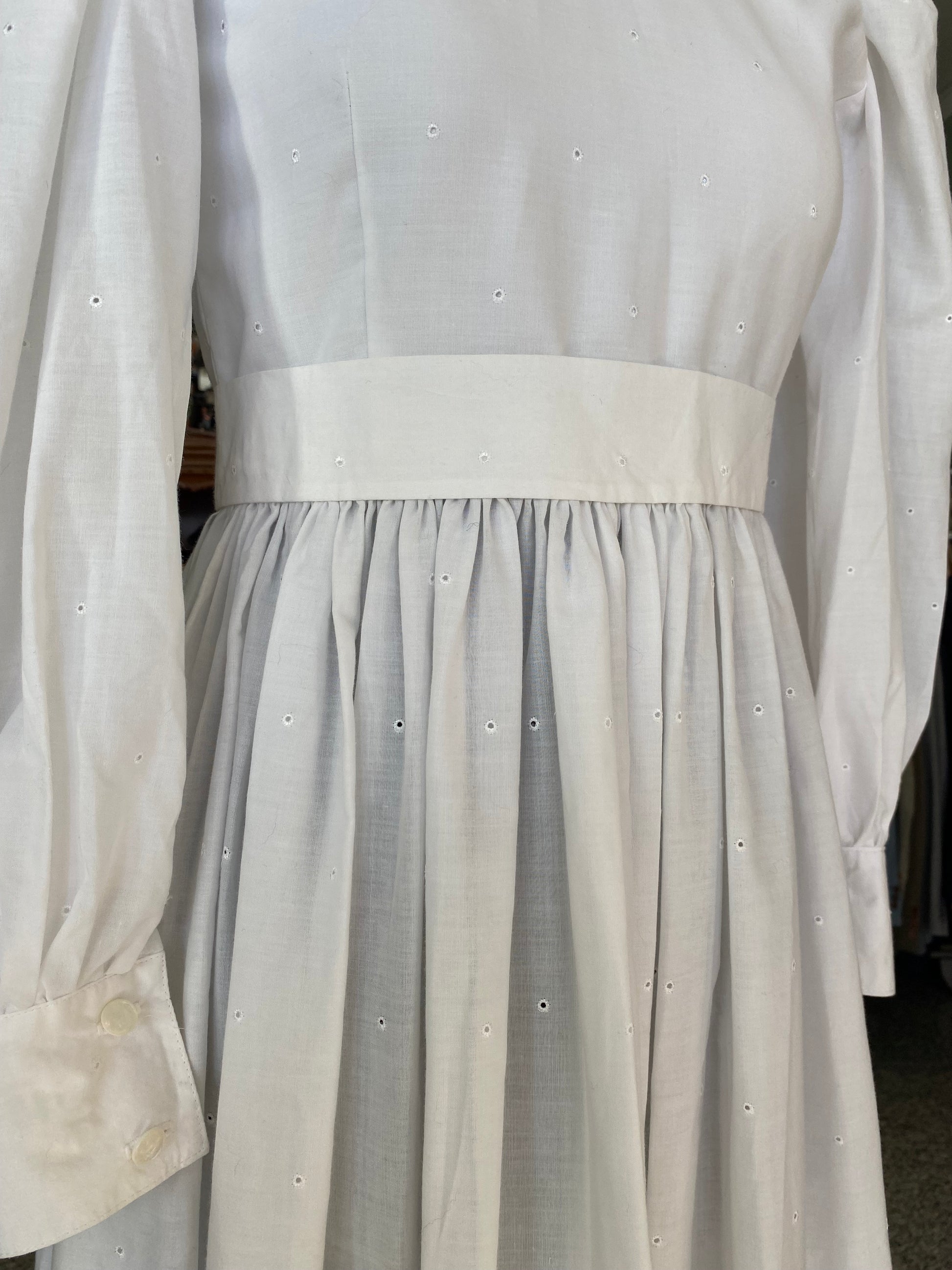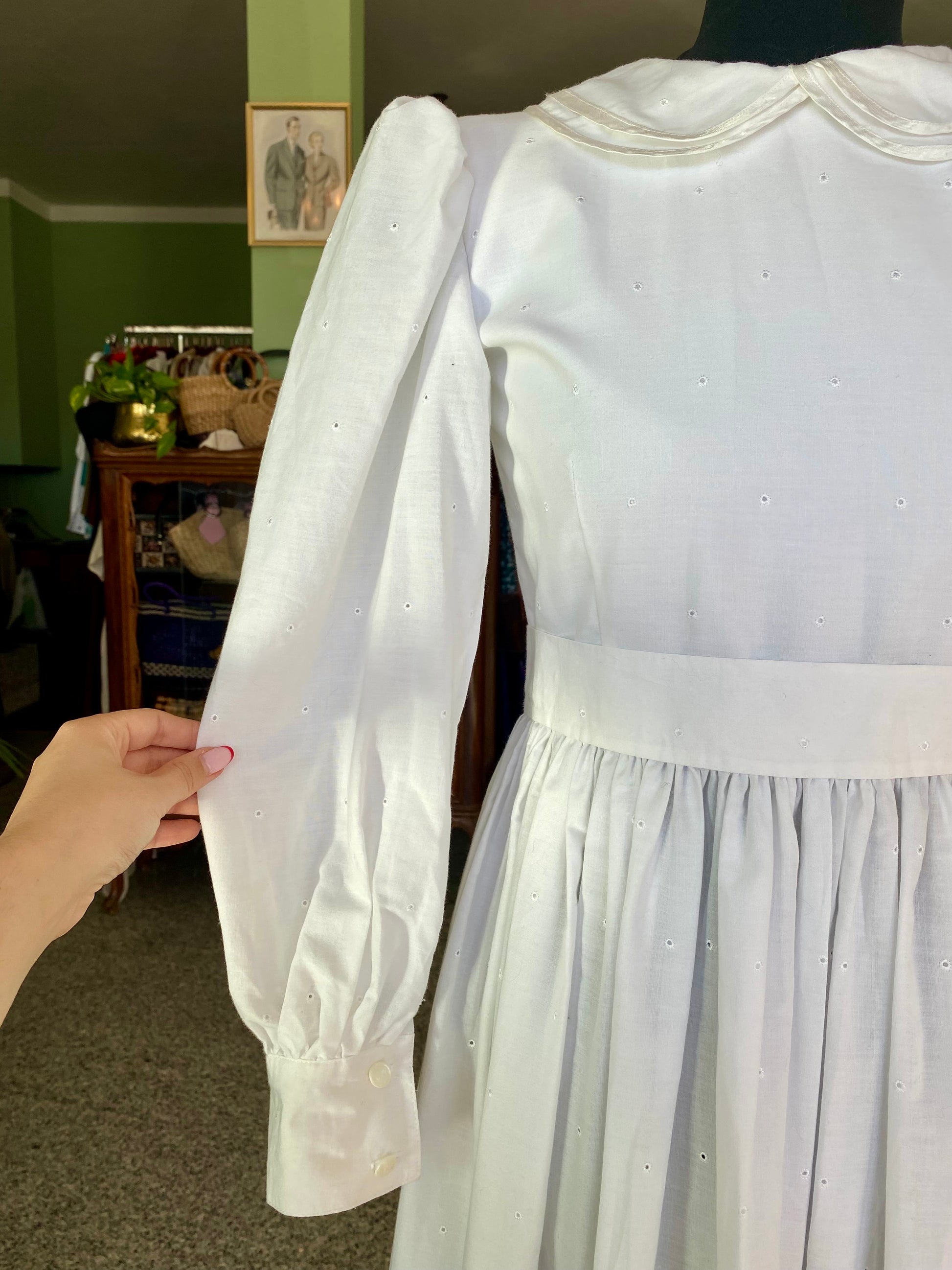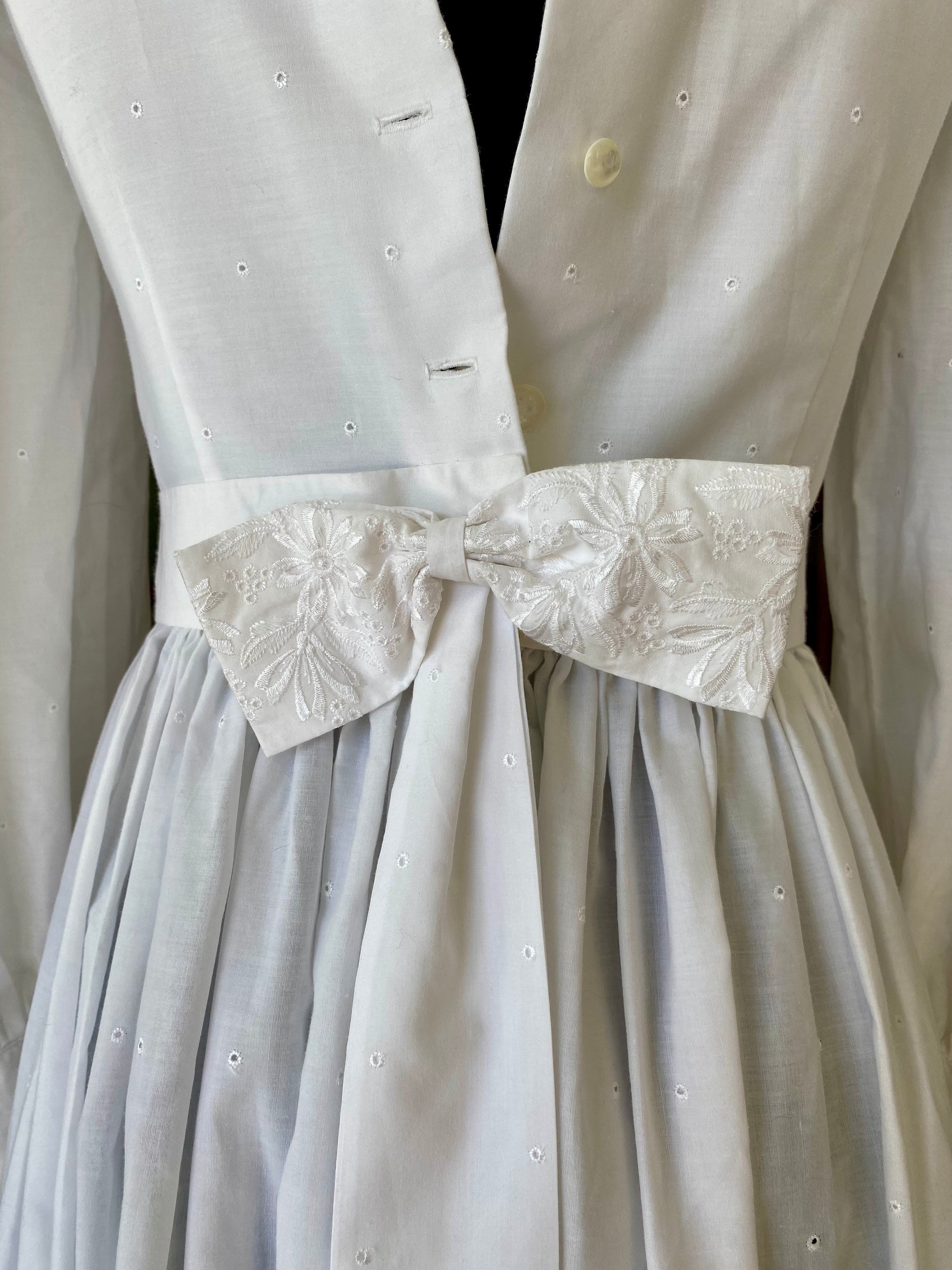 Un abito anni '70 che sembra uscito da una cartolina della campagna americana. Realizzato in puro cotone bianco, presenta un prezioso ricamo sangallo floreale sul fondo della gonna e sul fiocco posteriore. Il corpino è semplice, impreziosito da piccoli occhielli ricamati e da un colletto tondo decorativo. Le maniche lunghe con spalle strutturate e polsini abbottonati aggiungono un tocco teatrale ma delicato, perfettamente bilanciato dal taglio svasato e dalla lunghezza ala caviglia.