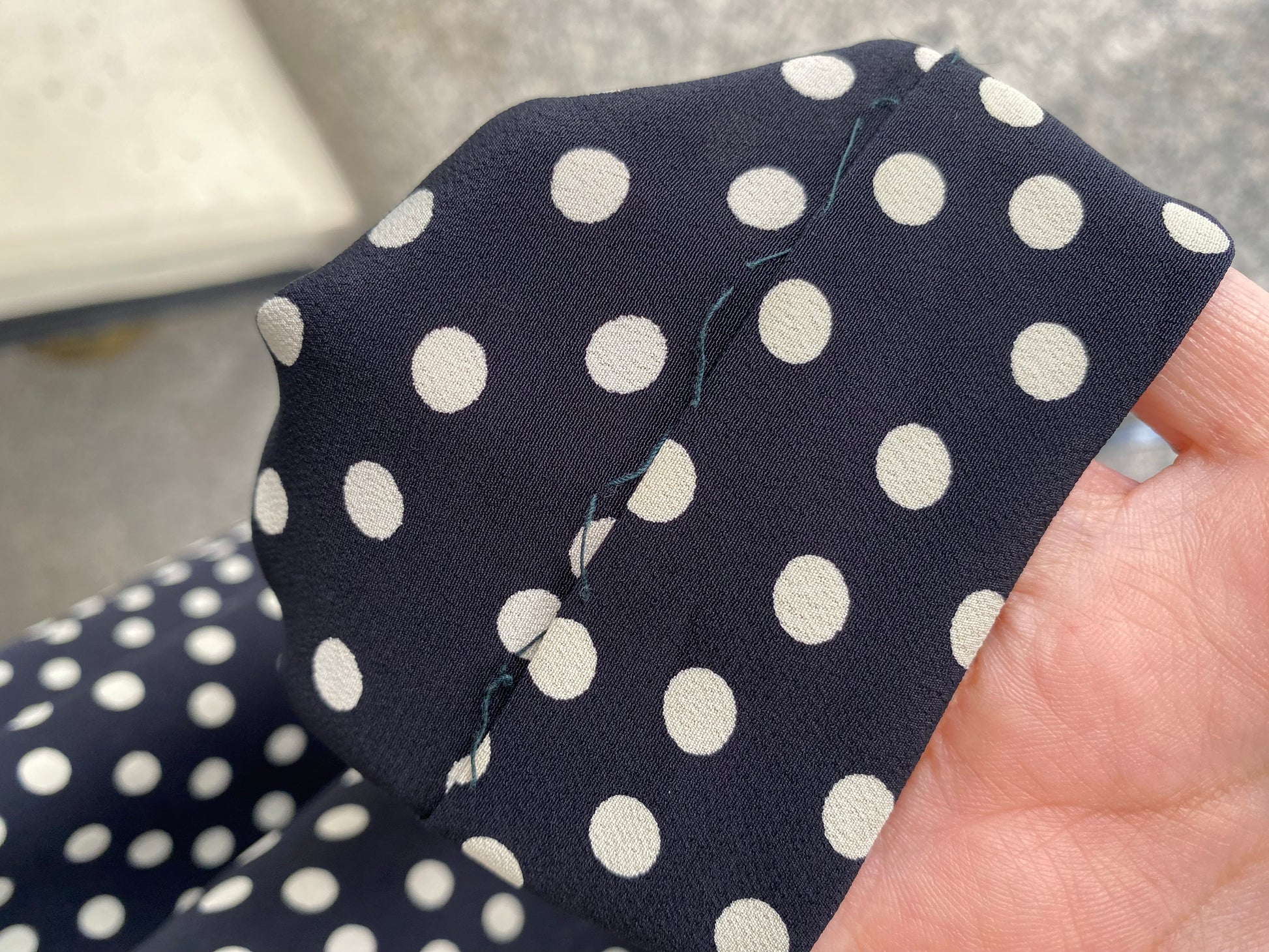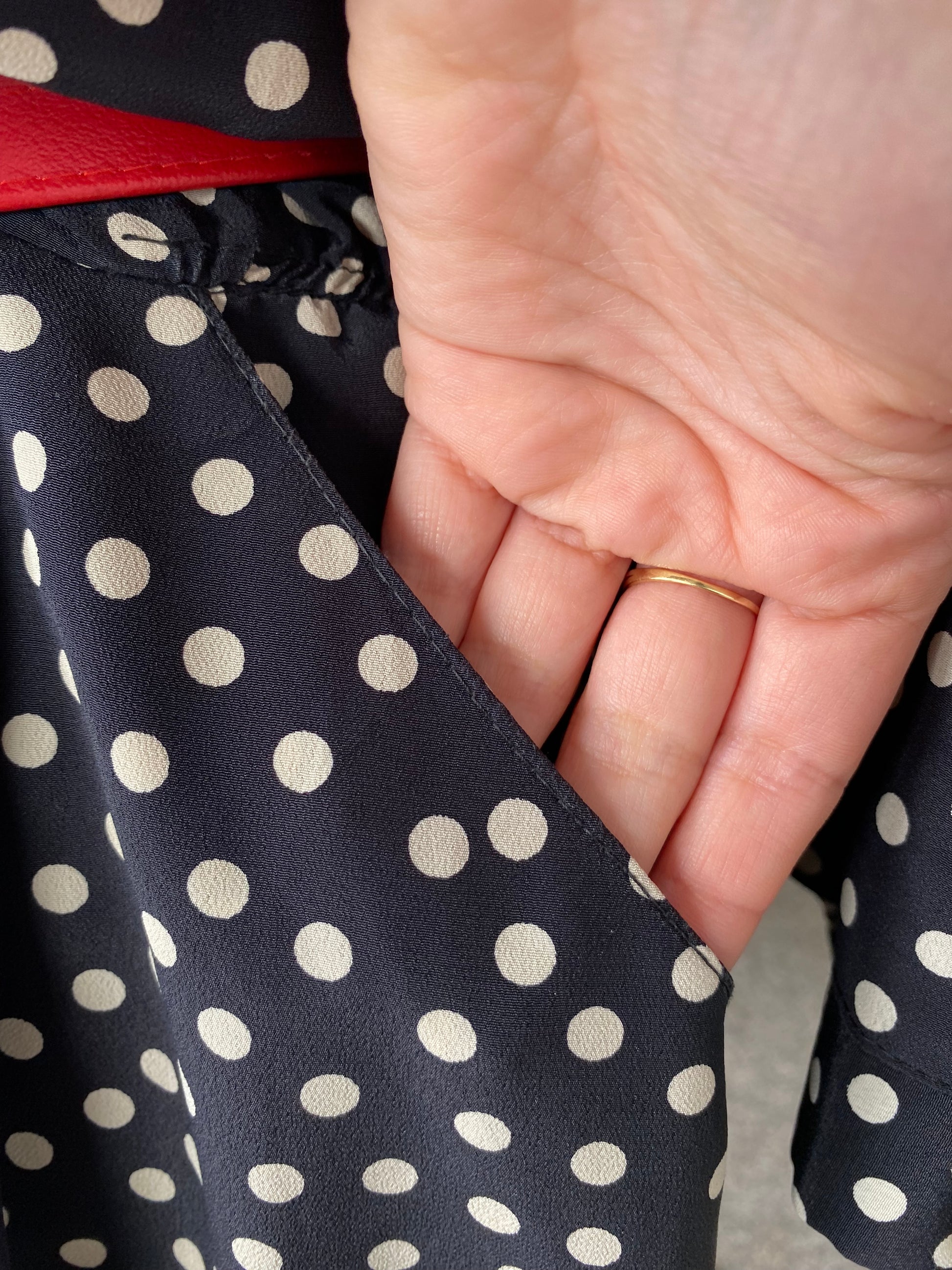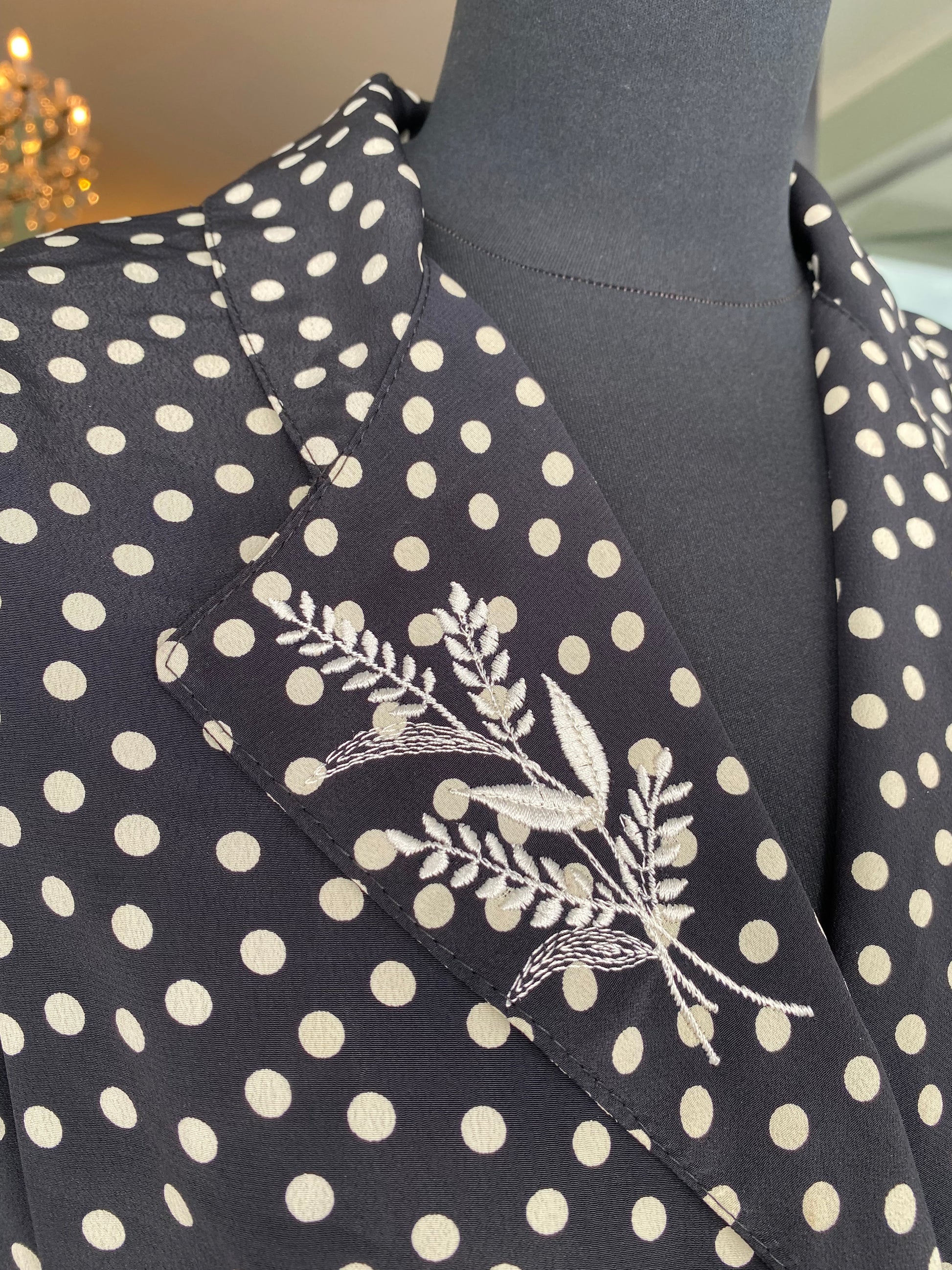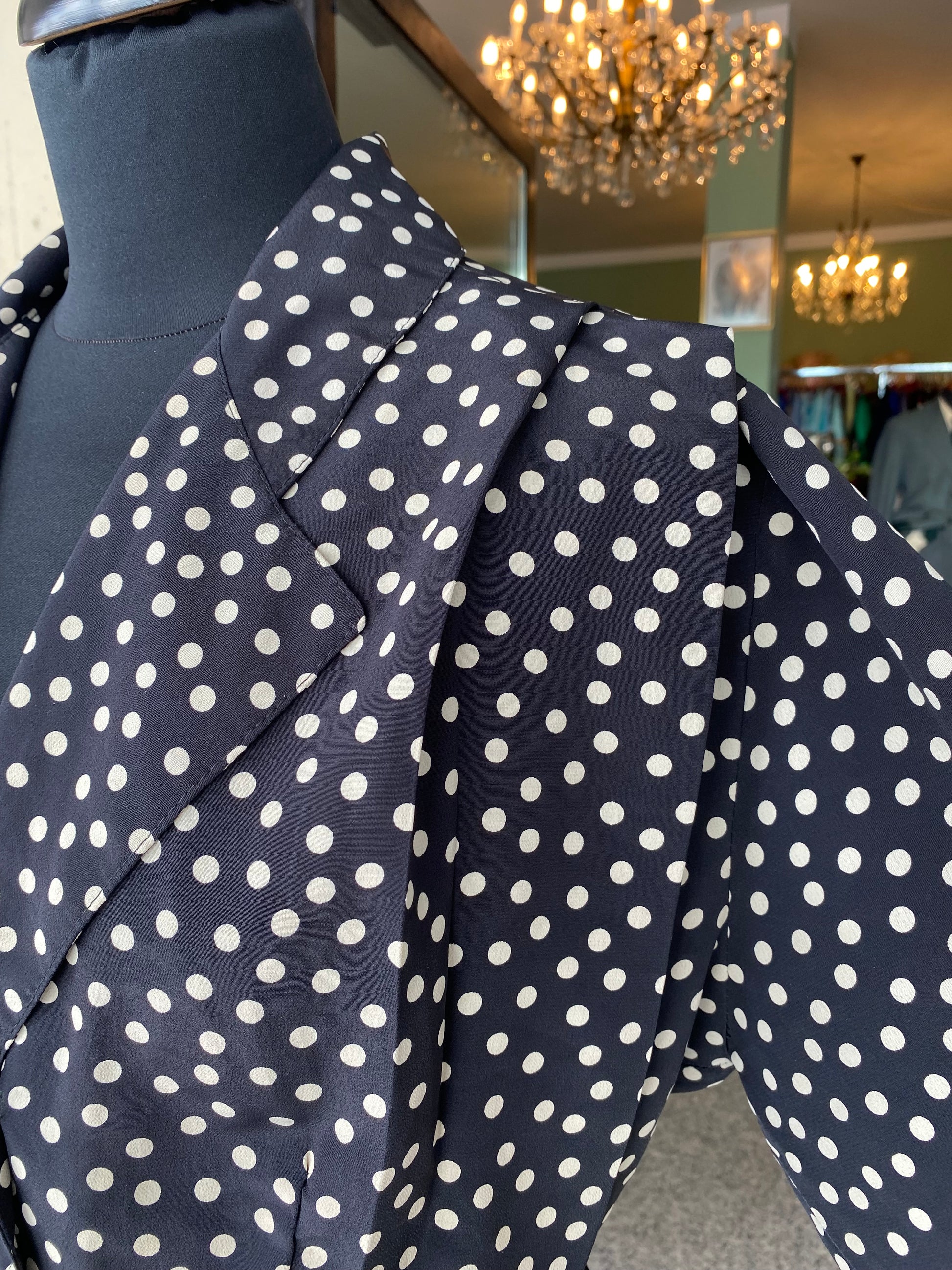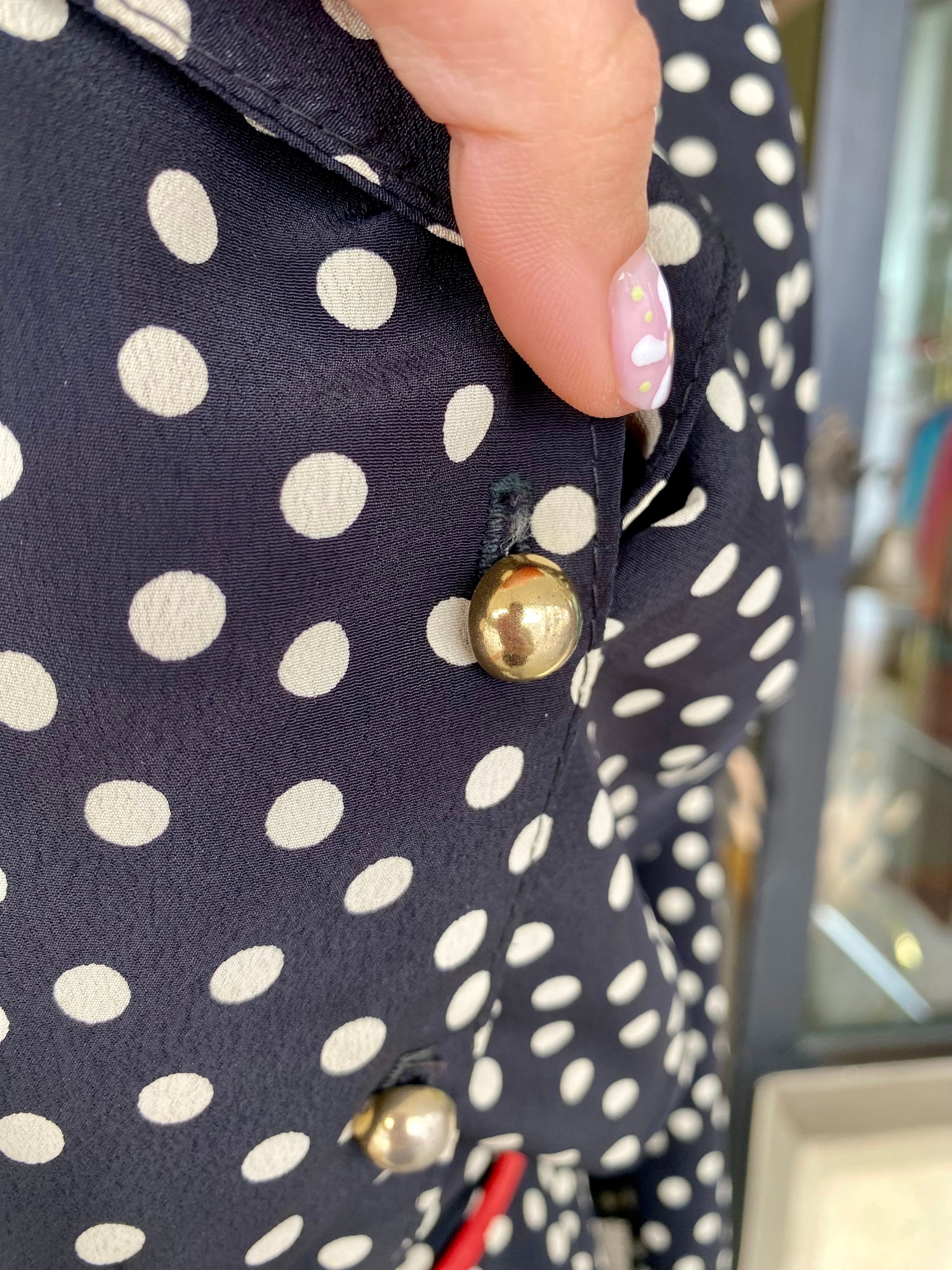 Abito sartoriale anni ’80 in pura seta, con taglio doppiopetto e spalle strutturate. La fantasia a pois panna su fondo nero si combina con dettagli sofisticati come i bottoni dorati bombati, ricamo floreale monocromo sul revers e cintura rossa in contrasto. Un pezzo elegante con forte carattere grafico.