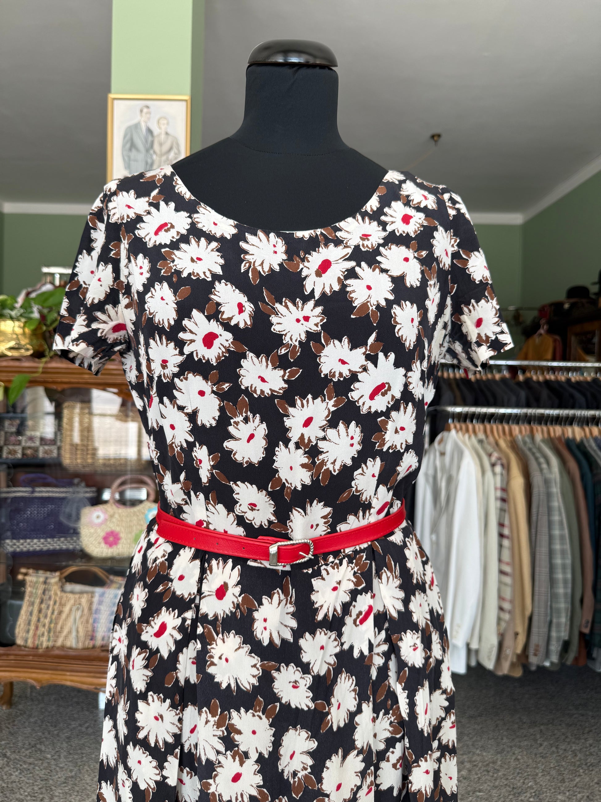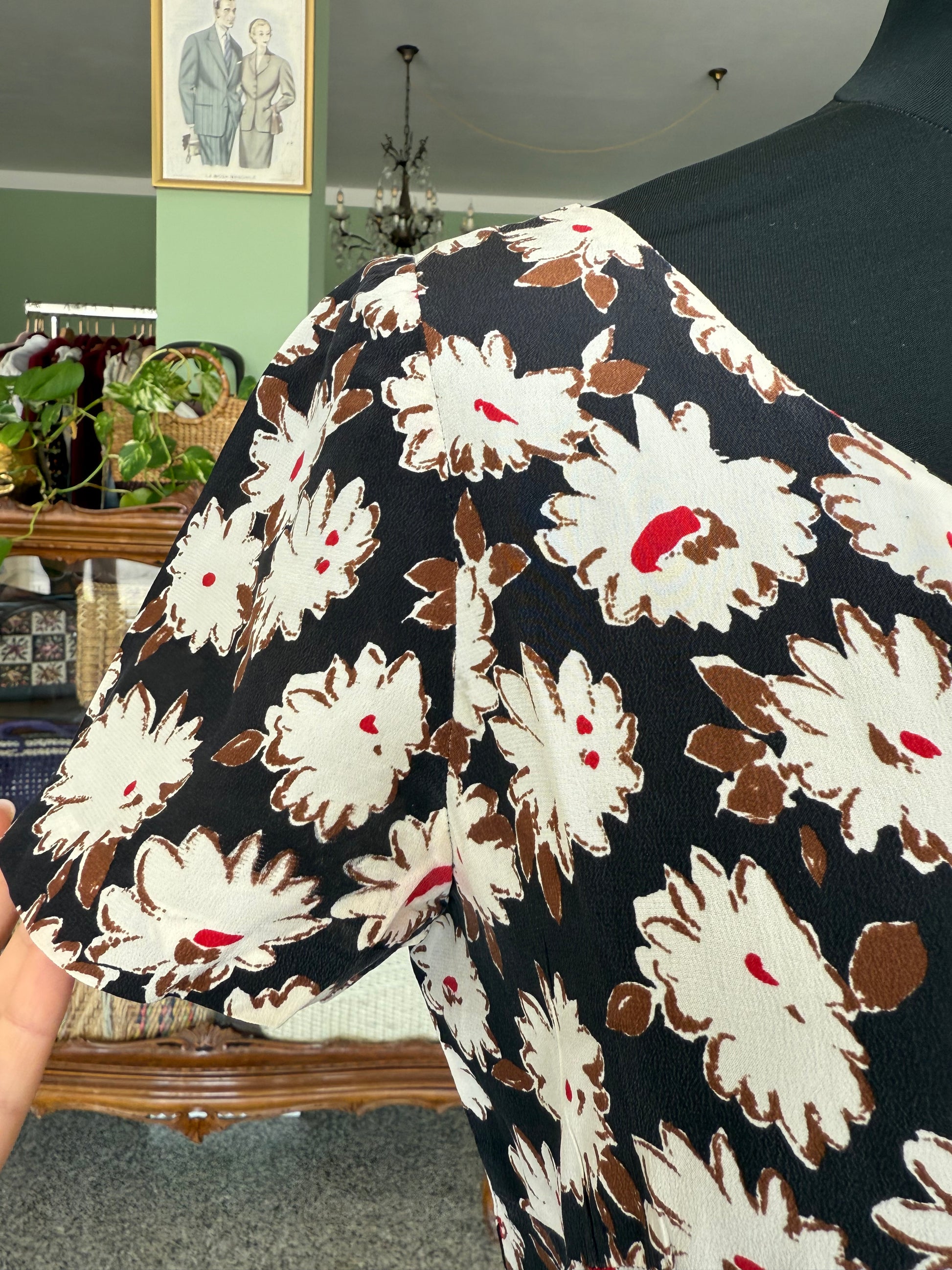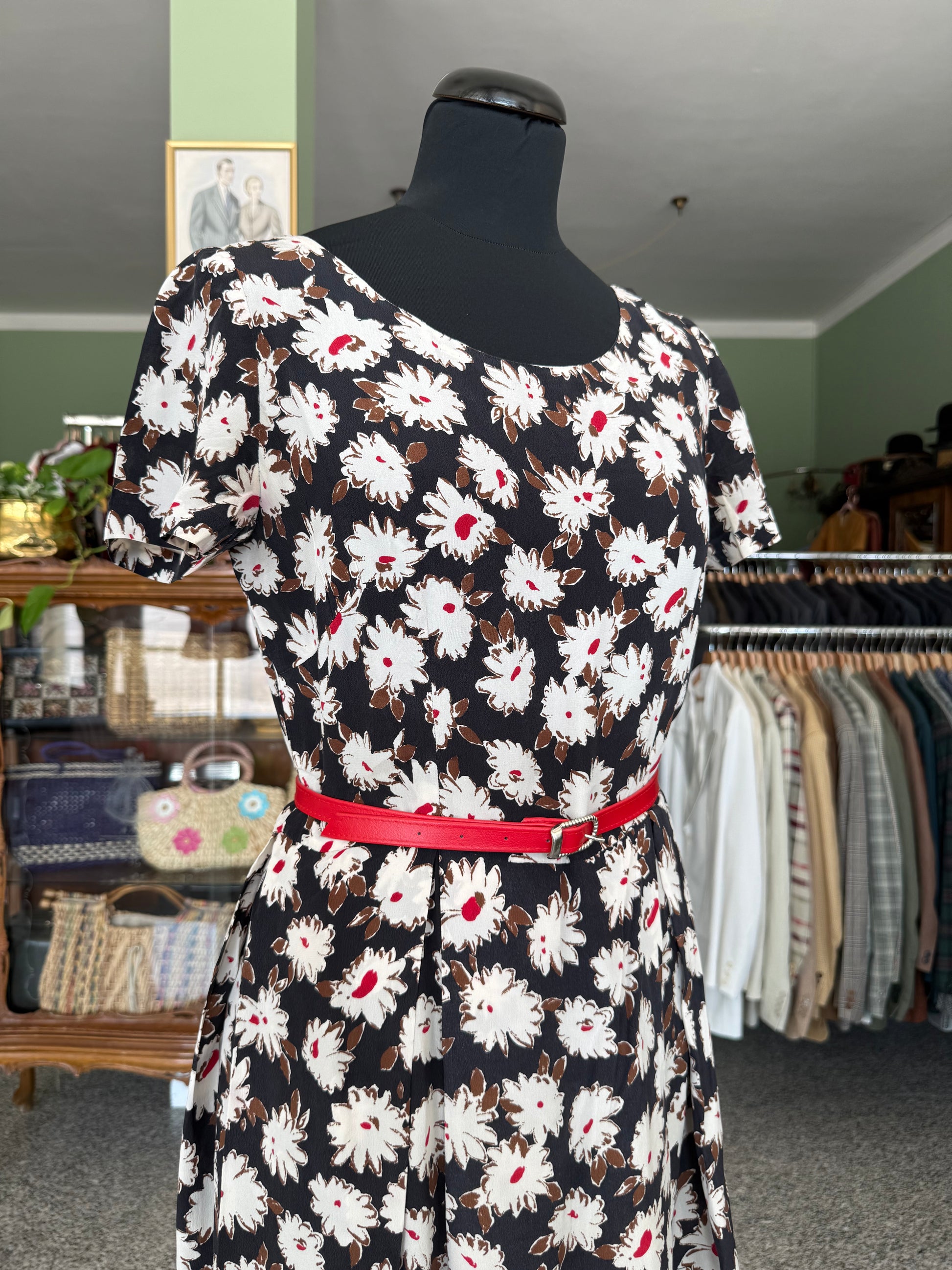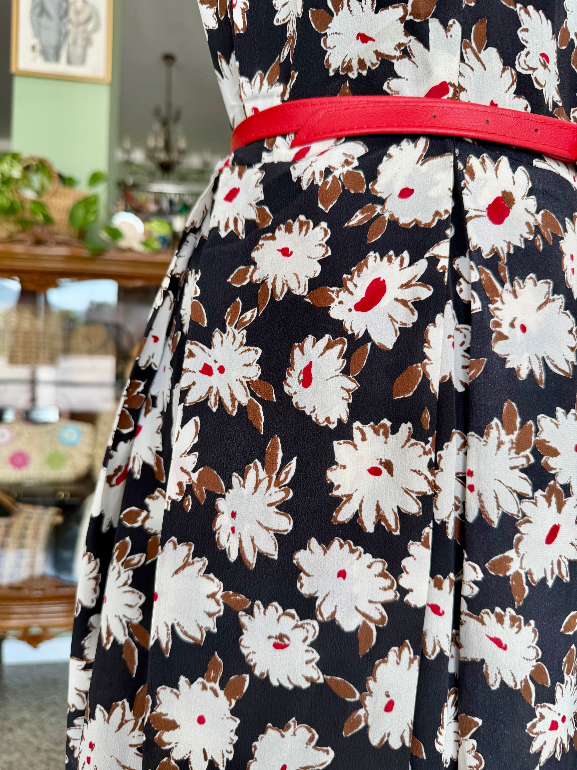 Abito anni ‘80 sartoriale dal modello classico e senza tempo, in pura seta. Chiusura con zip laterale, gonna con pieghe e scollo tondo.