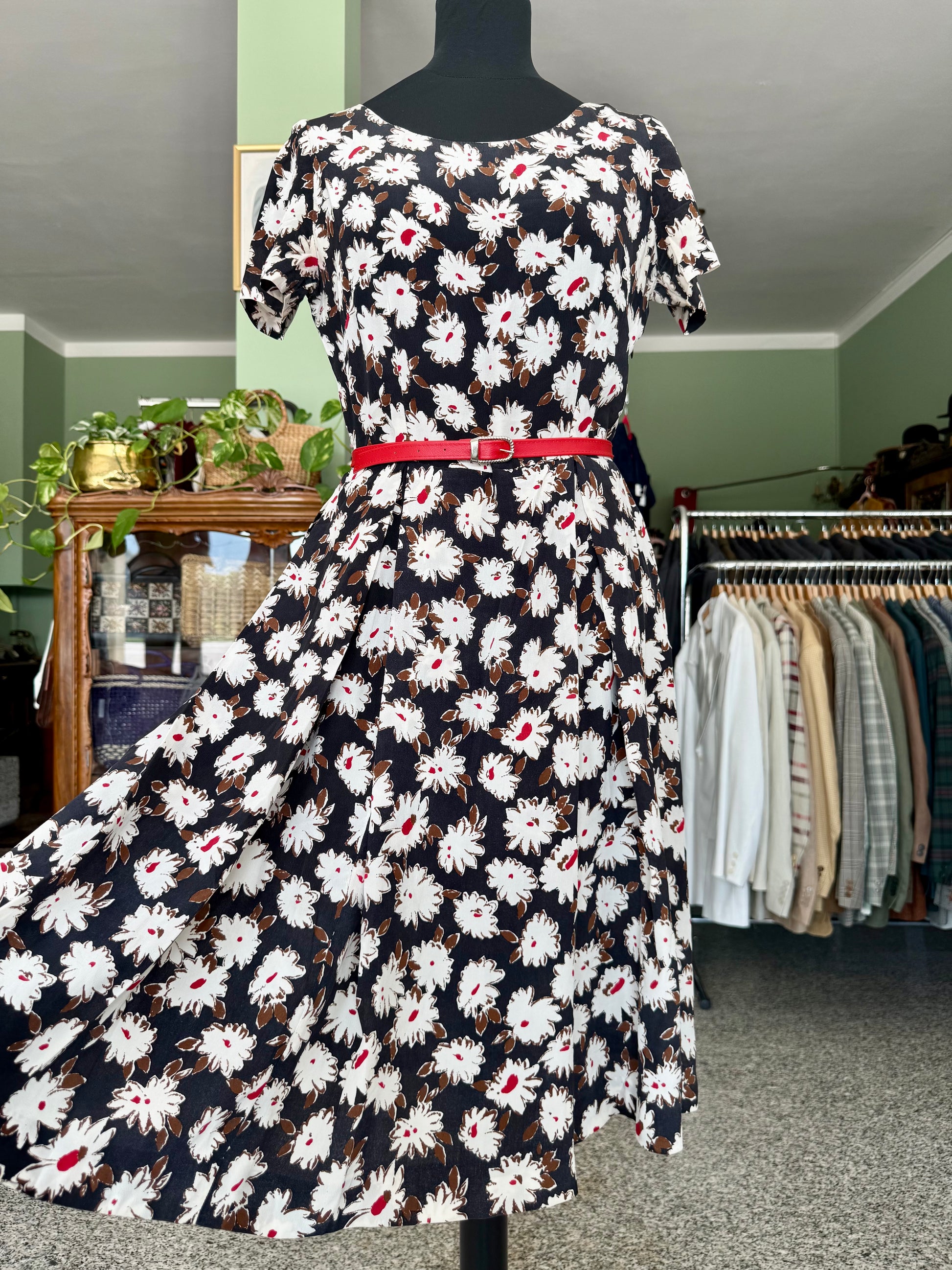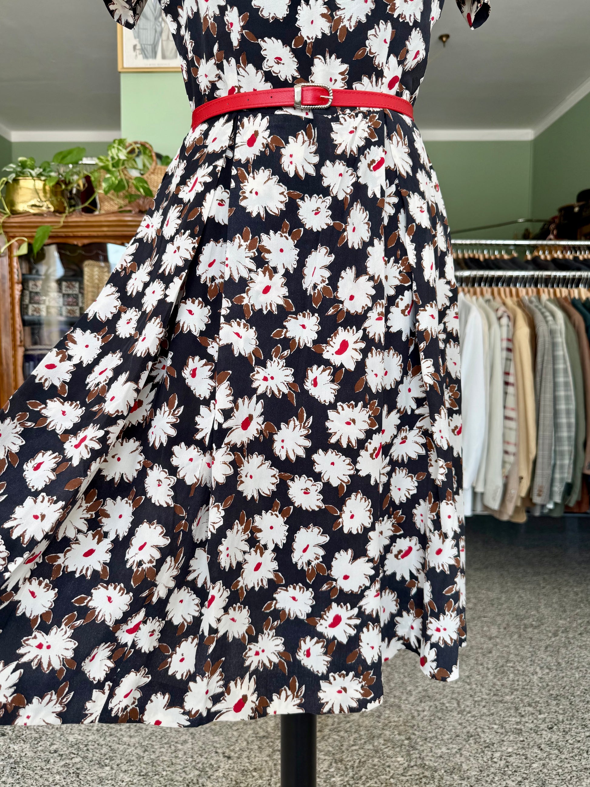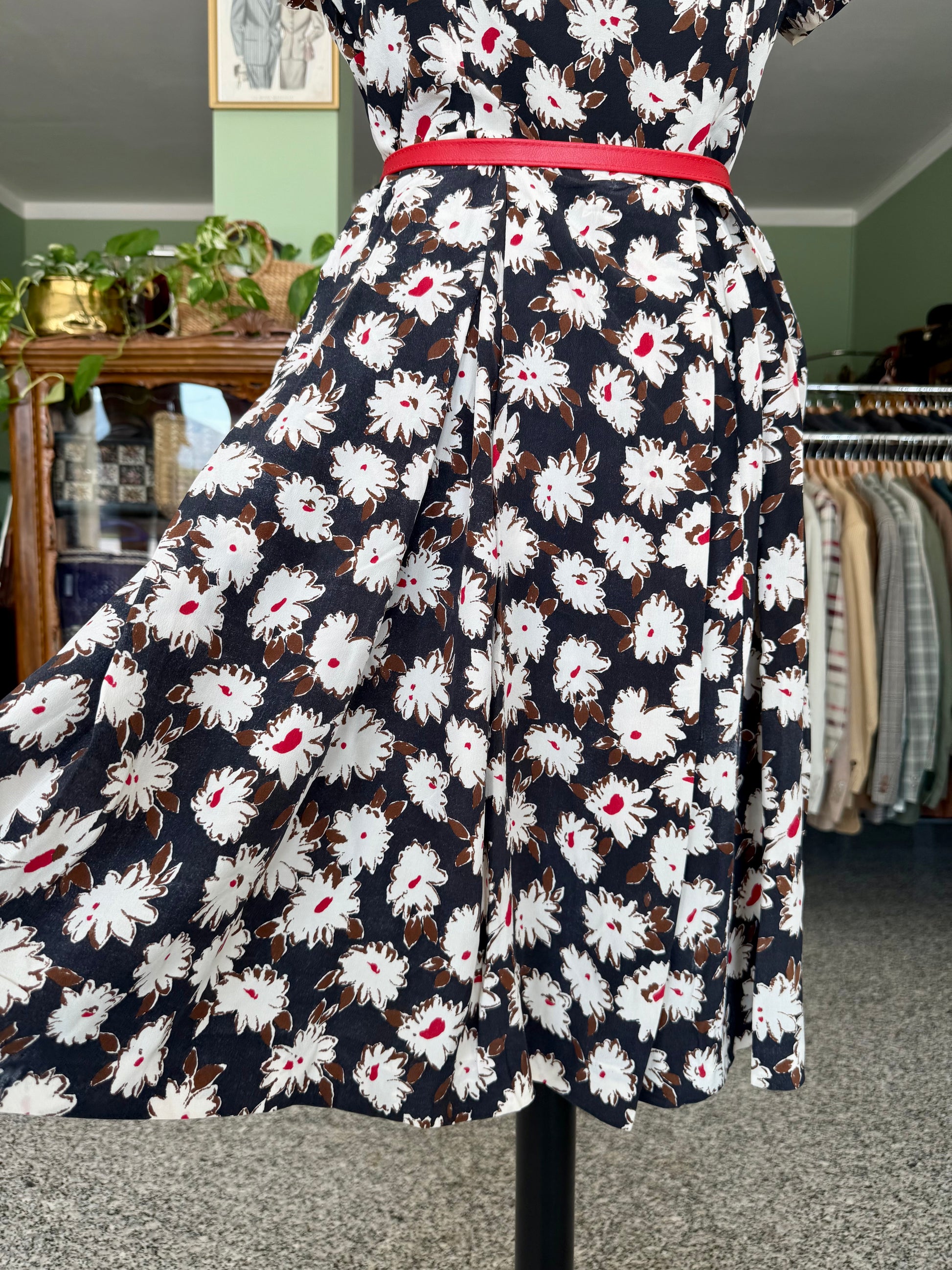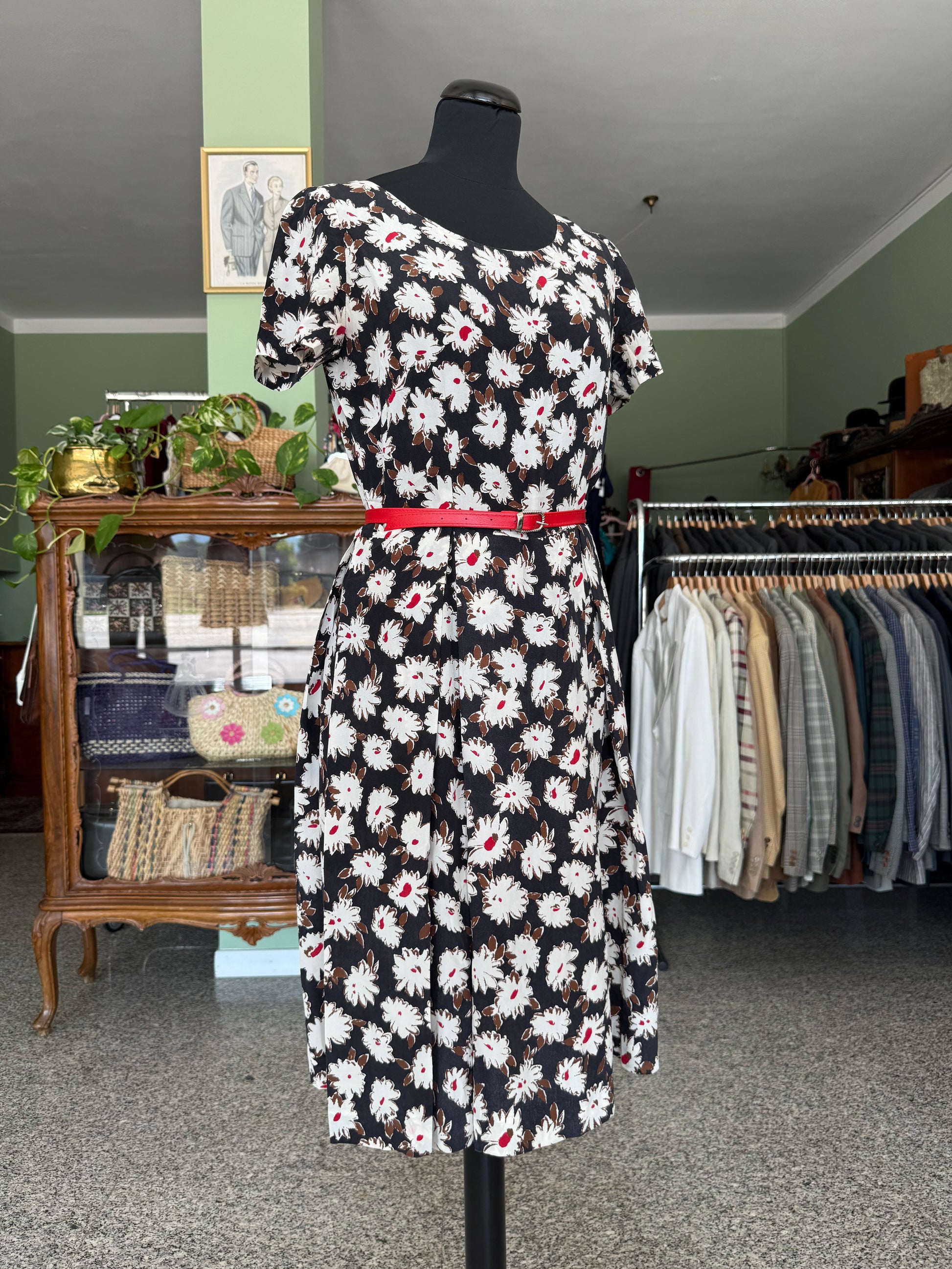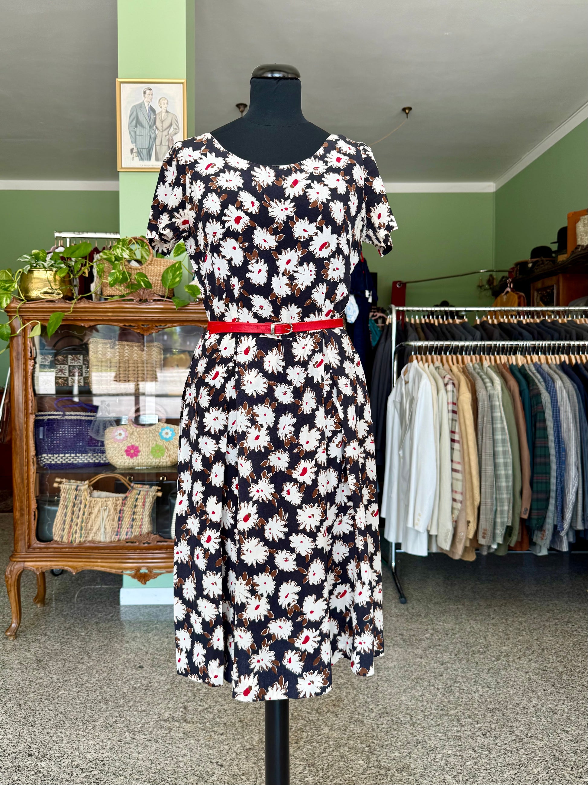 Abito anni ‘80 sartoriale dal modello classico e senza tempo, in pura seta. Chiusura con zip laterale, gonna con pieghe e scollo tondo.