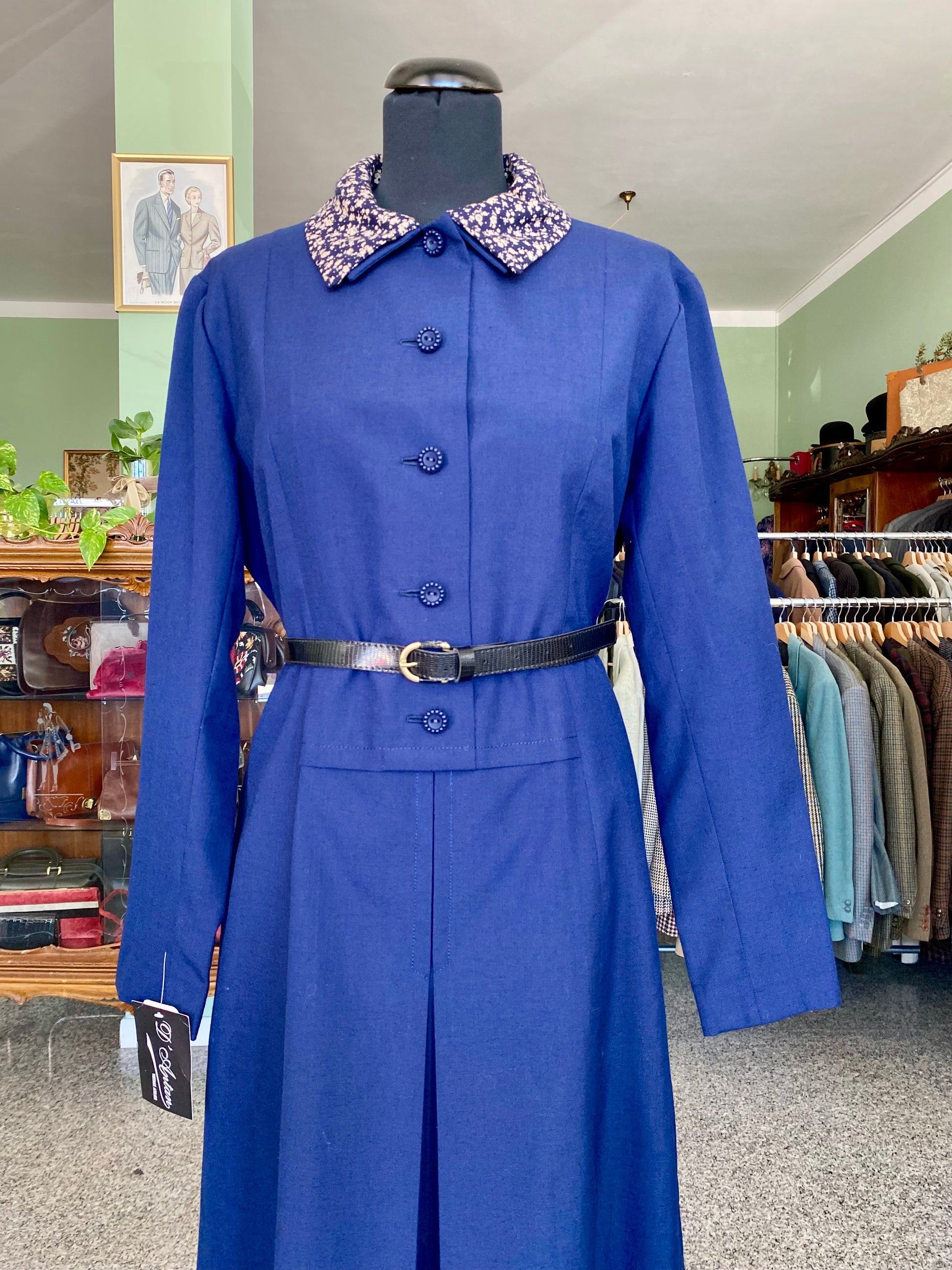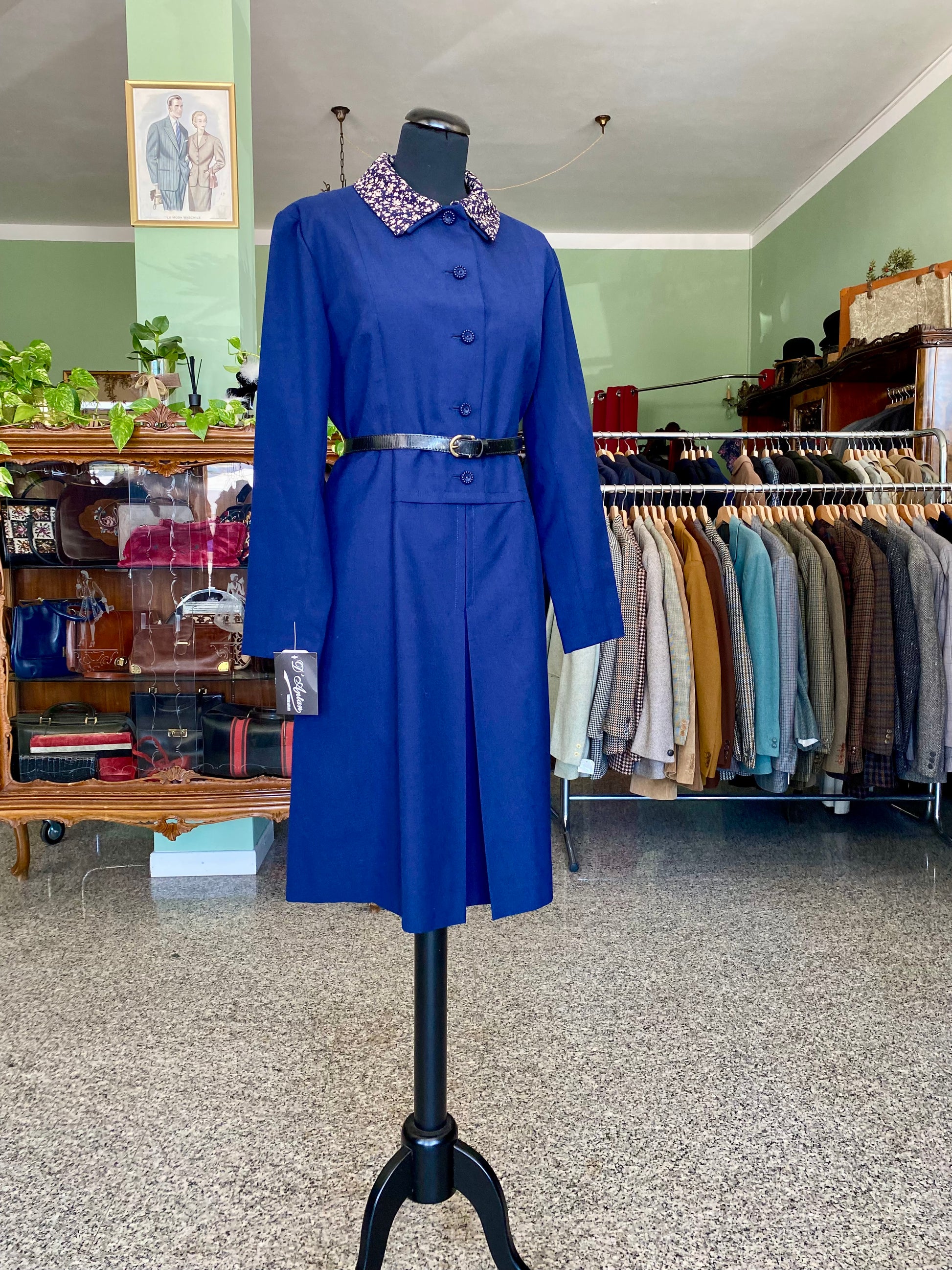 Il colletto è in un elegante tessuto fantasia floreale, che dona un contrasto di colore raffinato rispetto al blu del corpo principale dell’abito, mentre il cinturino in vita sottolinea la figura, creando una silhouette molto femminile. (cinturino non incluso, è un suggerimento di abbinamento)