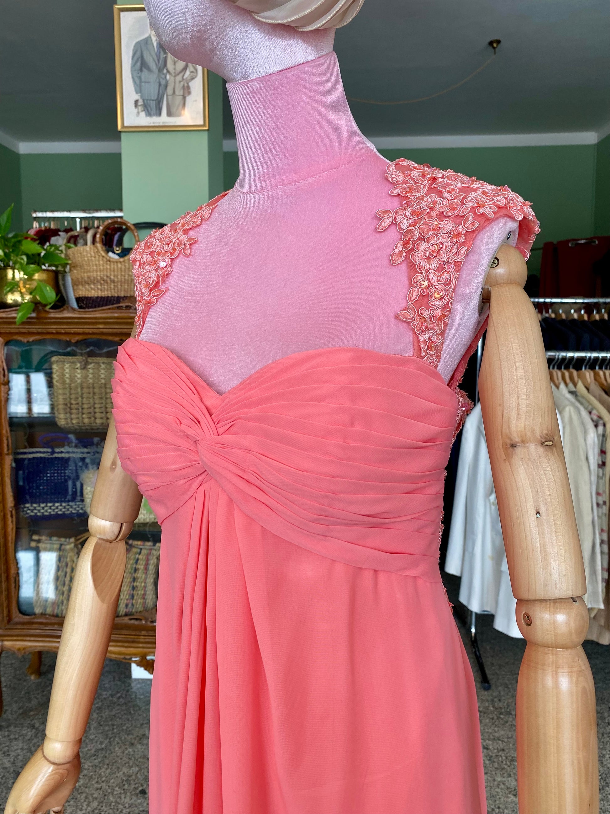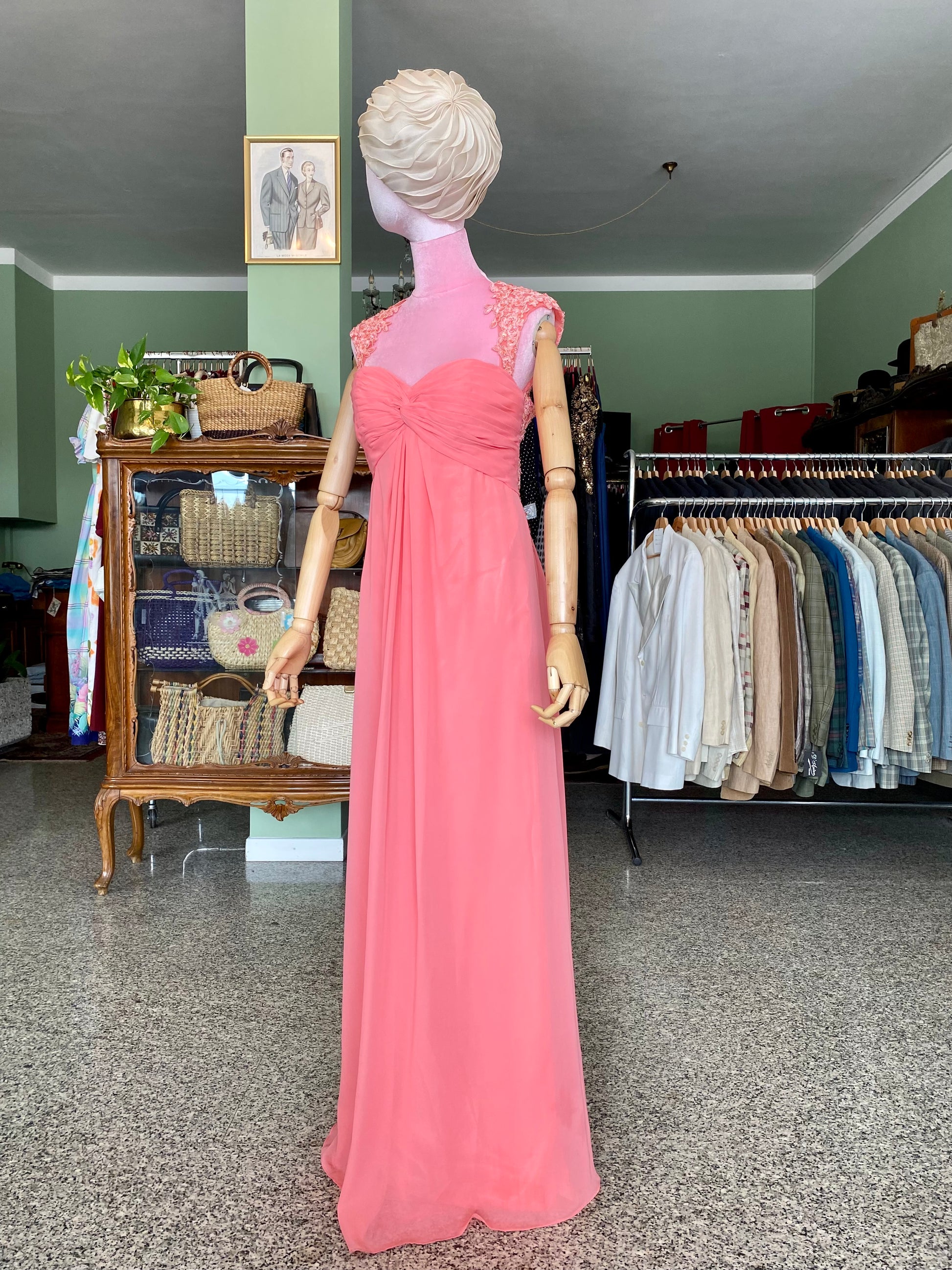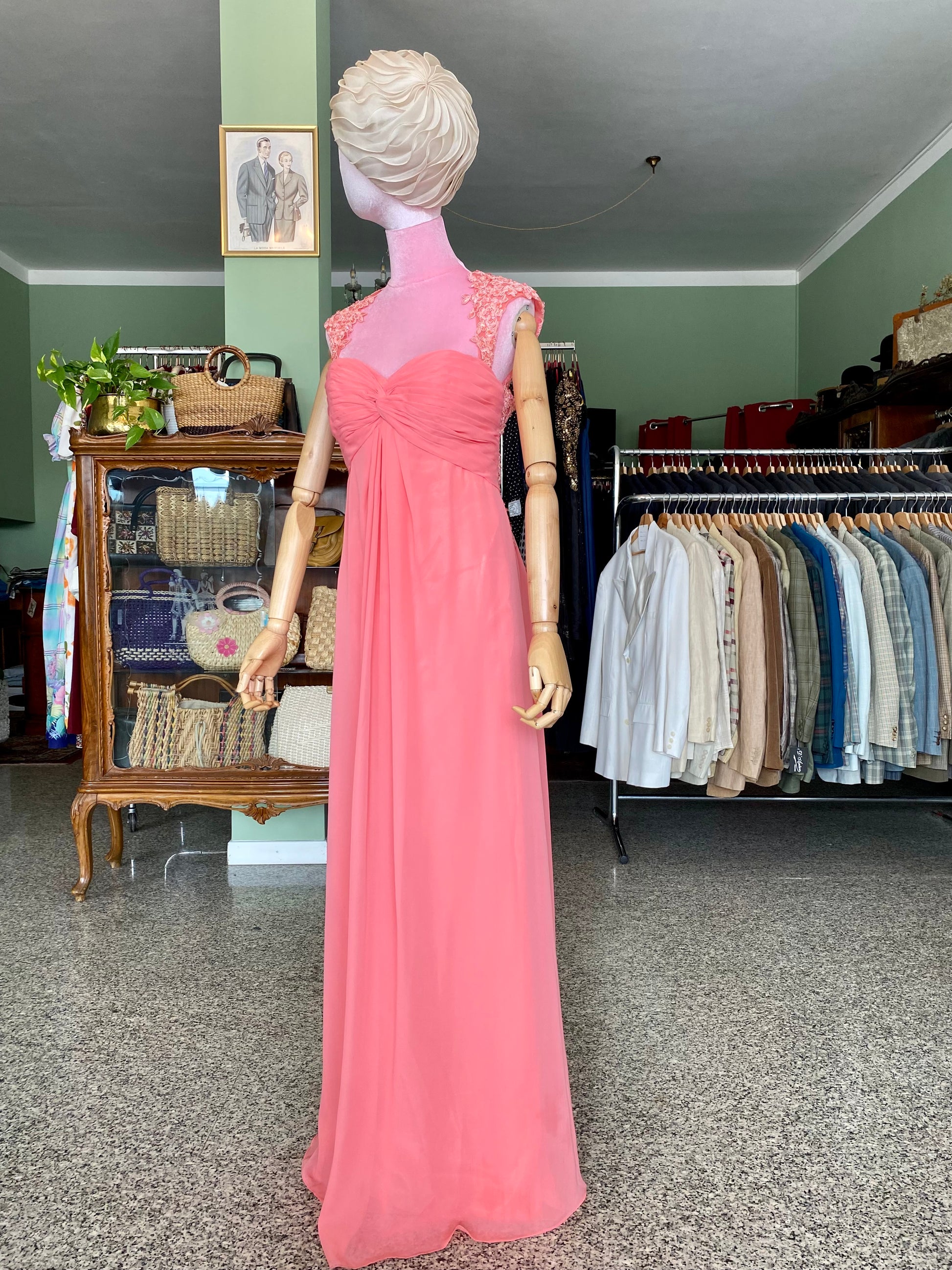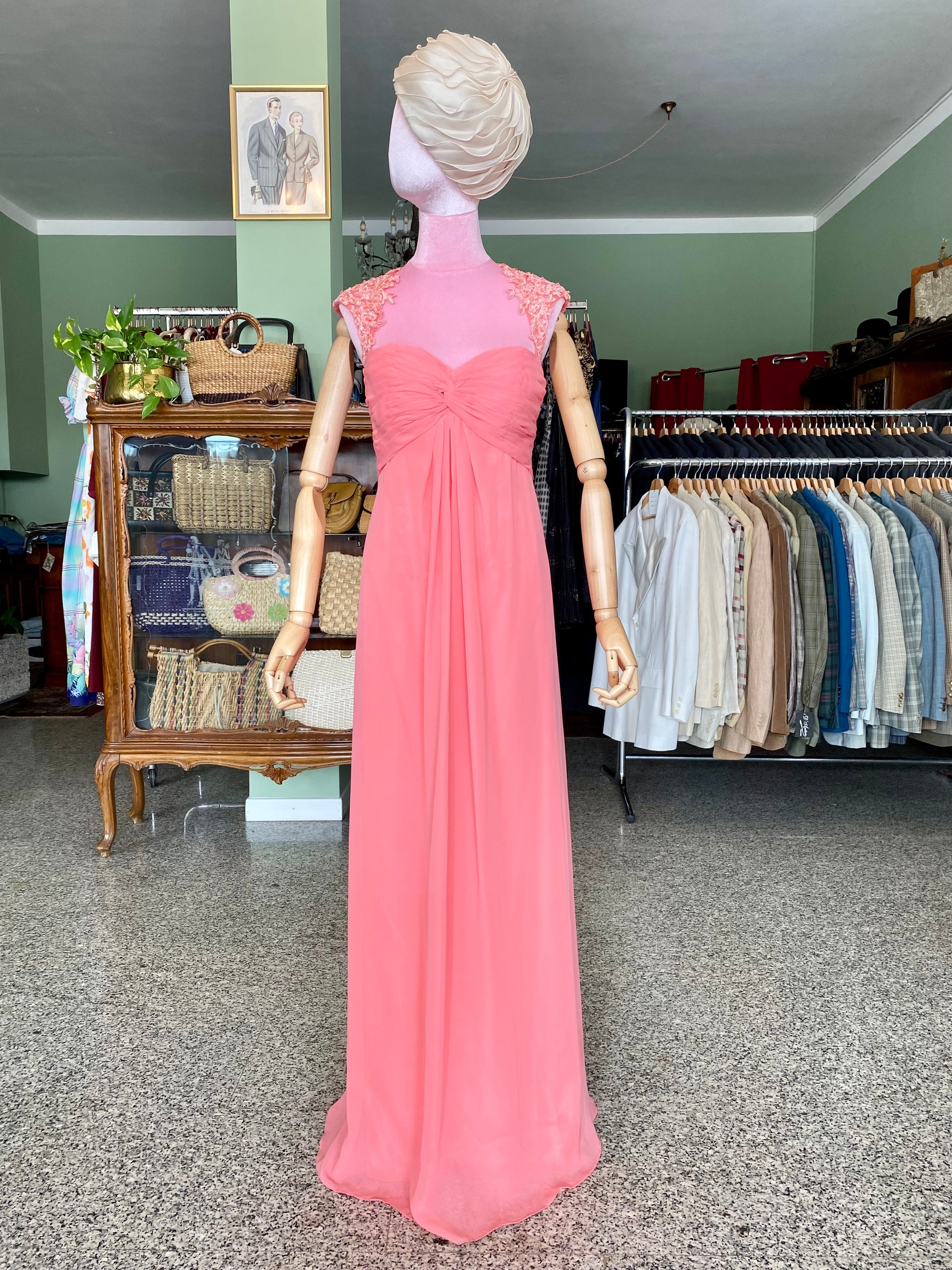 Un raffinato abito da cerimonia in una delicata gradazione di rosa corallo (un rosa vivace ma elegante), perfetto per eventi speciali e serate importanti.
