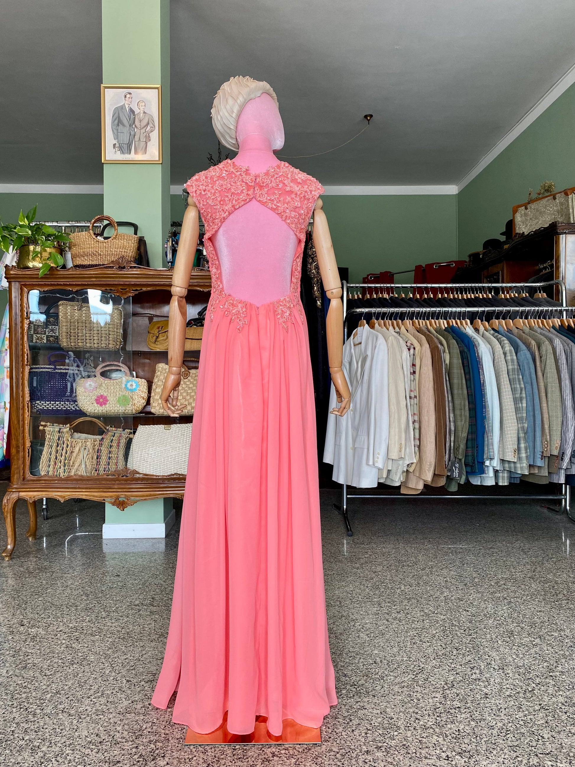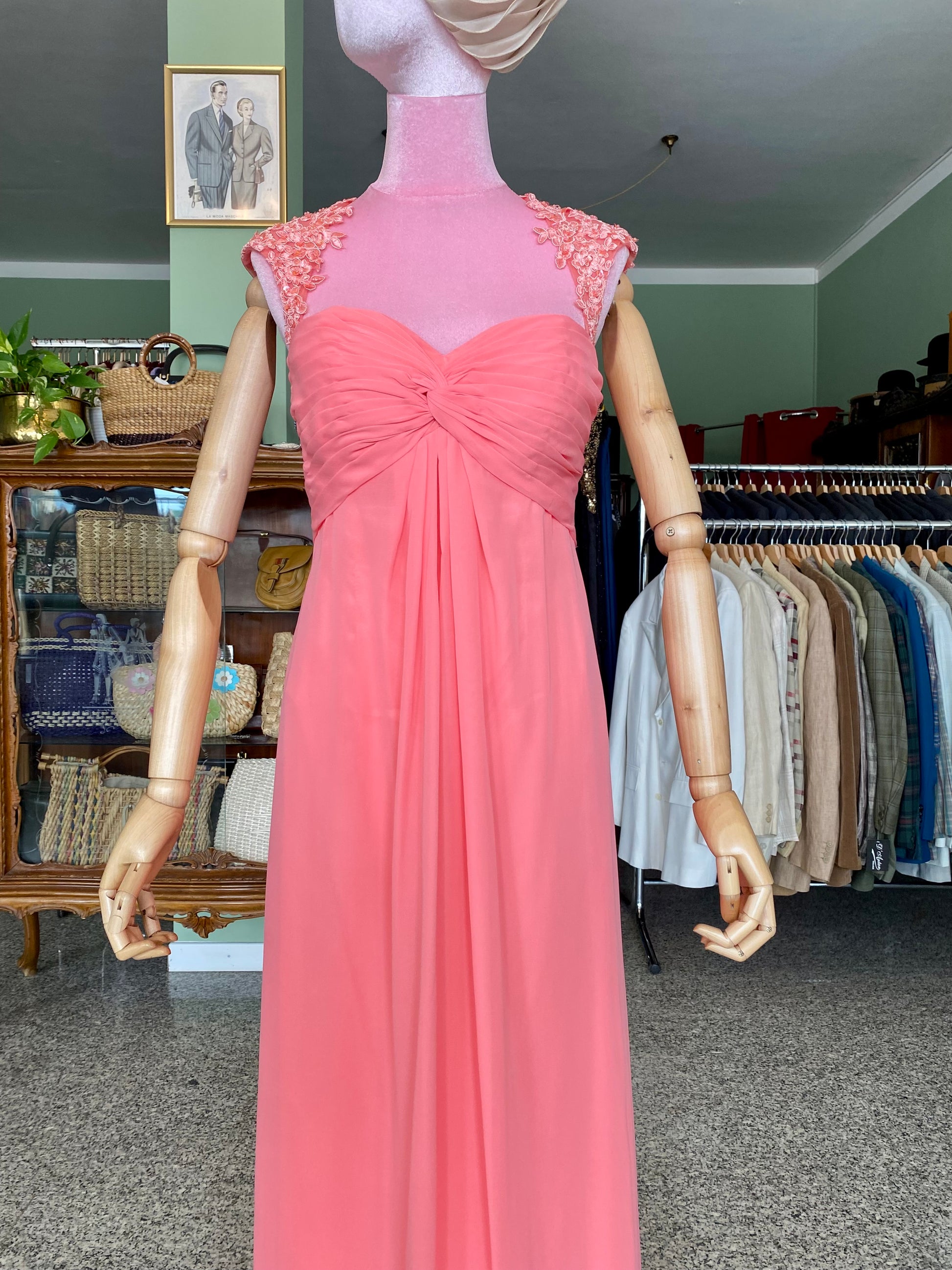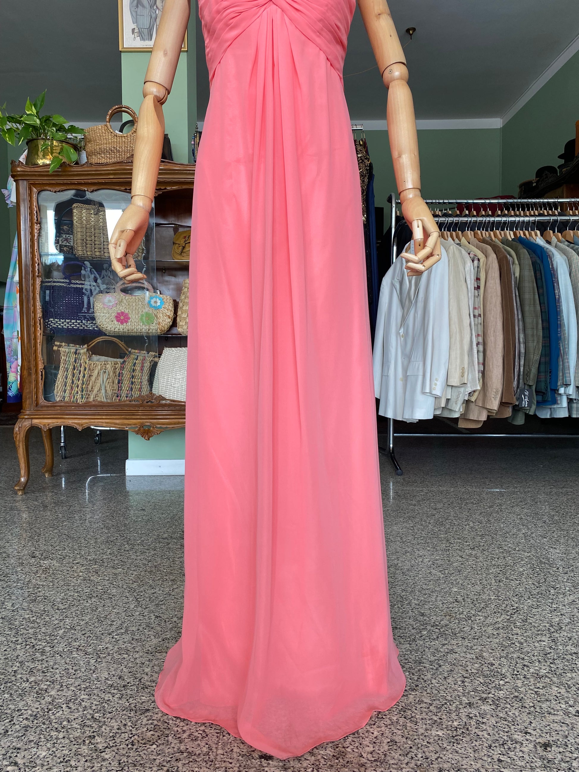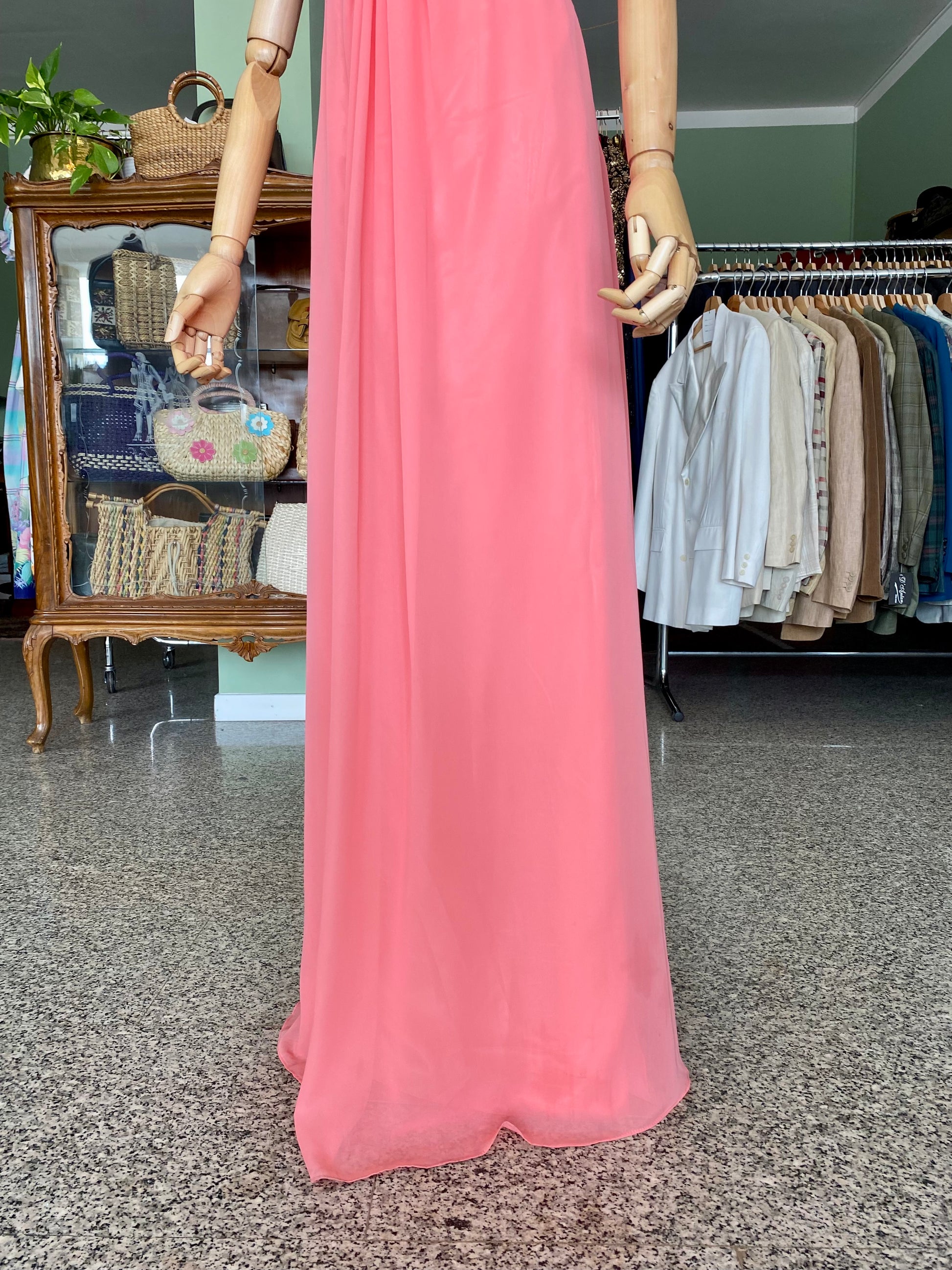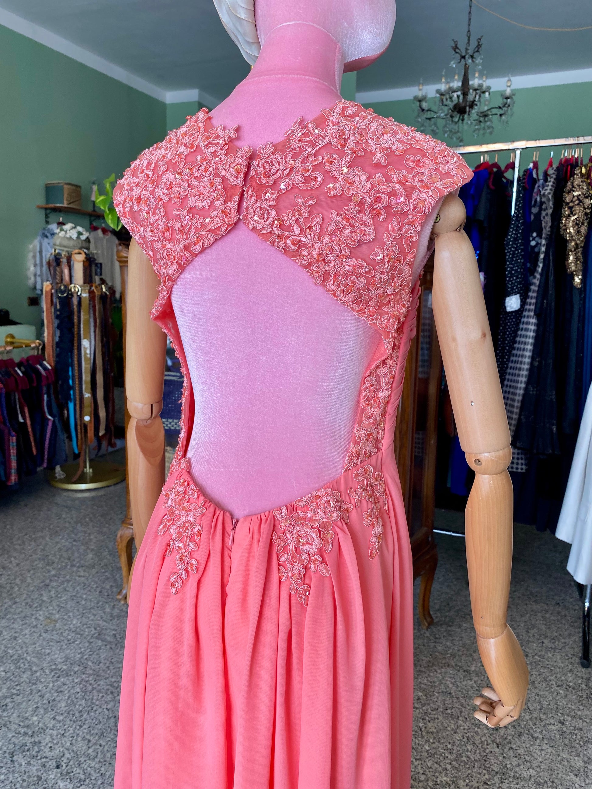 Un raffinato abito da cerimonia in una delicata gradazione di rosa corallo (un rosa vivace ma elegante), perfetto per eventi speciali e serate importanti.