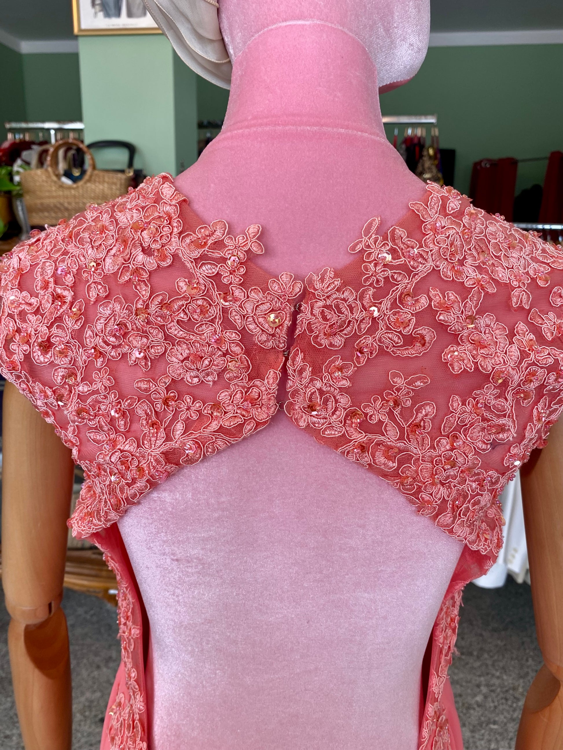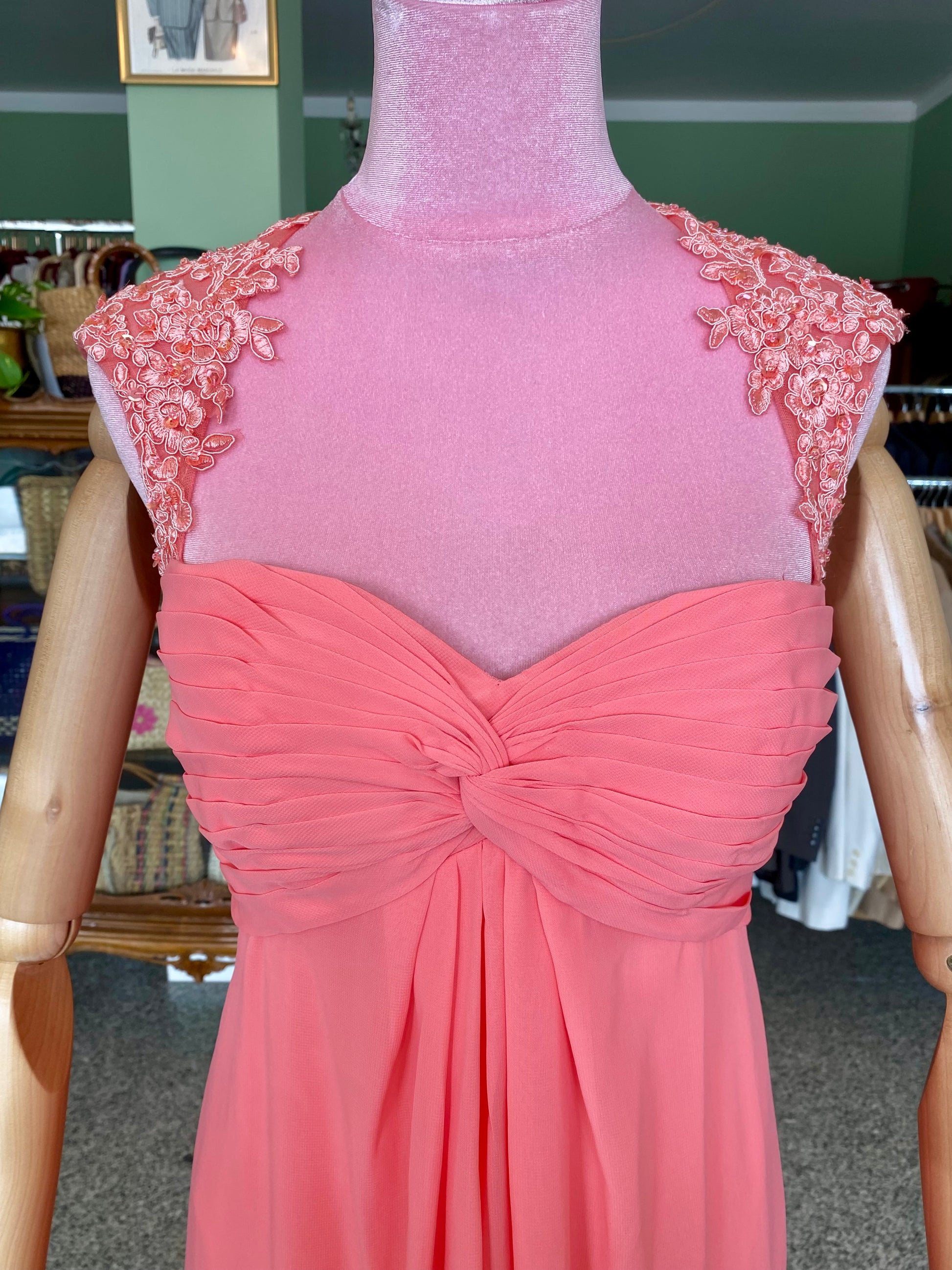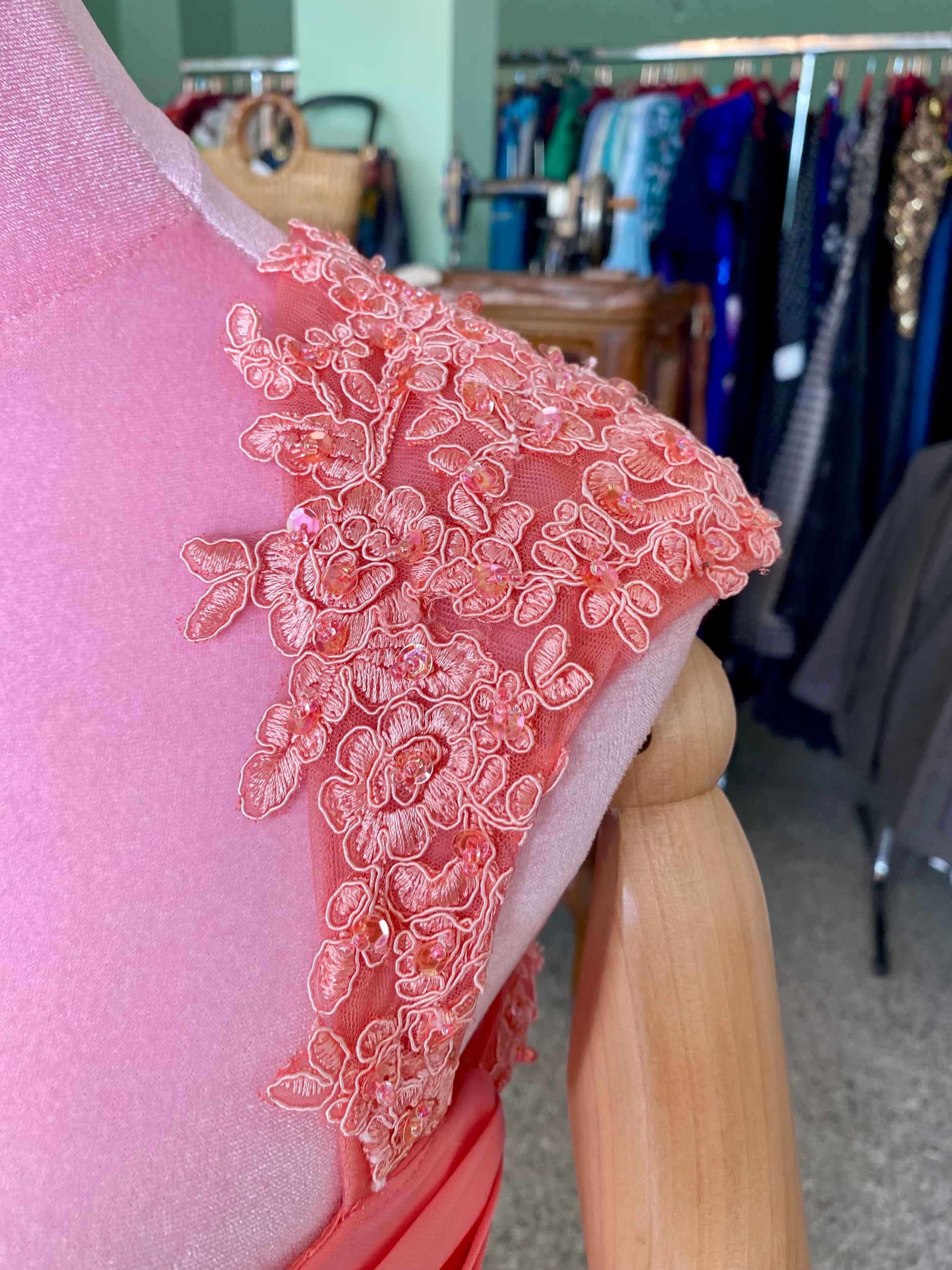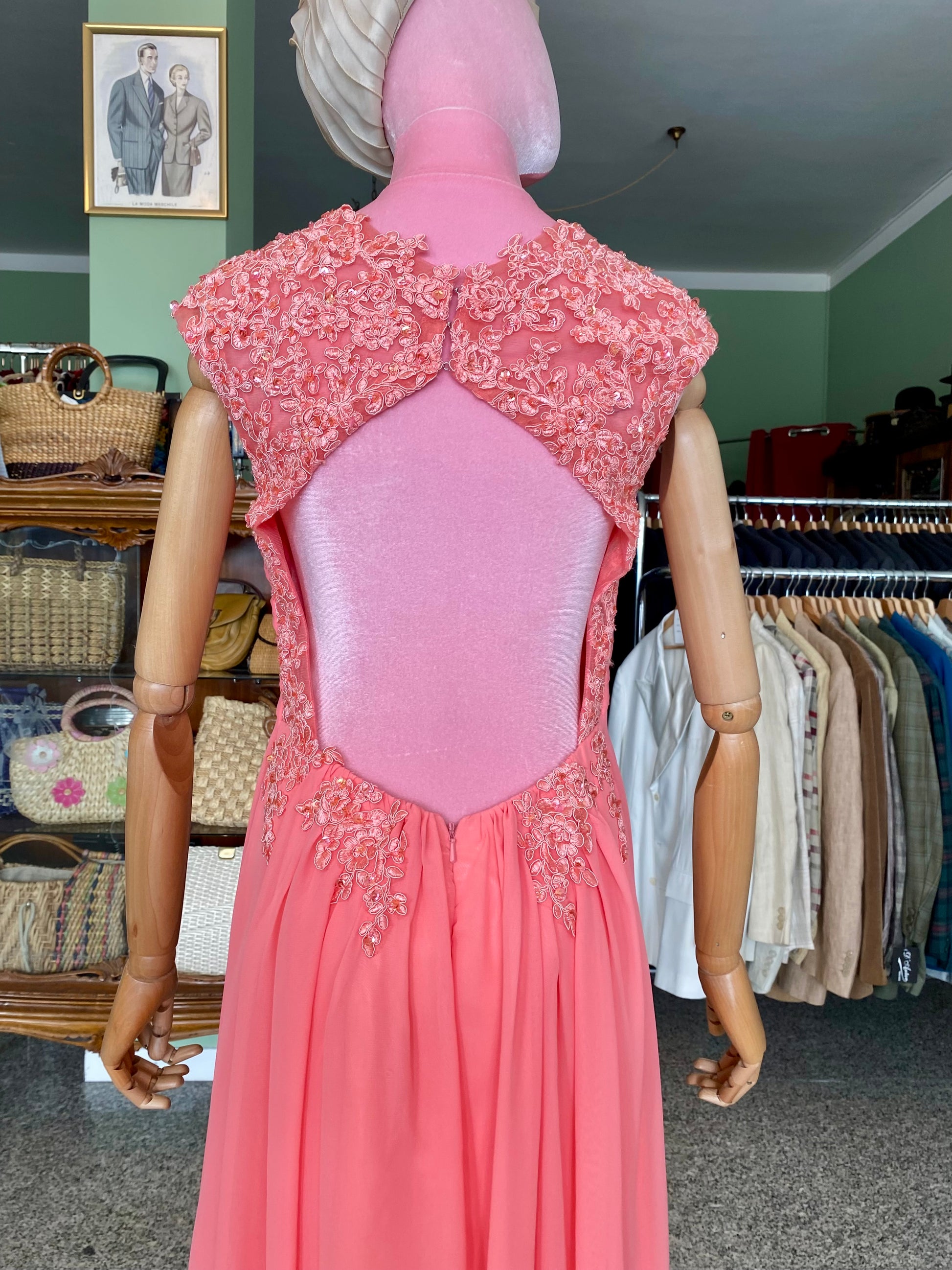 Un raffinato abito da cerimonia in una delicata gradazione di rosa corallo (un rosa vivace ma elegante), perfetto per eventi speciali e serate importanti.