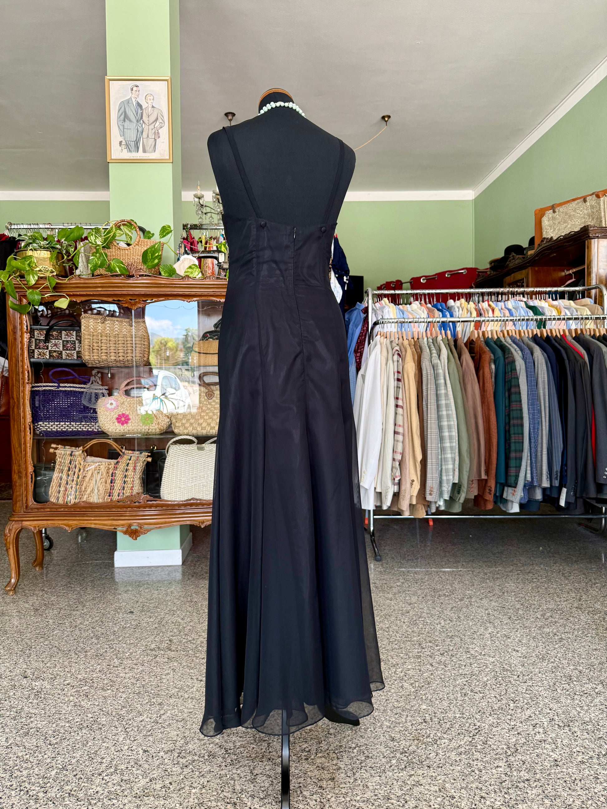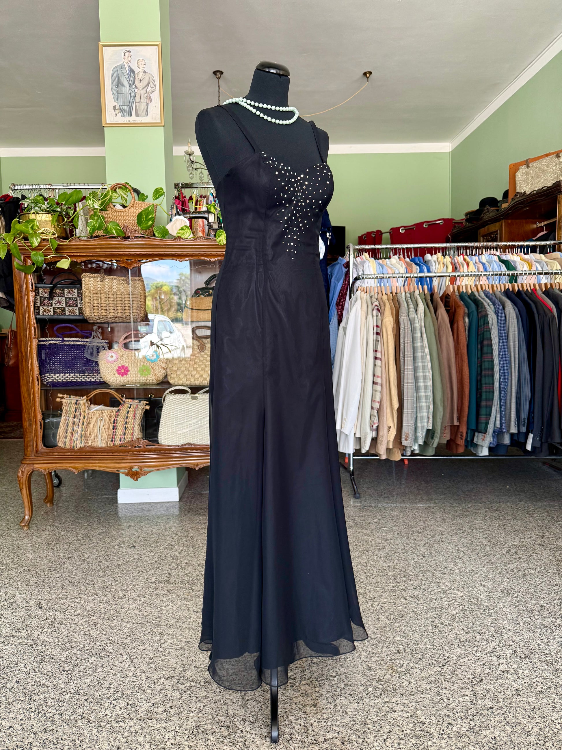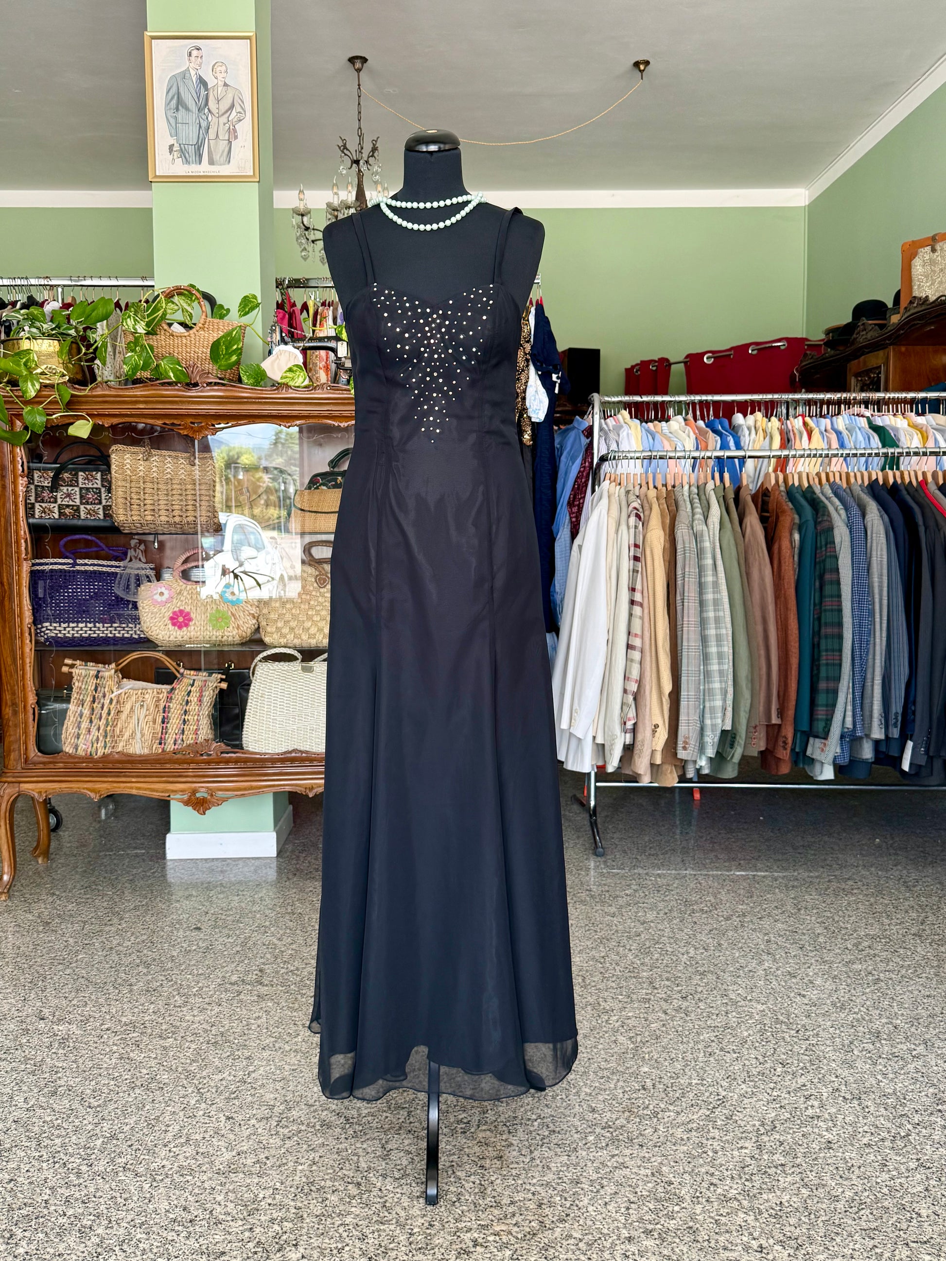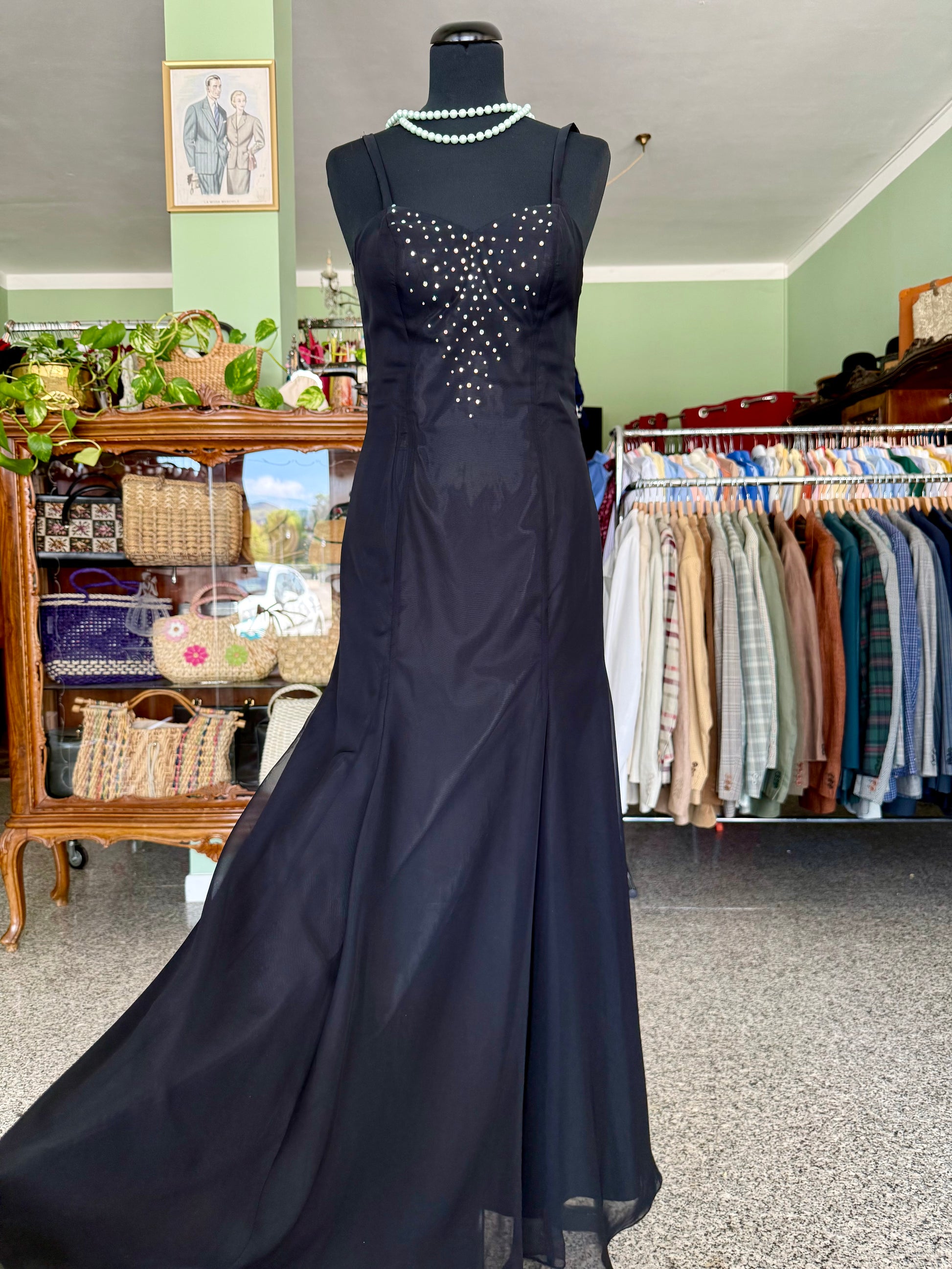 Abito da sera/ gala anni ‘90, colore nero, con scollo a cuore e raffinate strass sul corpino. L’abito si contraddistingue per la sua eleganza minimale e senza tempo. Il modello è scivolato, la gonna temine leggermente a sirena.