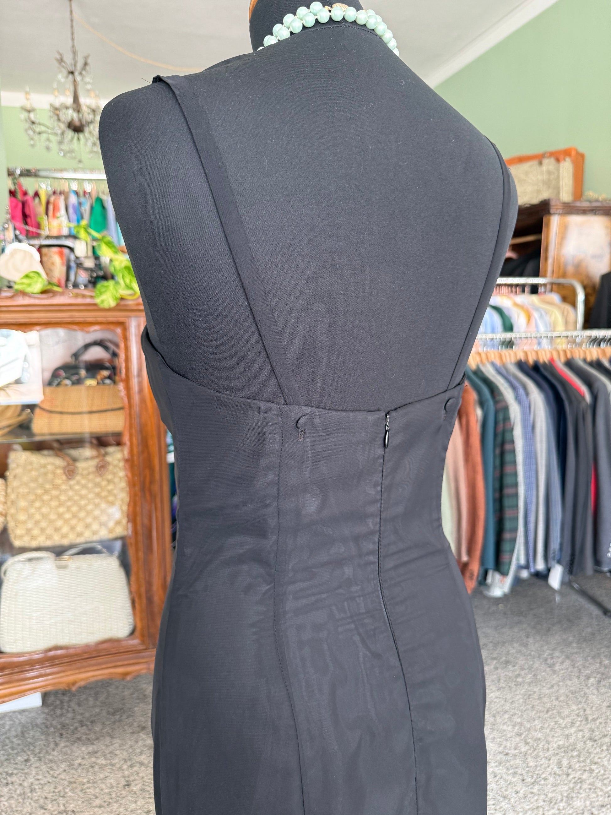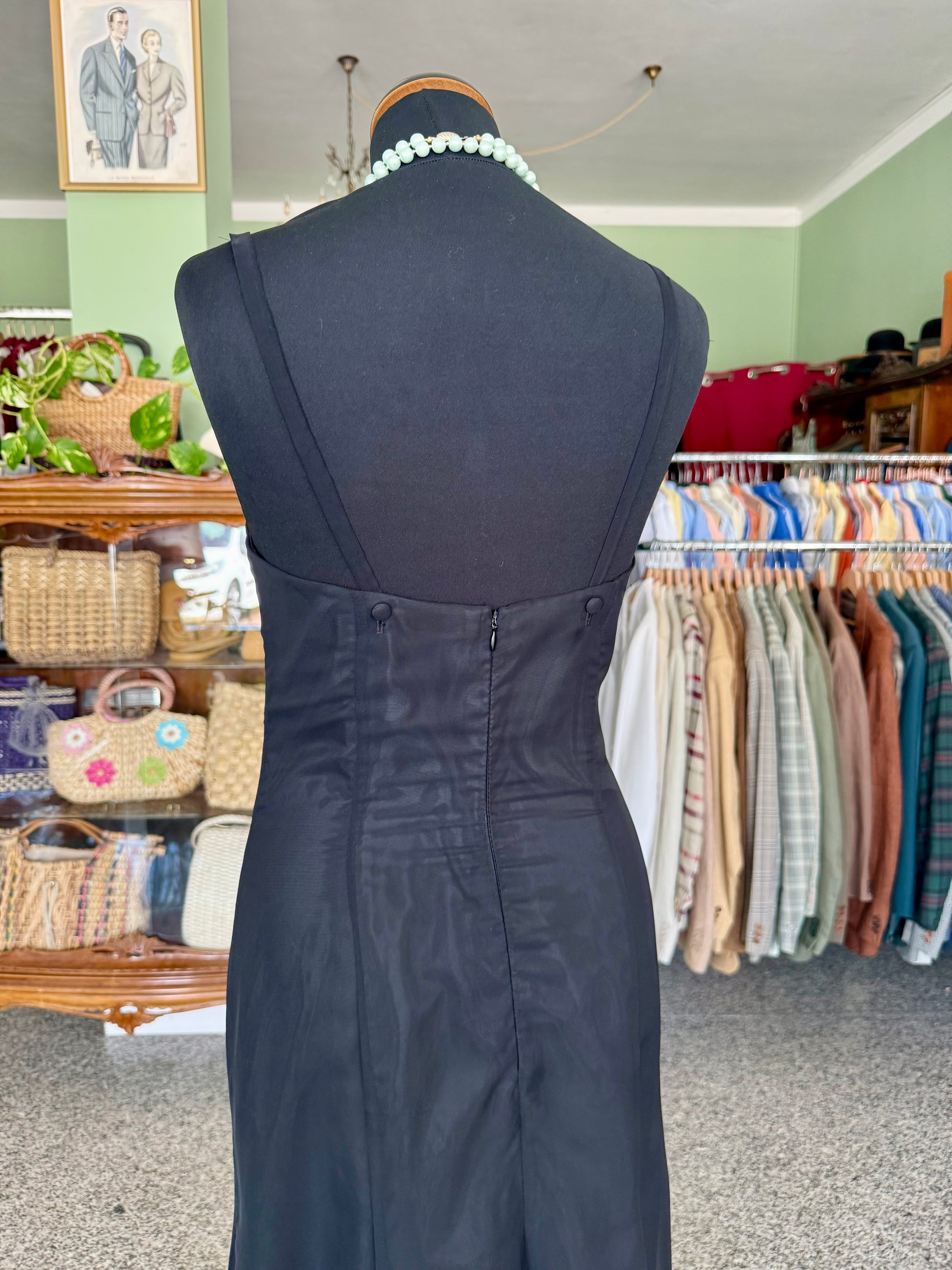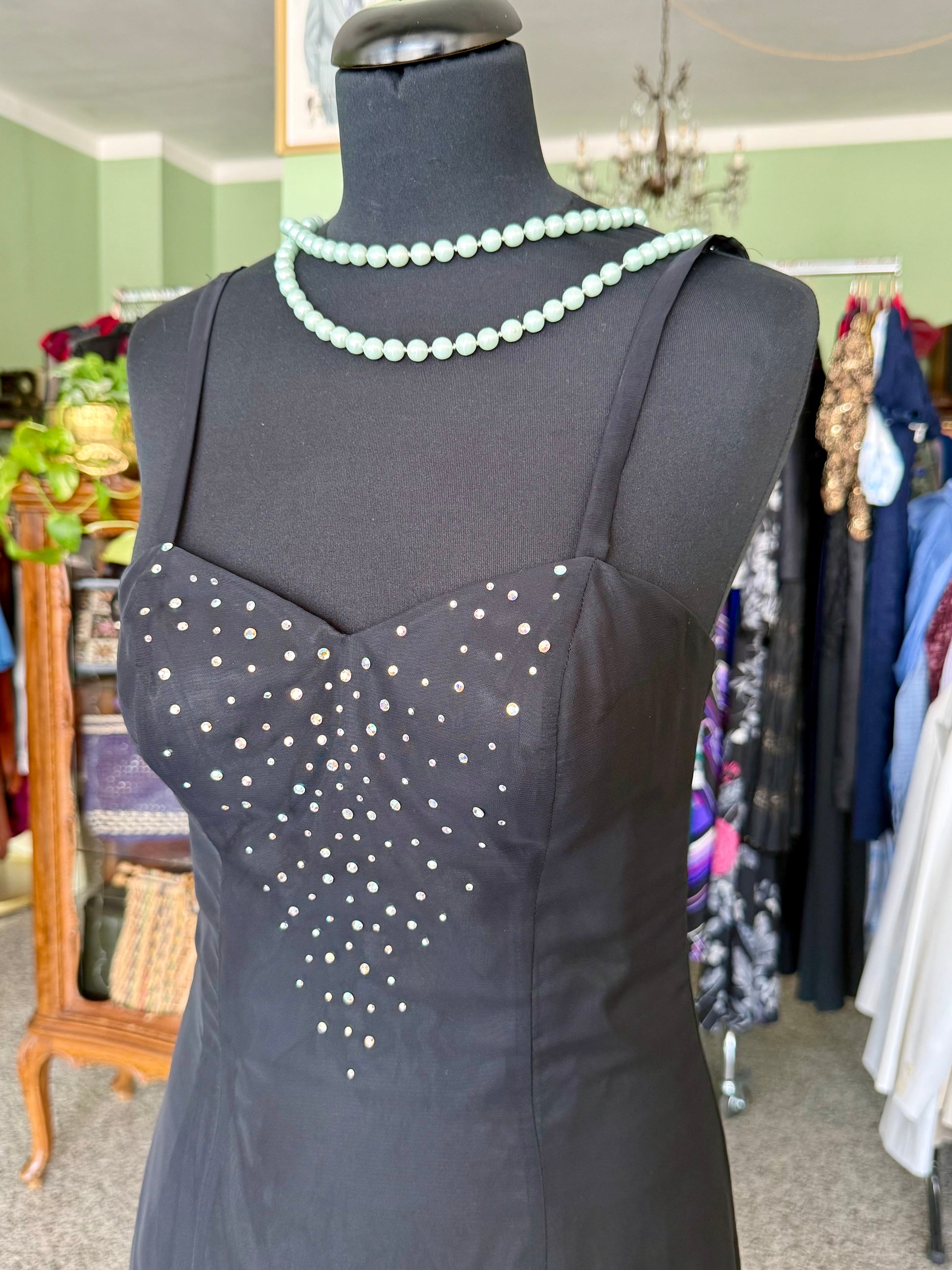 Abito da sera/ gala anni ‘90, colore nero, con scollo a cuore e raffinate strass sul corpino. L’abito si contraddistingue per la sua eleganza minimale e senza tempo. Il modello è scivolato, la gonna temine leggermente a sirena.