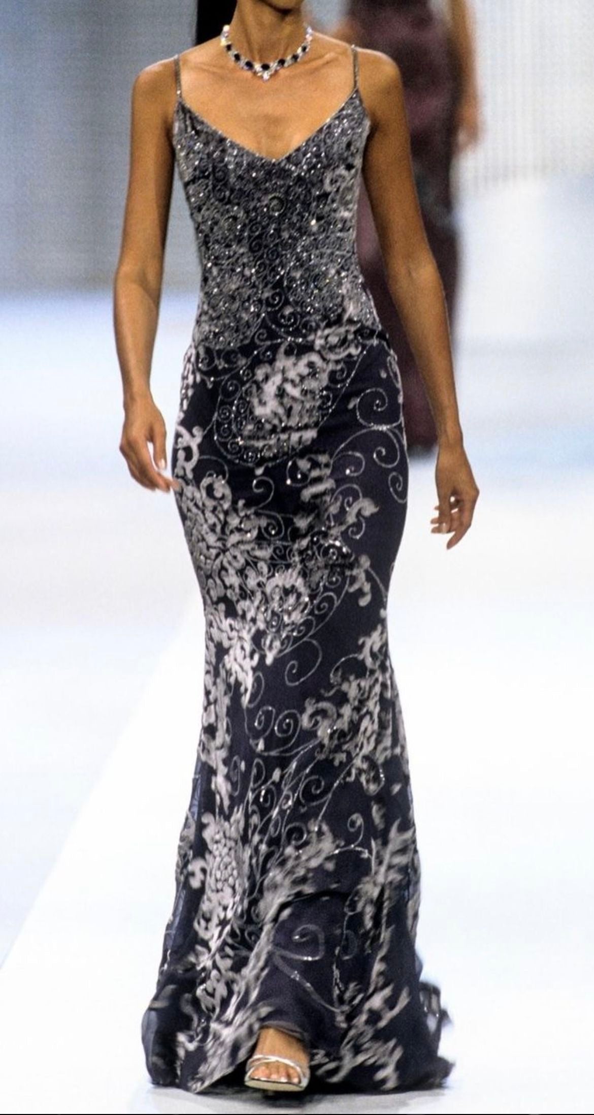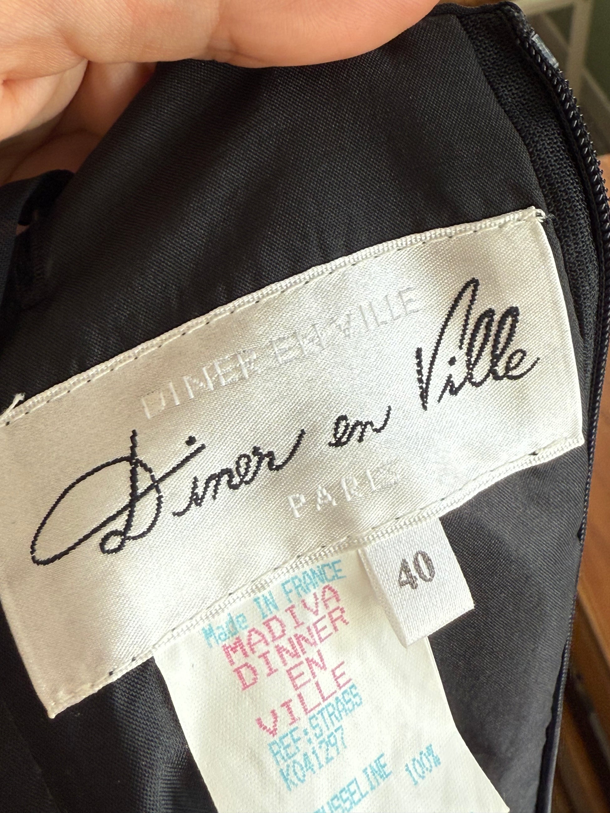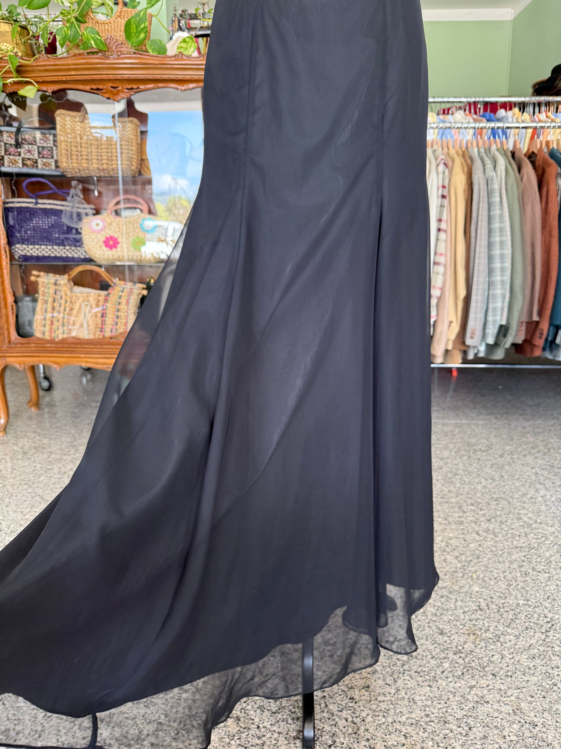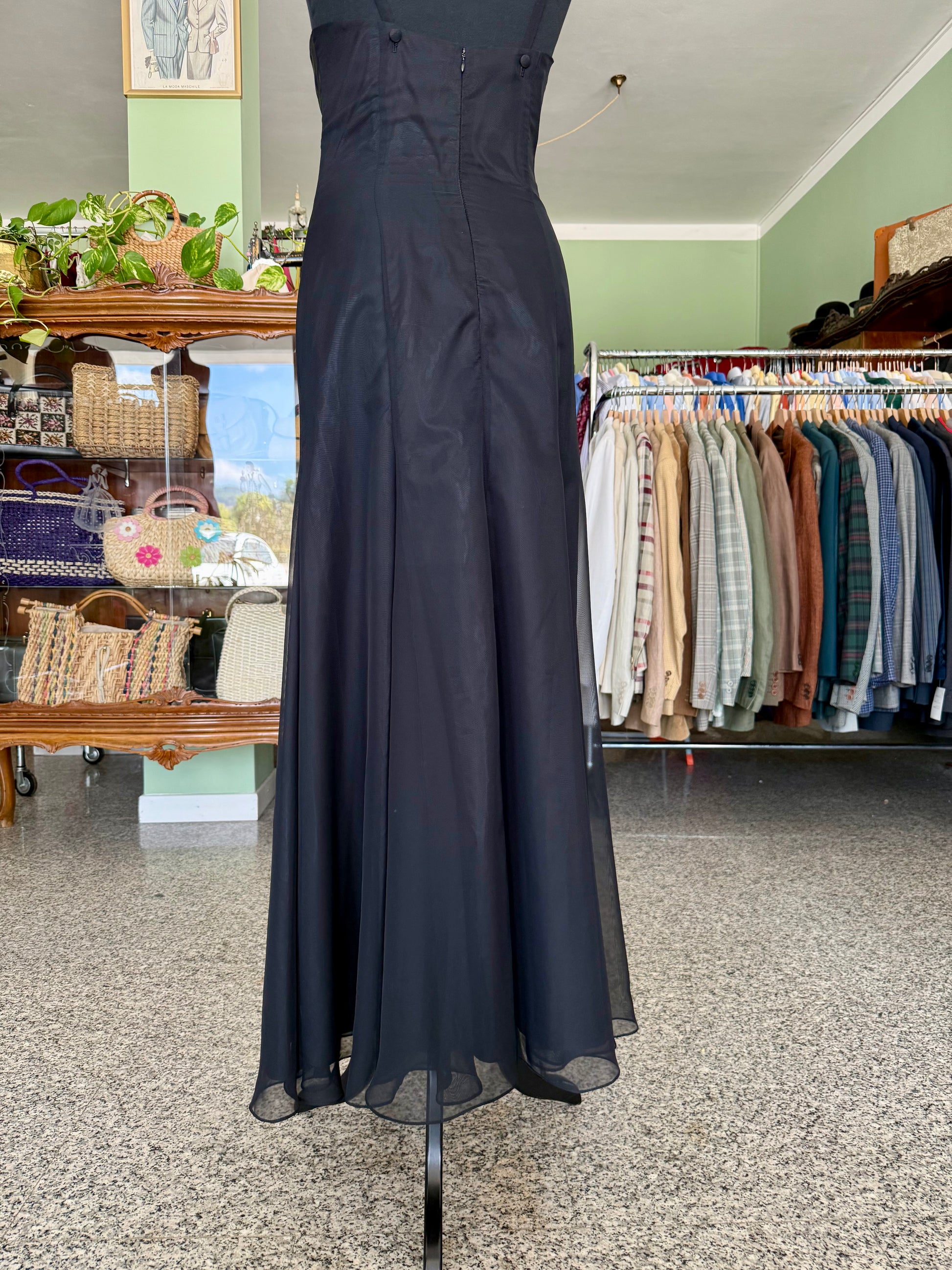 Abito da sera/ gala anni ‘90, colore nero, con scollo a cuore e raffinate strass sul corpino. L’abito si contraddistingue per la sua eleganza minimale e senza tempo. Il modello è scivolato, la gonna temine leggermente a sirena.