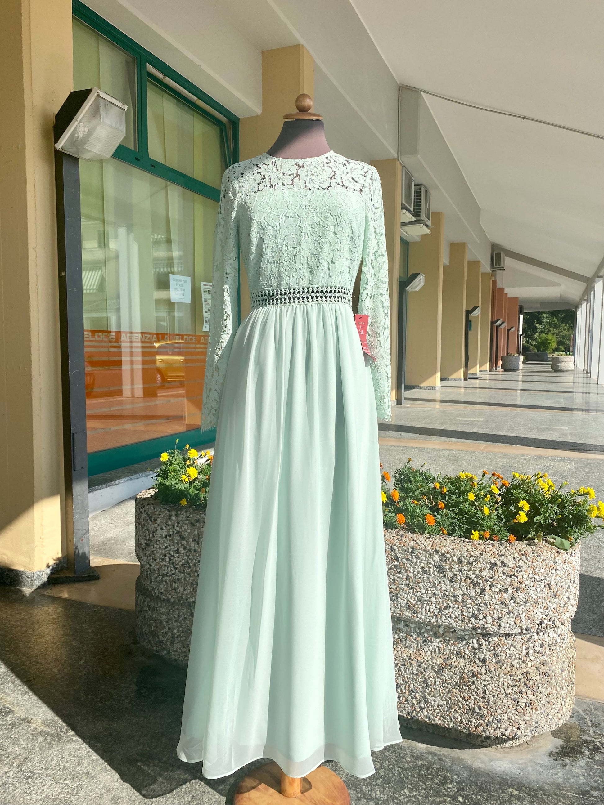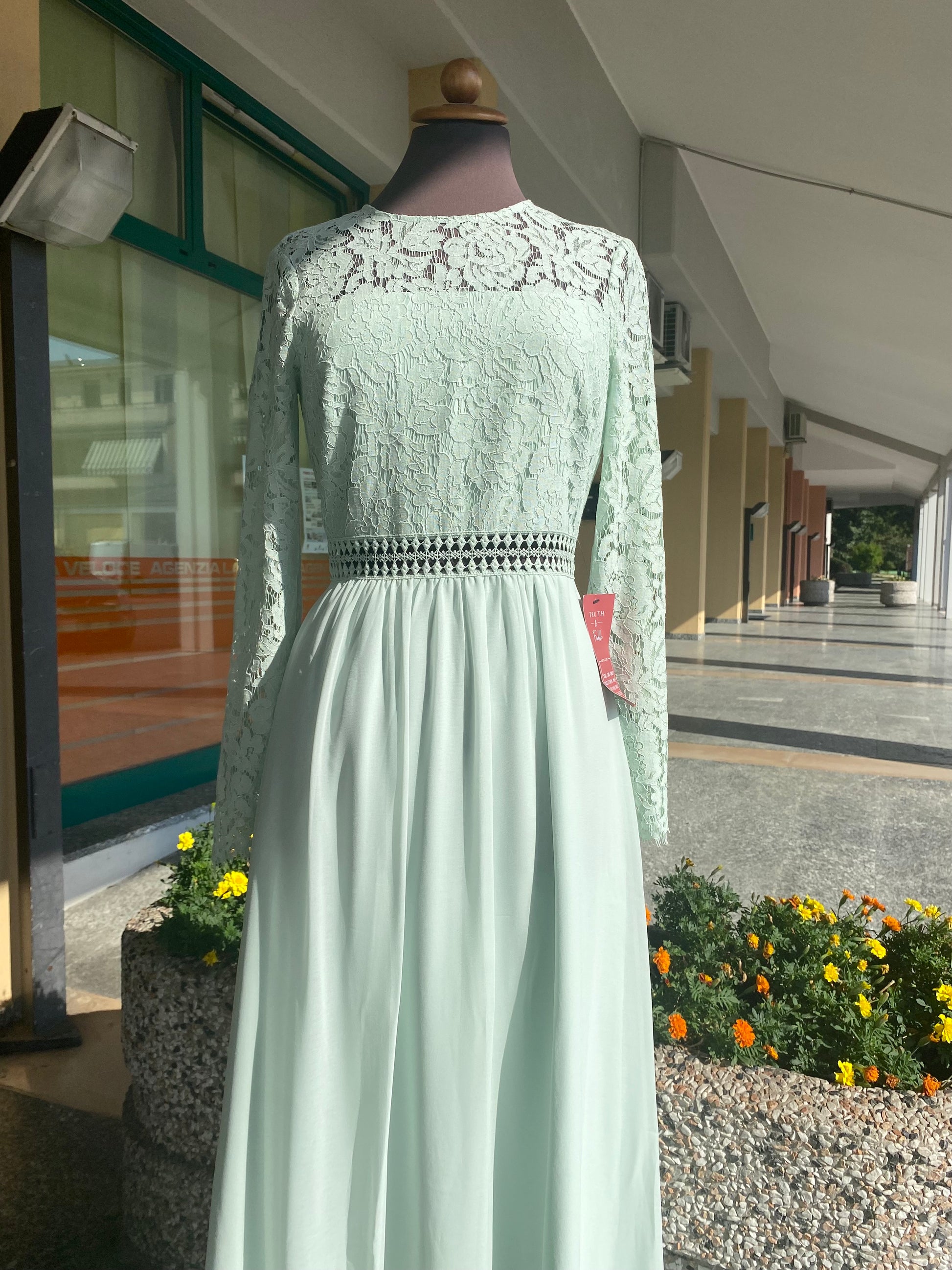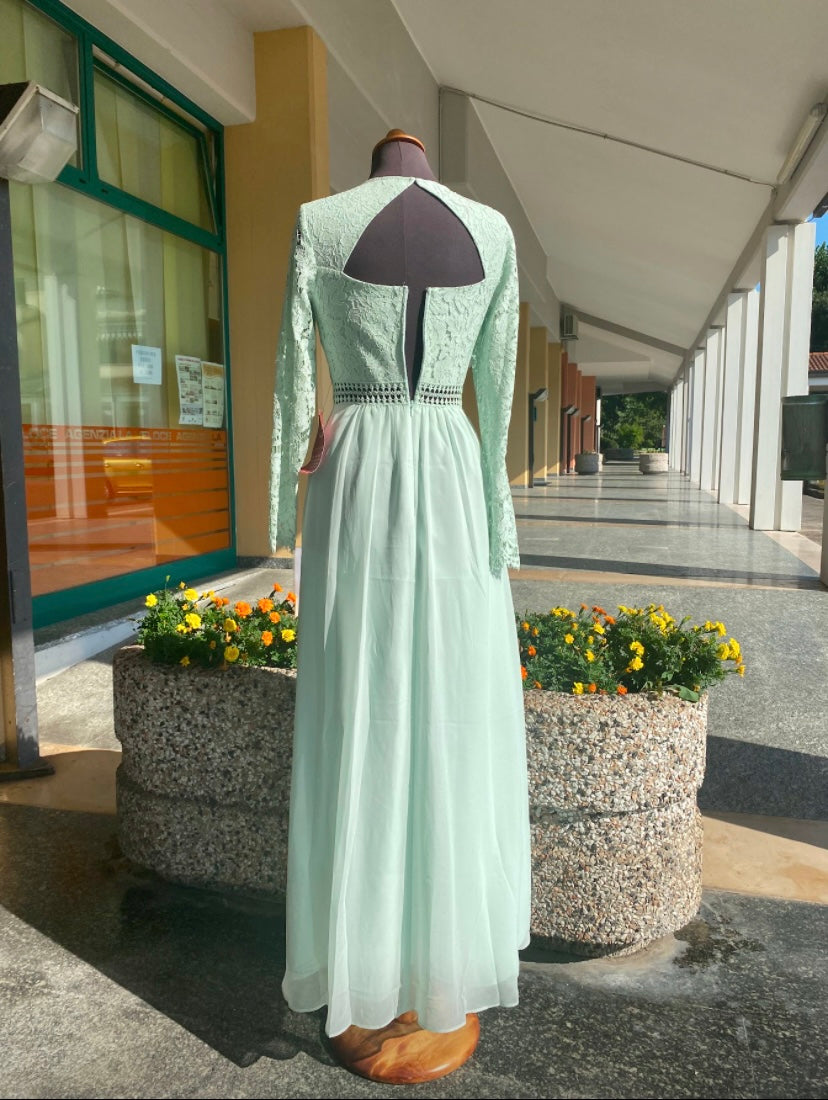 Abito da cerimonia in delicato verde salvia, con corpetto in pizzo a maniche lunghe, impreziosito da una cintura intrecciata in vita che sottolinea la silhouette. La gonna lunga in chiffon leggero cade morbida e fluida, creando un'eleganza eterea. L’apertura a goccia sulla schiena aggiunge un tocco raffinato e femminile. Perfetto per occasioni speciali, matrimoni e cerimonie