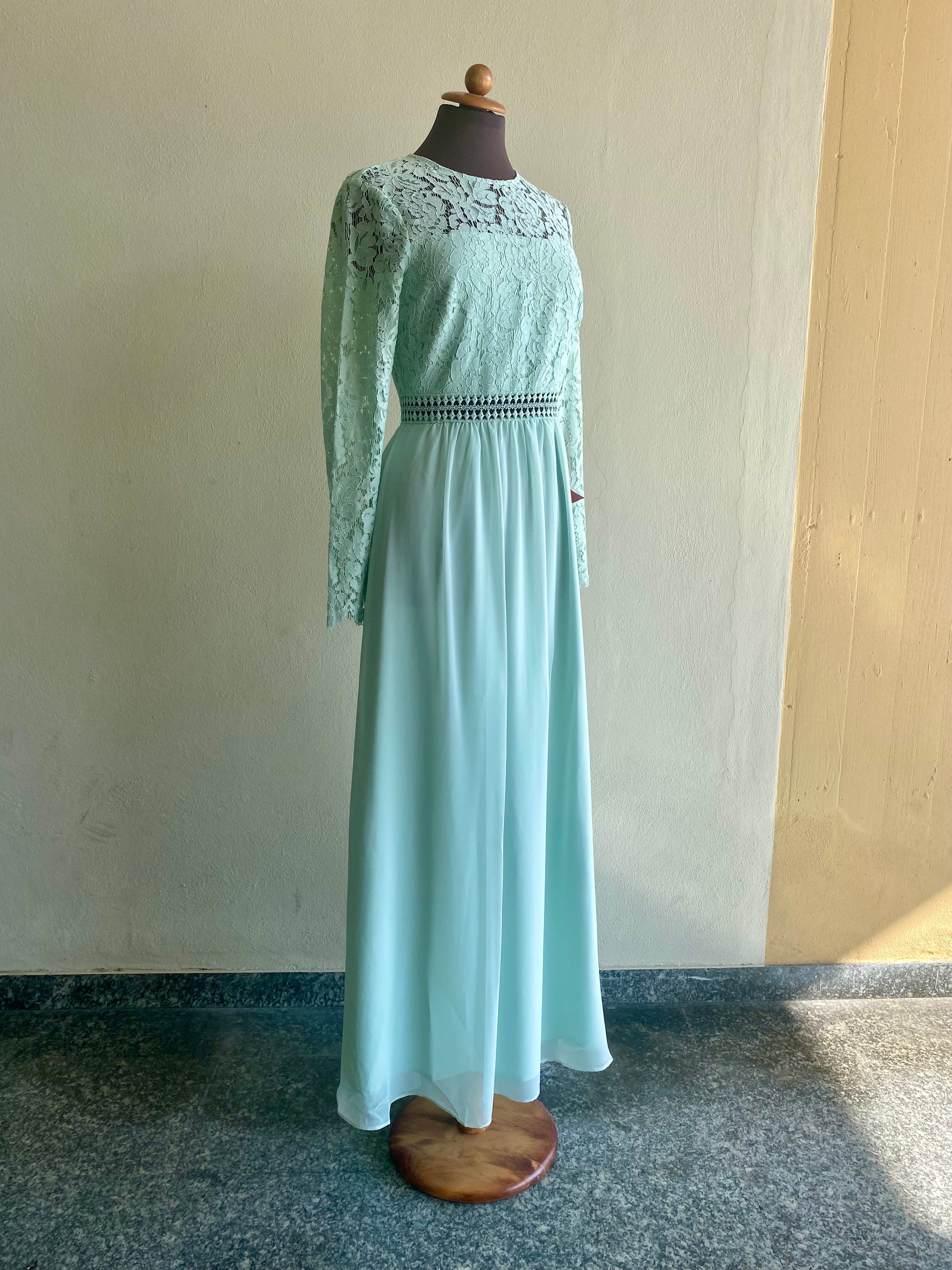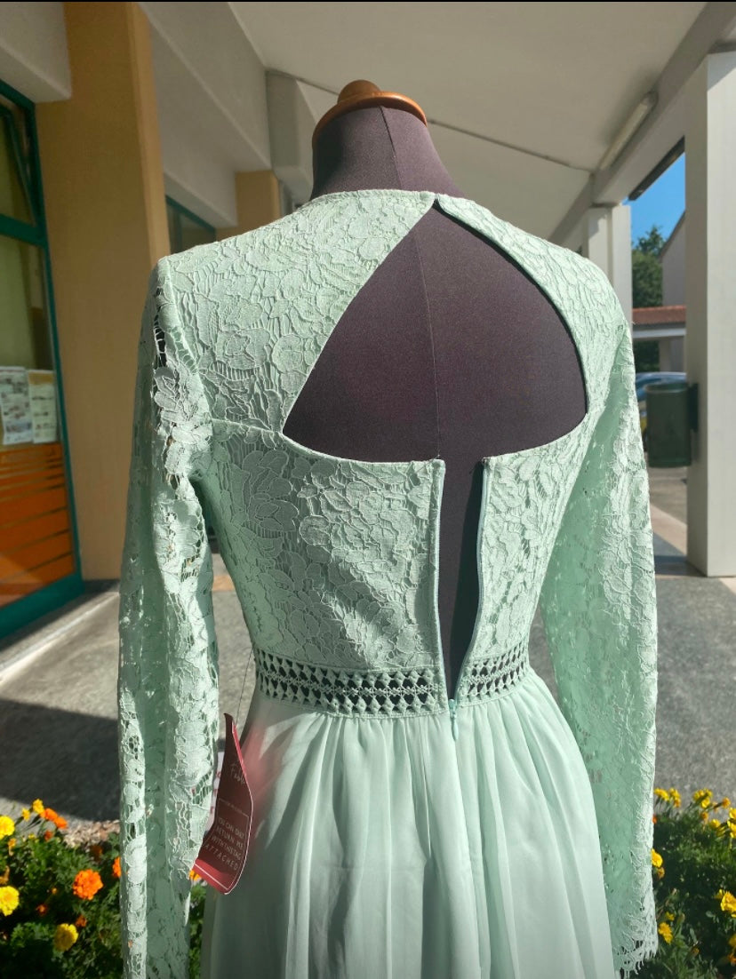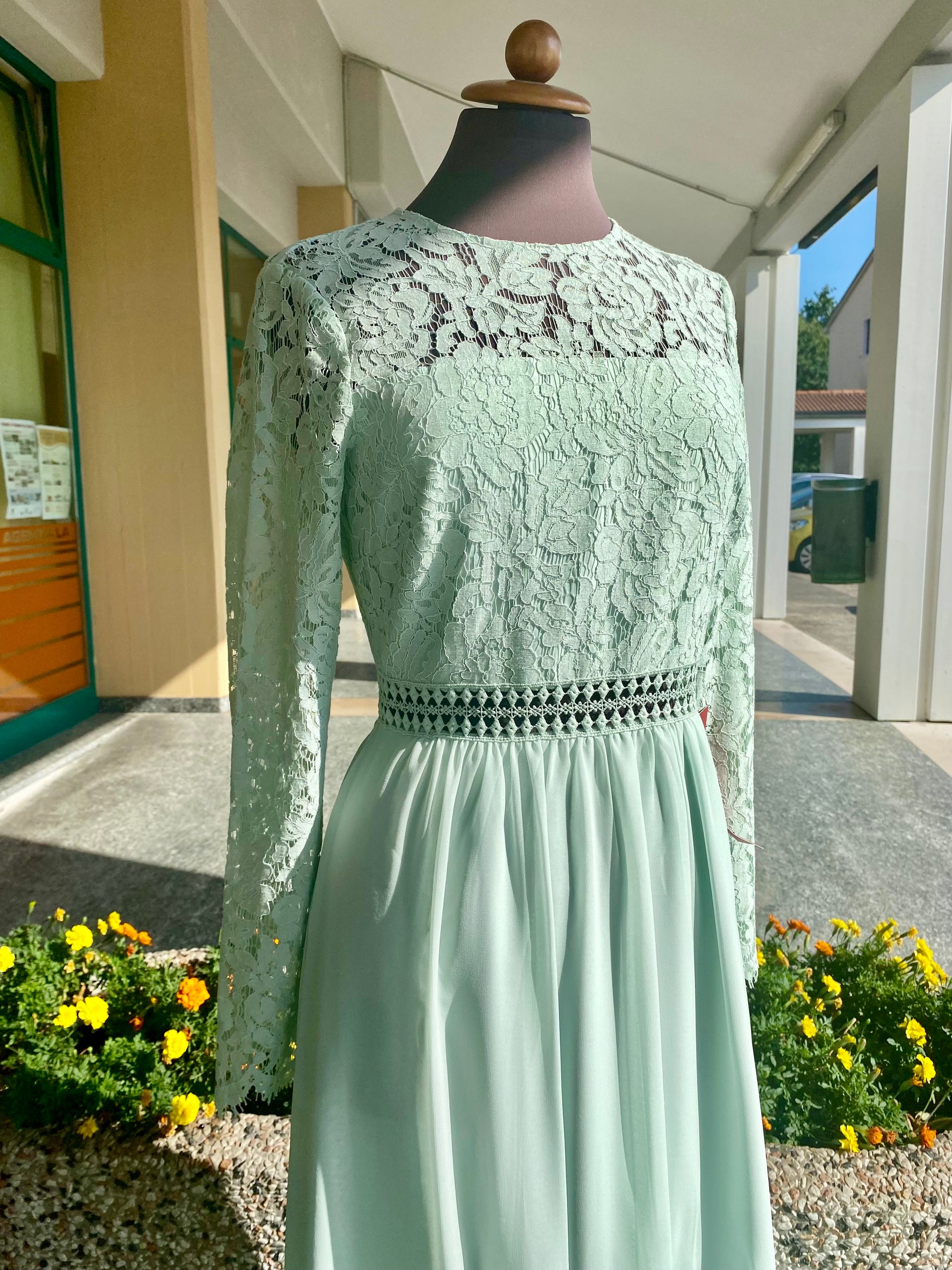 Abito da cerimonia in delicato verde salvia, con corpetto in pizzo a maniche lunghe, impreziosito da una cintura intrecciata in vita che sottolinea la silhouette. La gonna lunga in chiffon leggero cade morbida e fluida, creando un'eleganza eterea. L’apertura a goccia sulla schiena aggiunge un tocco raffinato e femminile. Perfetto per occasioni speciali, matrimoni e cerimonie