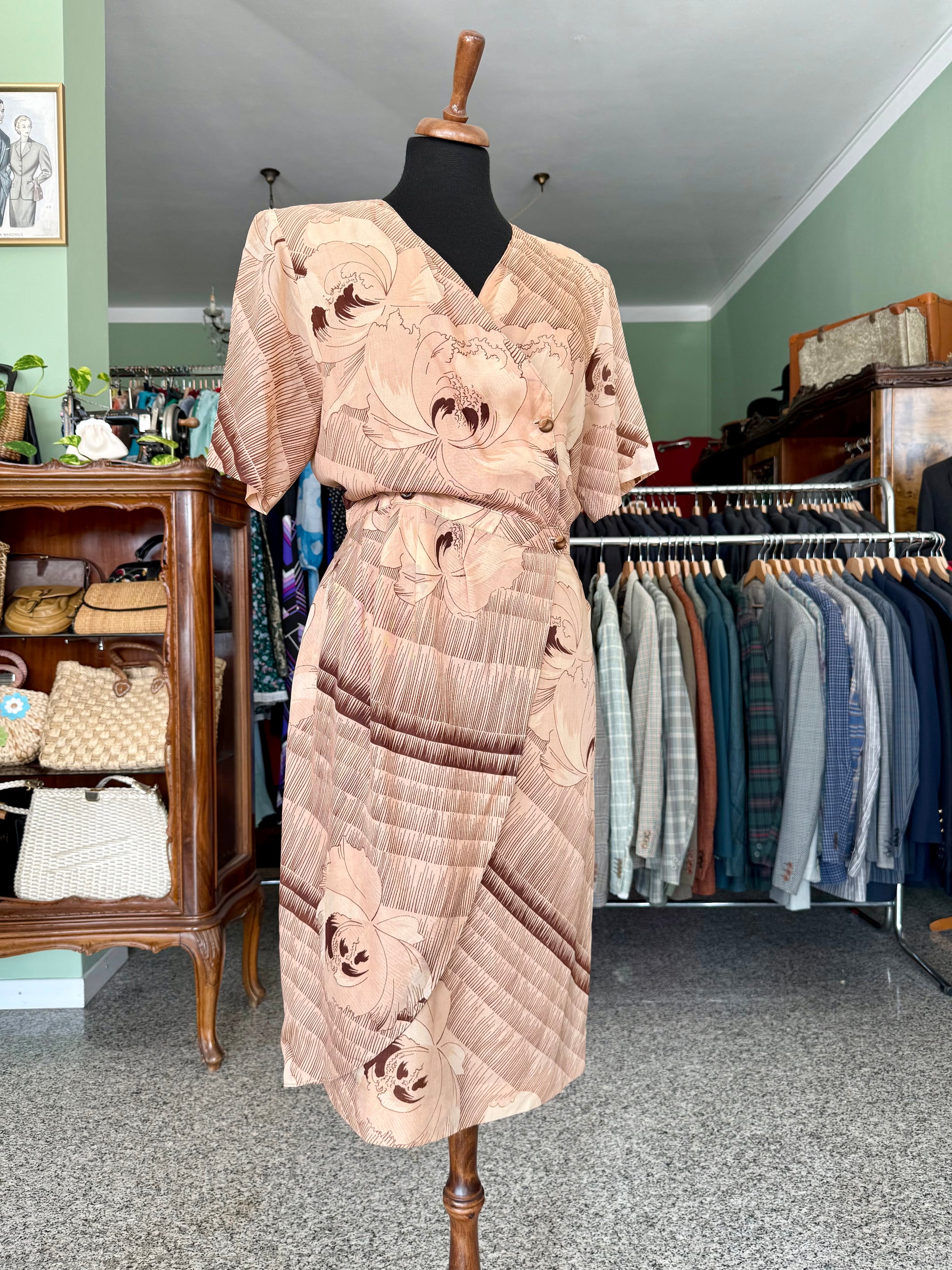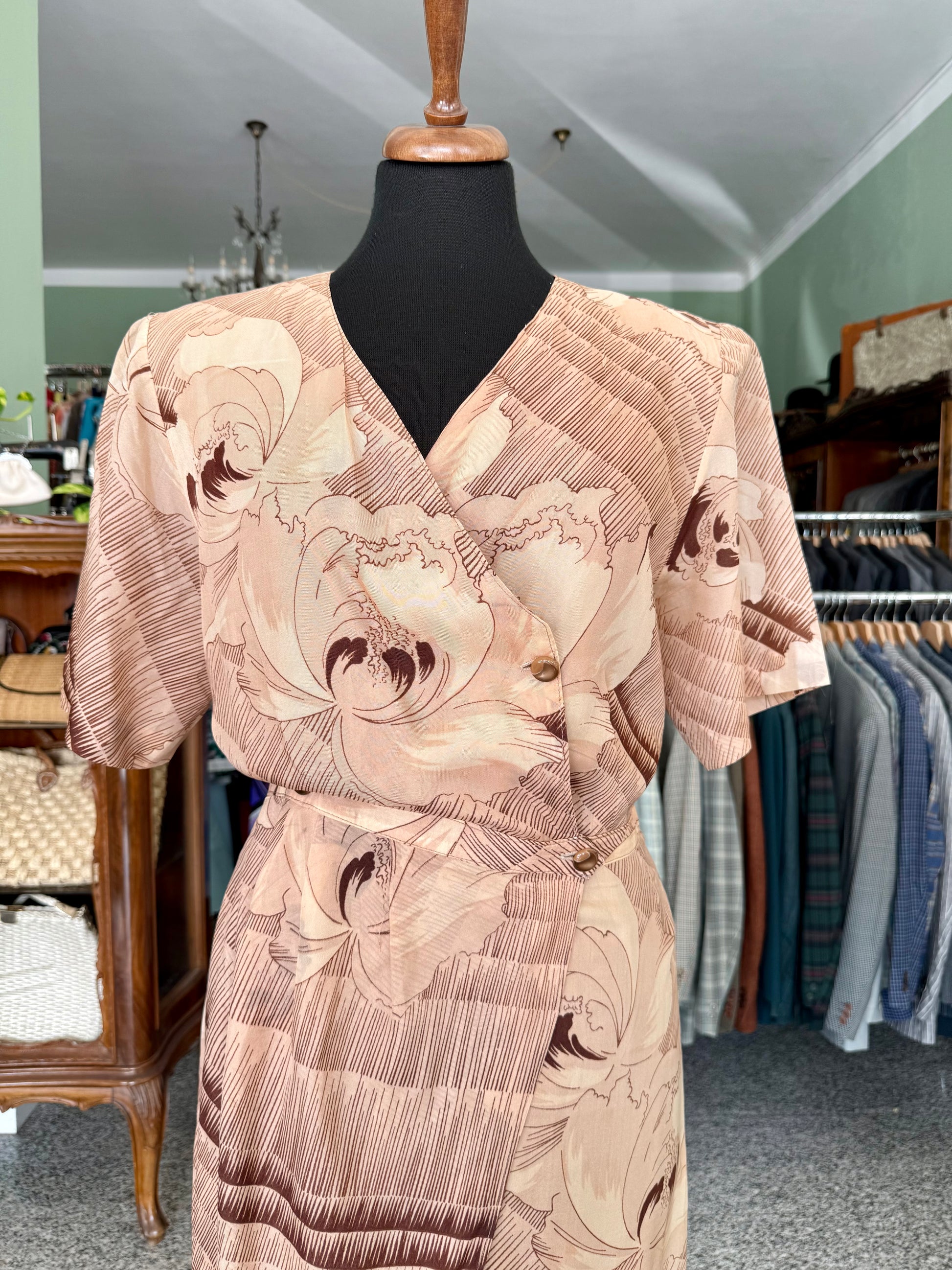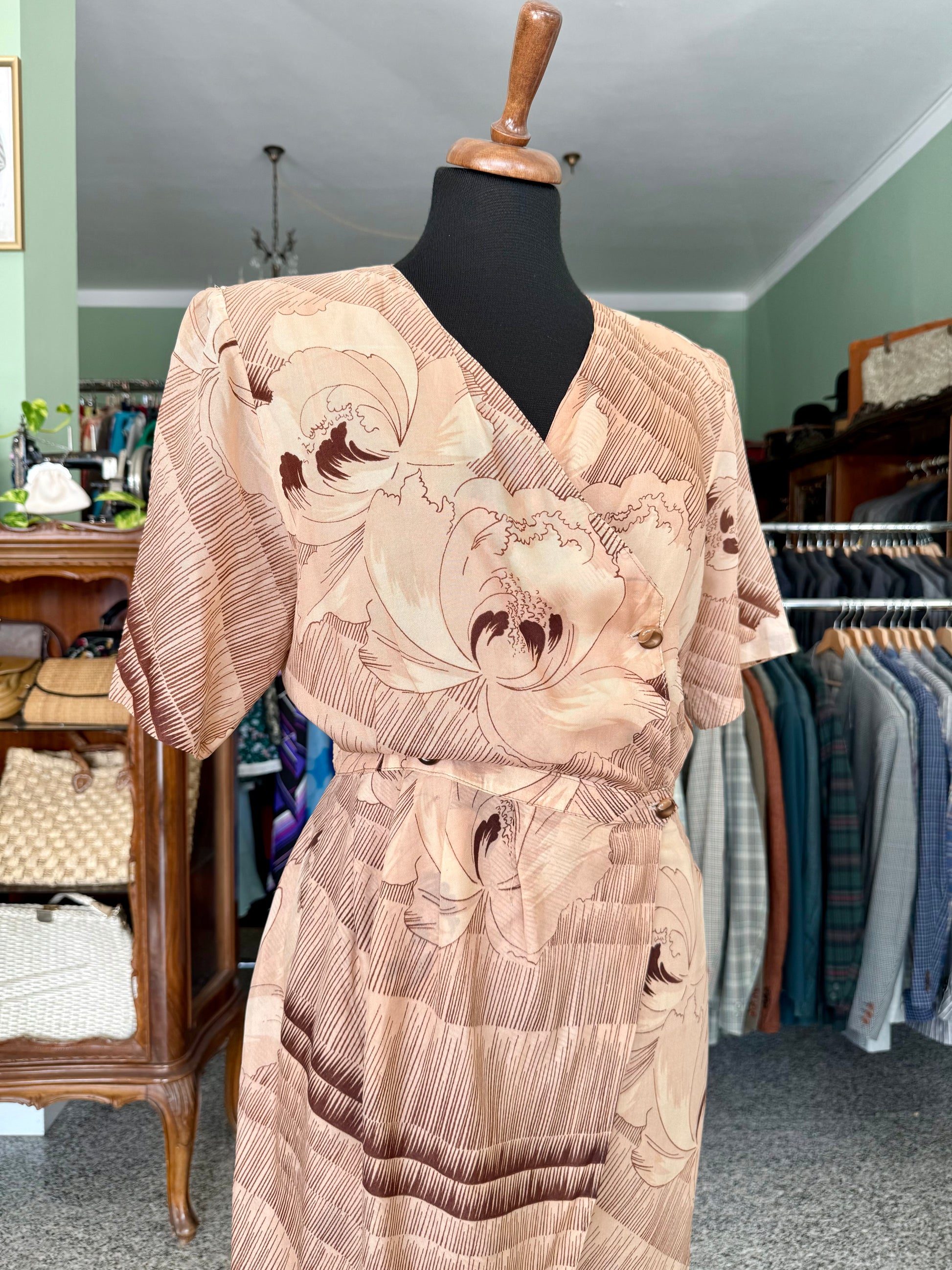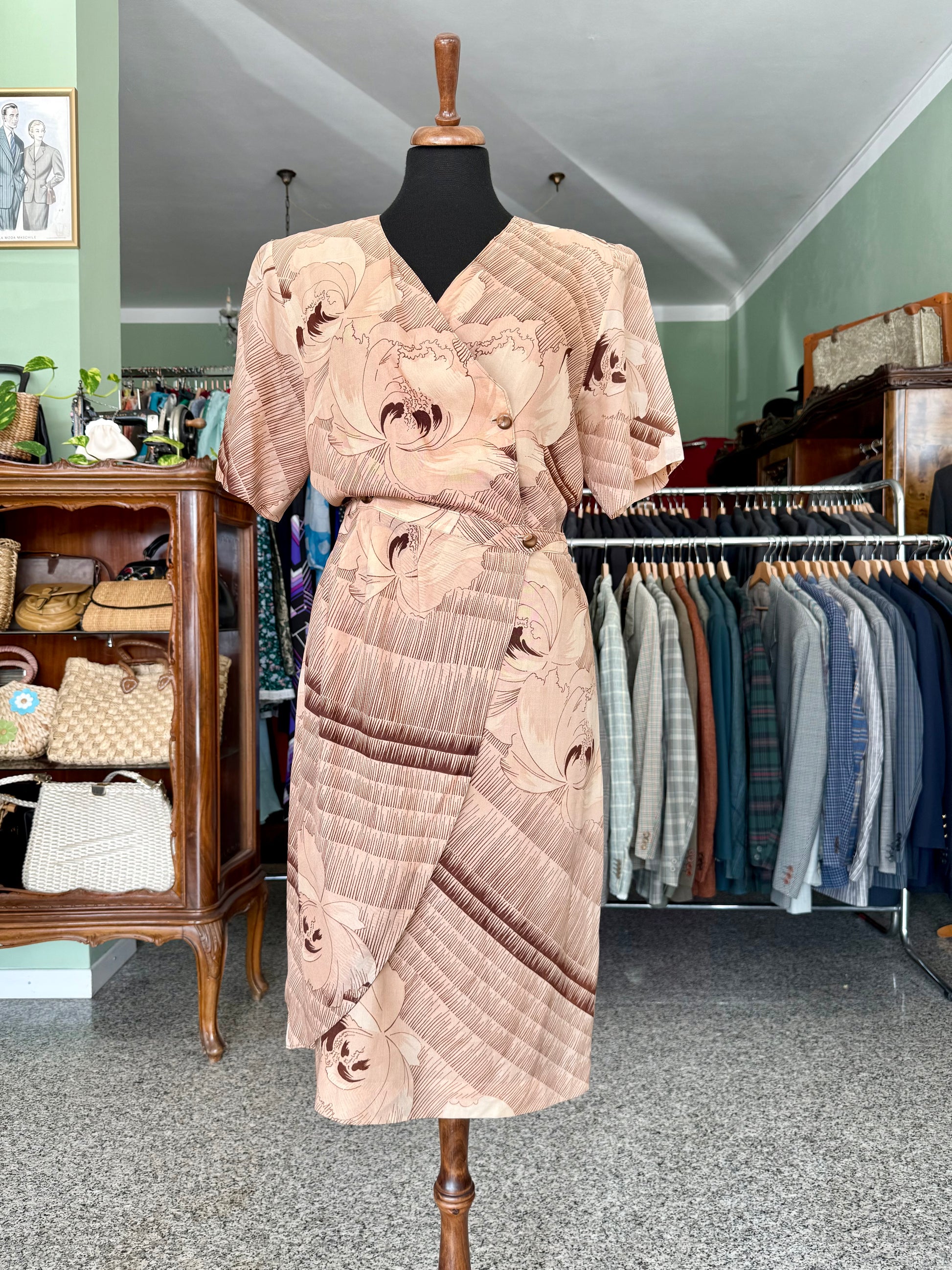 Abito anni ‘70 sartoriale dalla linea elegante e sofisticata. Scollo a V, maniche corte, gonna modello portafoglio. Stampa grafico- floreale sui toni nocciola.