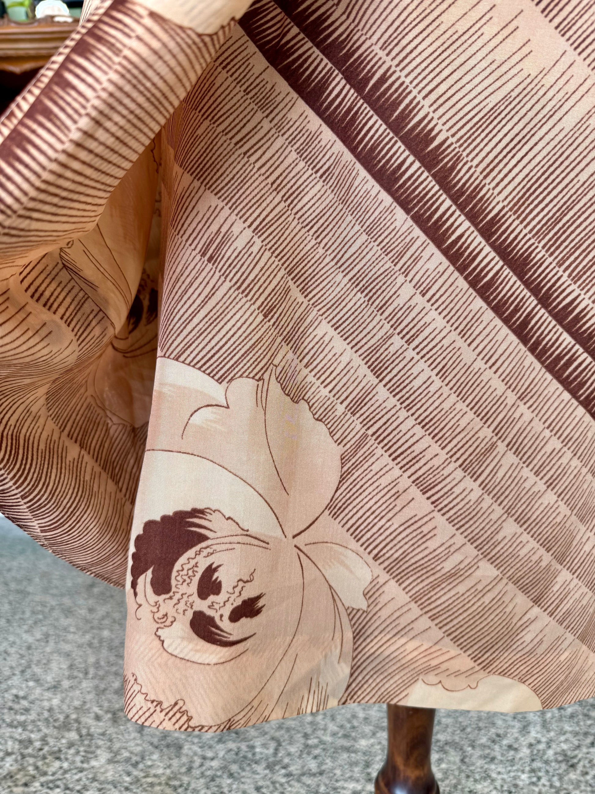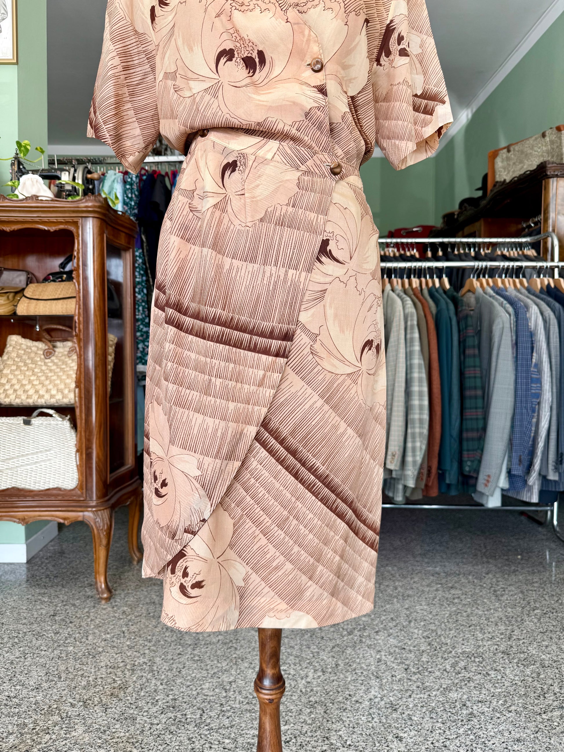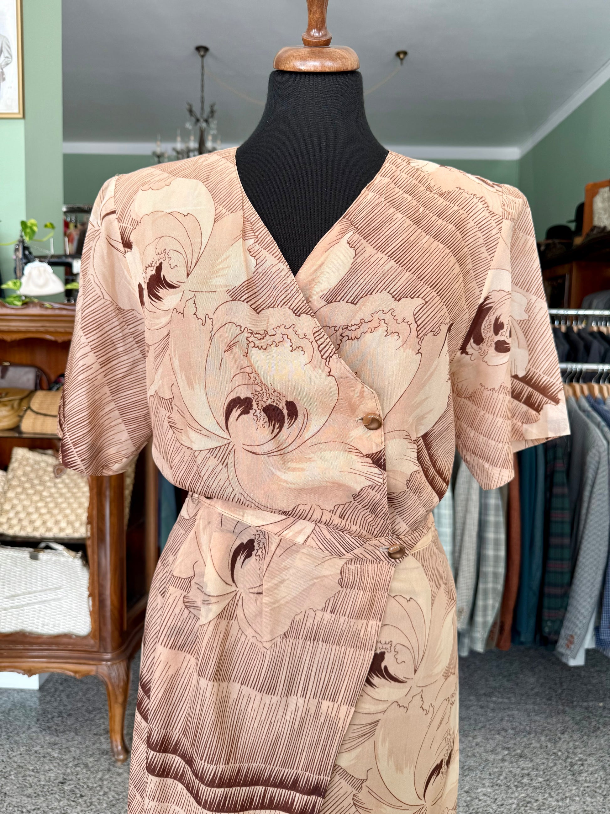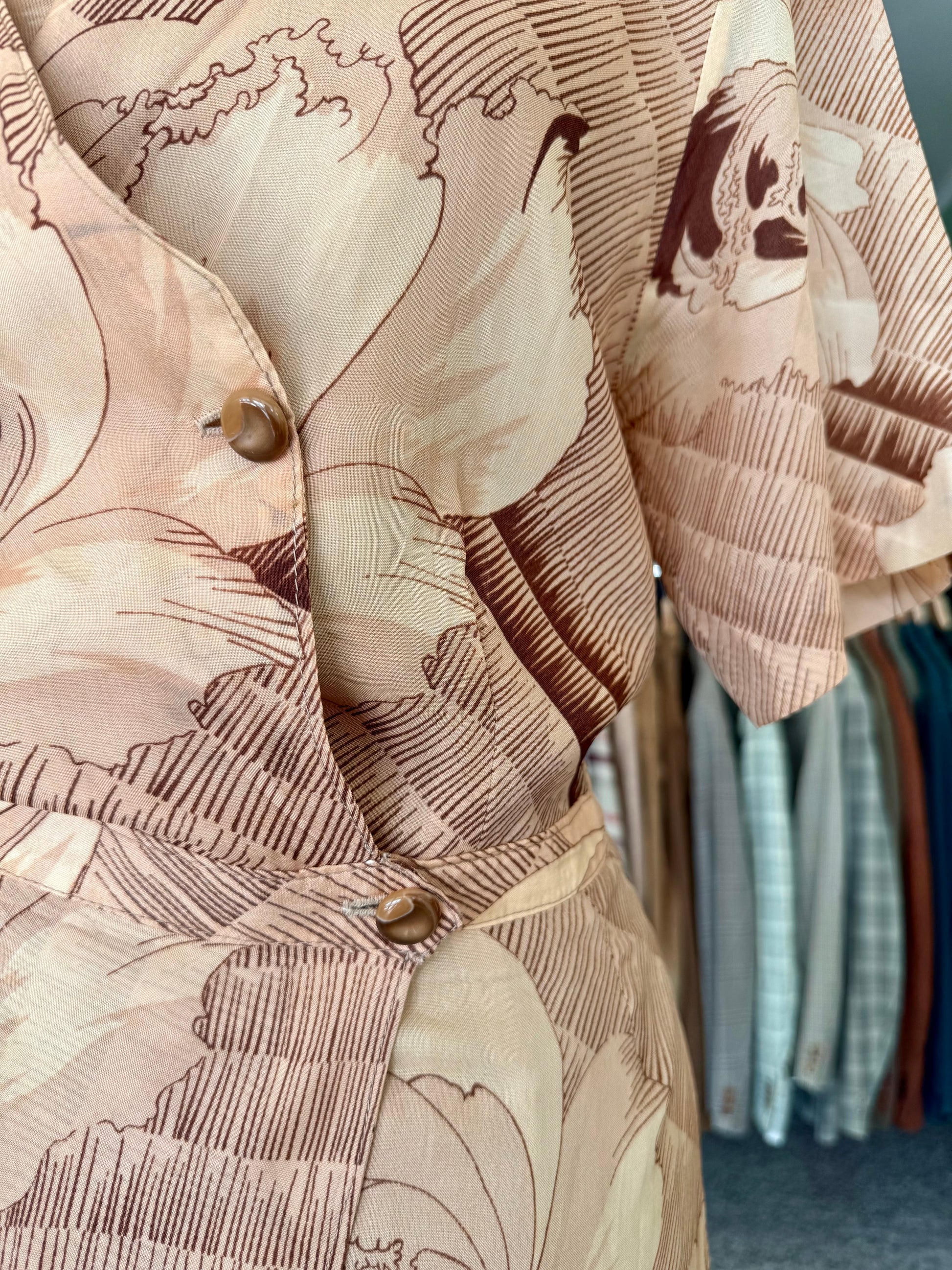 Abito anni ‘70 sartoriale dalla linea elegante e sofisticata. Scollo a V, maniche corte, gonna modello portafoglio. Stampa grafico- floreale sui toni nocciola.