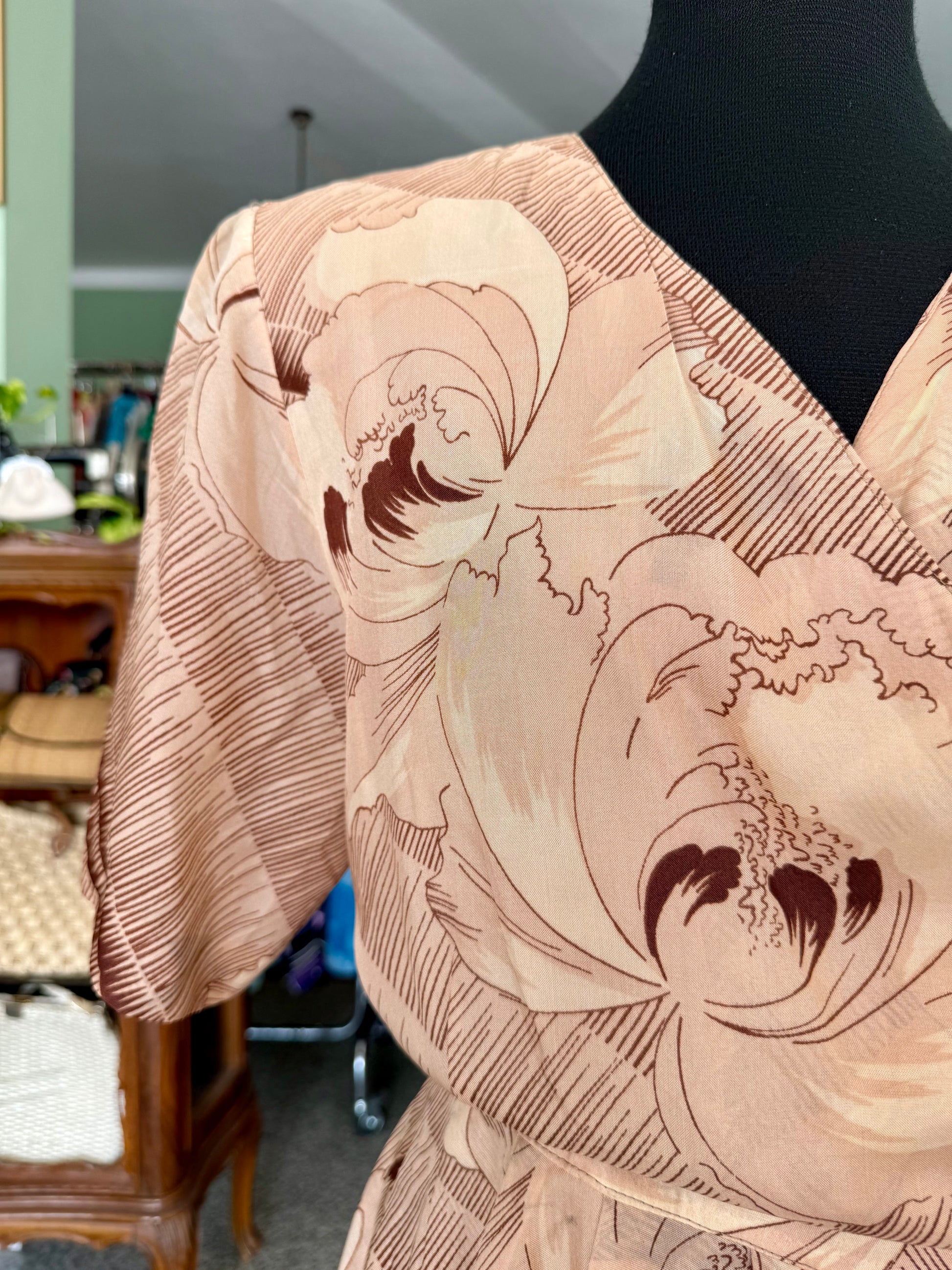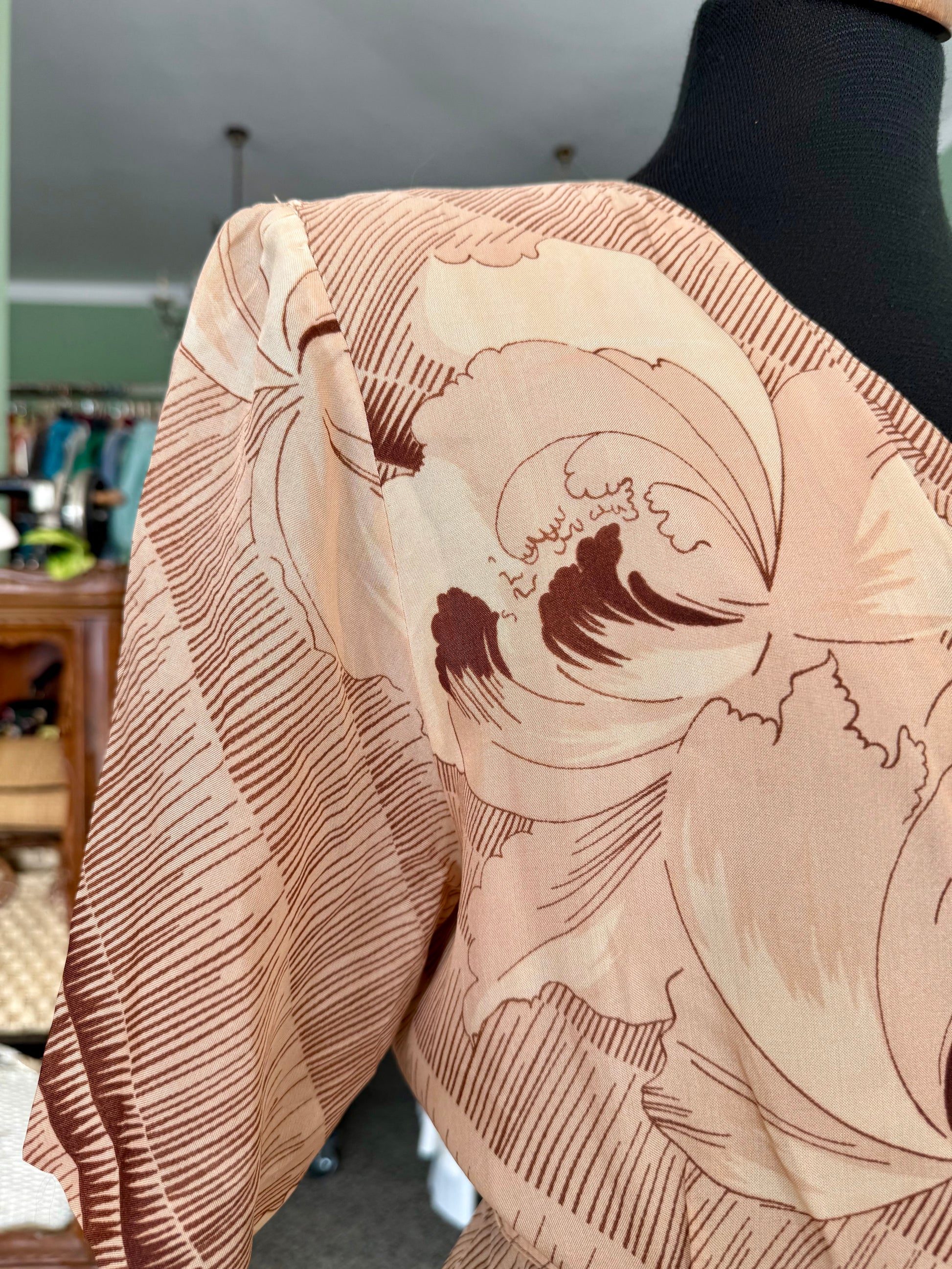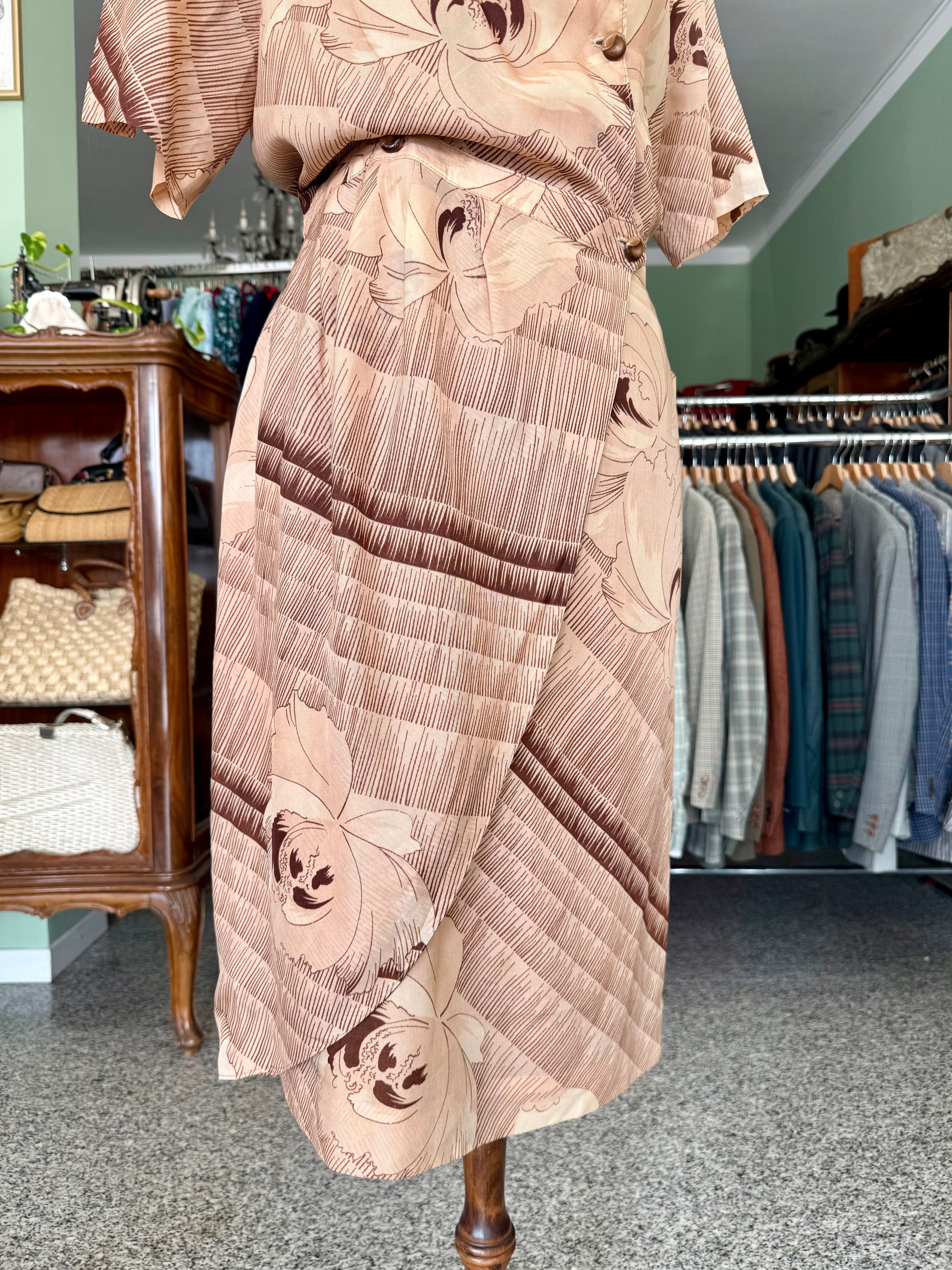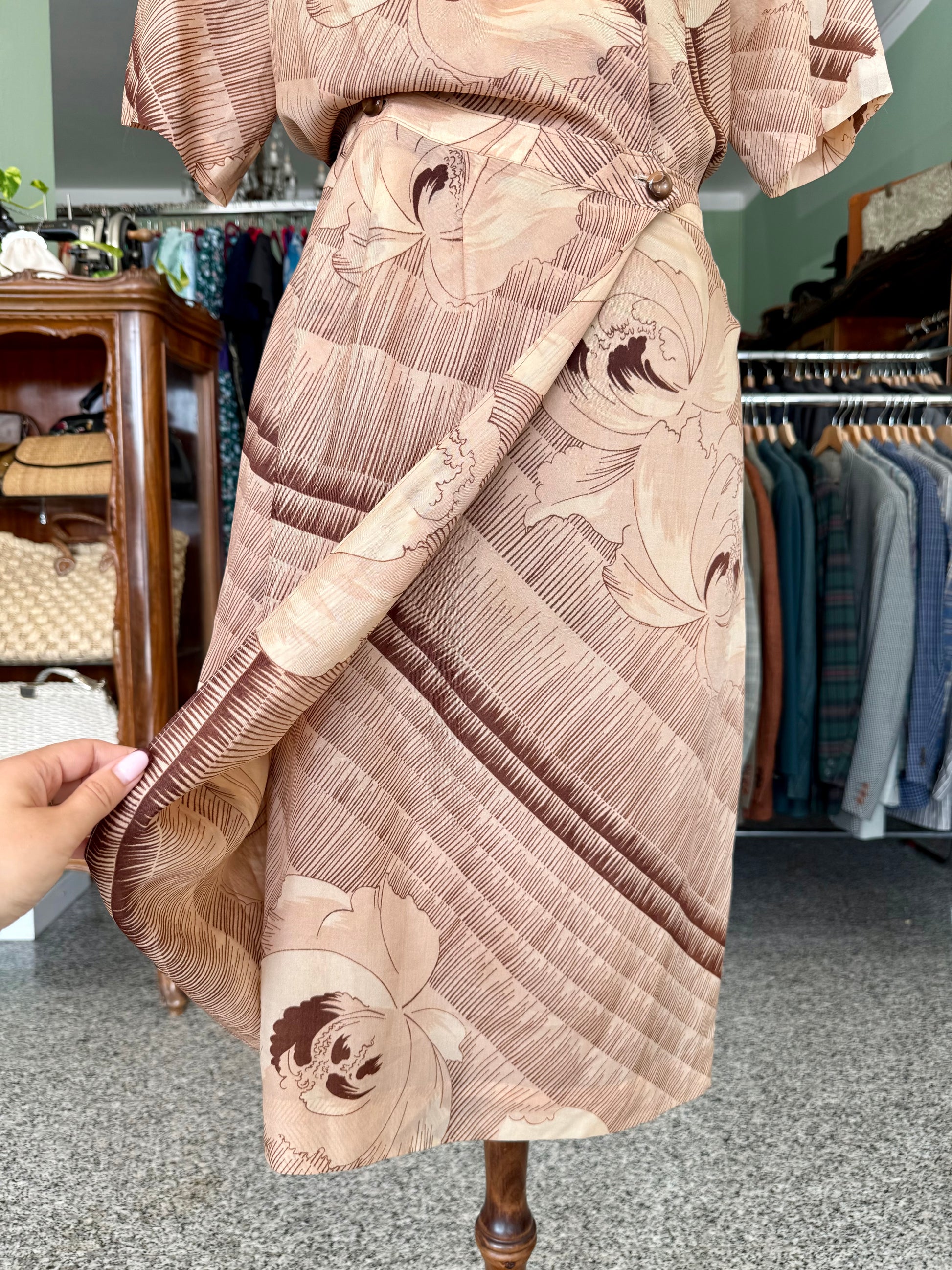 Abito anni ‘70 sartoriale dalla linea elegante e sofisticata. Scollo a V, maniche corte, gonna modello portafoglio. Stampa grafico- floreale sui toni nocciola.