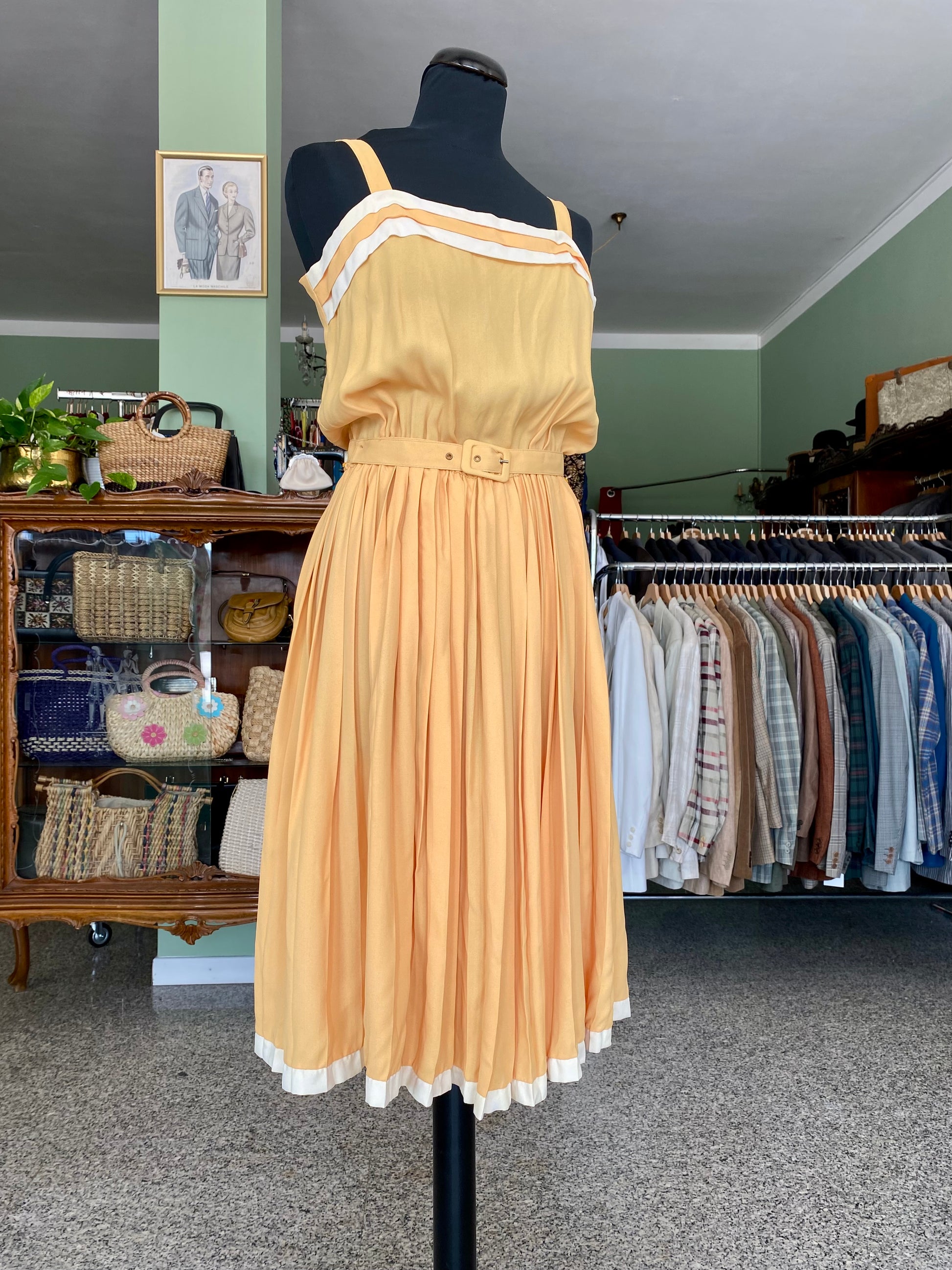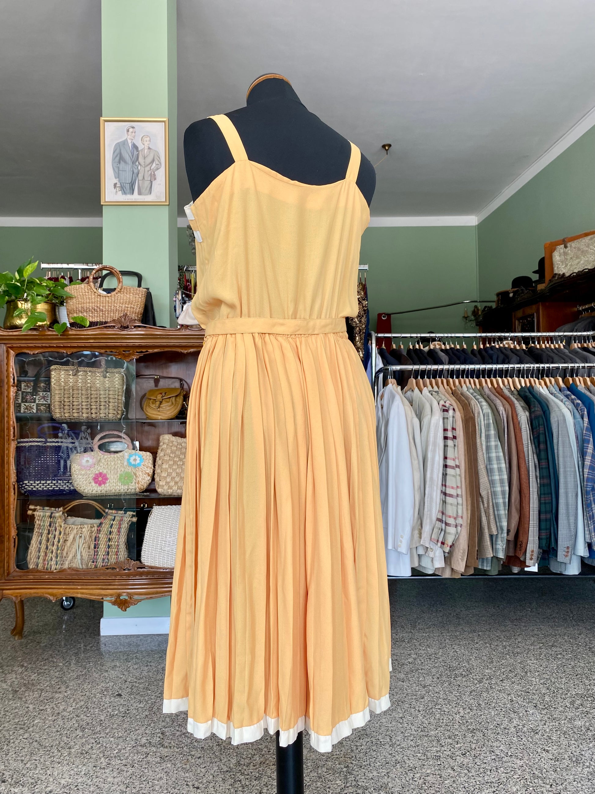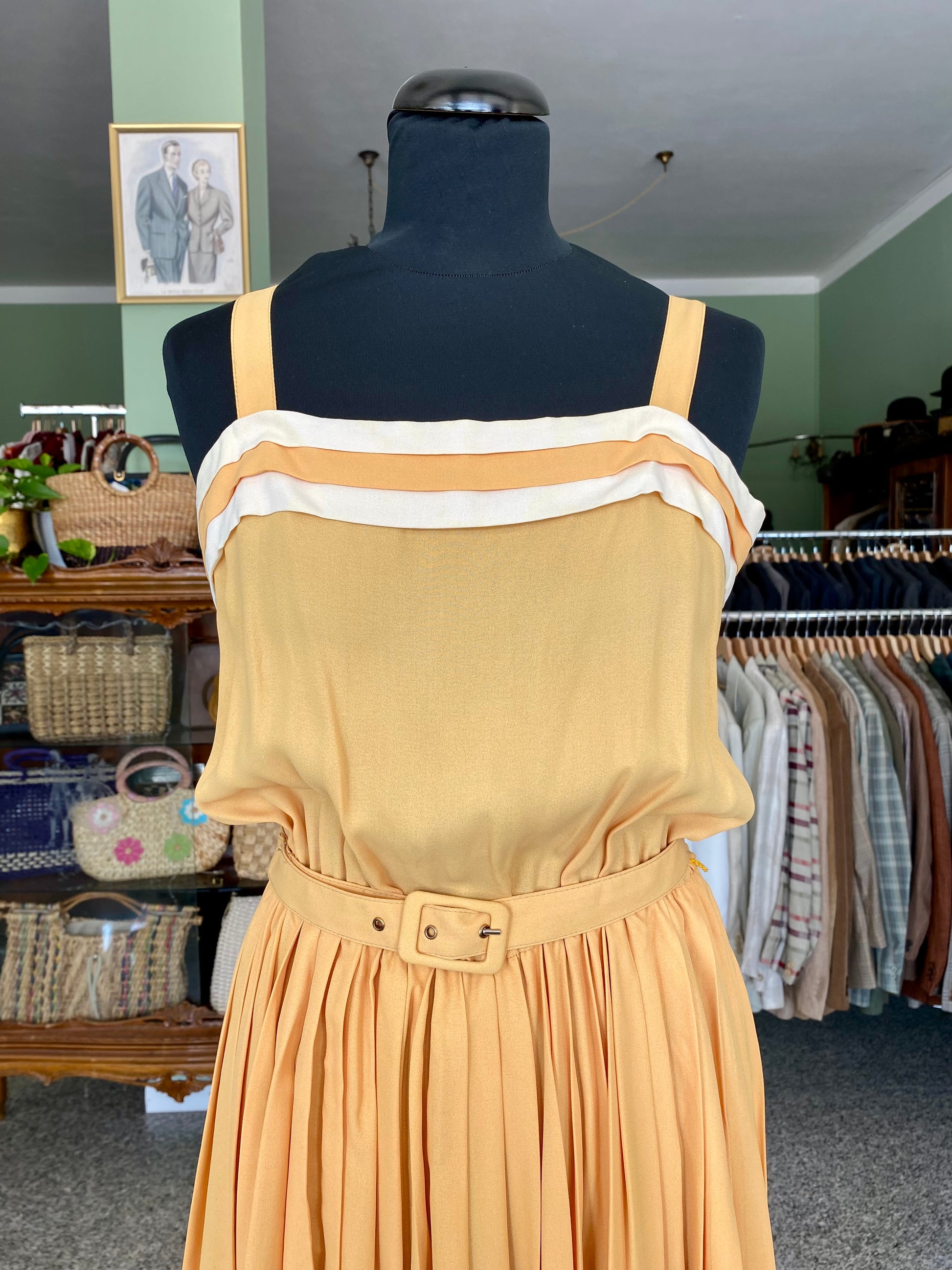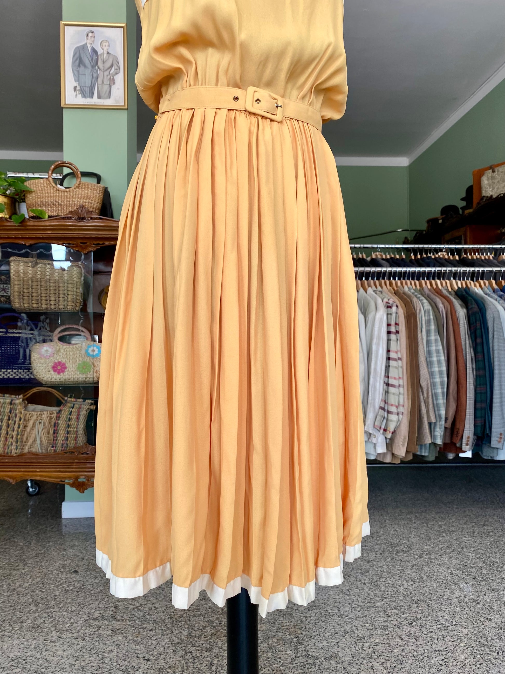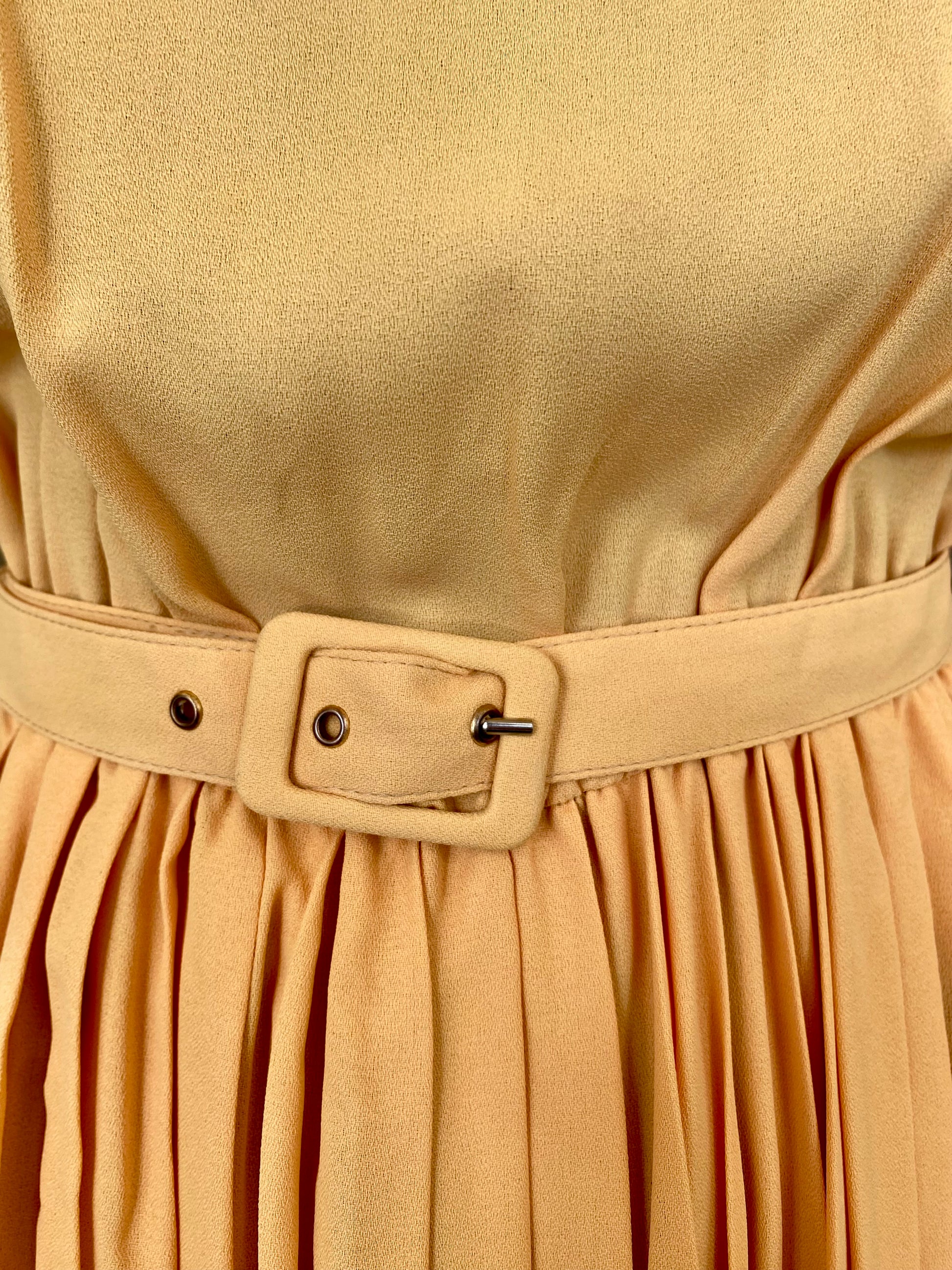 Abito estivo anni '70 in crepe fluido color miele, con eleganti dettagli panna e spalline. La silhouette è valorizzata da una cintura tono su tono incorporata, mentre la gonna plissettata dona movimento e leggerezza. Perfetto per giornate luminose, passeggiate estive o serate rétro con un tocco chic.