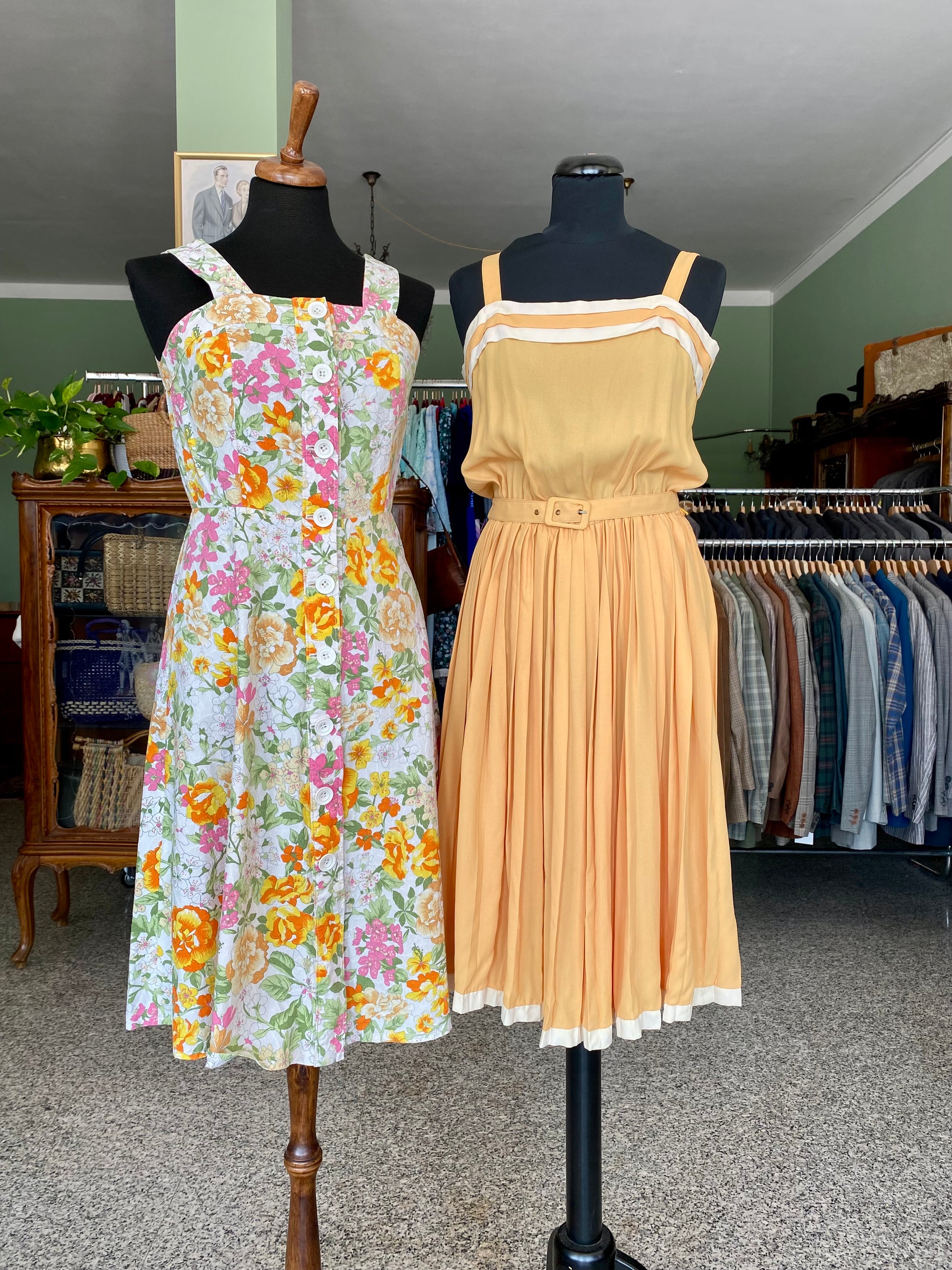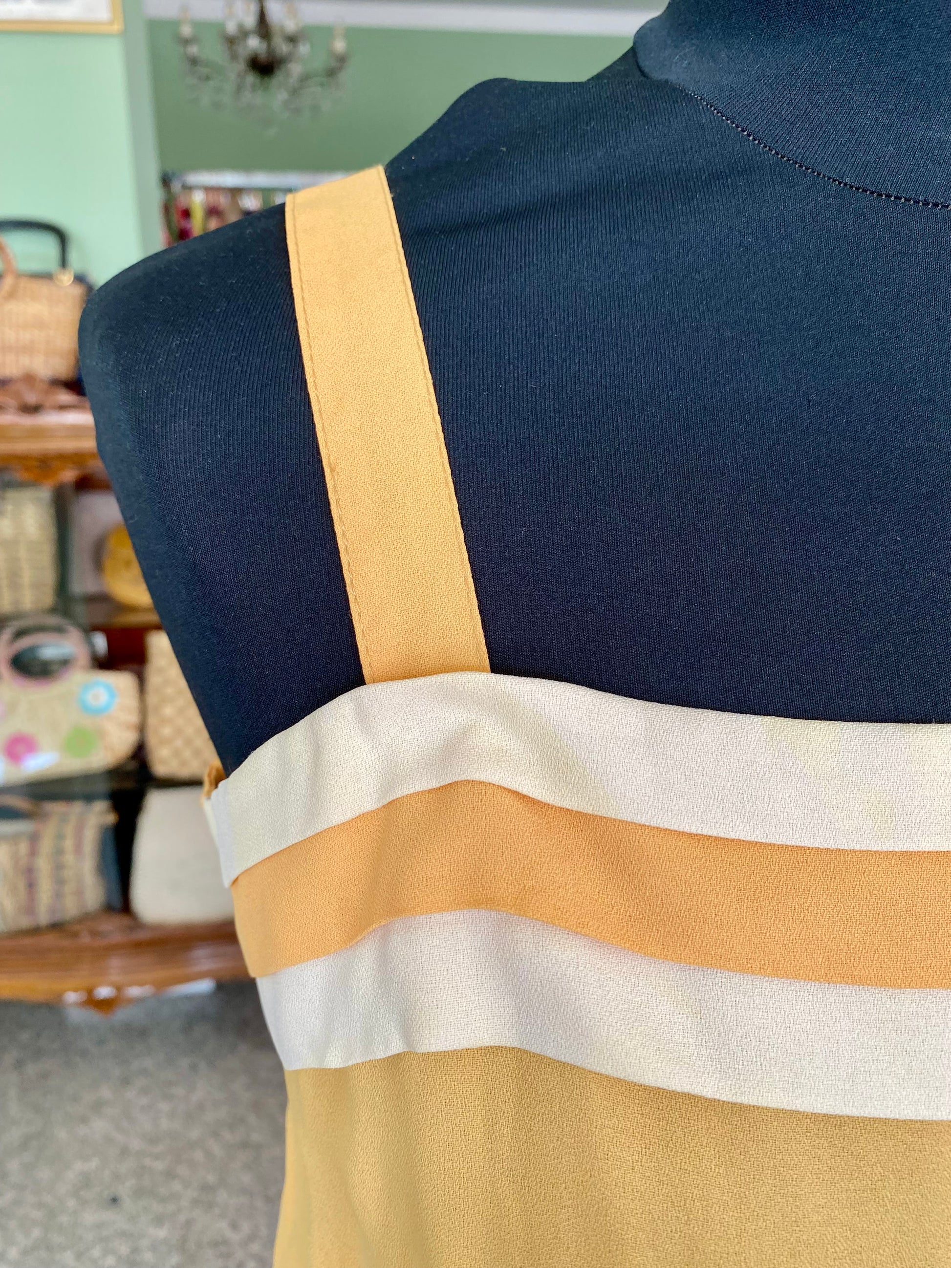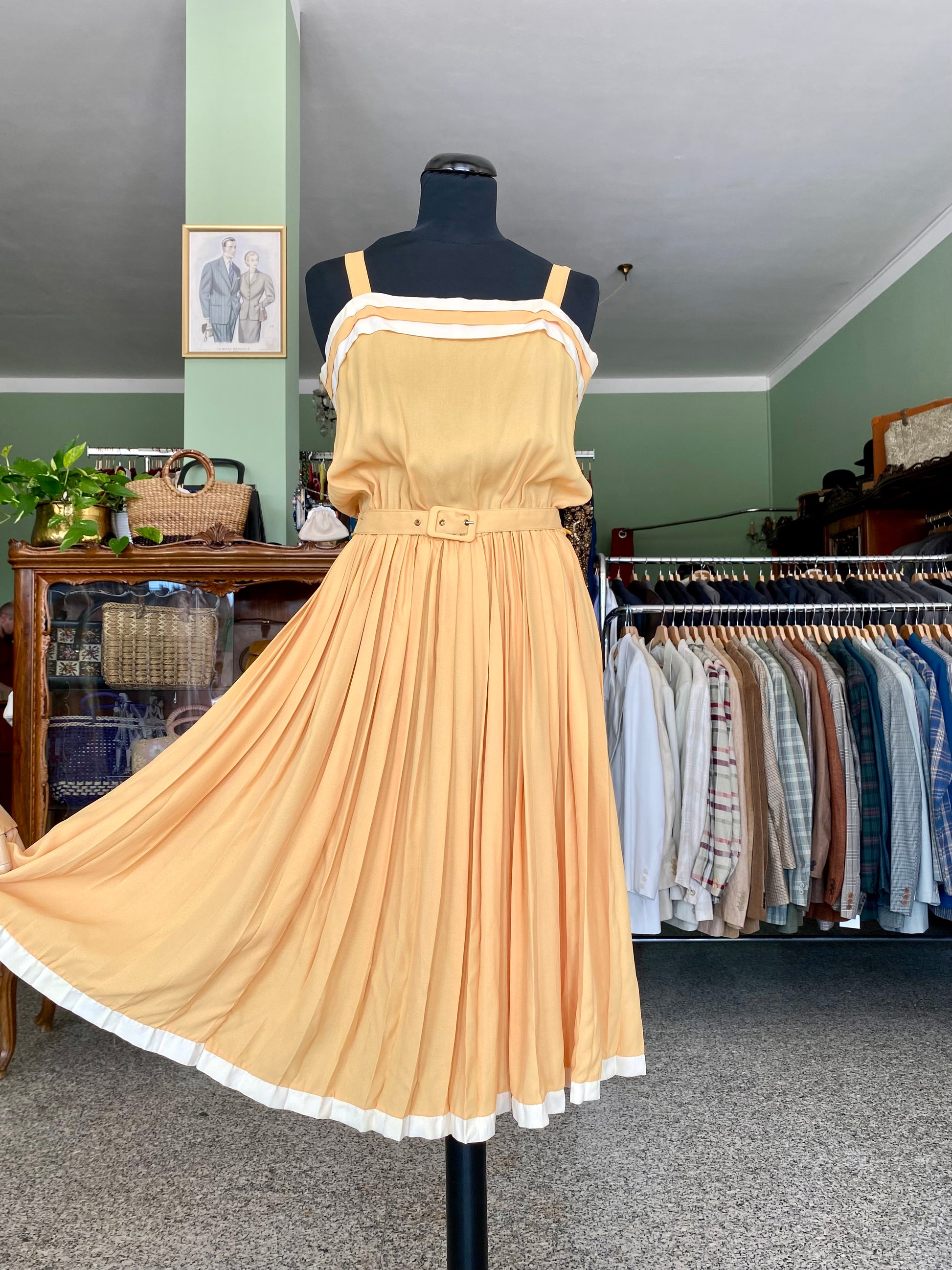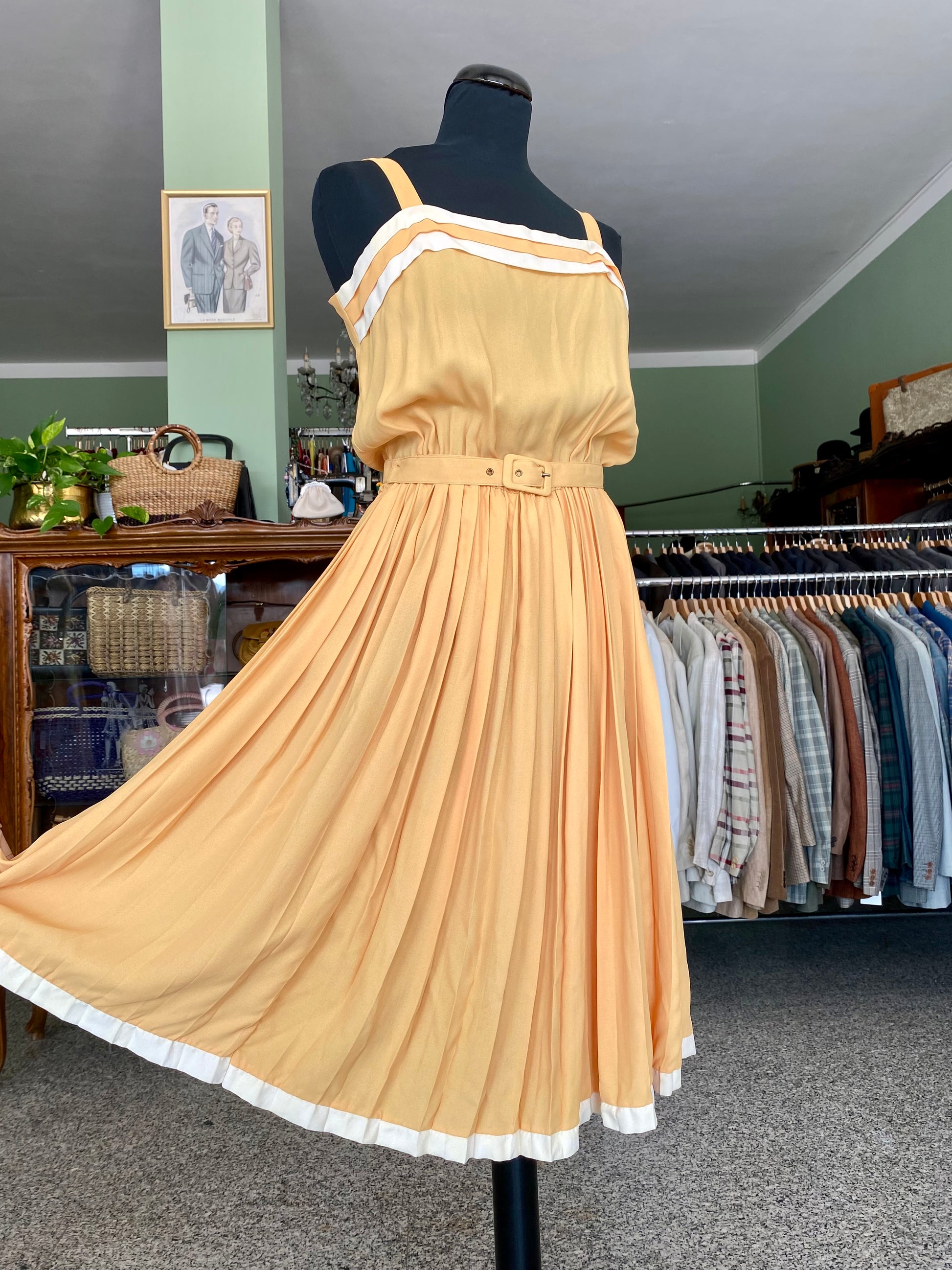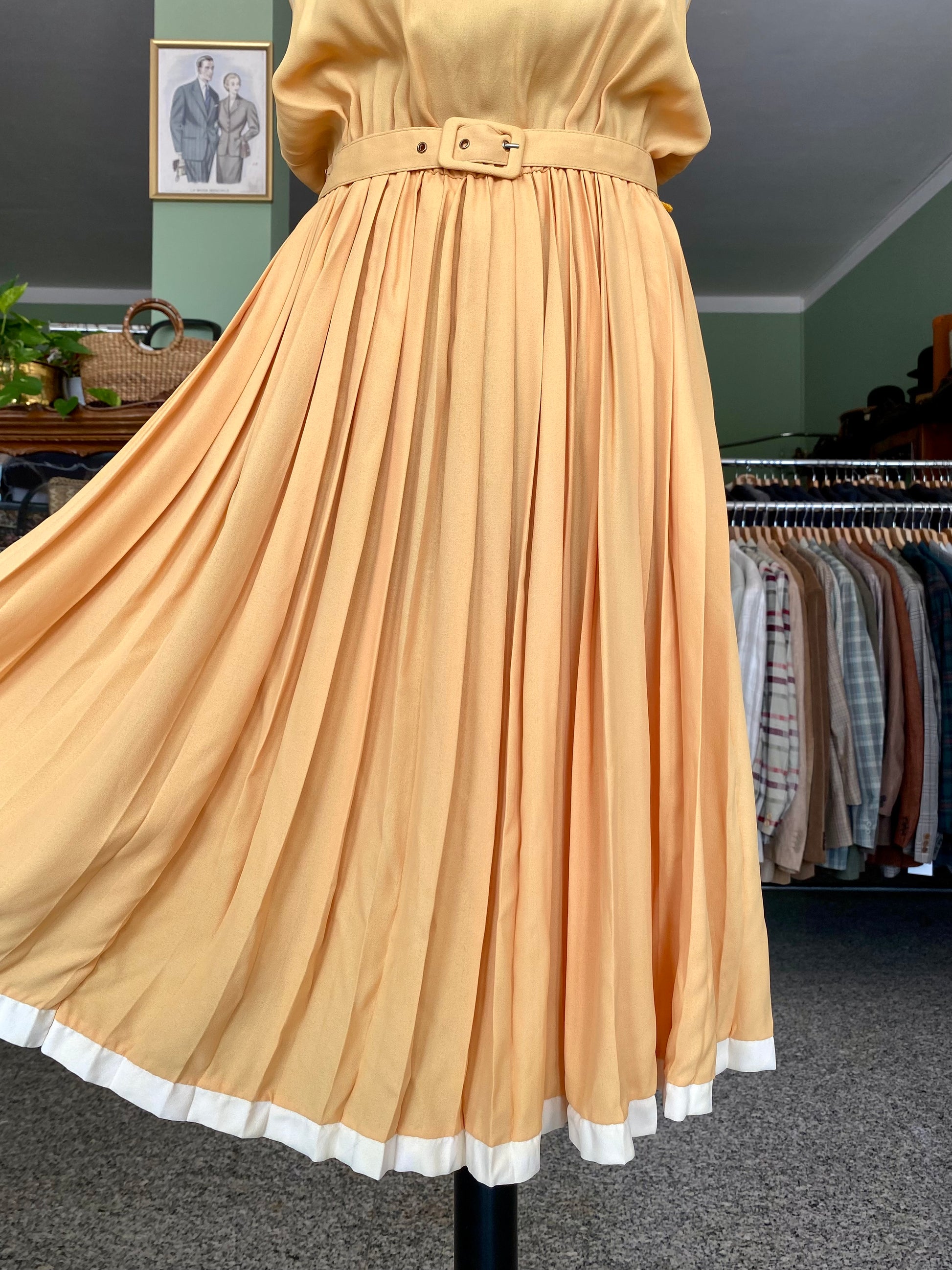 Abito estivo anni '70 in crepe fluido color miele, con eleganti dettagli panna e spalline. La silhouette è valorizzata da una cintura tono su tono incorporata, mentre la gonna plissettata dona movimento e leggerezza. Perfetto per giornate luminose, passeggiate estive o serate rétro con un tocco chic.