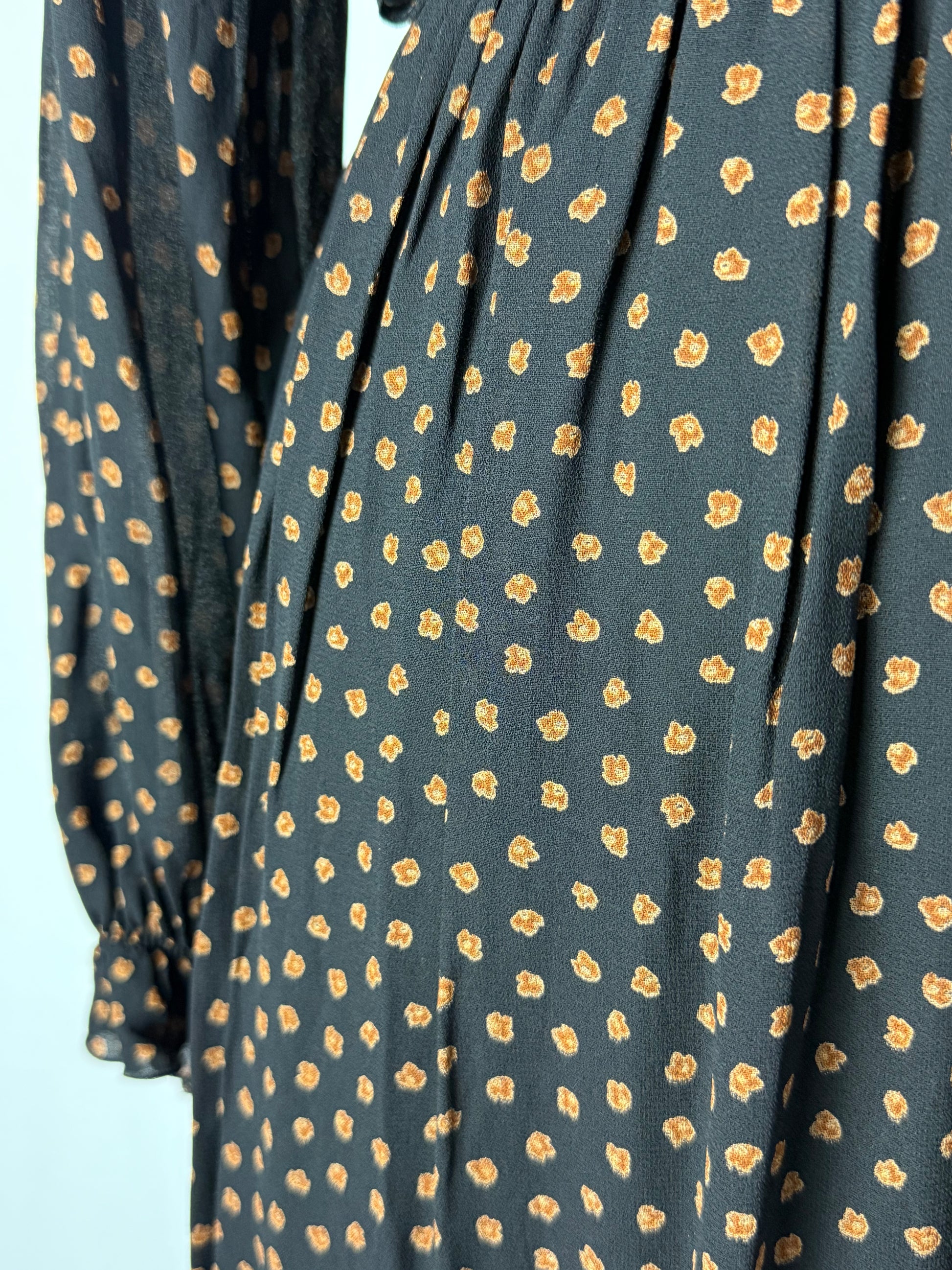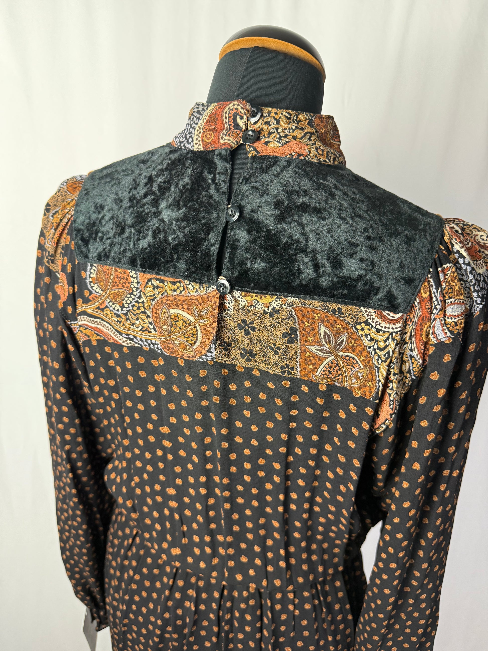 Abito boho-chic fine anni ‘70 in georgette leggera nera con micro pois color ocra. Corpino con inserto a V in velluto scuro e pannelli in stampa paisley nei toni della terra. Collo alto, maniche lunghe con polsino. Gonna arricciata in vita, è presente l’elastico.