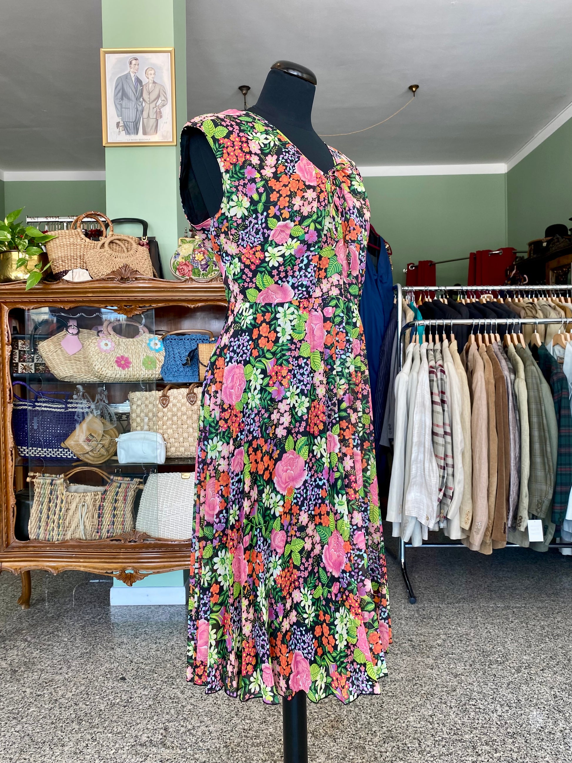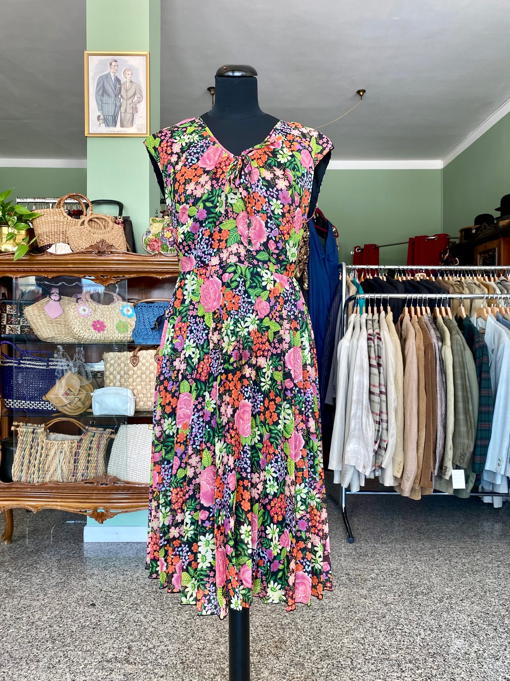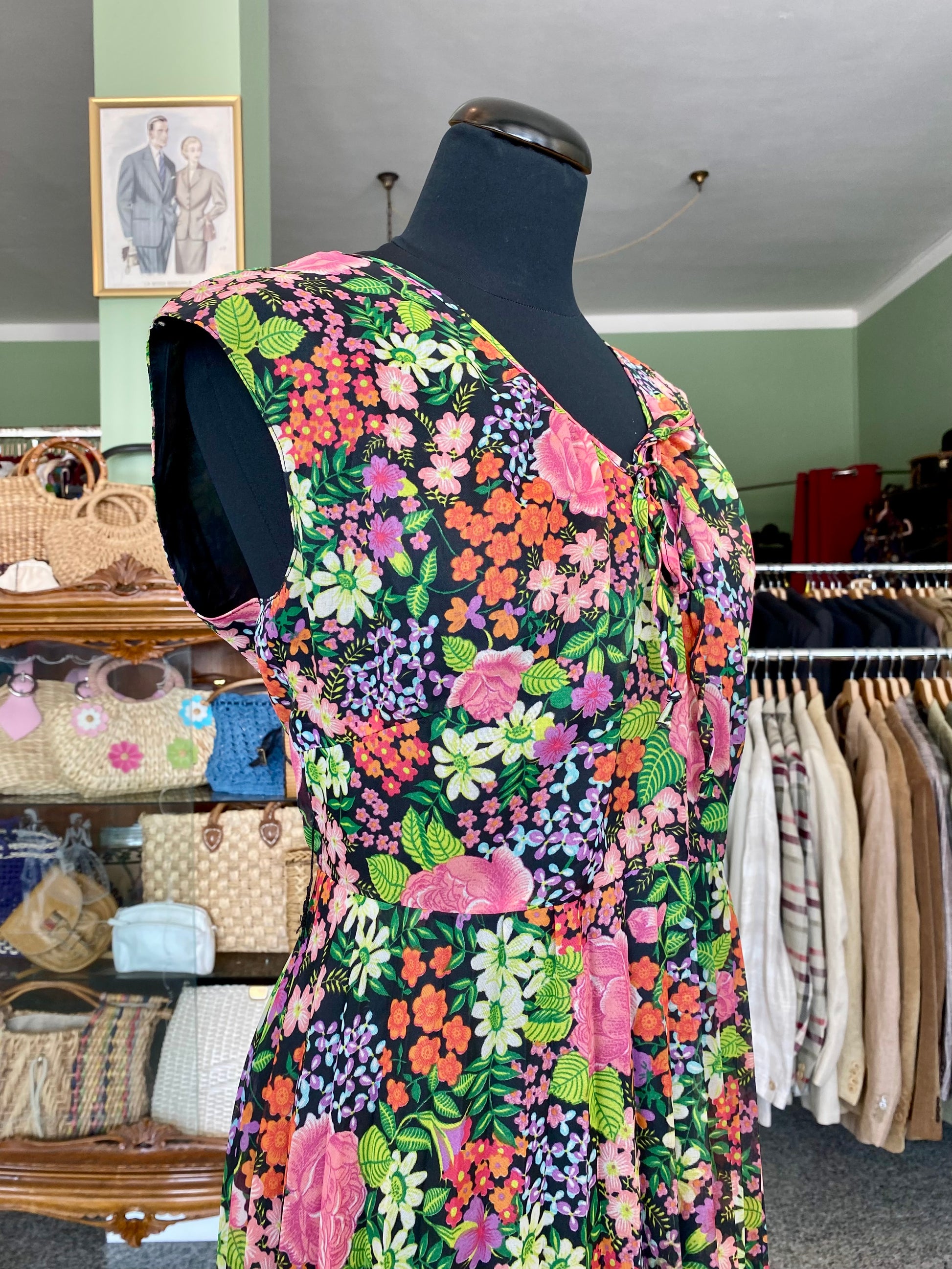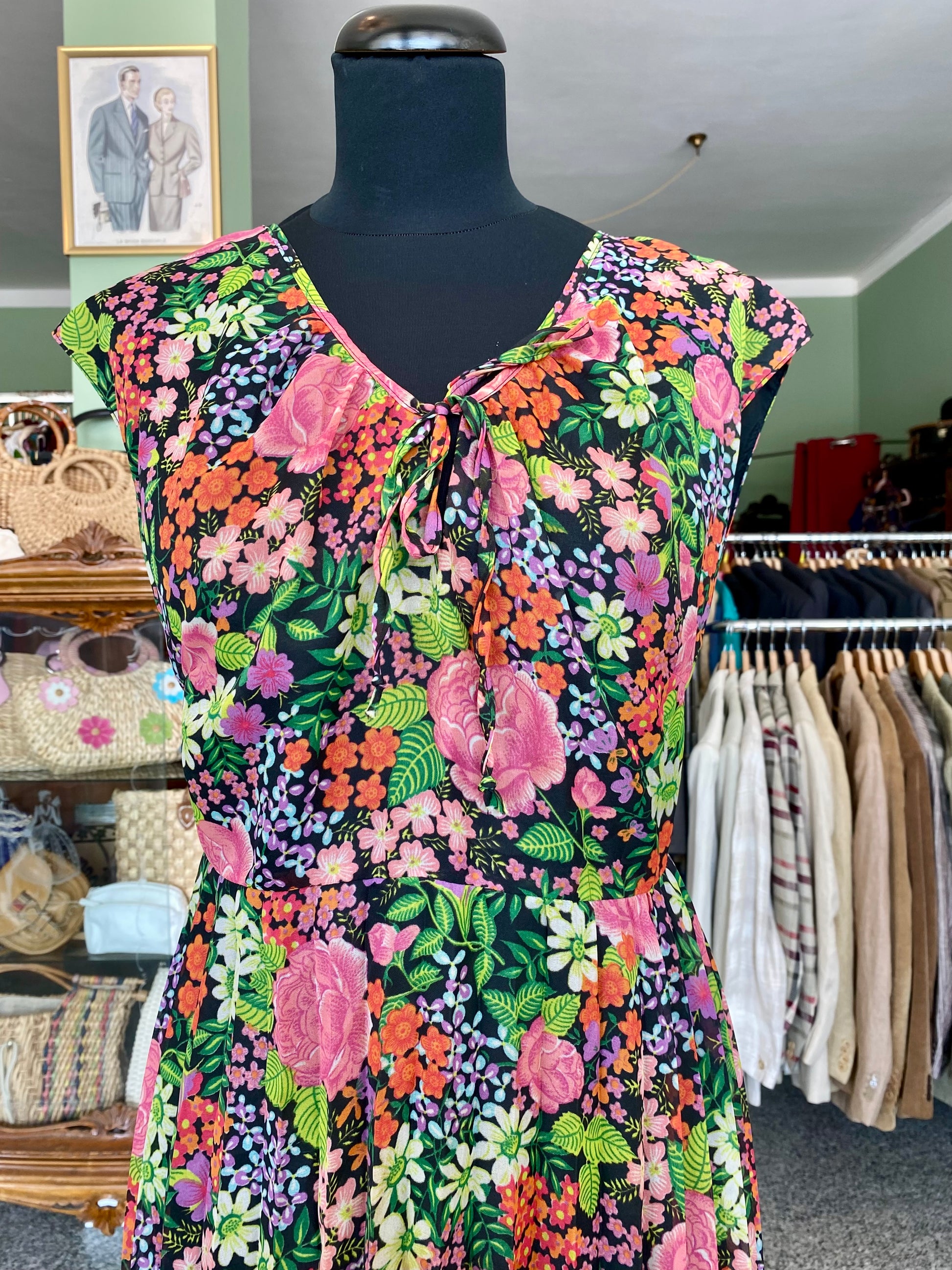 Un'esplosione di colori e fiori caratterizza questo meraviglioso abito anni '70, con fantasia "prato fiorito" su sfondo nero e dettagli vivaci nei toni del rosa, arancio, verde e lilla. Il taglio morbido e femminile, con scollo a V e delicato fiocchetto, valorizza la silhouette senza costrizioni, mentre la gonna plissettata aggiunge movimento e leggerezza al capo. Perfetto per chi desidera portare un tocco di allegria e autenticità vintage nel quotidiano o in un’occasione speciale.