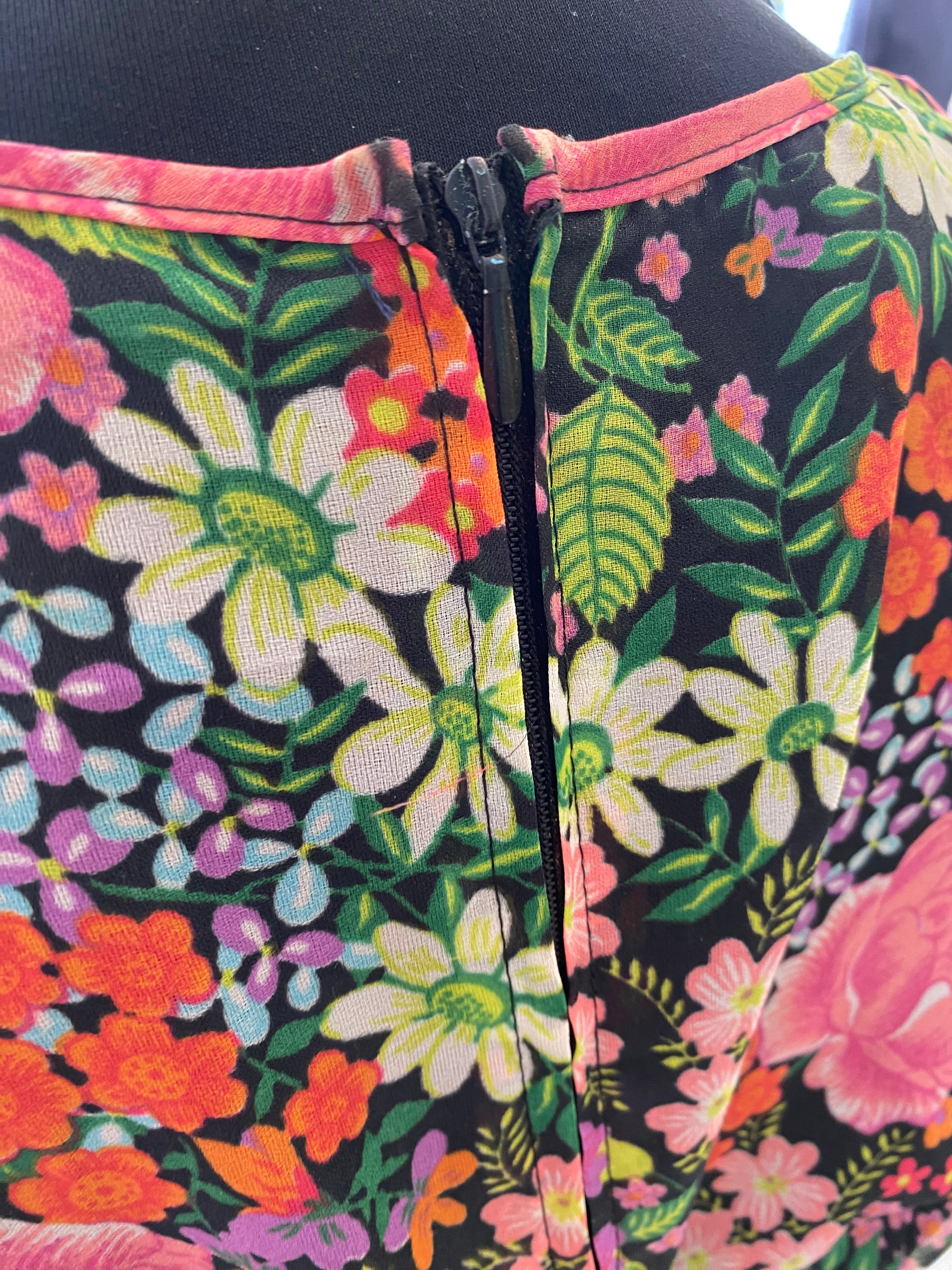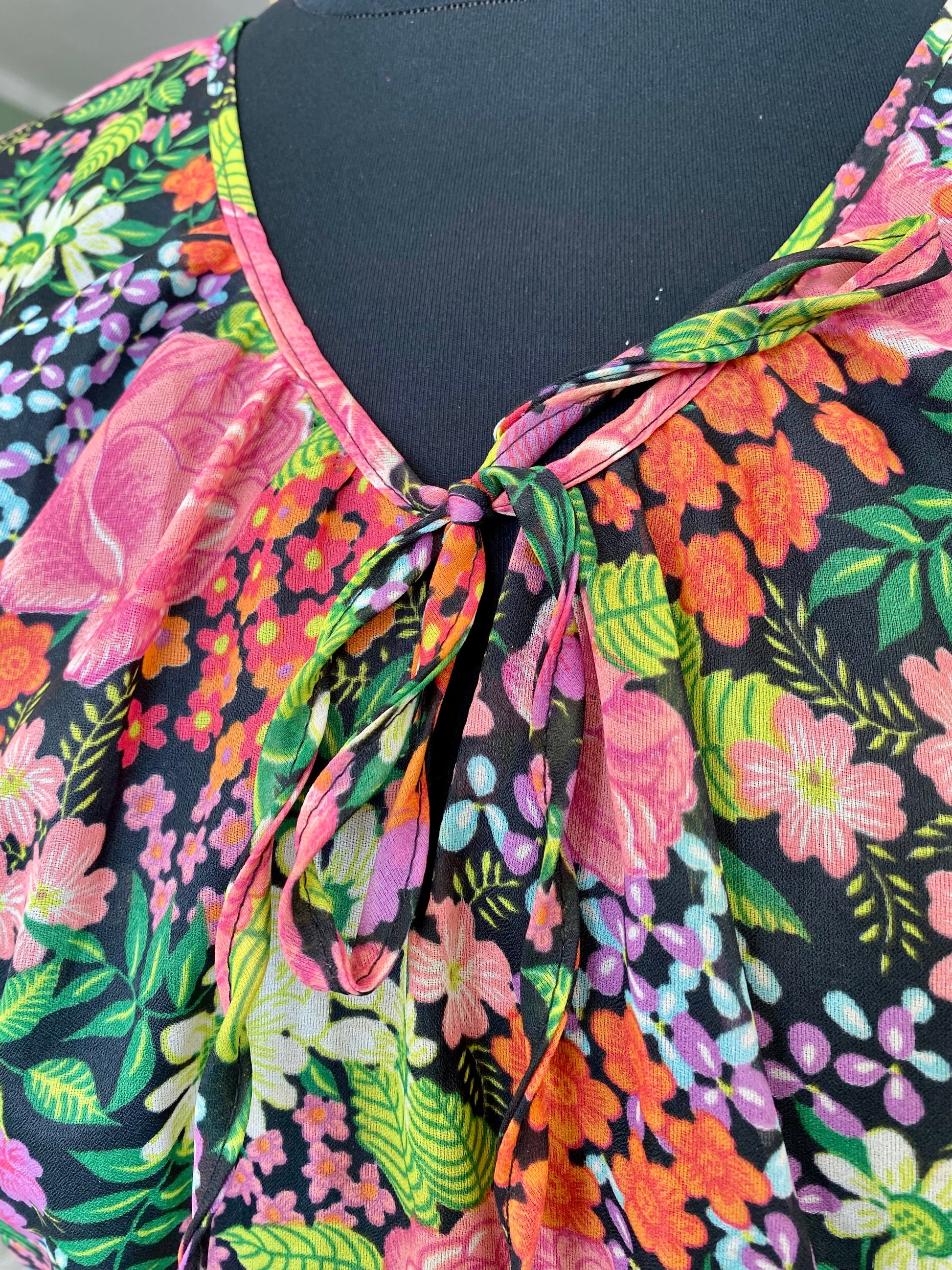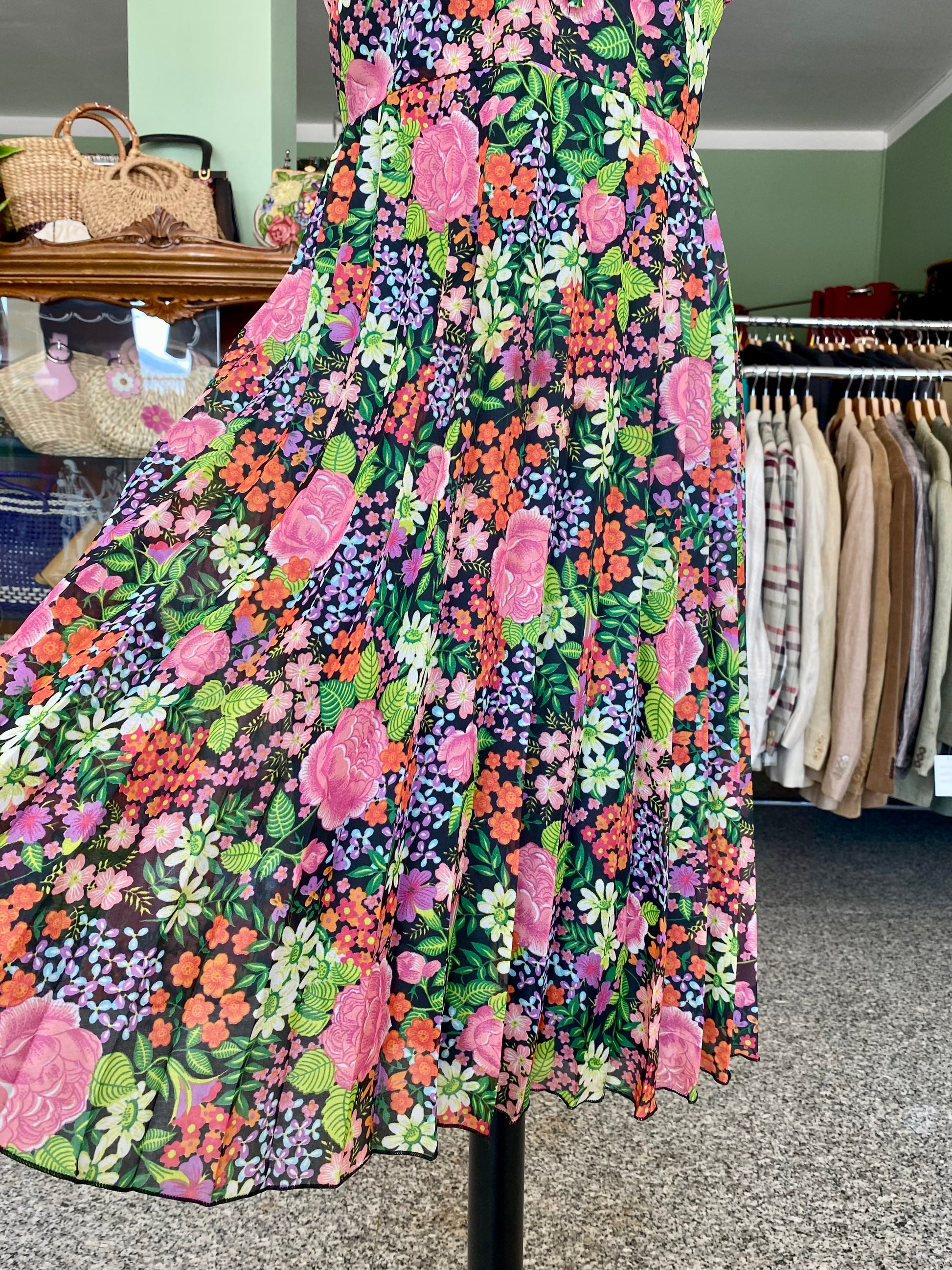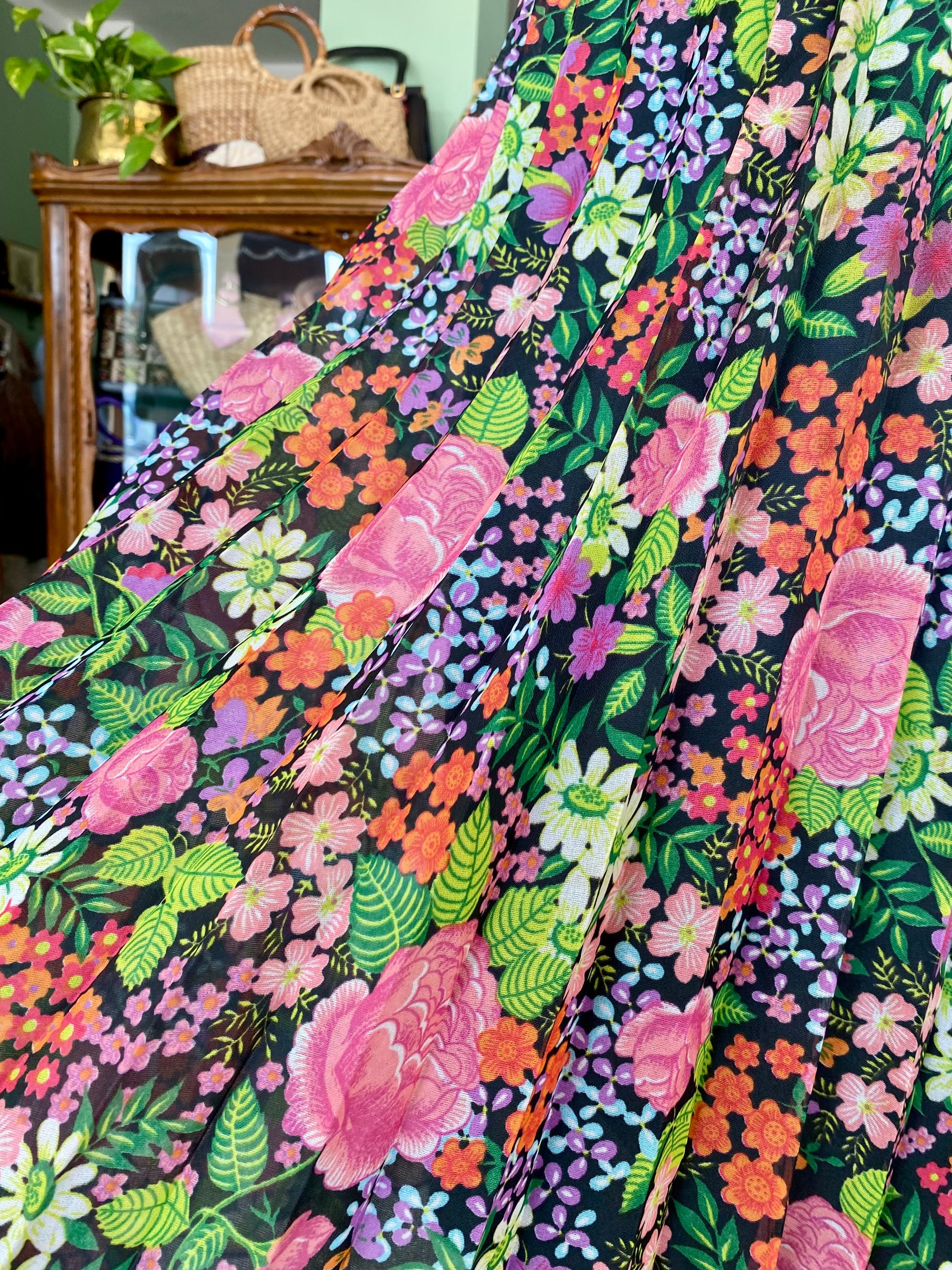 Un'esplosione di colori e fiori caratterizza questo meraviglioso abito anni '70, con fantasia "prato fiorito" su sfondo nero e dettagli vivaci nei toni del rosa, arancio, verde e lilla. Il taglio morbido e femminile, con scollo a V e delicato fiocchetto, valorizza la silhouette senza costrizioni, mentre la gonna plissettata aggiunge movimento e leggerezza al capo. Perfetto per chi desidera portare un tocco di allegria e autenticità vintage nel quotidiano o in un’occasione speciale.