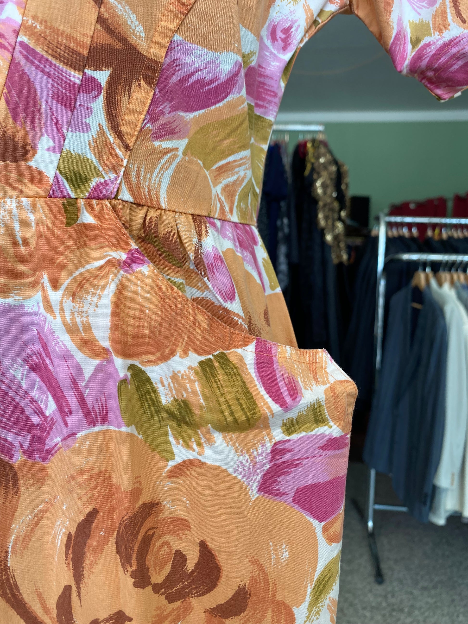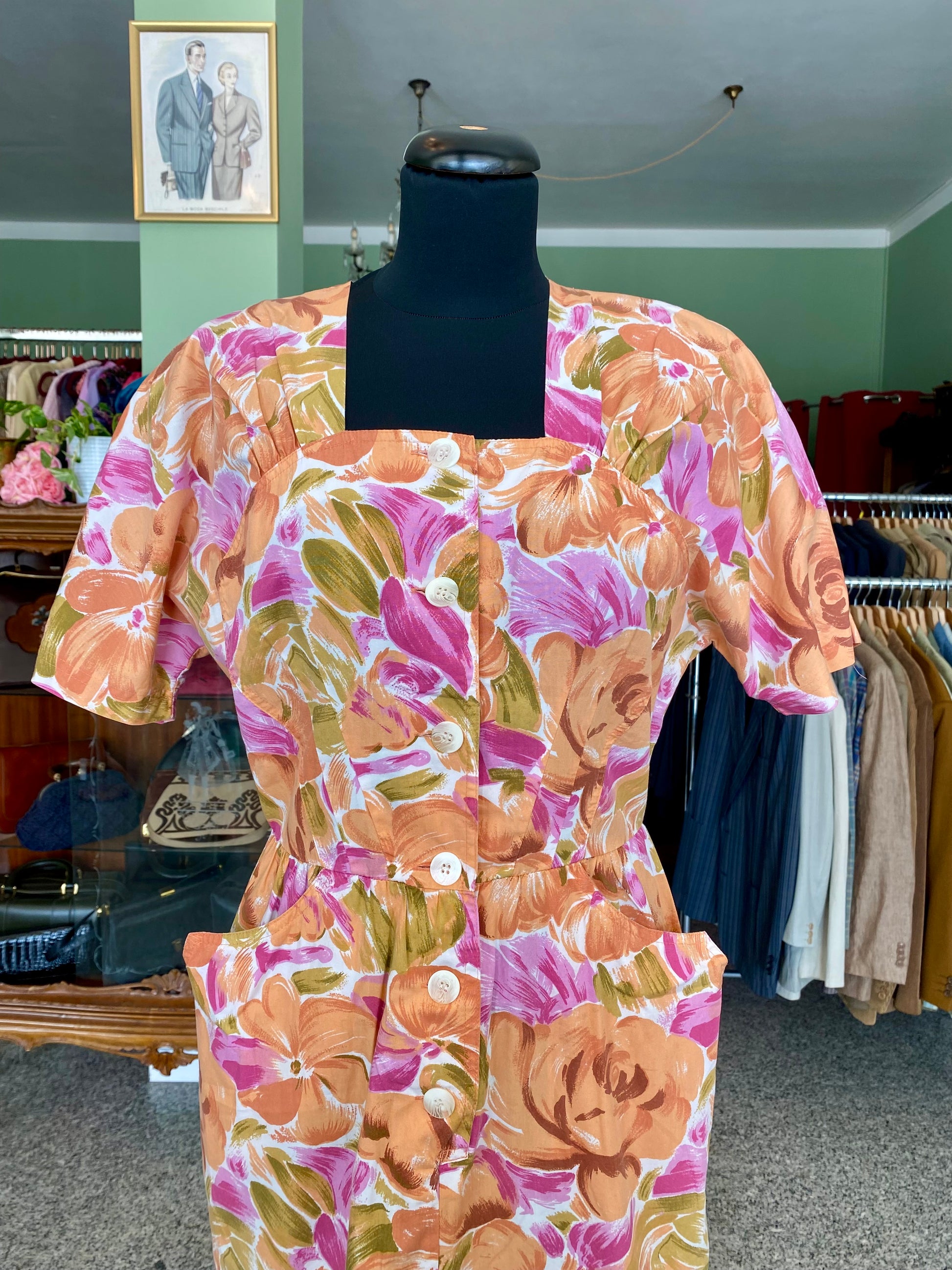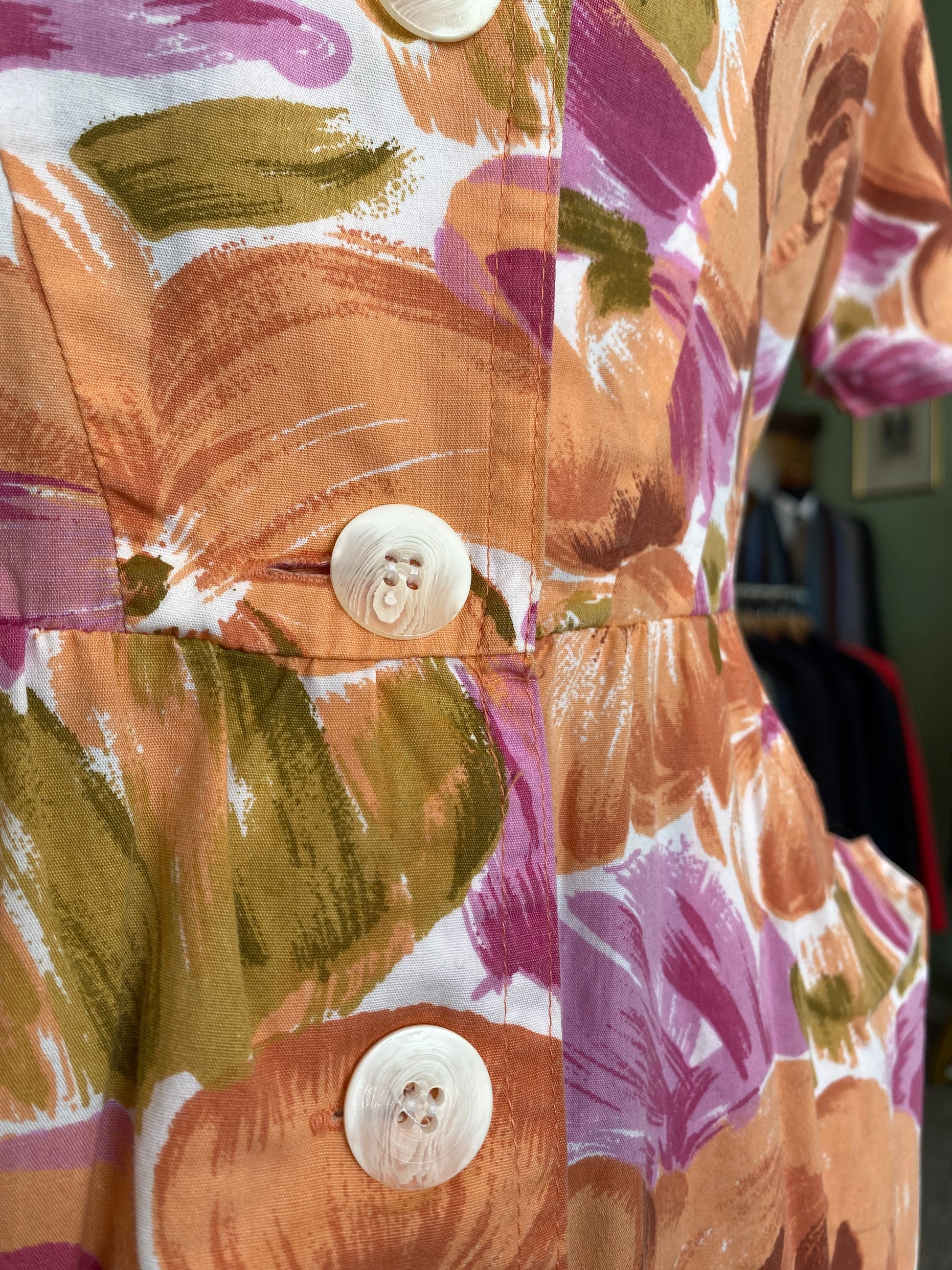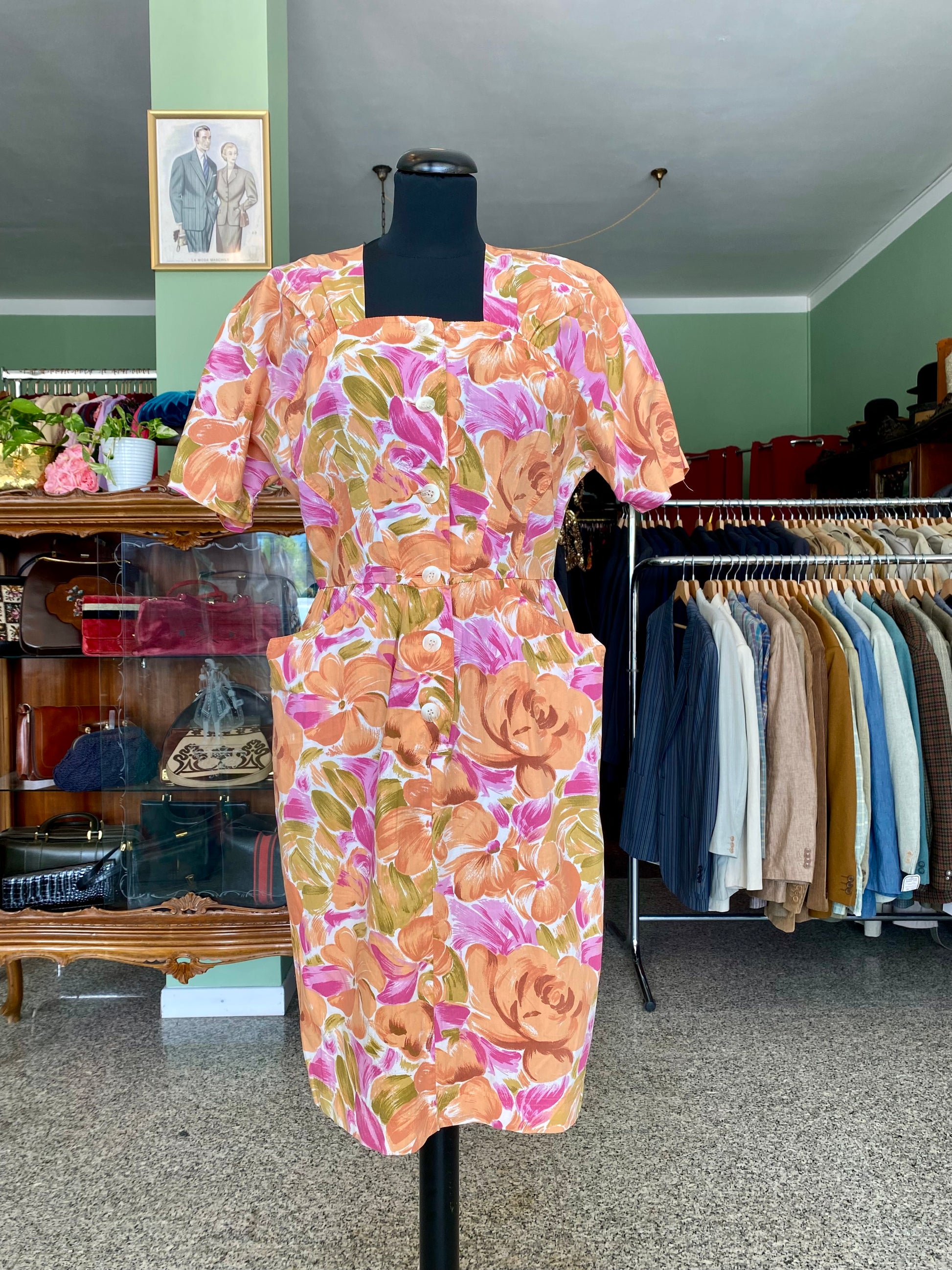 Abito anni ’80 in 100% cotone, con maxi stampa floreale nei toni del pesca, fucsia e verde oliva su fondo bianco. Linea dritta con scollo quadrato, manica corta ampia e grandi tasche frontali. Bottoni a contrasto e taglio in vita elasticizzato lo rendono comodo e perfetto per le giornate estive all’insegna del colore e della praticità.