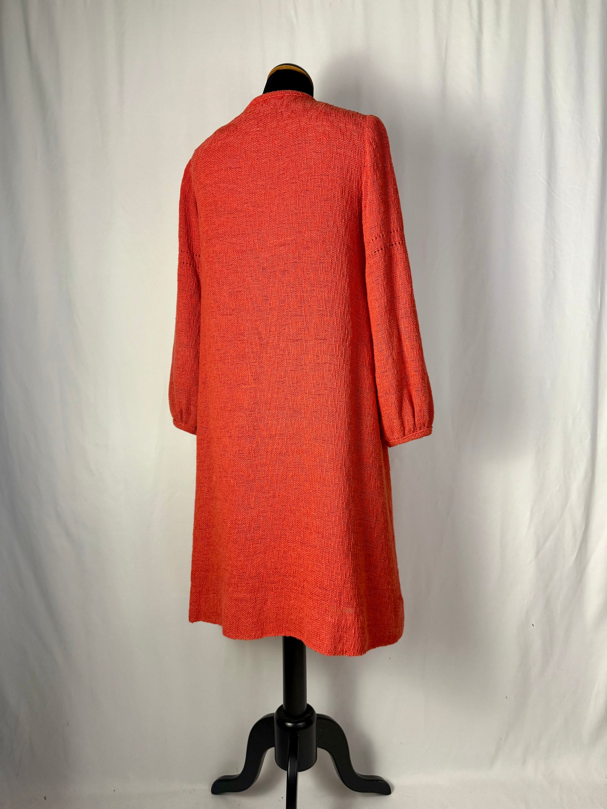 Abito sartoriale anni ’60 in maglia di cotone e seta dal filato sostenuto, color corallo 🪸. La linea svasata e il taglio pulito sono impreziositi dai bottoni madreperlati sul davanti e dalle maniche lunghe leggermente a sbuffo. Un capo elegante nella sua semplicità, emblema della raffinatezza minimalista tipica del tempo, testimonianza di un alto artigianato.