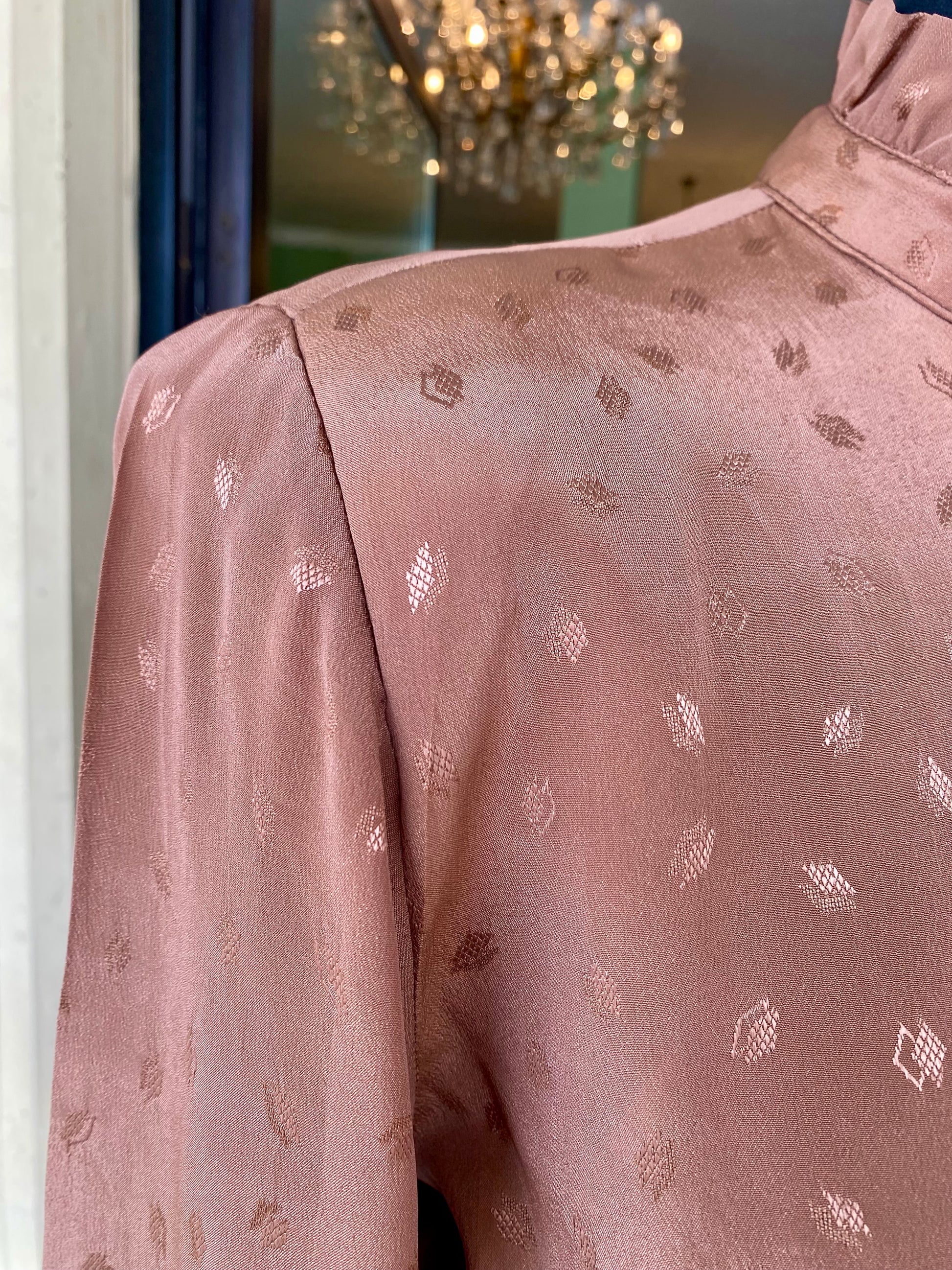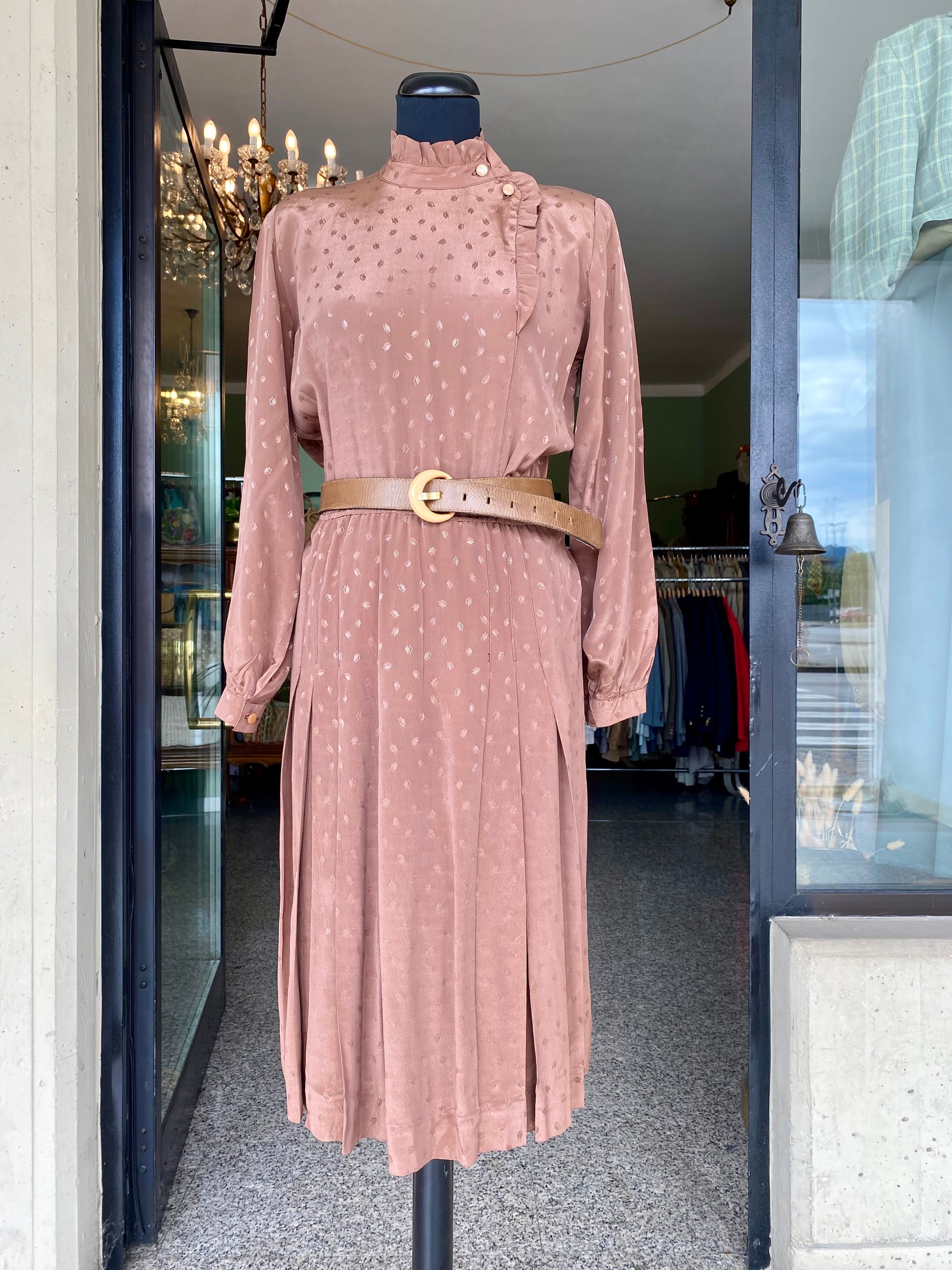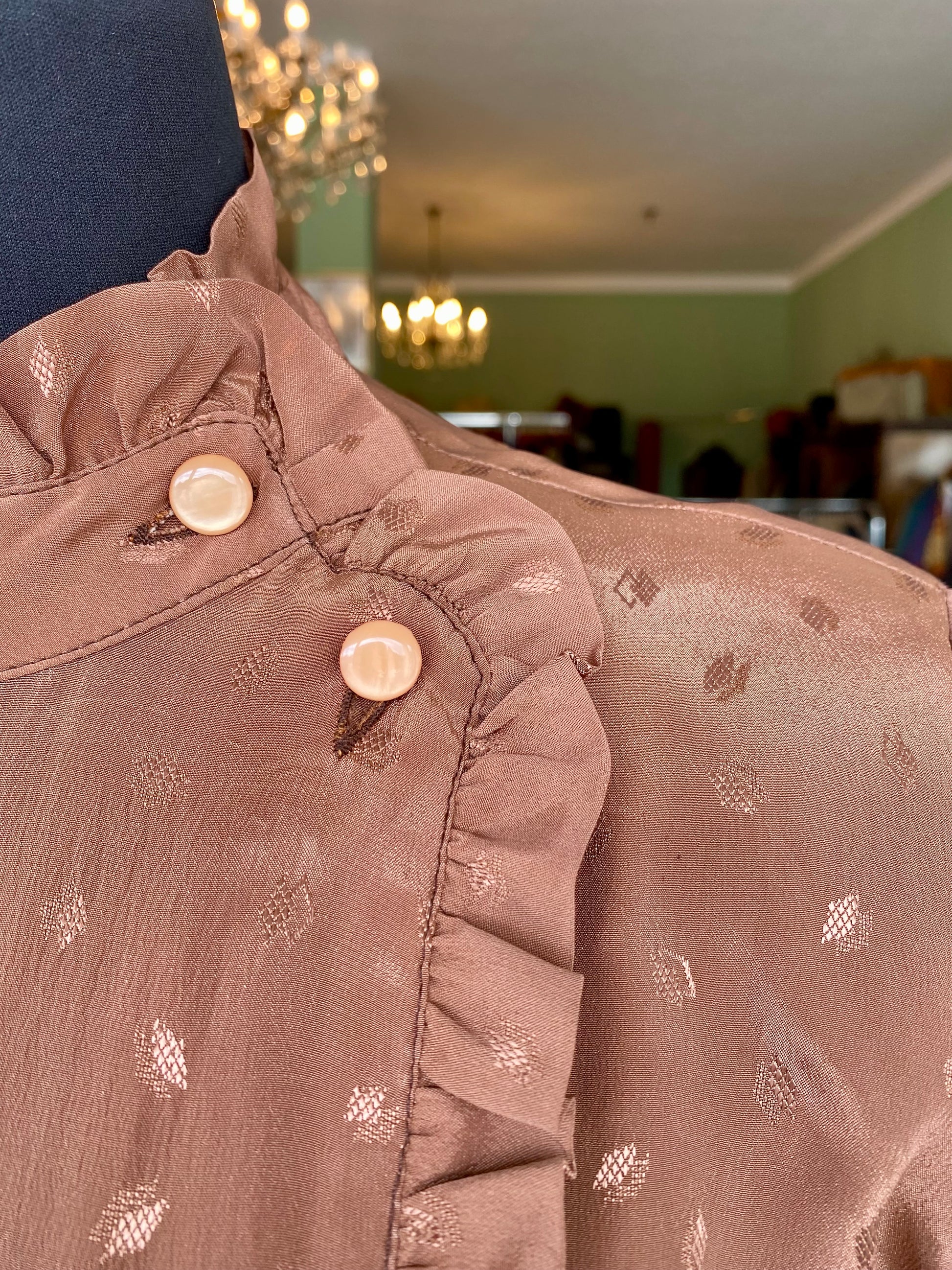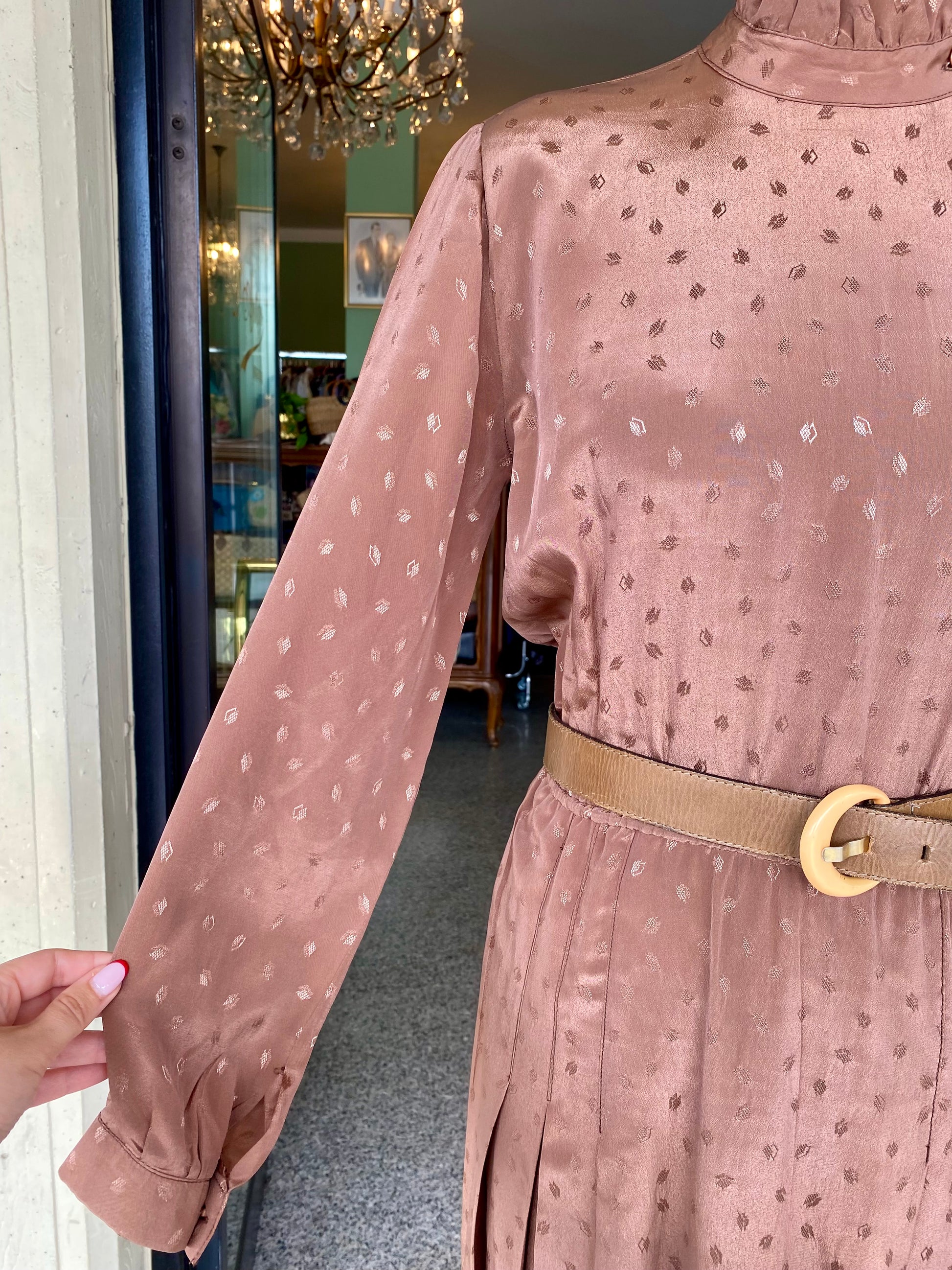 Raffinato abito vintage anni ‘70/‘80 in pura seta color cacao con delicato motivo jacquard tono su tono. Il taglio fluido, impreziosito da pieghe sul fondo e da un elegante collo alto con ruches, crea un’allure femminile e d’altri tempi. I bottoni perlati su spalla e polsini aggiungono un tocco romantico e curato nei dettagli.
