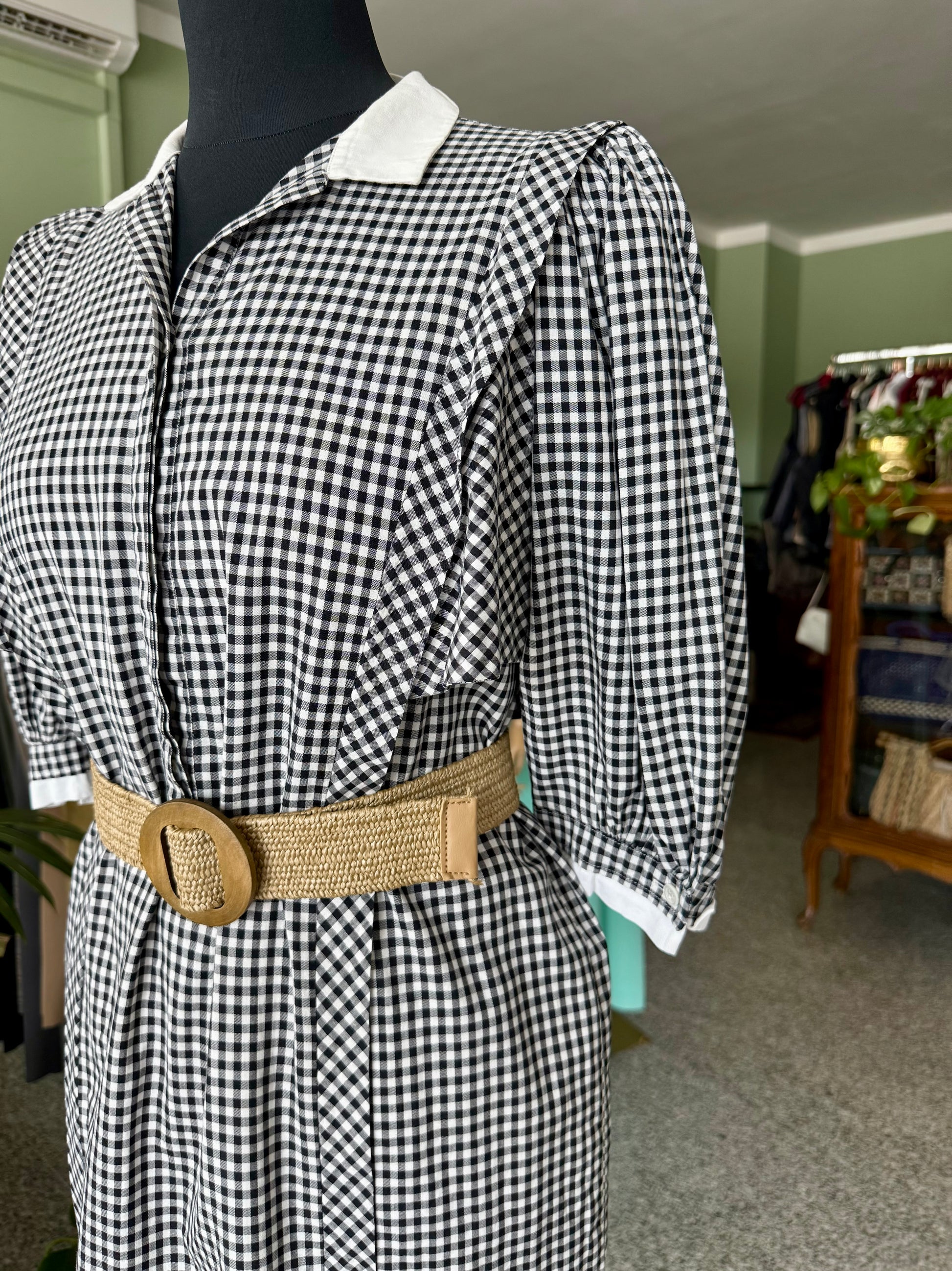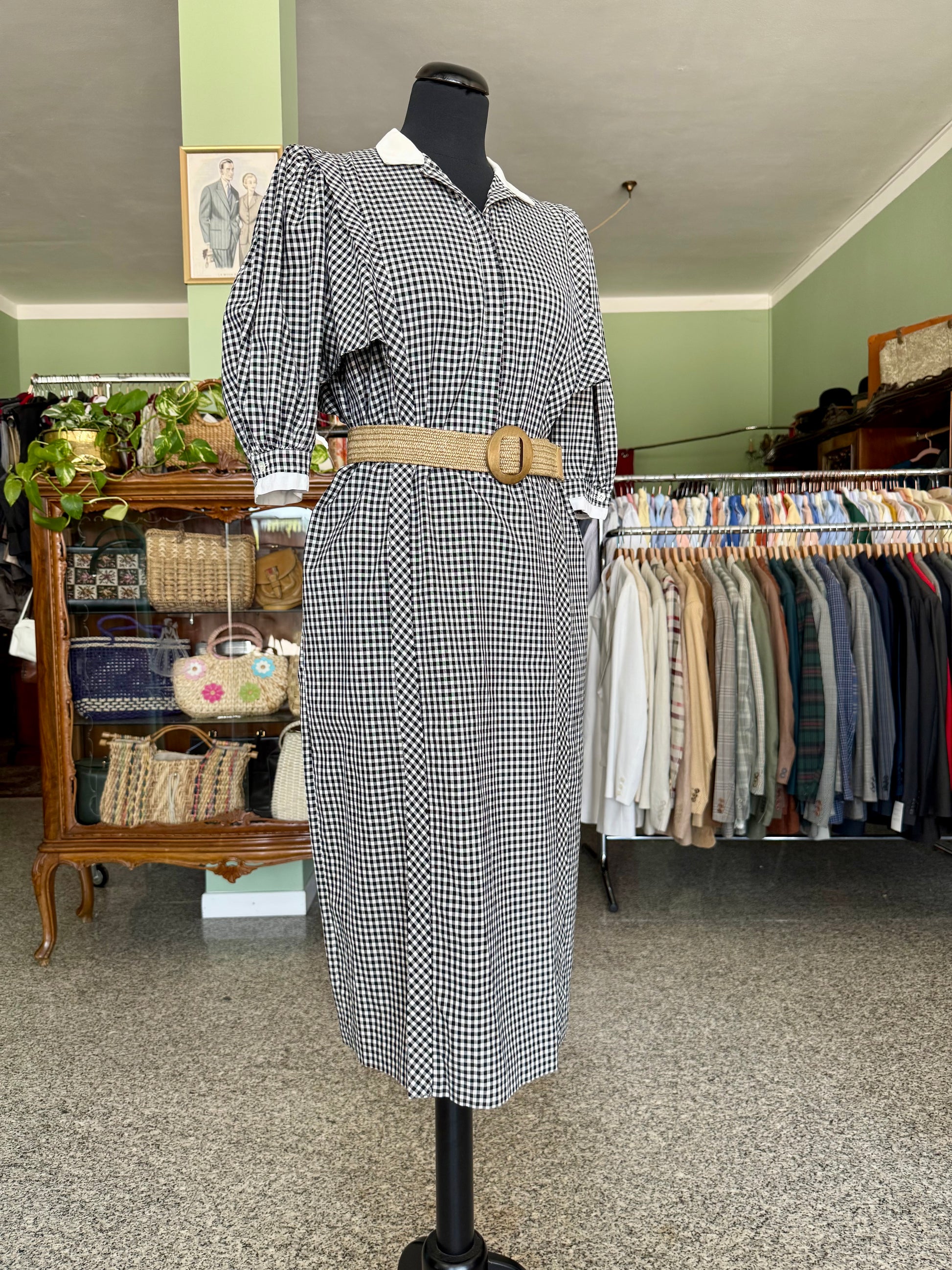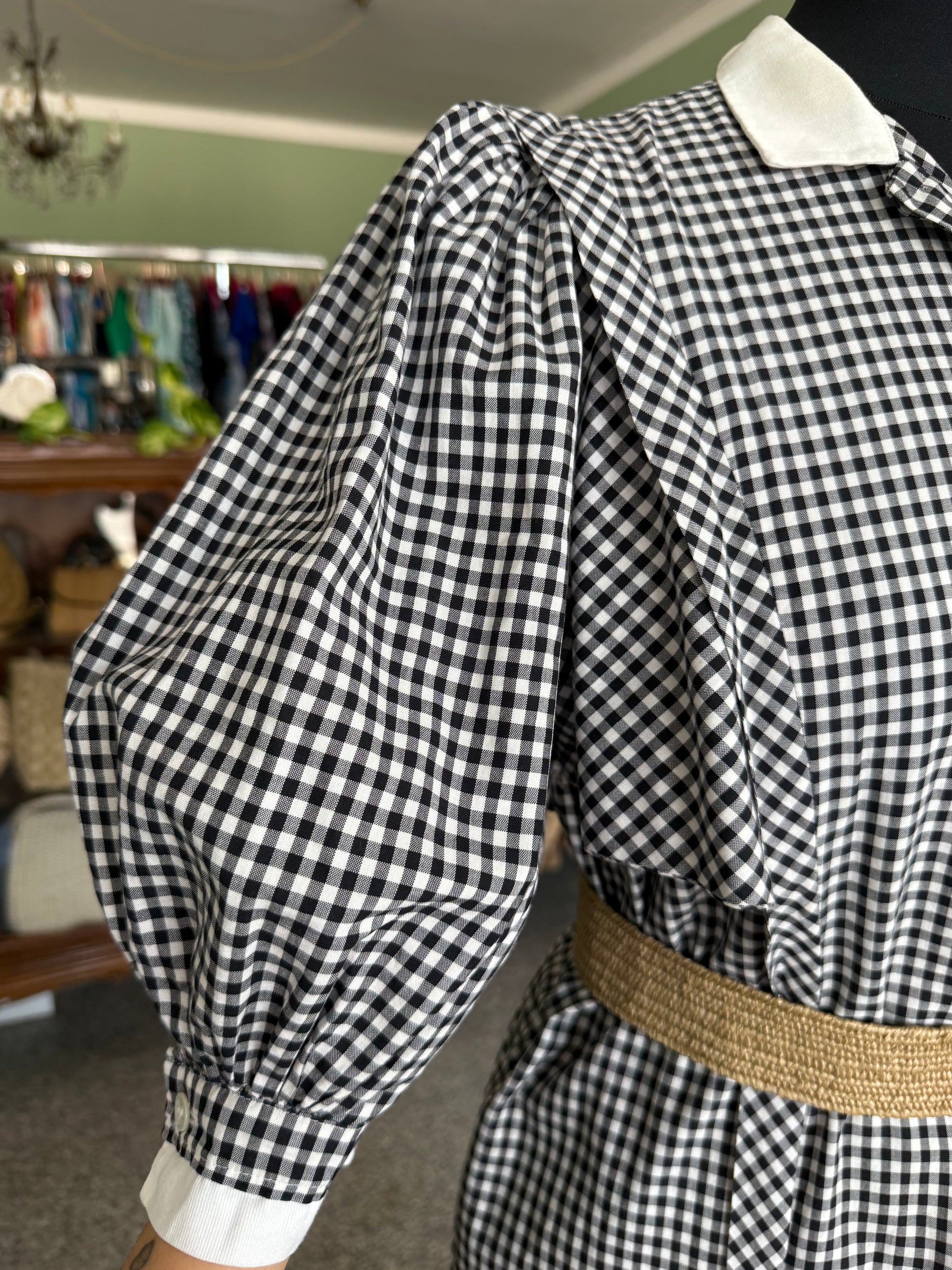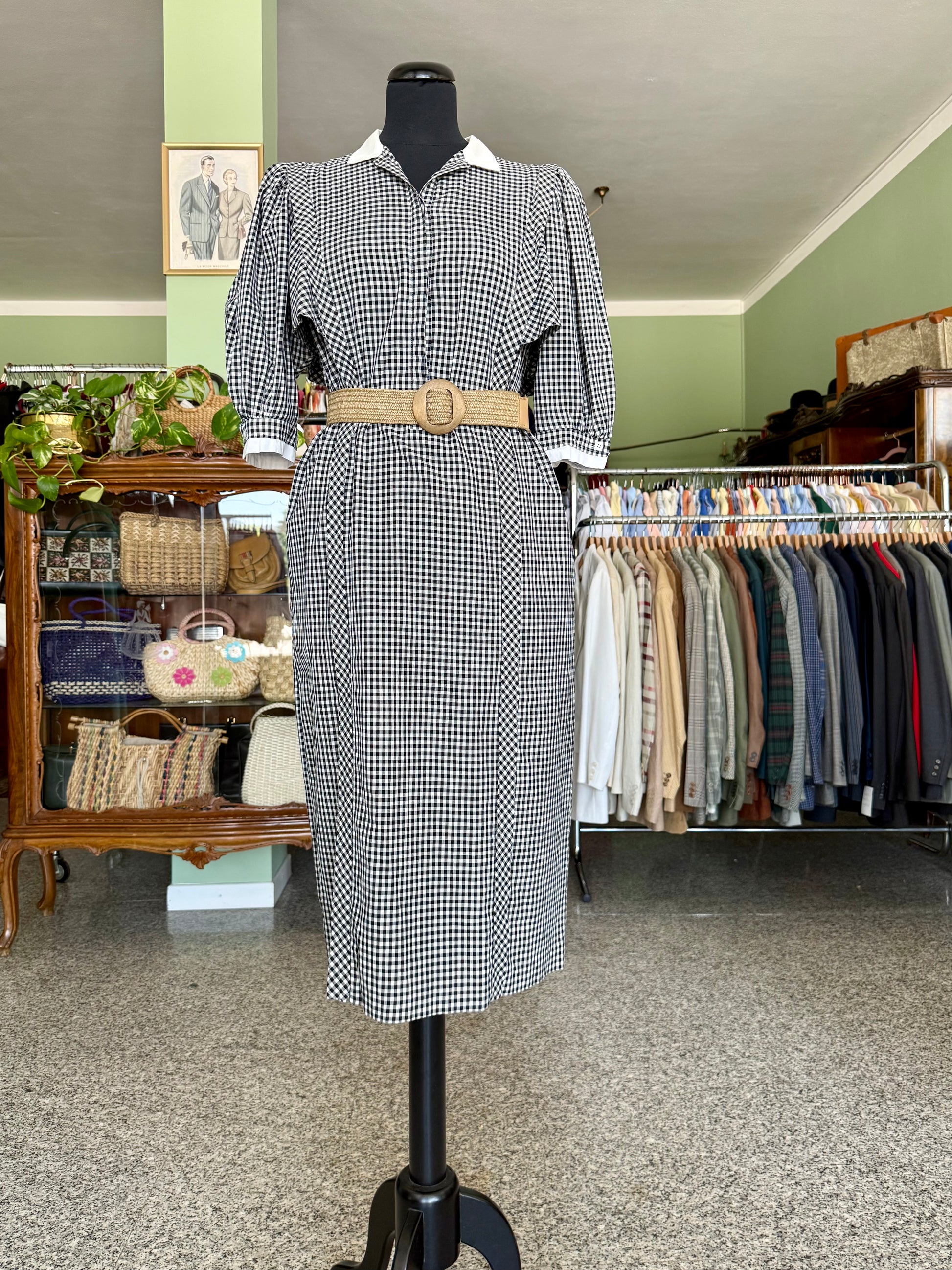 Abito anni ‘80 classico e senza tempo, in 100% cotone con fantasia vichy sui toni del bianco e del nero. Il pezzo forte sono le maniche a palloncino, romantiche e vaporose che rendono il capo un vero pezzo unico e ricercato.