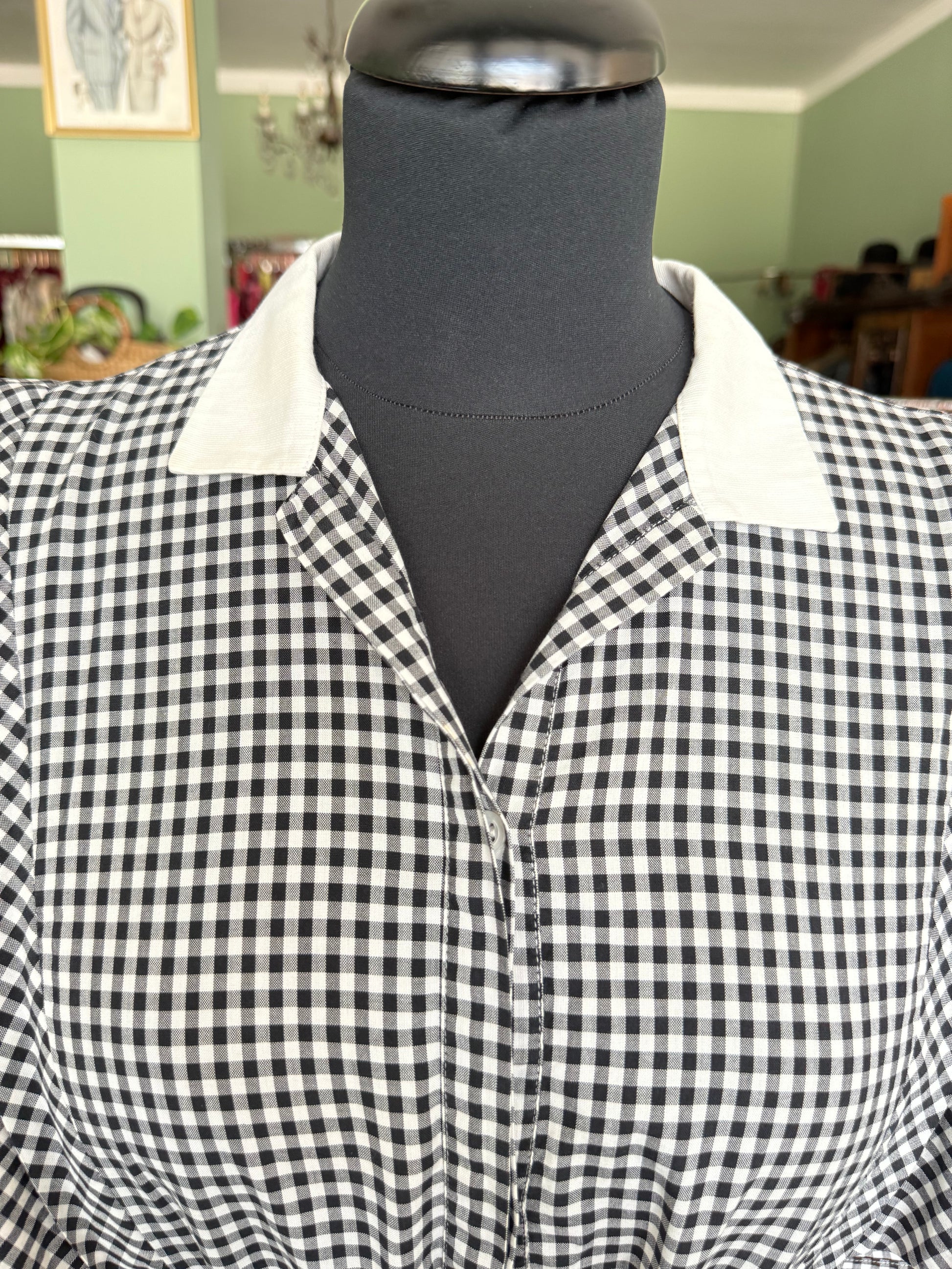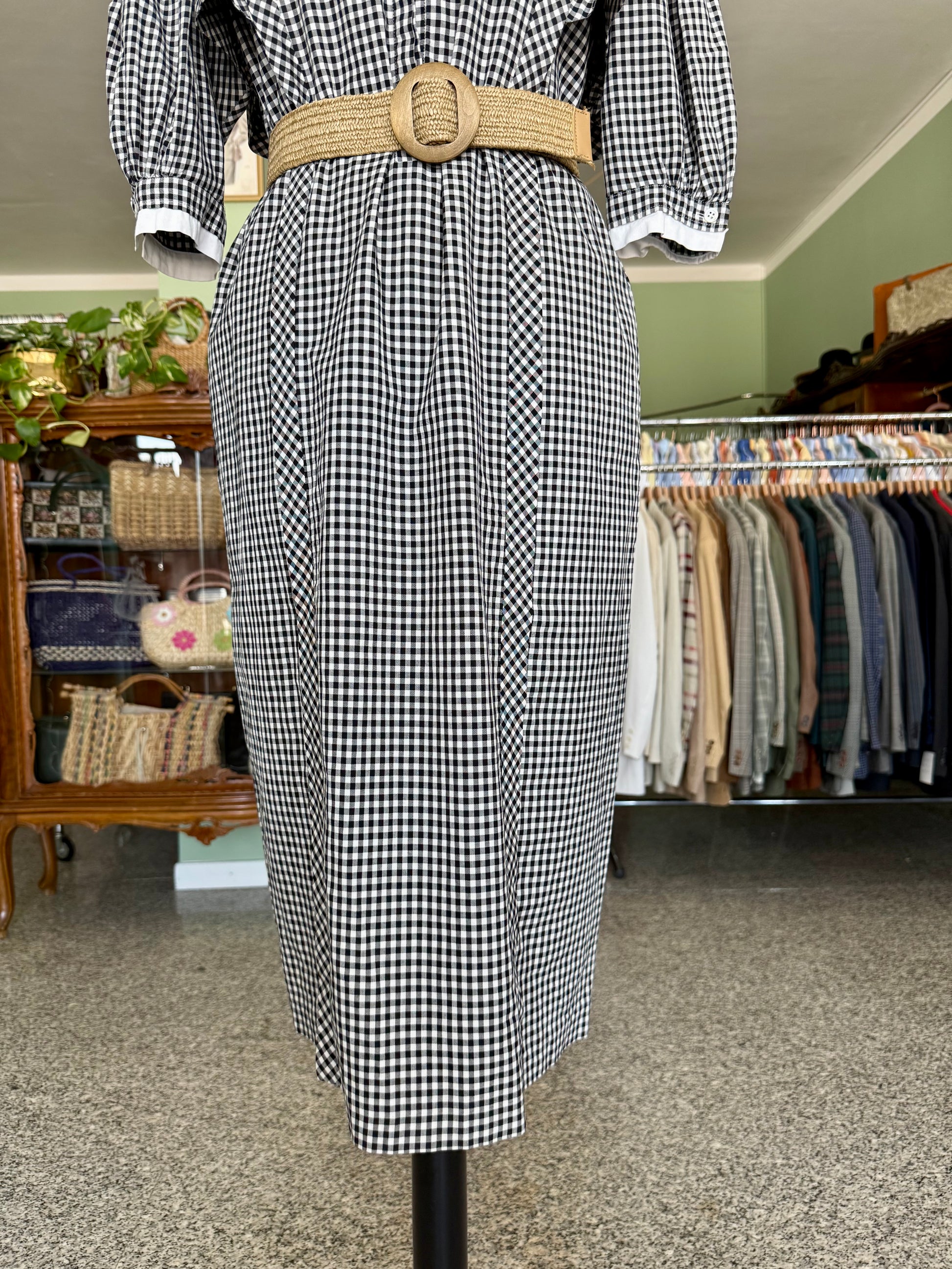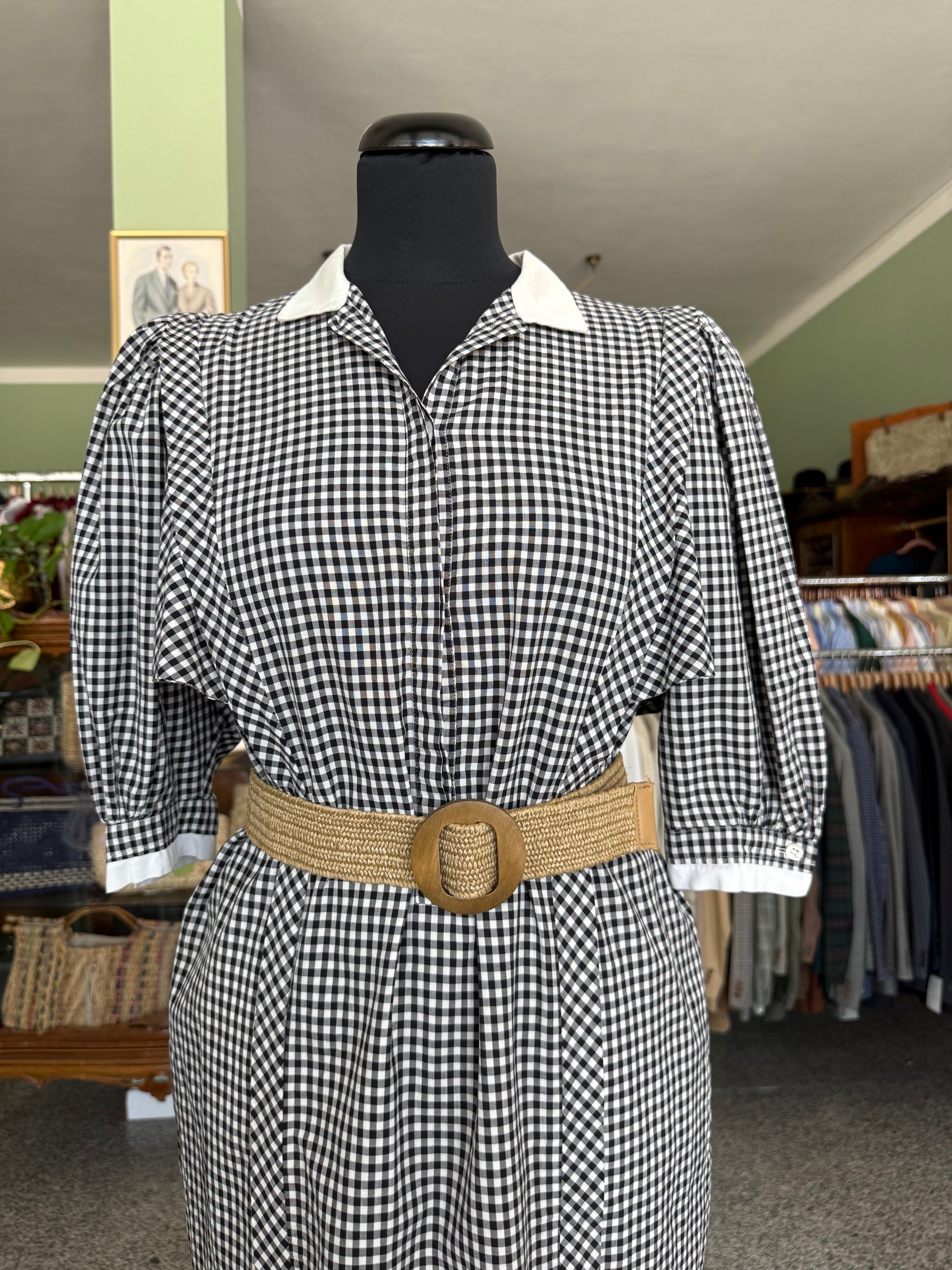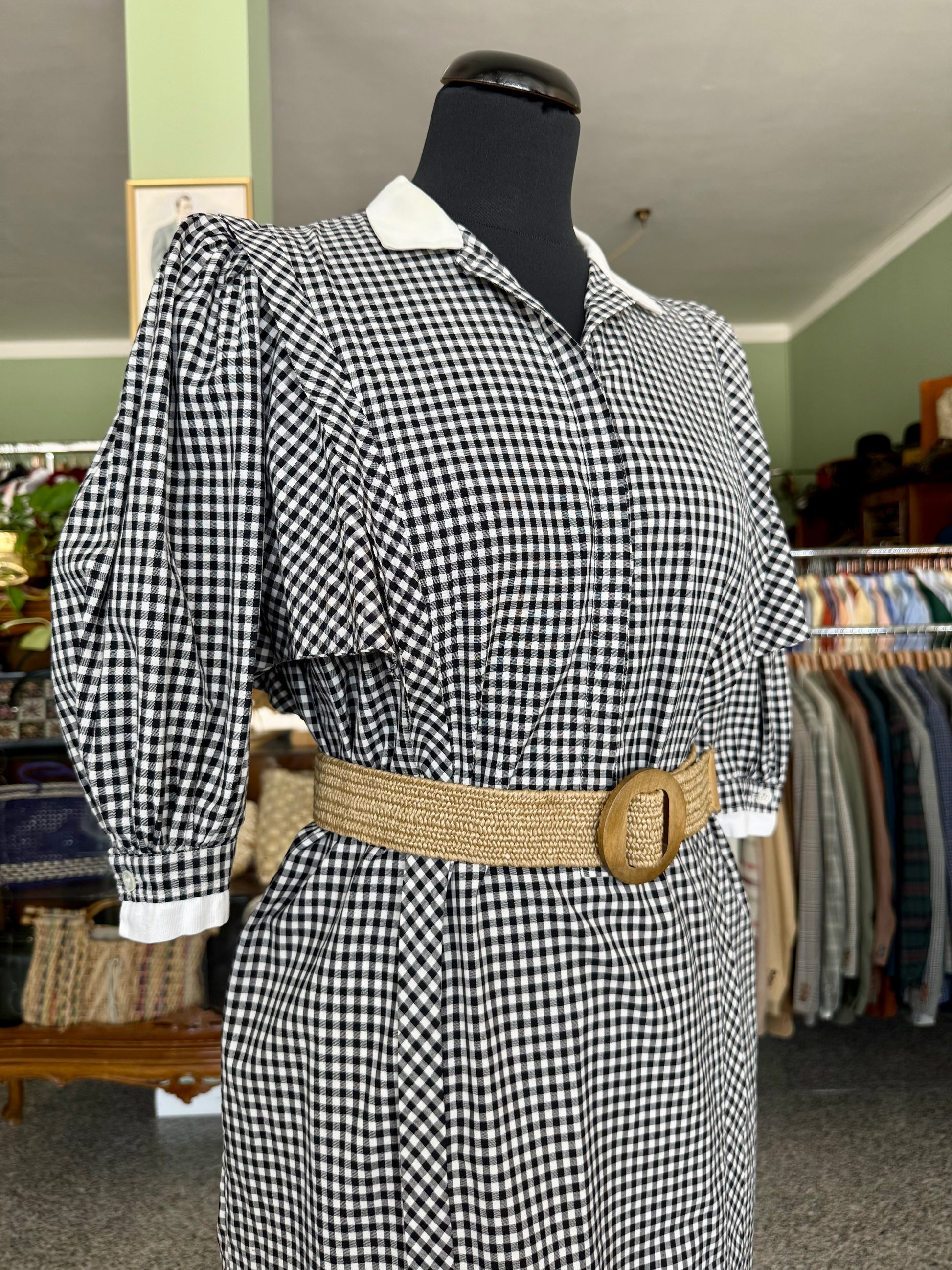 Abito anni ‘80 classico e senza tempo, in 100% cotone con fantasia vichy sui toni del bianco e del nero. Il pezzo forte sono le maniche a palloncino, romantiche e vaporose che rendono il capo un vero pezzo unico e ricercato.