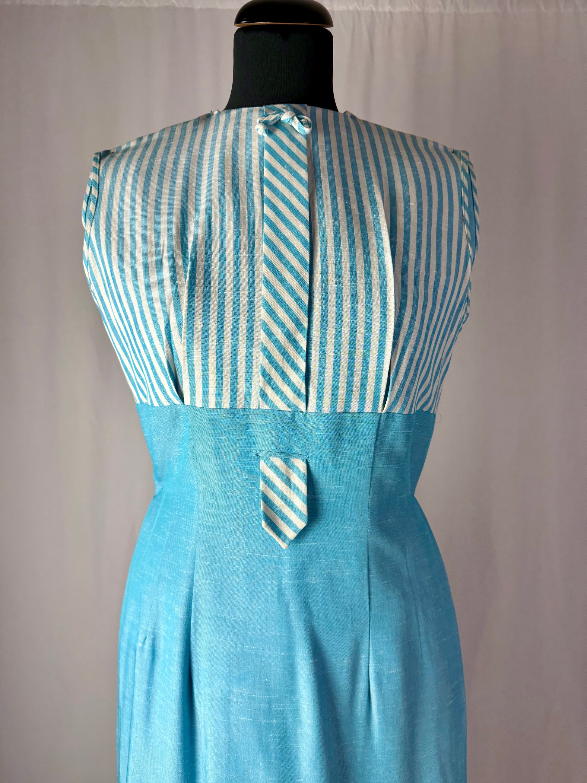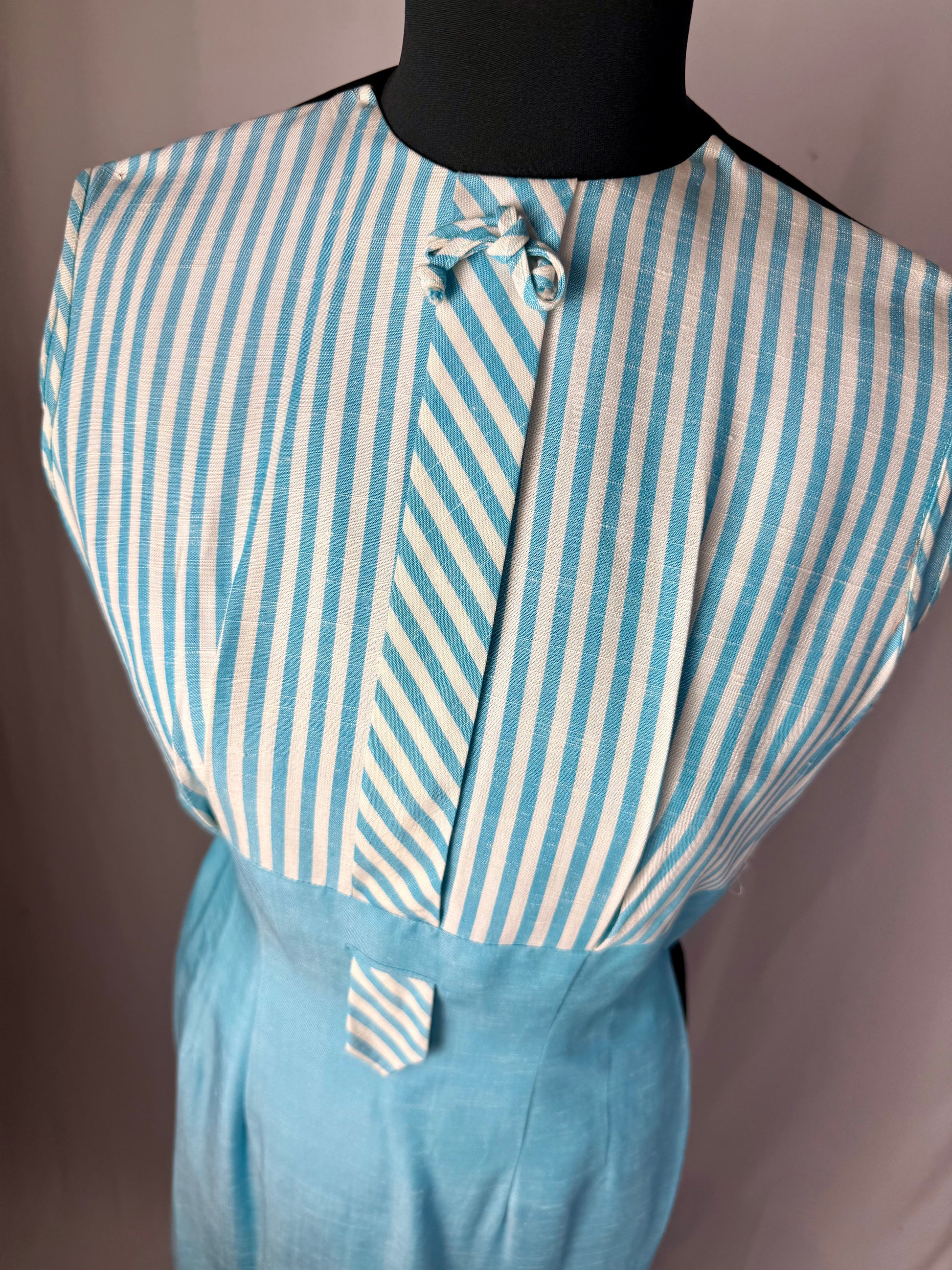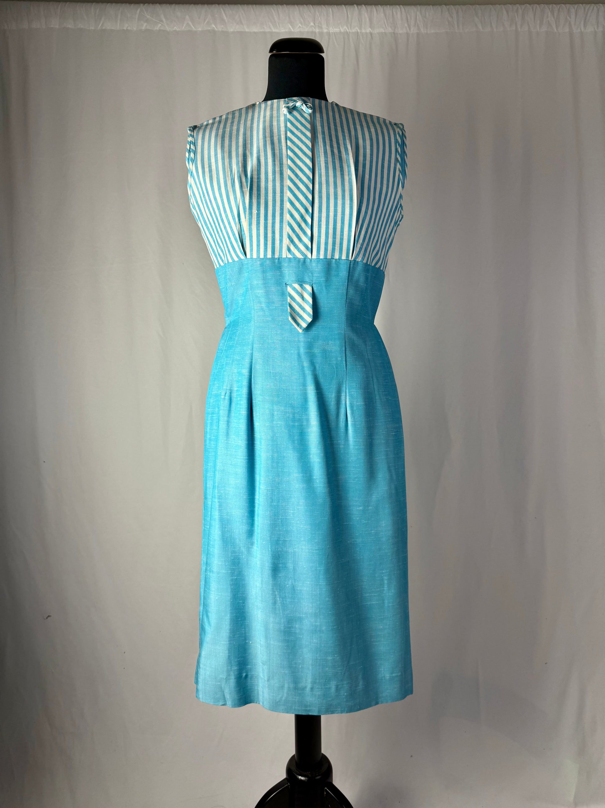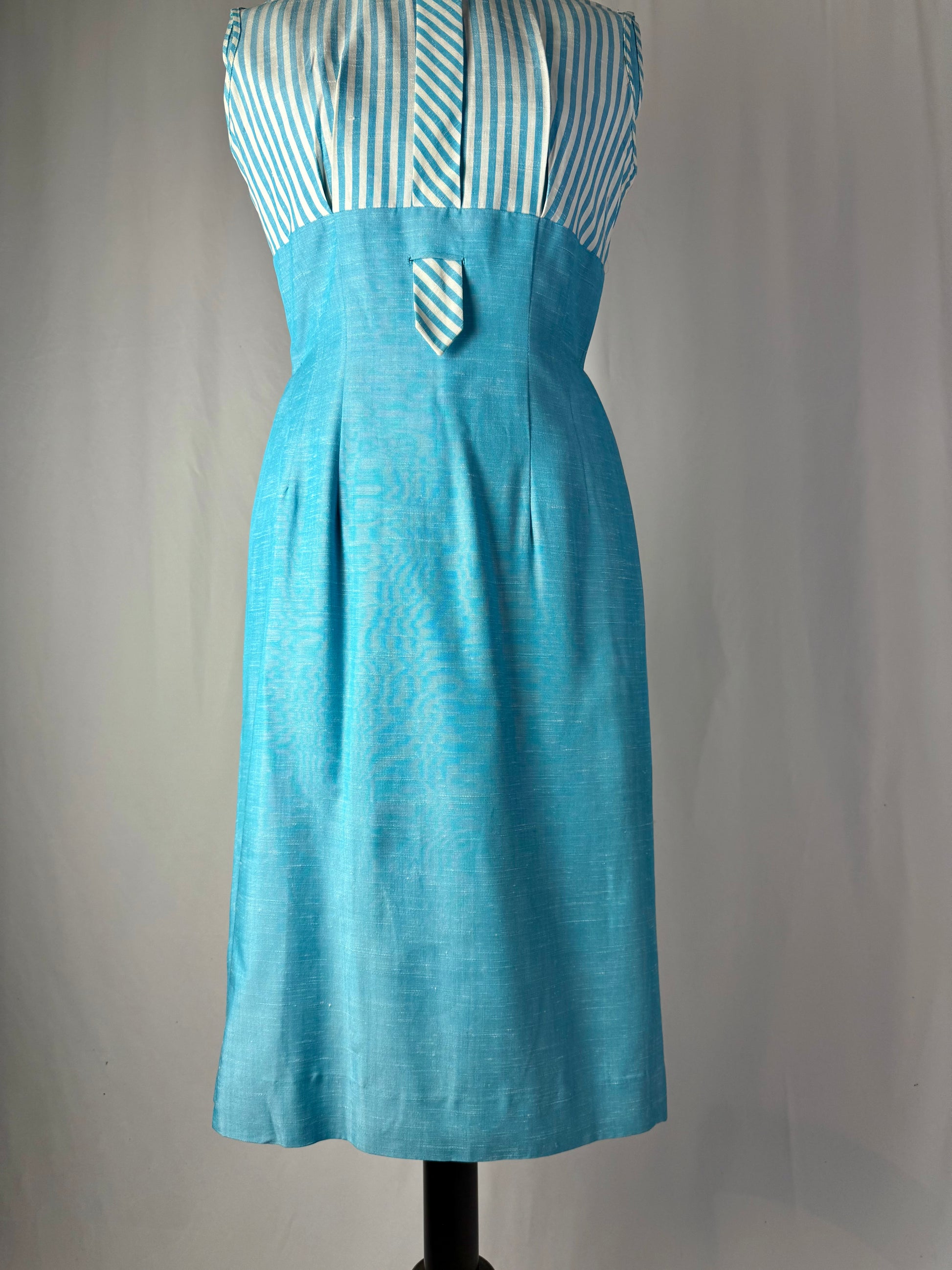Modello smanicato a linea a tubino, con corpino bicolore, in cotone azzurro e cotone rigato bianco e azzureo. La parte del corpino presenta una costruzione elaborata con inserti diagonali a righe e decorazione a fiocco piatto. Le pinces verticali modellano la figura modellando la silhoutte. La precisione delle cuciture e i dettagli grafici del tessuto rivelano un gusto modernista e marino, tipico della fine degli anni Cinquanta/ inizio anni ‘60.