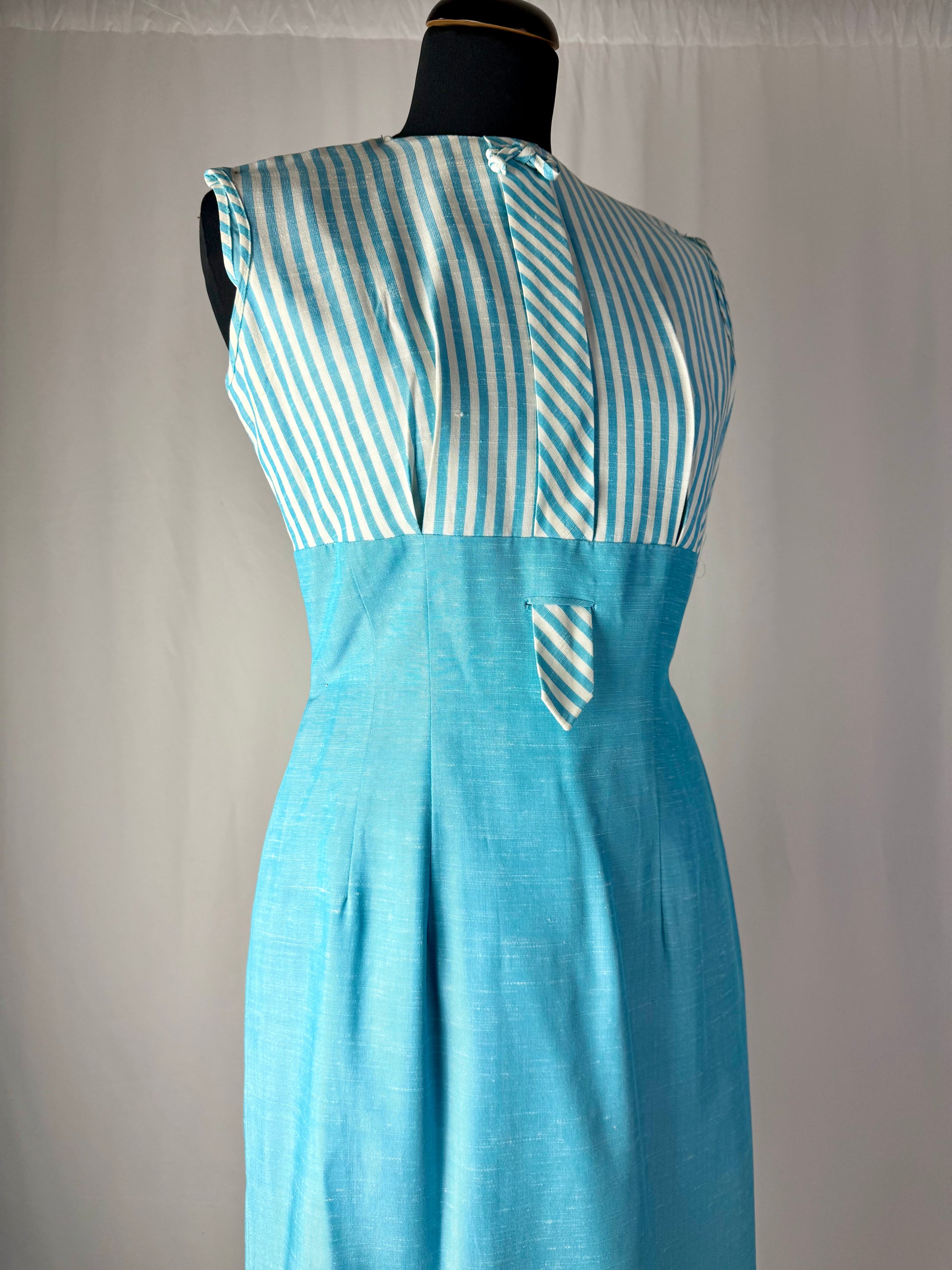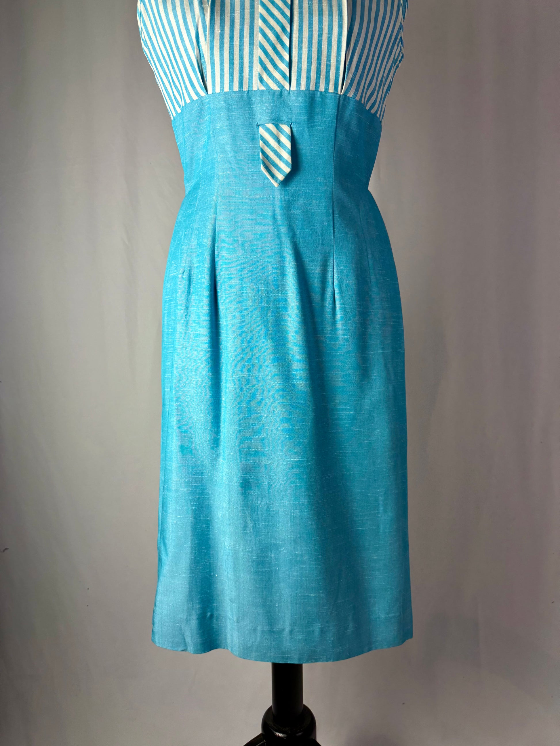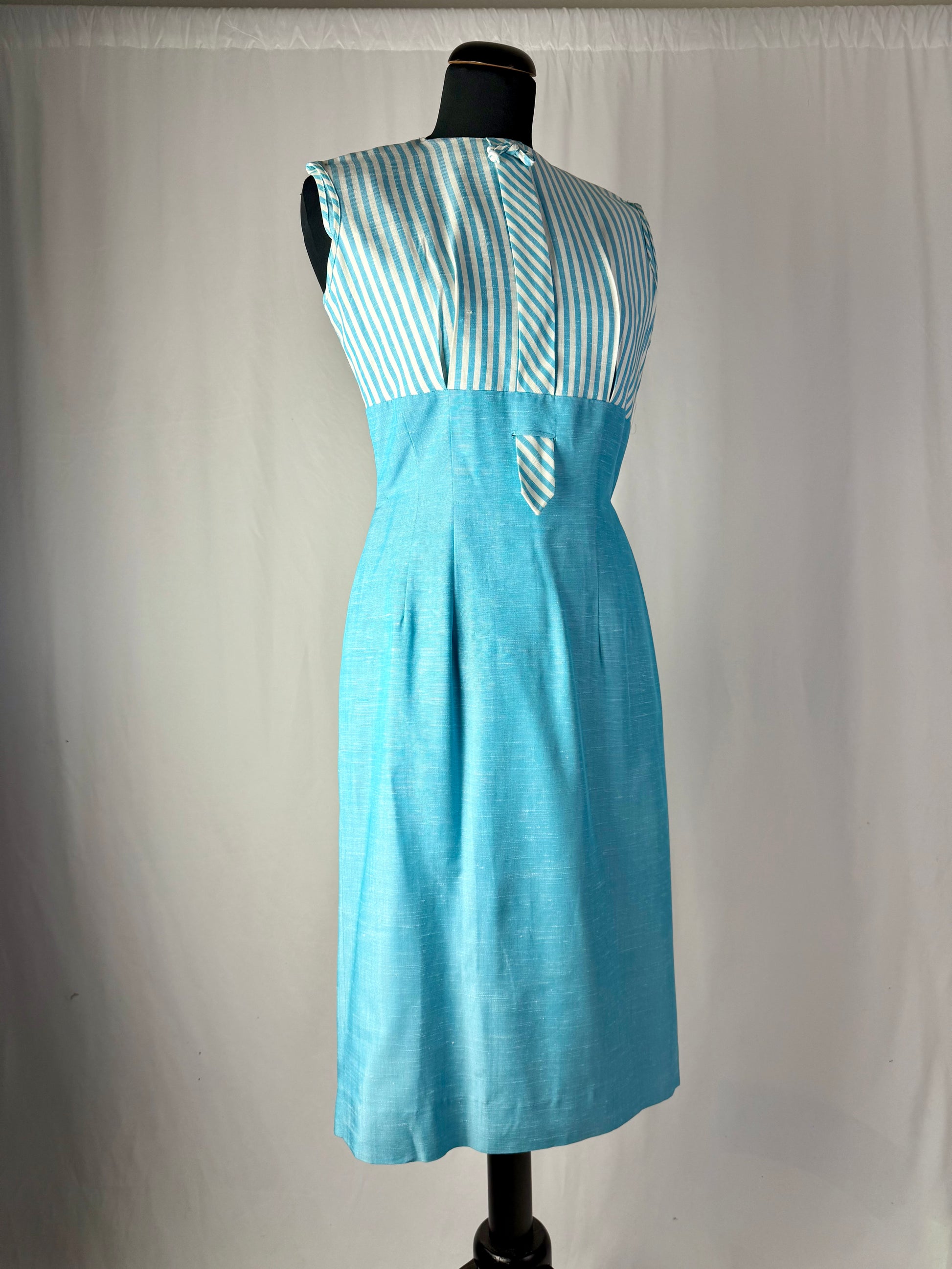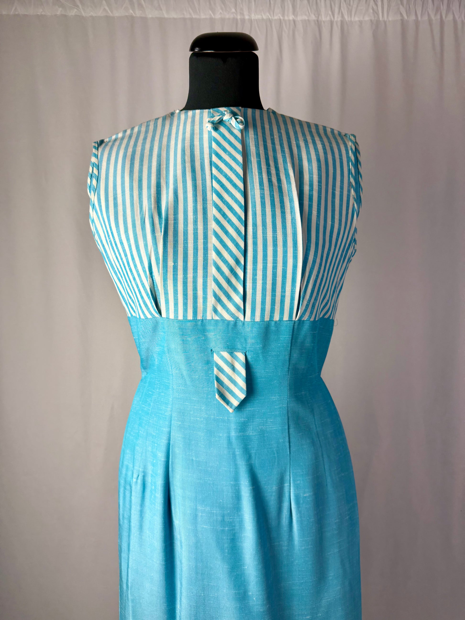 Modello smanicato a linea a tubino, con corpino bicolore, in cotone azzurro e cotone rigato bianco e azzureo. La parte del corpino presenta una costruzione elaborata con inserti diagonali a righe e decorazione a fiocco piatto. Le pinces verticali modellano la figura modellando la silhoutte. La precisione delle cuciture e i dettagli grafici del tessuto rivelano un gusto modernista e marino, tipico della fine degli anni Cinquanta/ inizio anni ‘60.