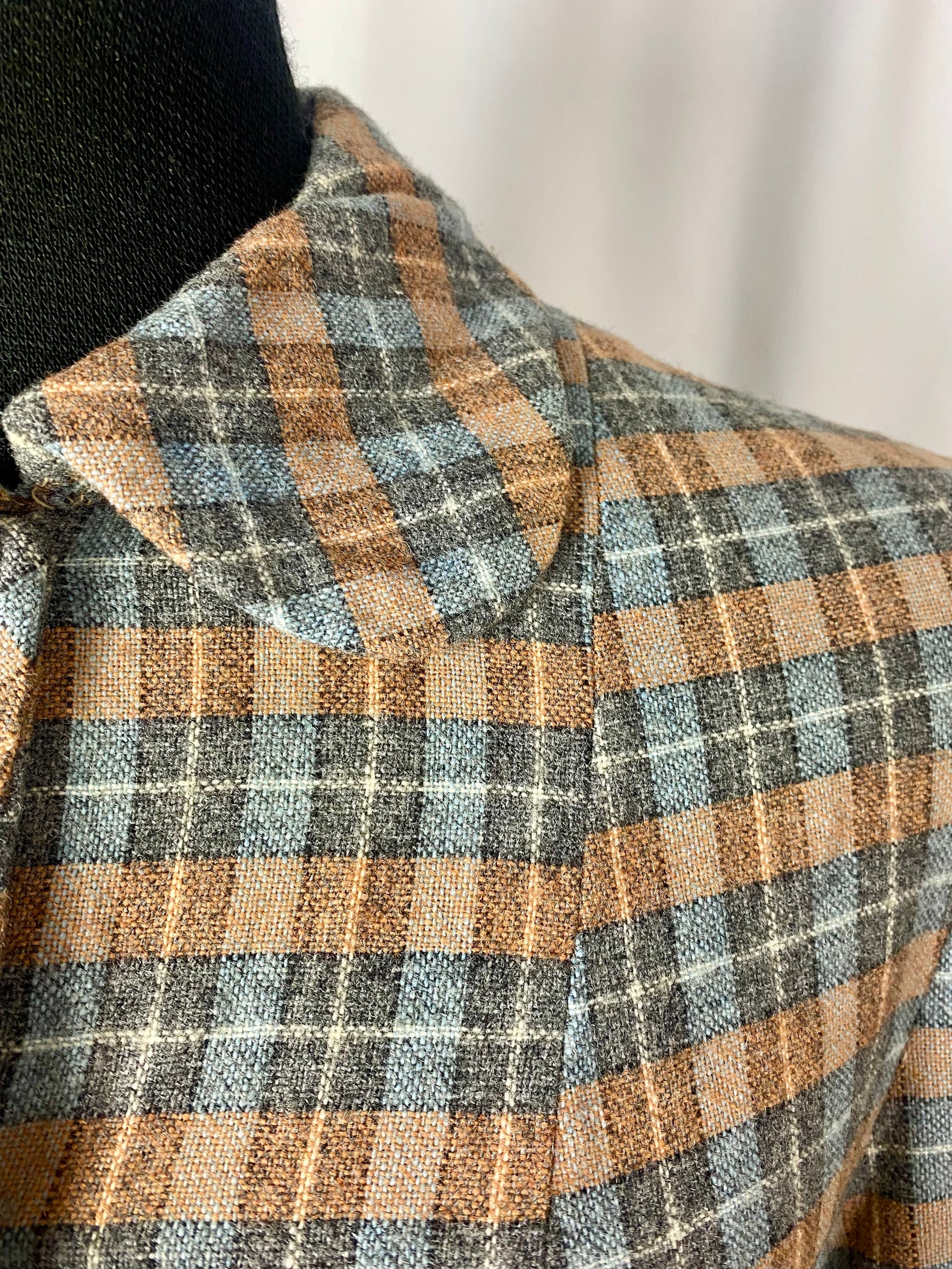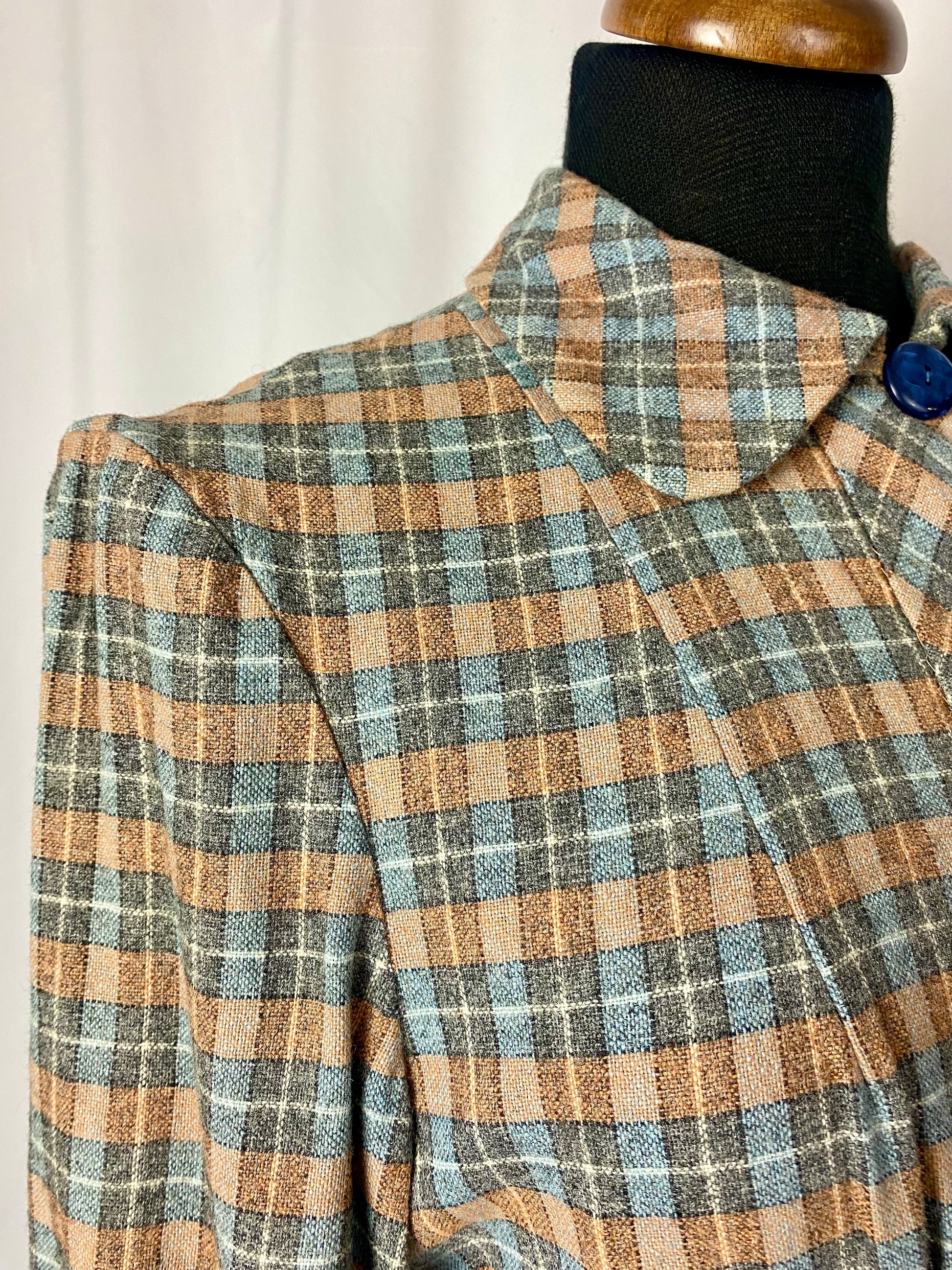 Il tessuto a quadri nei toni del marrone, azzurro e grigio dona eleganza e versatilità, mentre i bottoni in resina blu creano un raffinato contrasto cromatico.