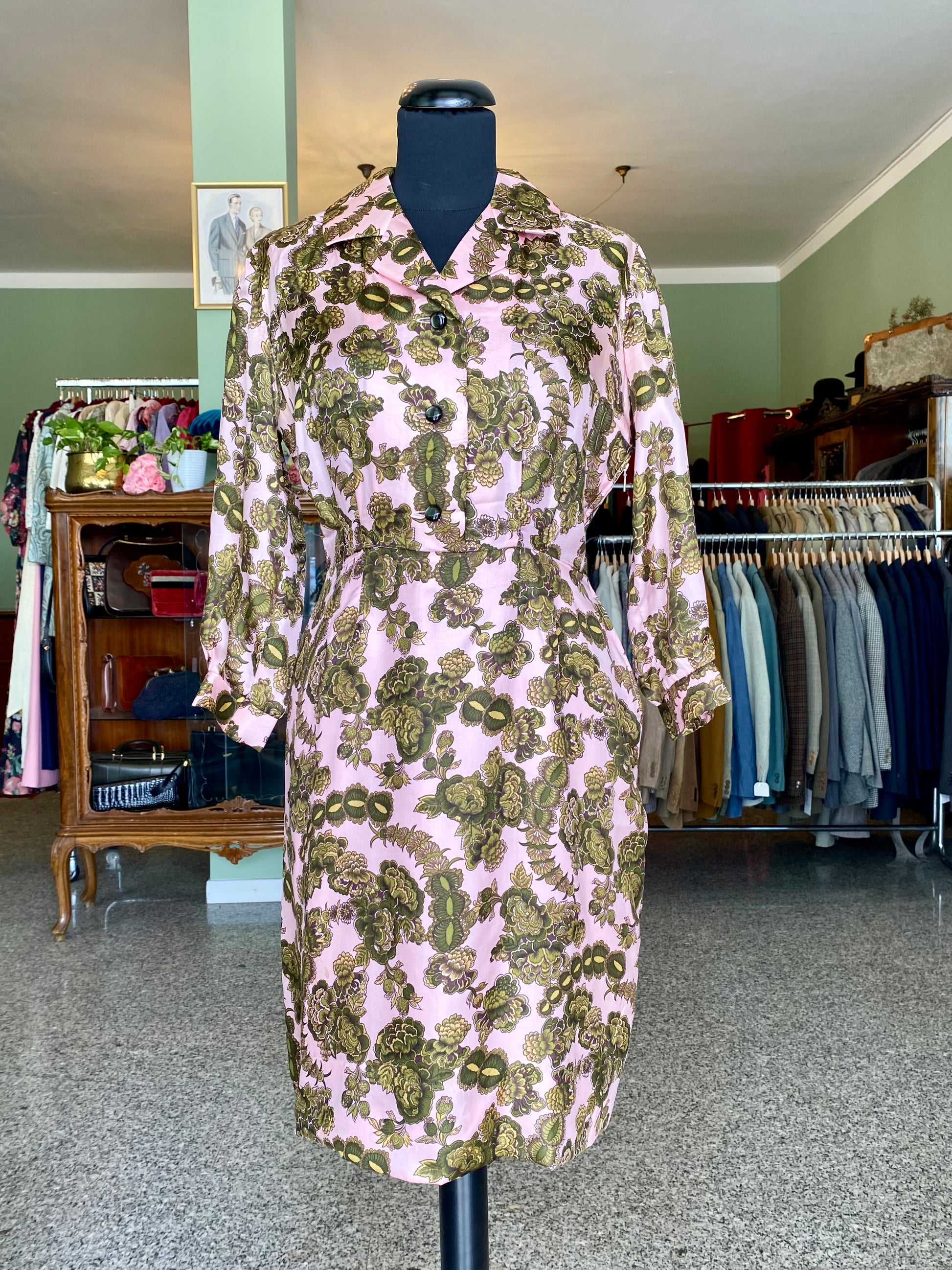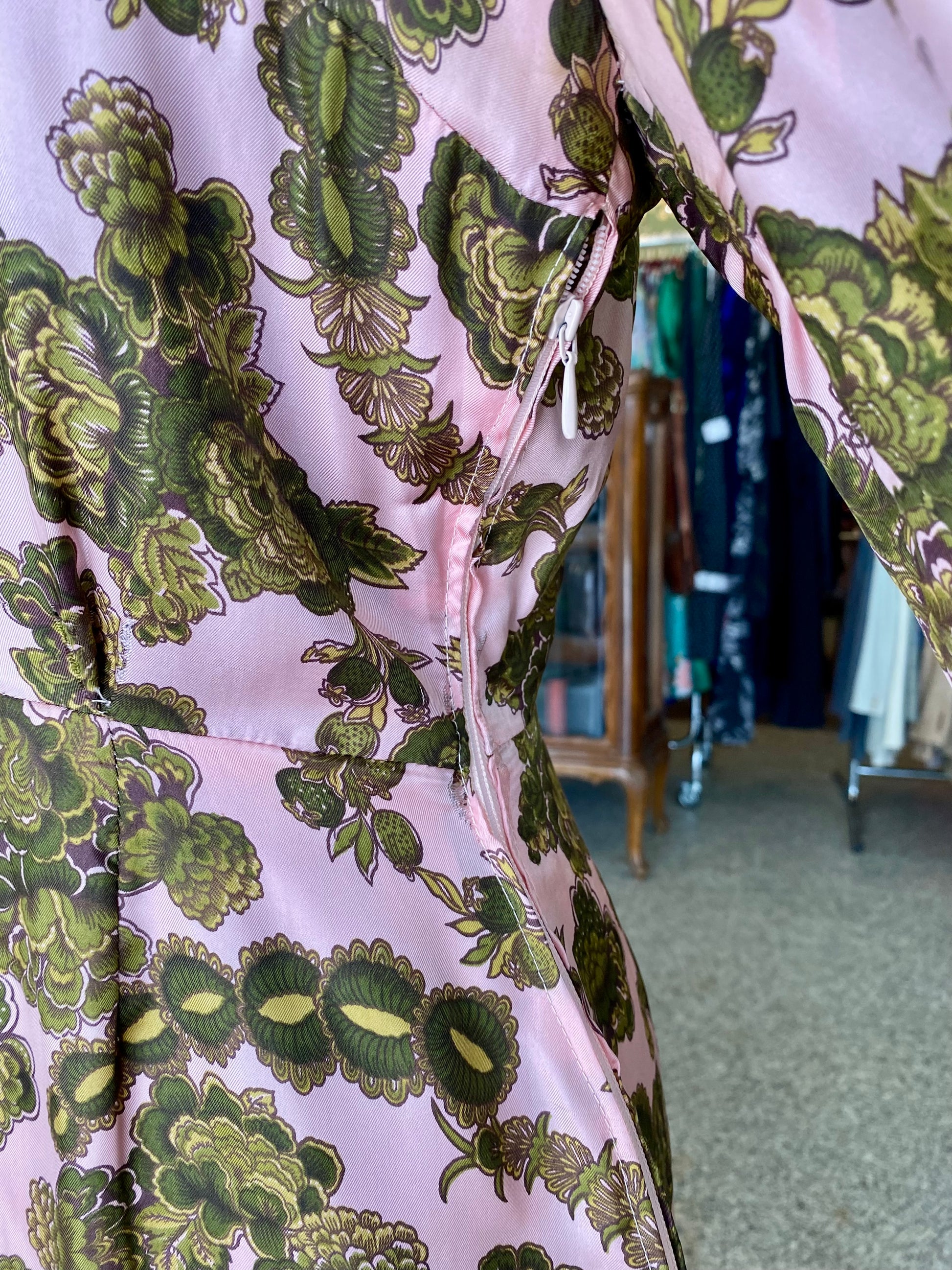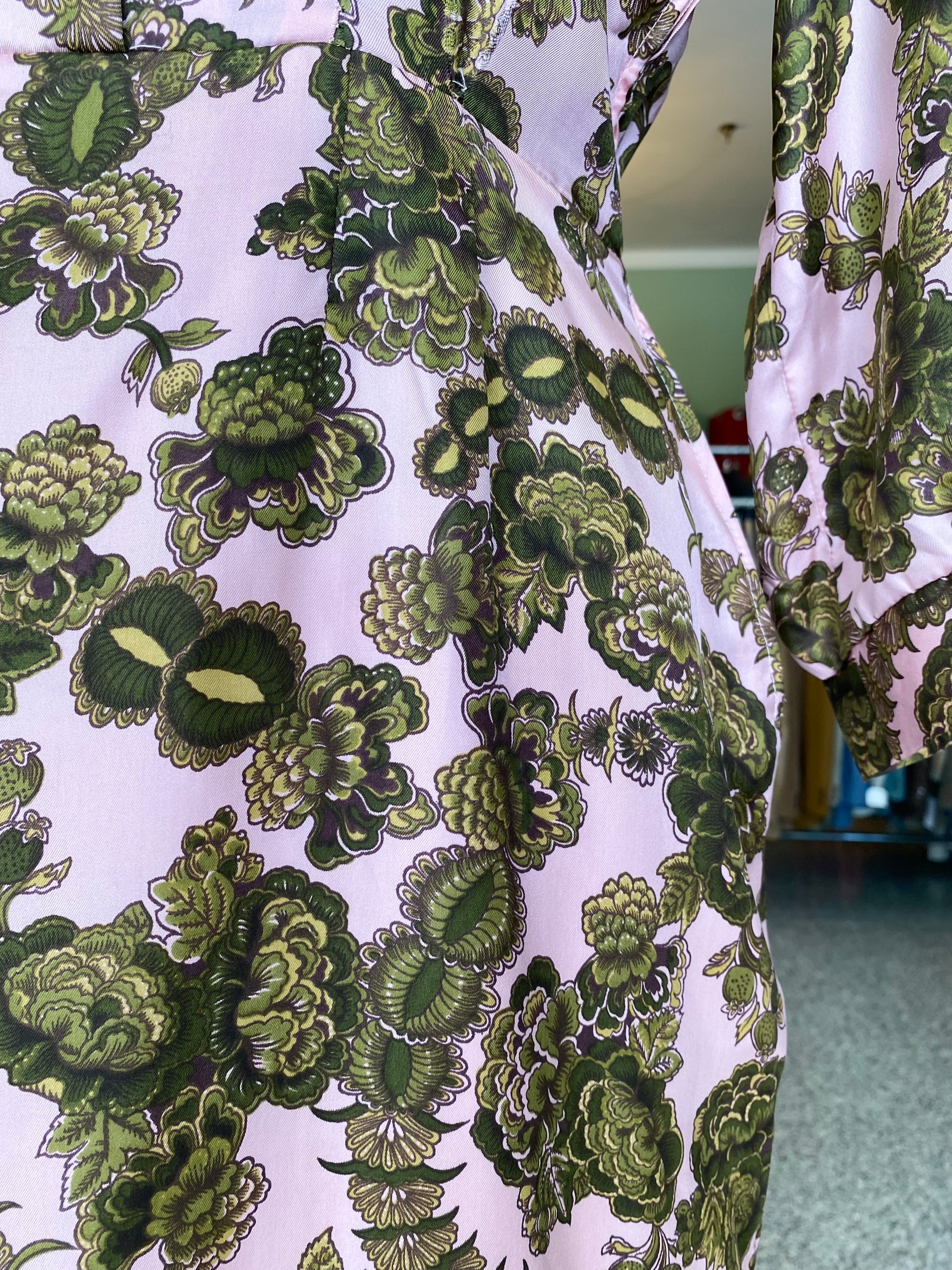 Abito sartoriale anni ’60 realizzato in seta lucida, si distingue per la stampa floreale dai toni vivaci e raffinati: un fondo rosa cipria acceso da motivi floreali verde oliva e muschio.