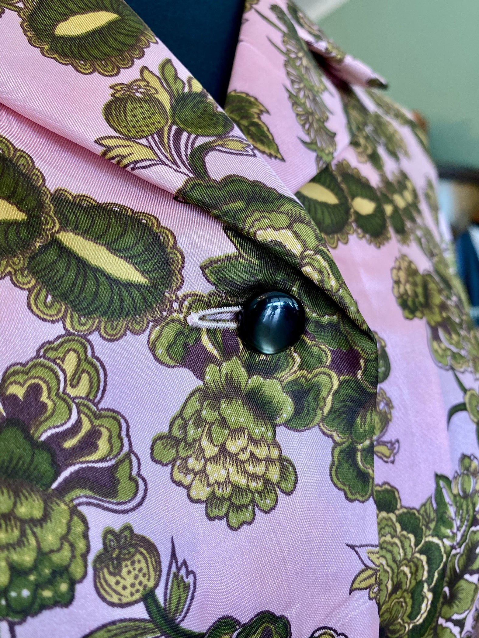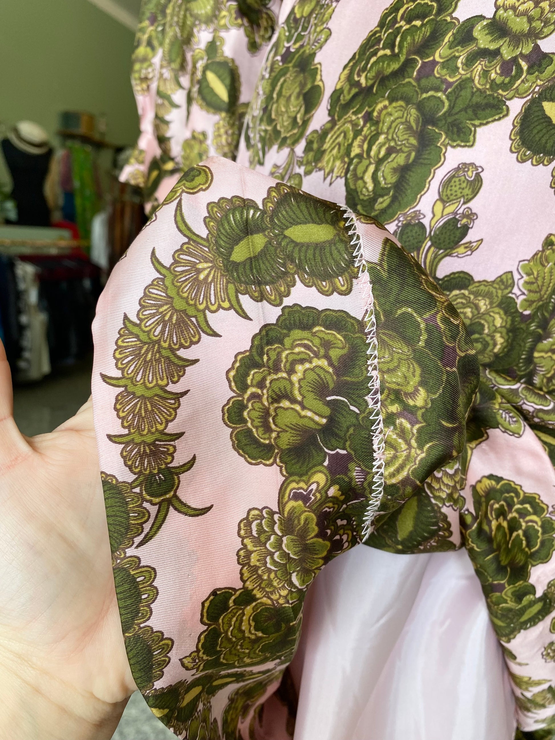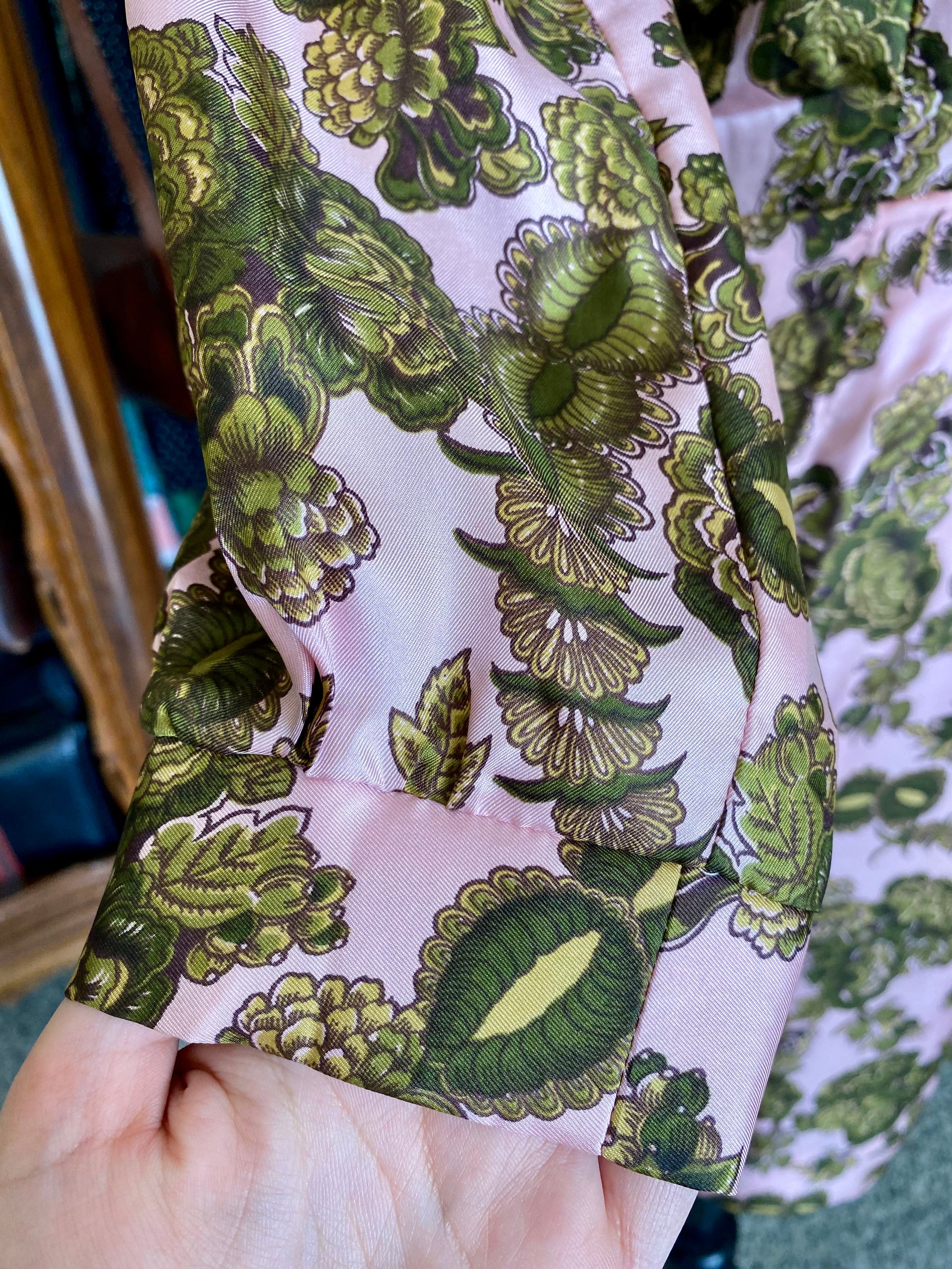 Abito sartoriale anni ’60 realizzato in seta lucida, si distingue per la stampa floreale dai toni vivaci e raffinati: un fondo rosa cipria acceso da motivi floreali verde oliva e muschio.