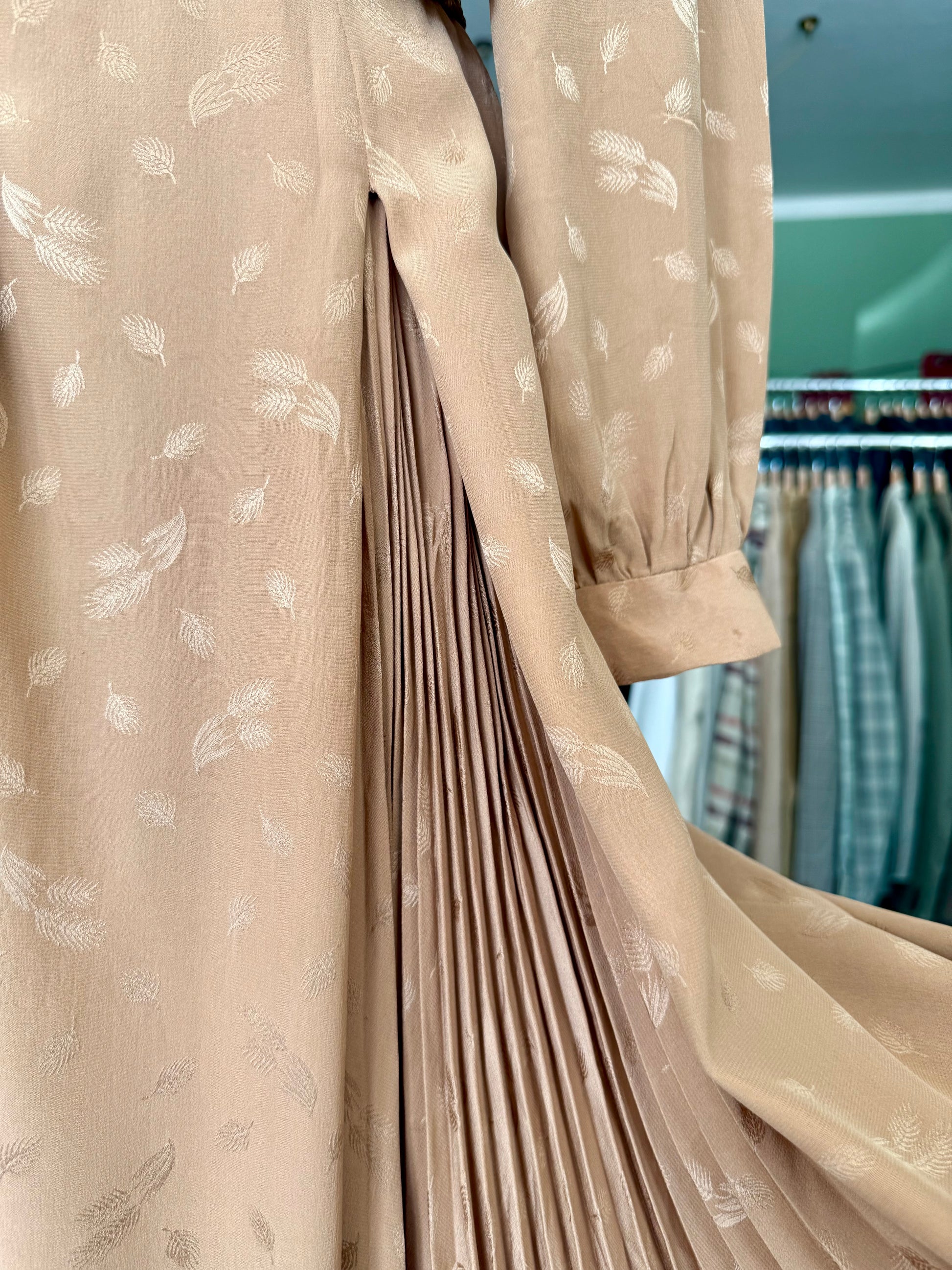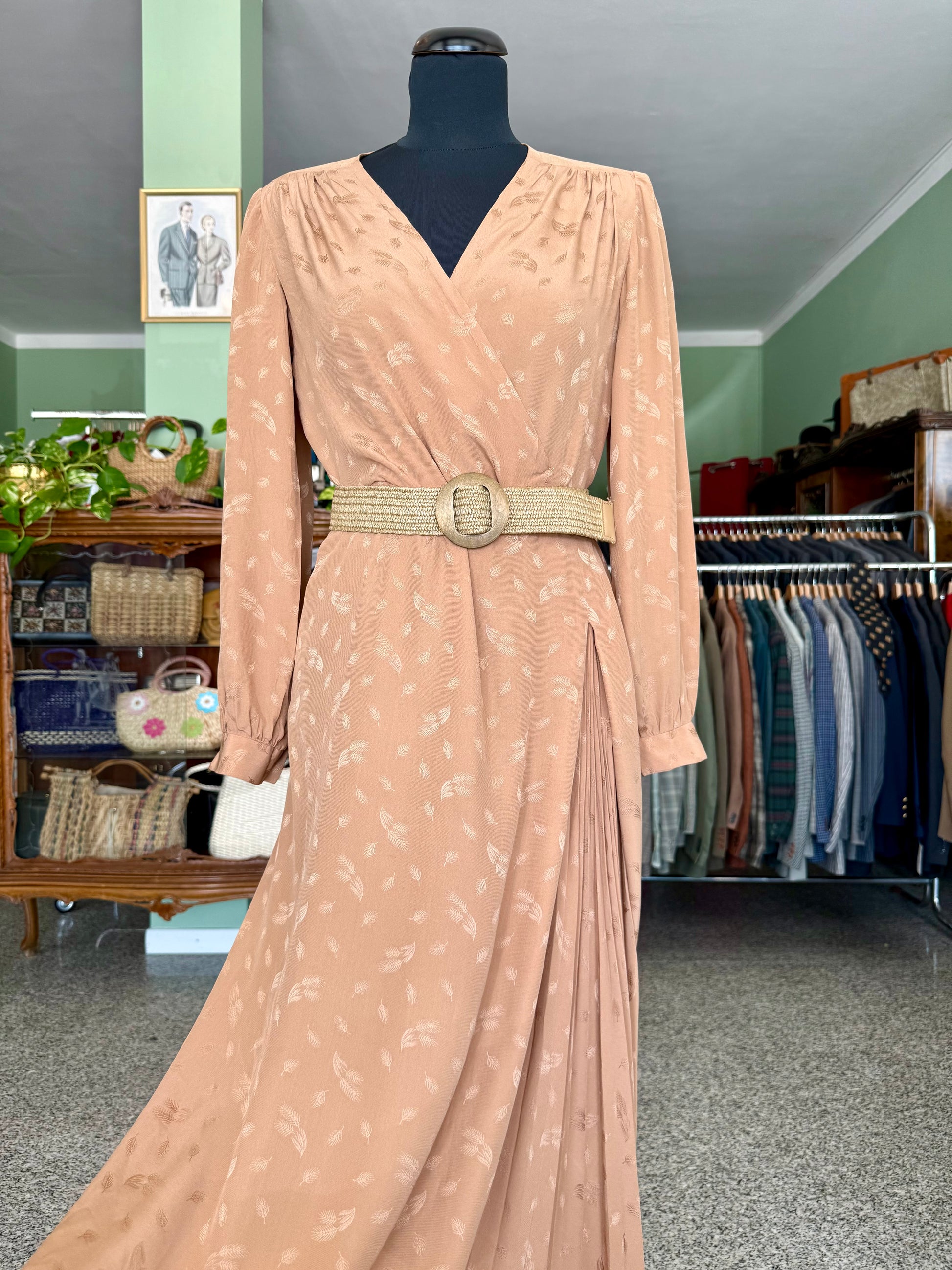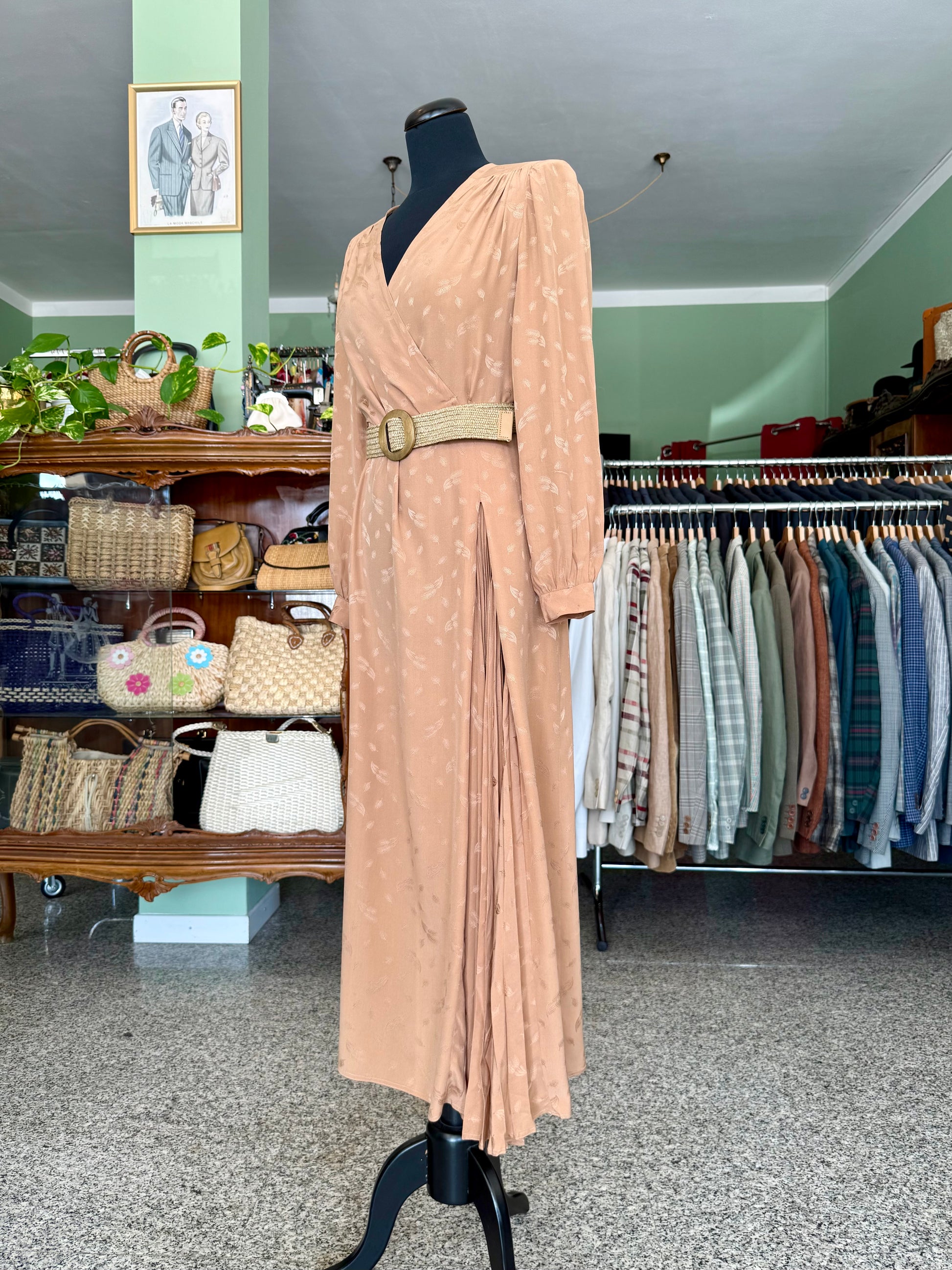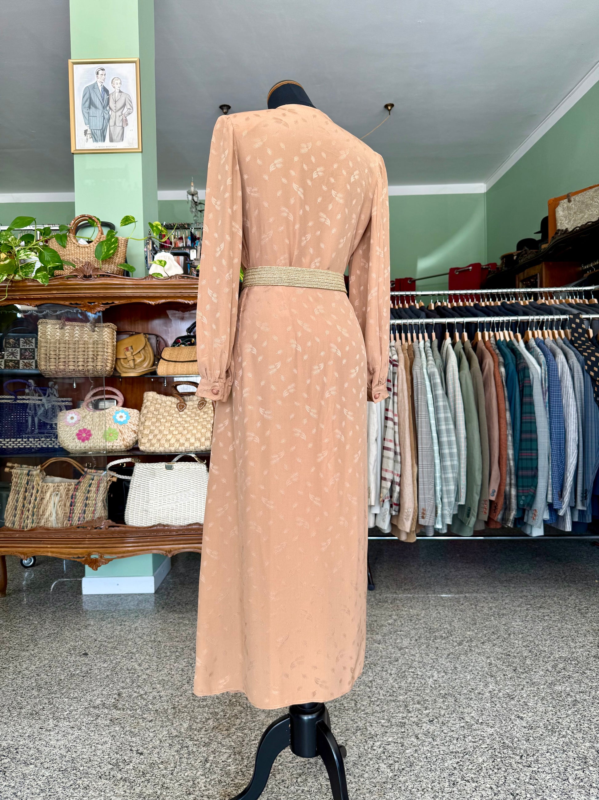 Abito sartoriale degli anni ’70 in pura seta, dal raffinato tono bronzo con delicato motivo jacquard tono su tono. Il taglio incrociato valorizza la silhouette con naturale eleganza, mentre la gonna lunga e plissettata aggiunge fluidità e movimento. Le maniche lunghe con polsino e le leggere arricciature sulle spalle richiamano l’estetica sofisticata del periodo. Perfetto per occasioni speciali e formali.