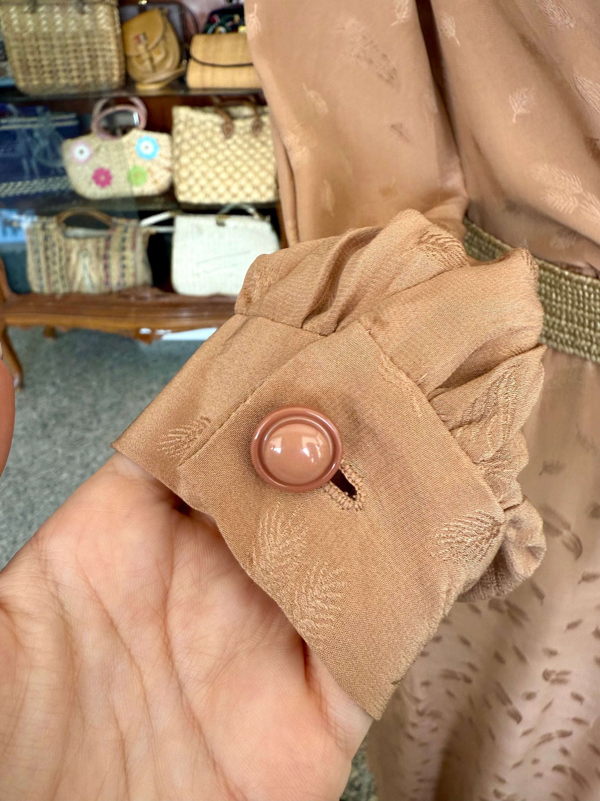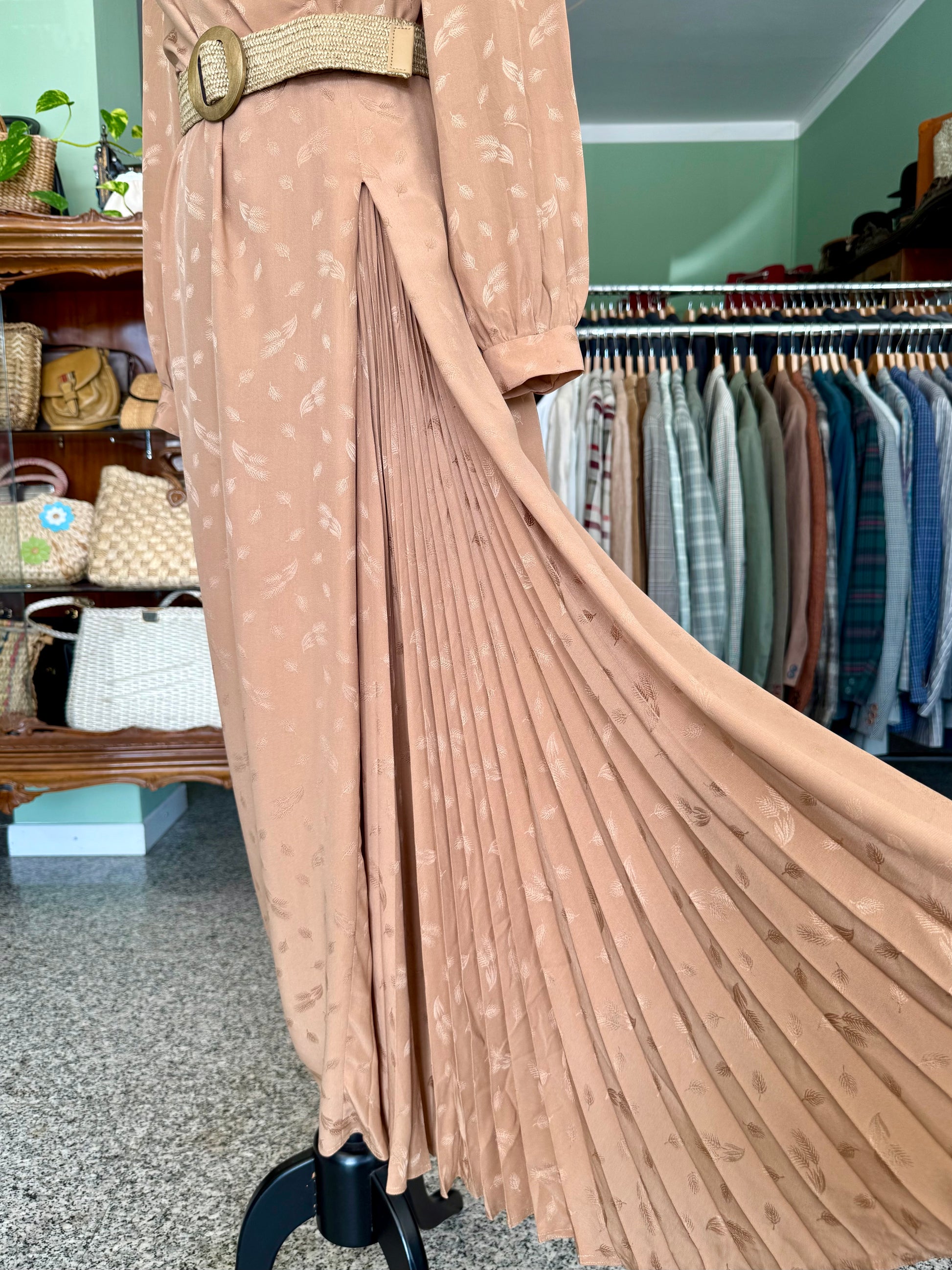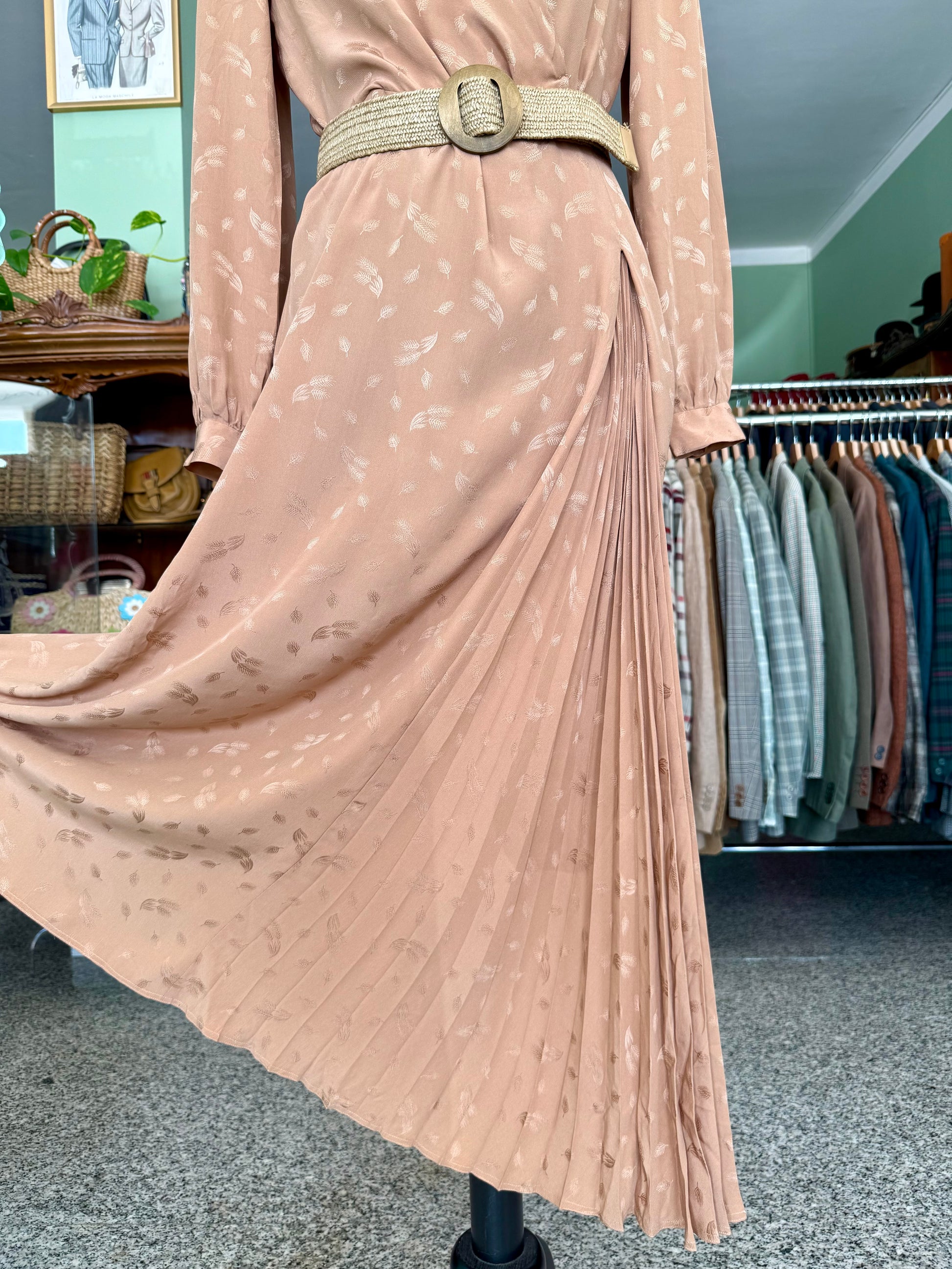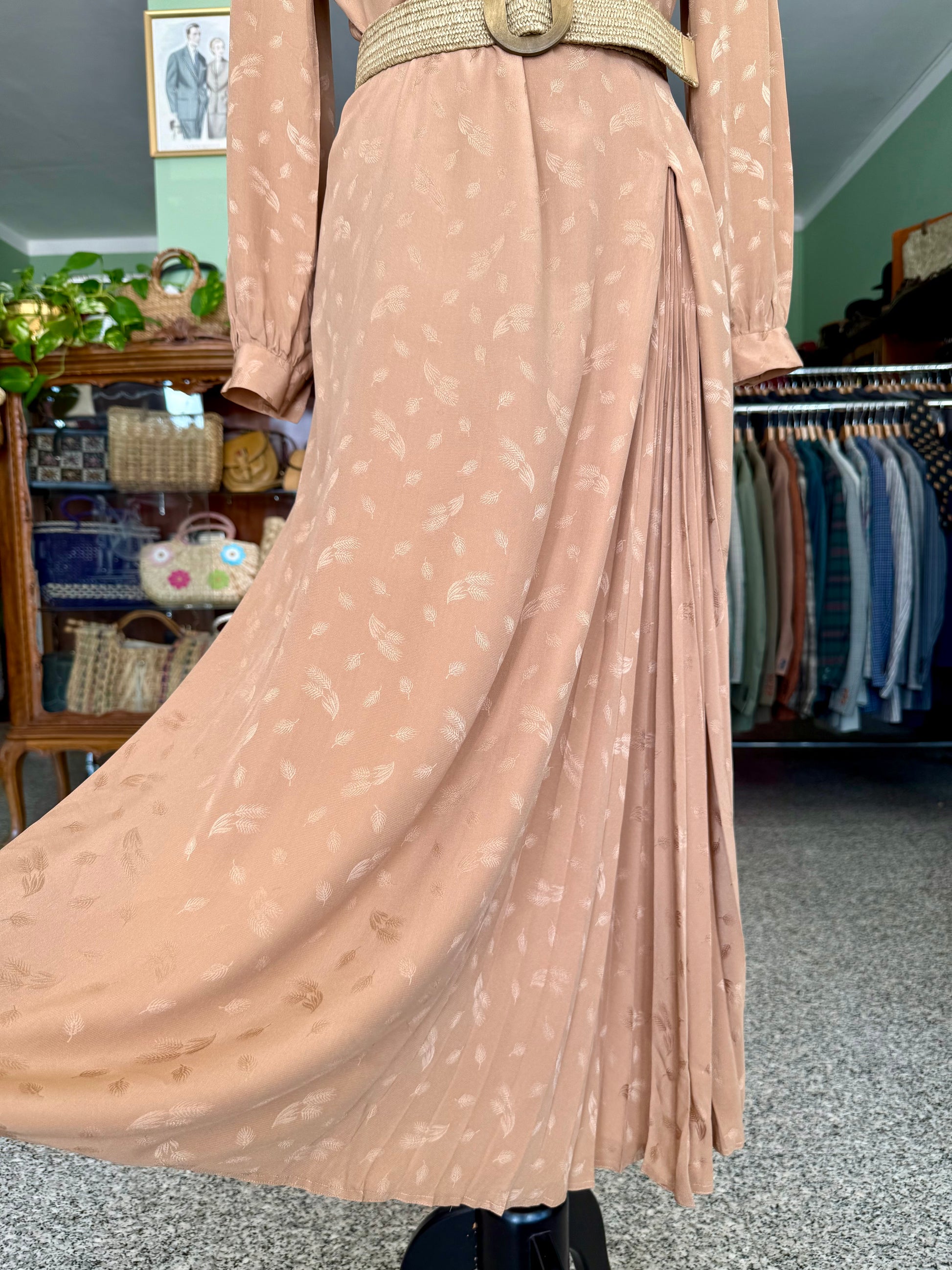 Abito sartoriale degli anni ’70 in pura seta, dal raffinato tono bronzo con delicato motivo jacquard tono su tono. Il taglio incrociato valorizza la silhouette con naturale eleganza, mentre la gonna lunga e plissettata aggiunge fluidità e movimento. Le maniche lunghe con polsino e le leggere arricciature sulle spalle richiamano l’estetica sofisticata del periodo. Perfetto per occasioni speciali e formali.