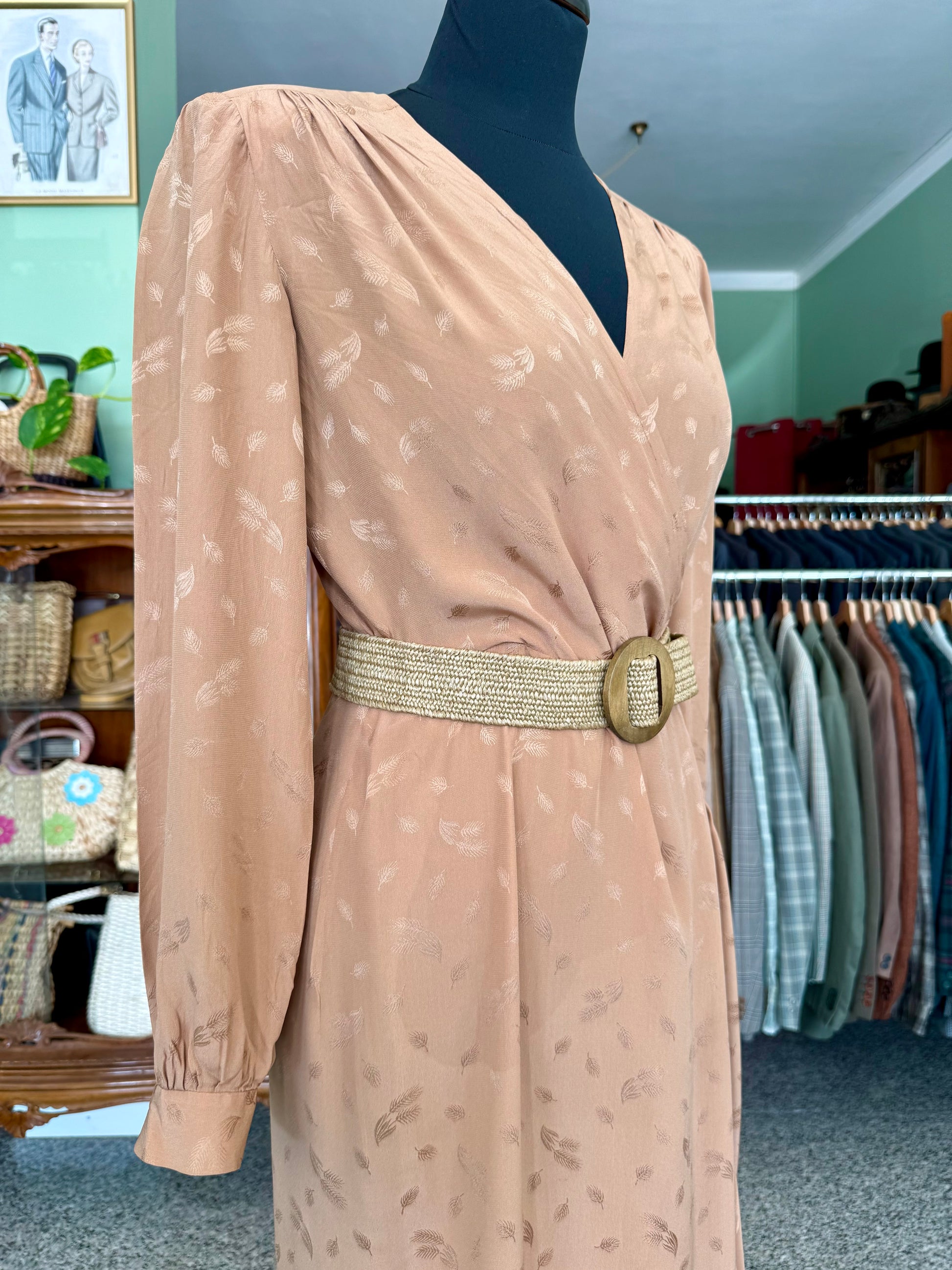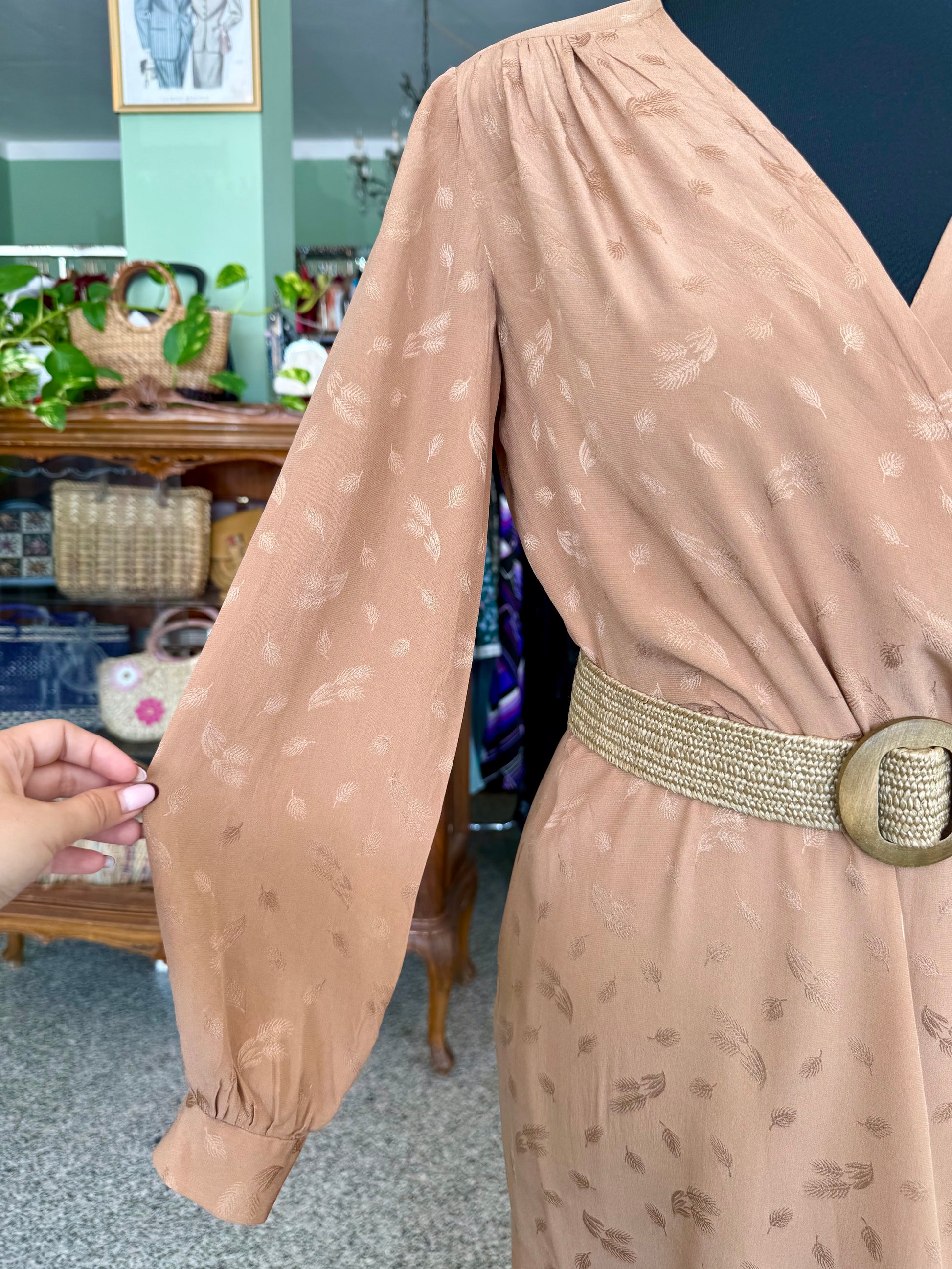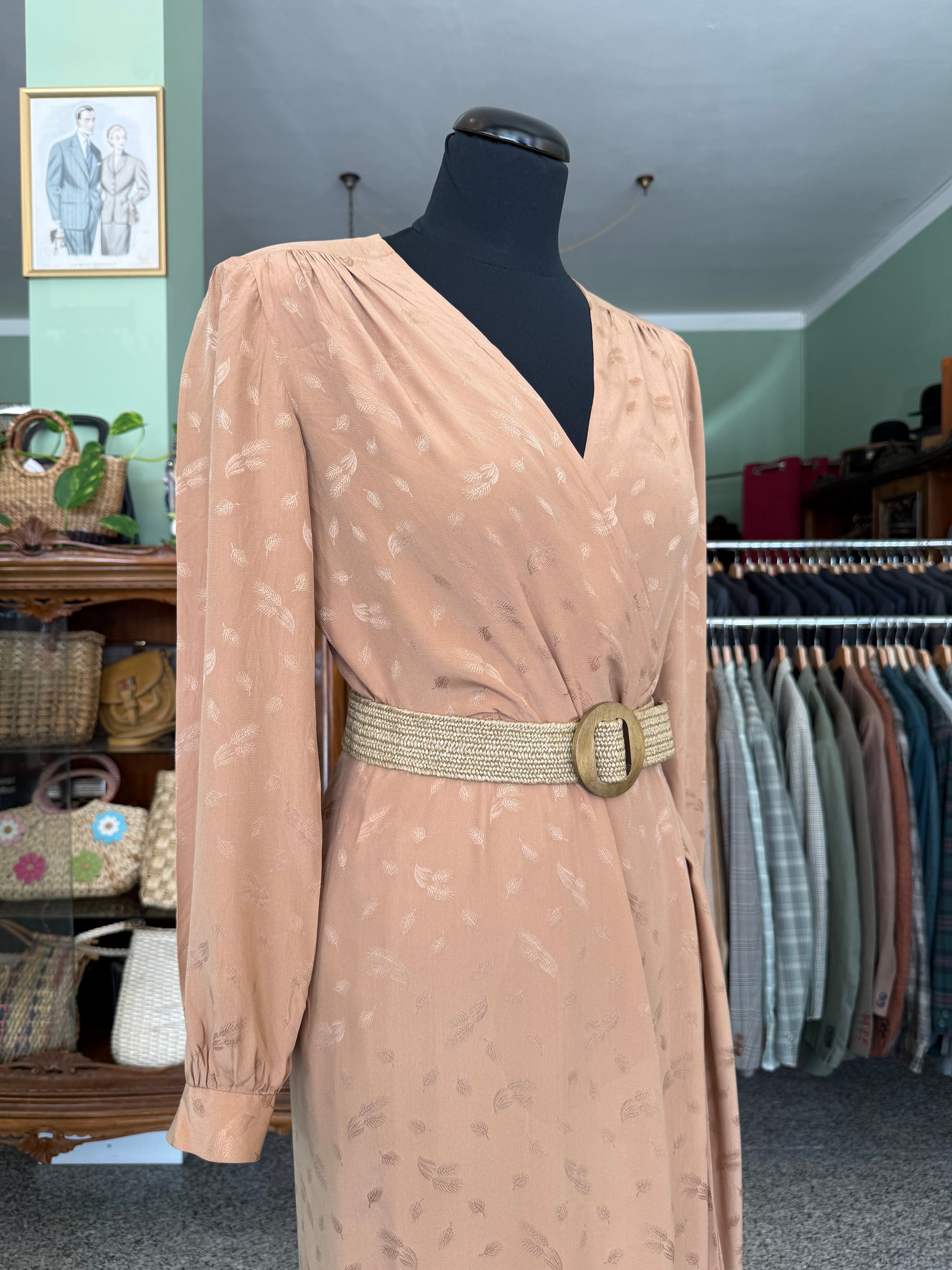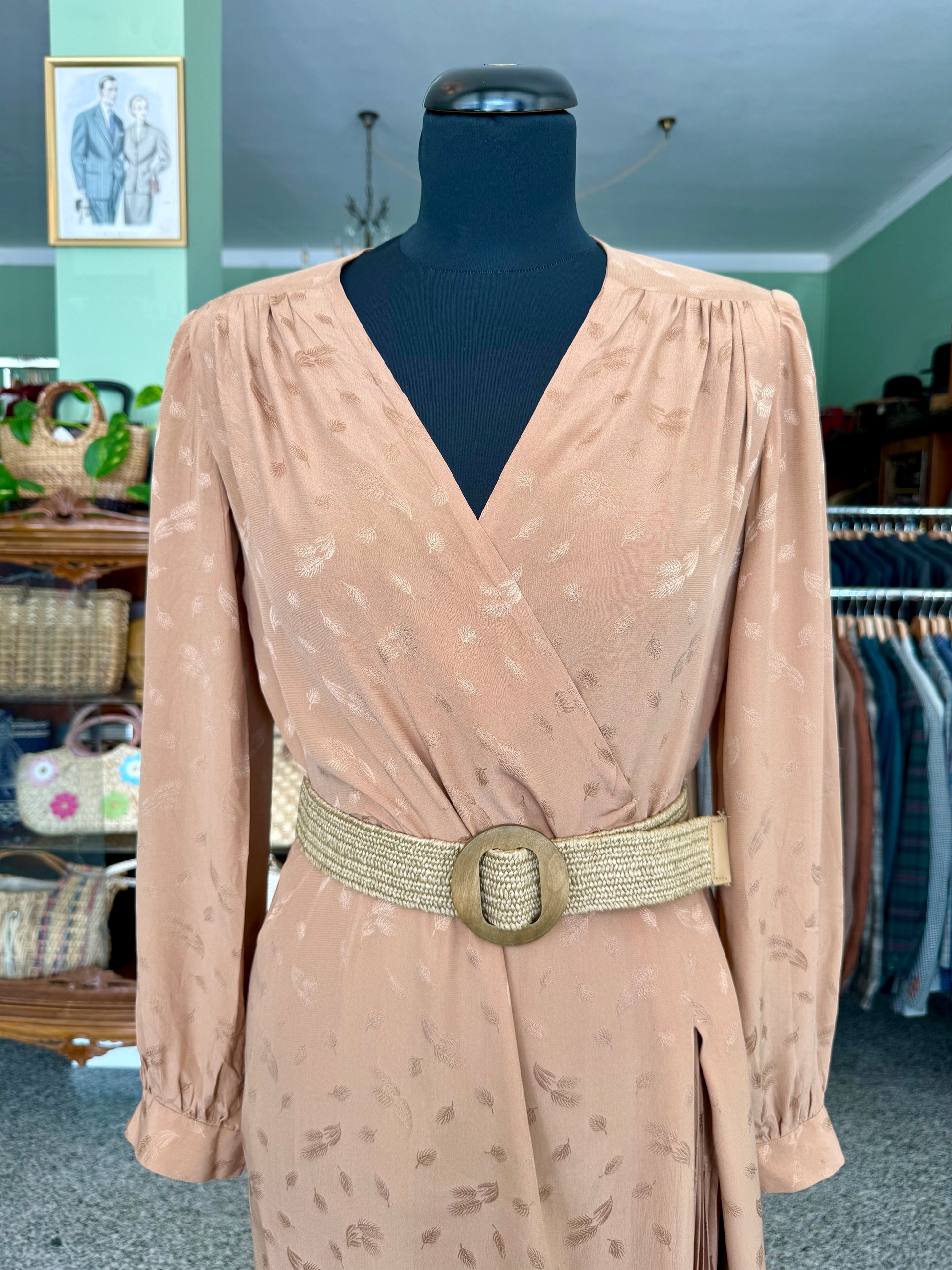 Abito sartoriale degli anni ’70 in pura seta, dal raffinato tono bronzo con delicato motivo jacquard tono su tono. Il taglio incrociato valorizza la silhouette con naturale eleganza, mentre la gonna lunga e plissettata aggiunge fluidità e movimento. Le maniche lunghe con polsino e le leggere arricciature sulle spalle richiamano l’estetica sofisticata del periodo. Perfetto per occasioni speciali e formali.